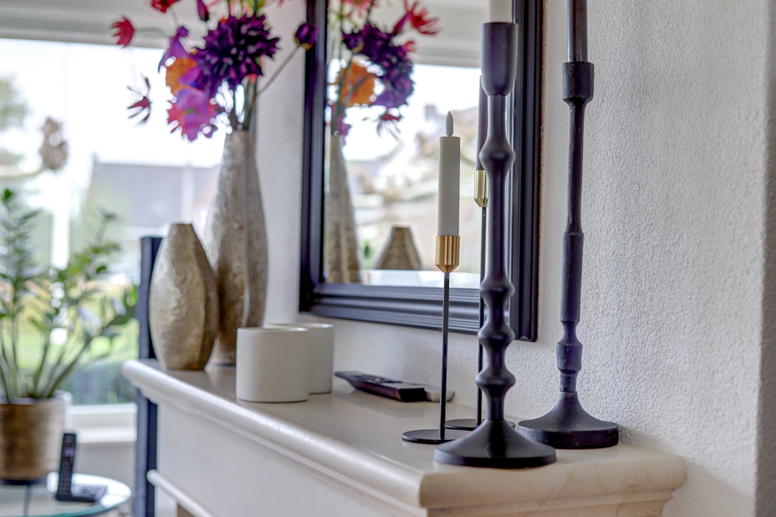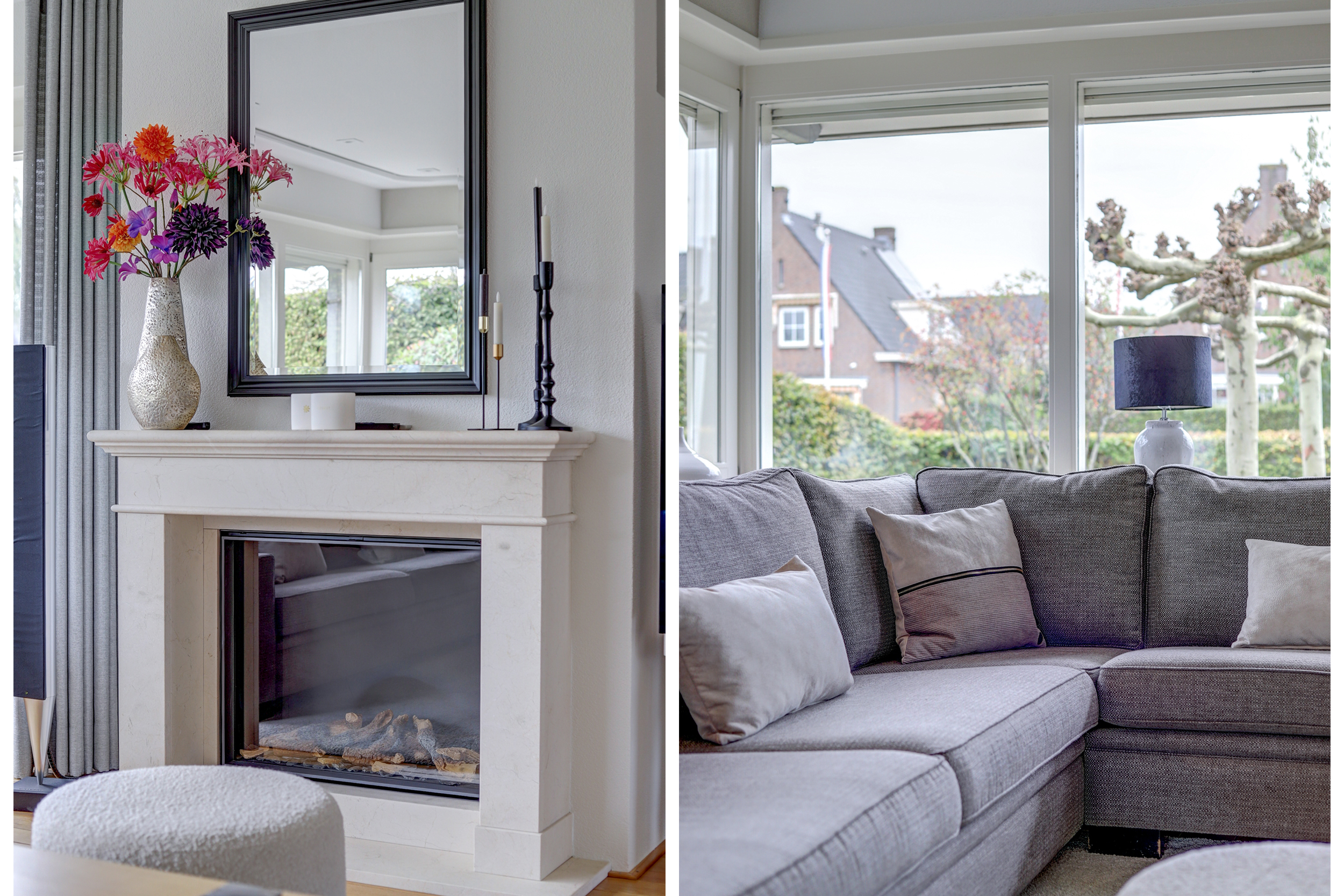 – Grote, lichte living met houten vloerdelen en haard met natuurstenen schouw;