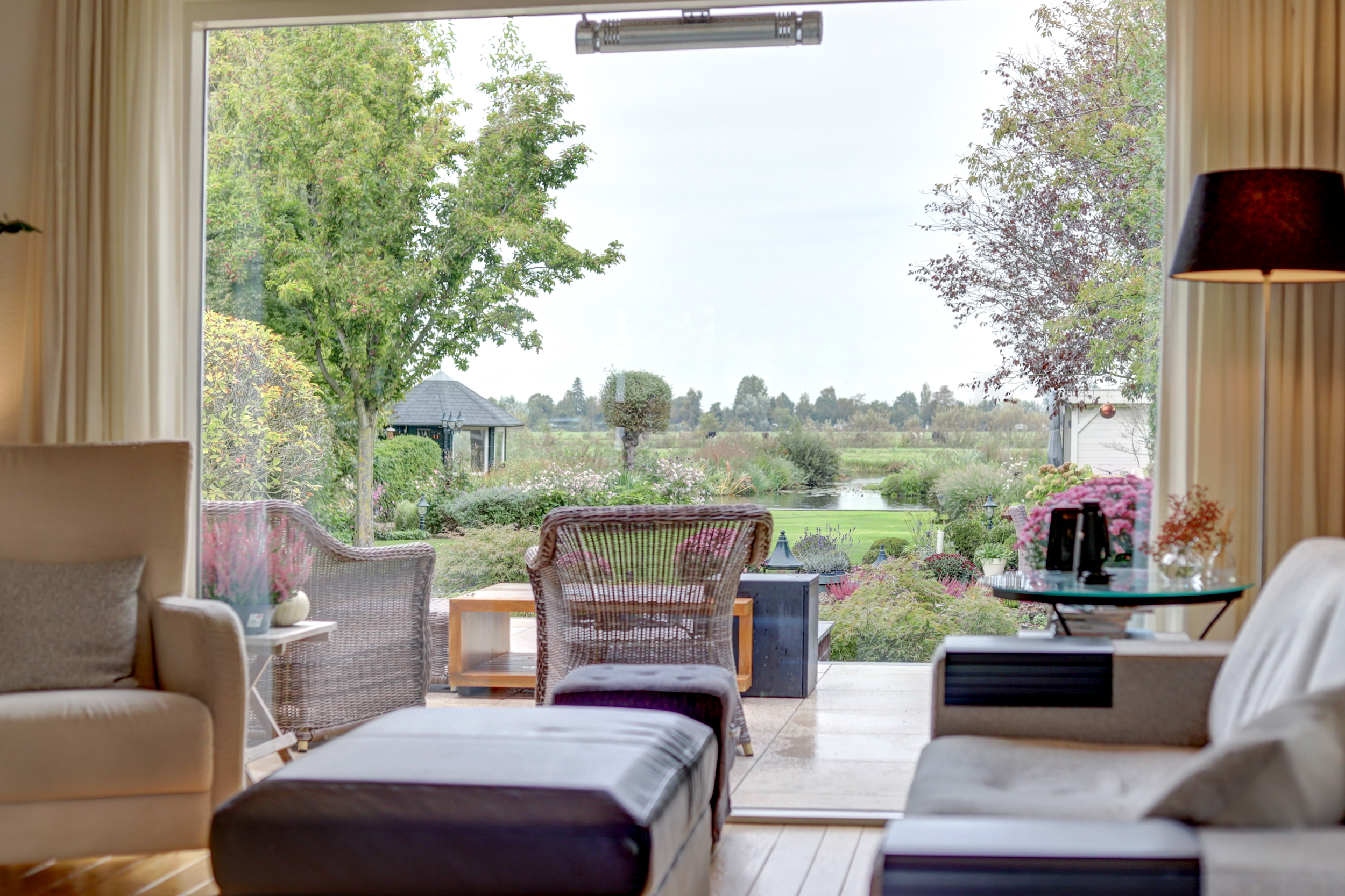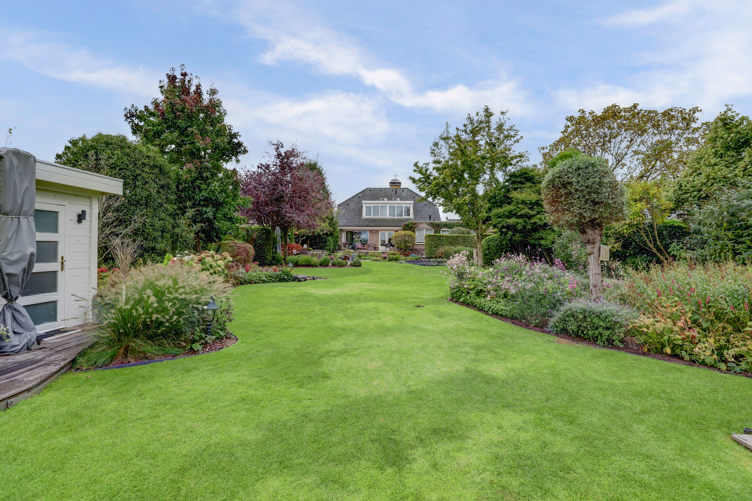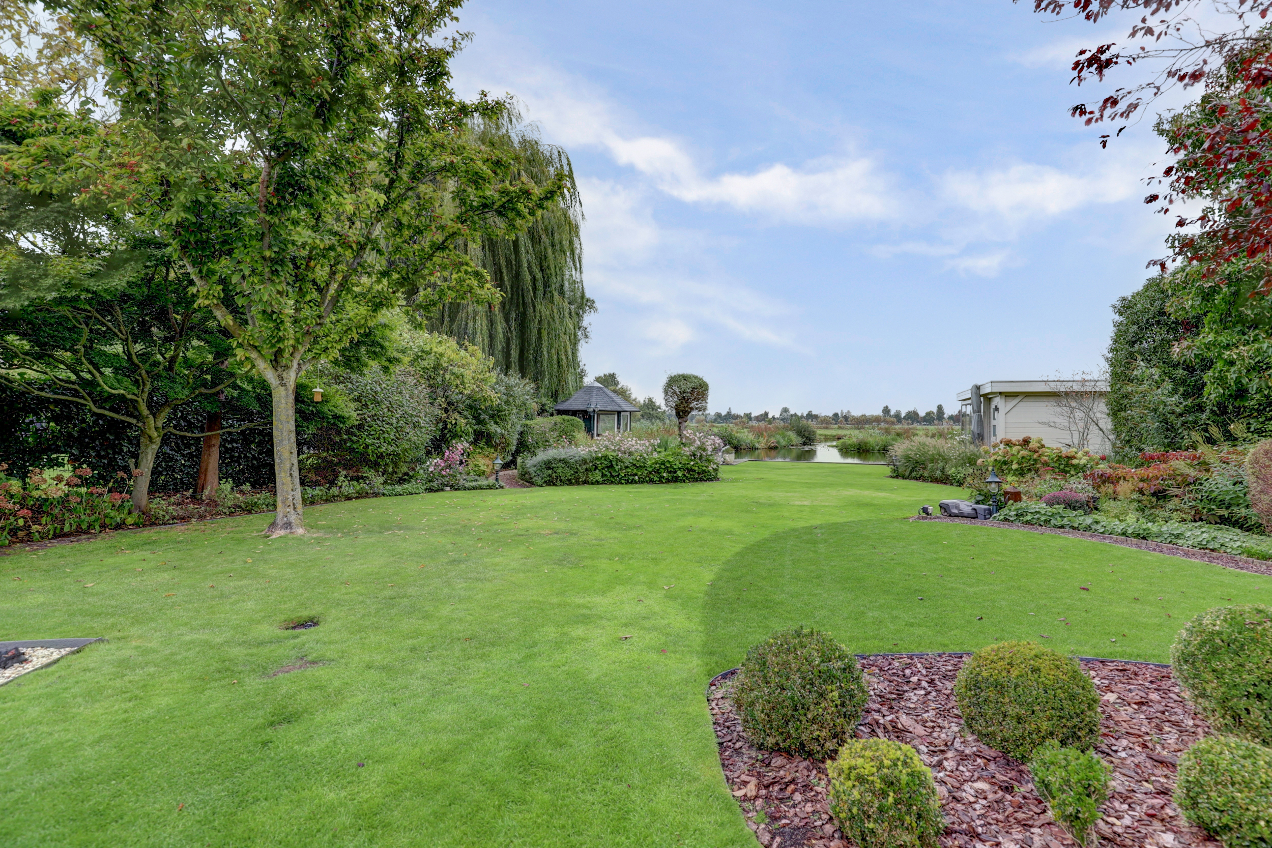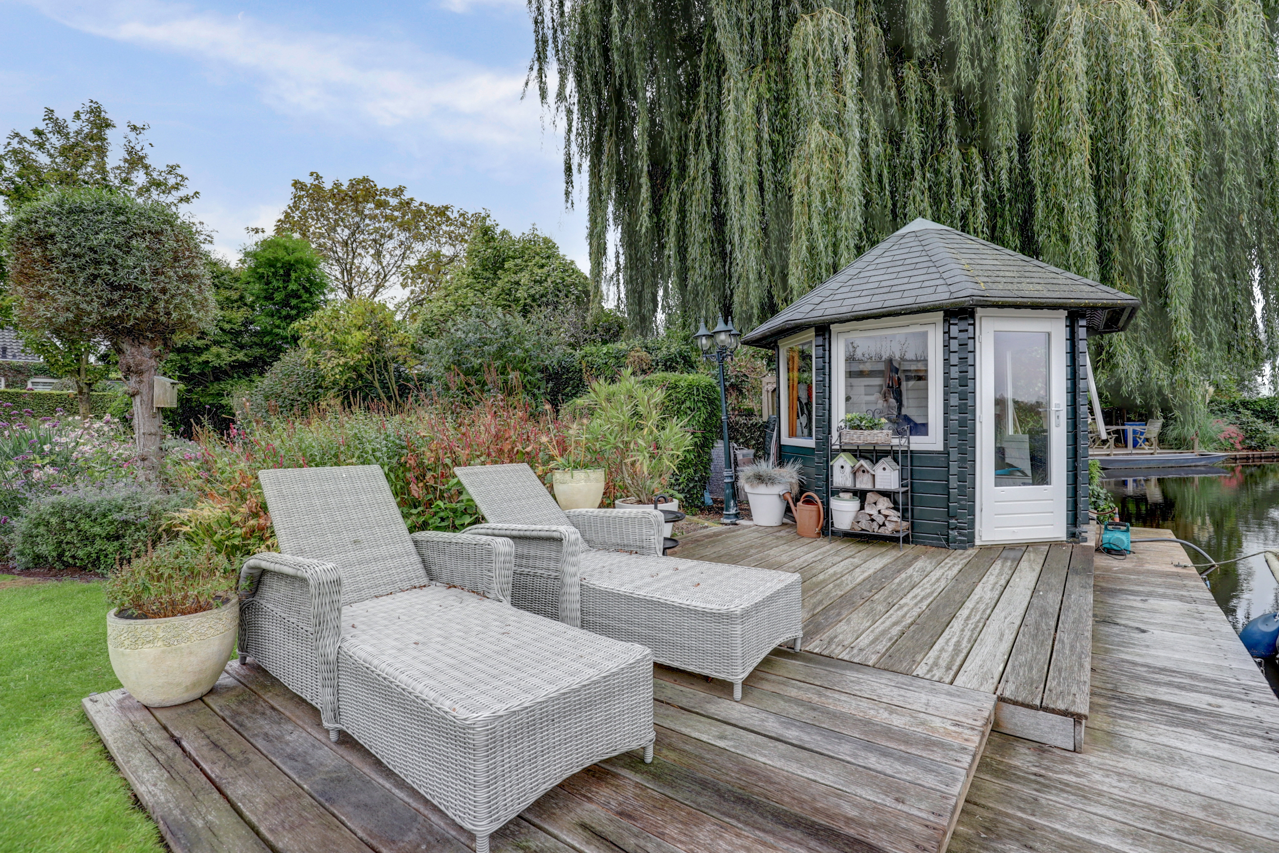 De achtertuin is een waar landschapsontwerp, gazons worden afgewisseld met slingerende paden, strak geschoren hagen, volwassen bomen en kleurrijke borders. Direct achter de woning liggen twee zonnige terrassen met lichtgekleurde keramische tegels. Verderop in de tuin treft u een sierlijke vijver met bruggetje en verhoogde plantvakken. Helemaal aan het water staat een charmant tuinverblijf in hout, in crème/witte kleur geschilderd, voorzien van glazen schuifpanelen, zodat u het hele jaar door beschut kunt loungen met vrij uitzicht over het water en het rietland. De houten steiger biedt plek voor ligstoelen en een bootje.