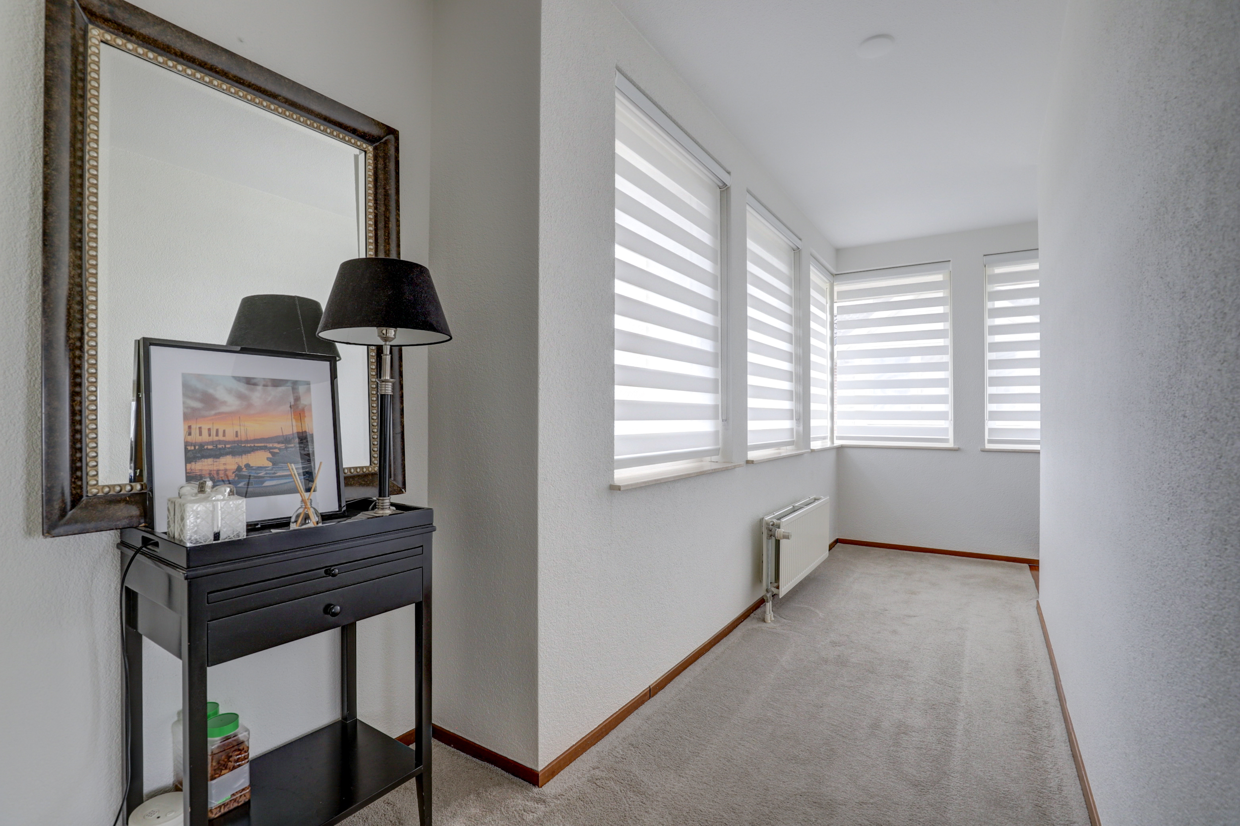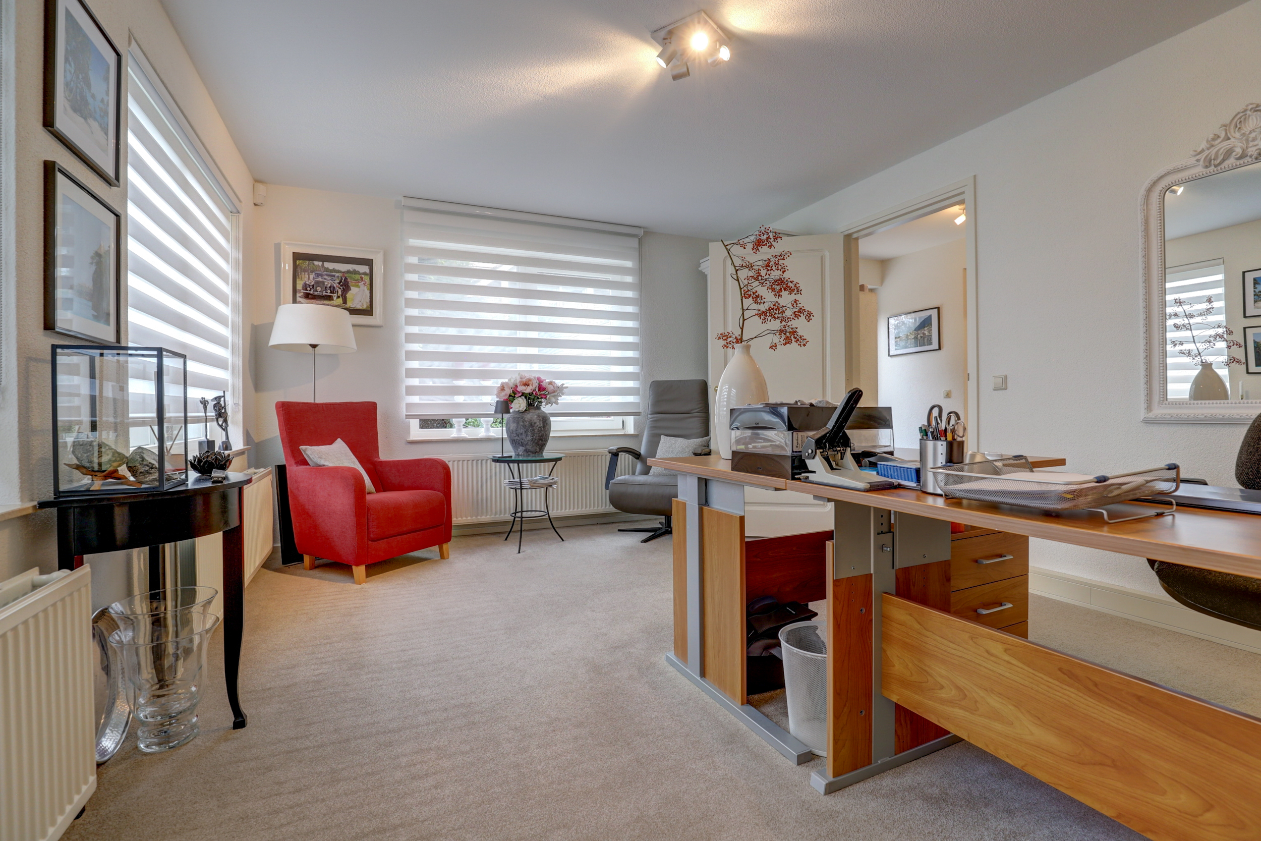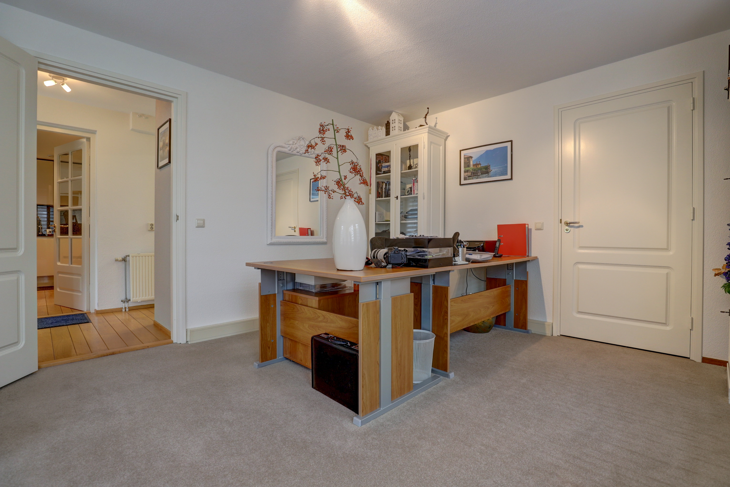 Vanuit de keuken loopt u door naar een hal die toegang geeft tot de garage met wasmachine- en drogeraansluitingen. Vanuit deze hal bereikt u tevens een extra kamer die momenteel in gebruik is als kantoor. Deze kamer beschikt over een eigen en-suite badkamer met toilet, douche en dubbele wastafel. Dankzij deze indeling is deze ruimte uitstekend geschikt als master bedroom op de begane grond of als comfortabele gastenkamer.