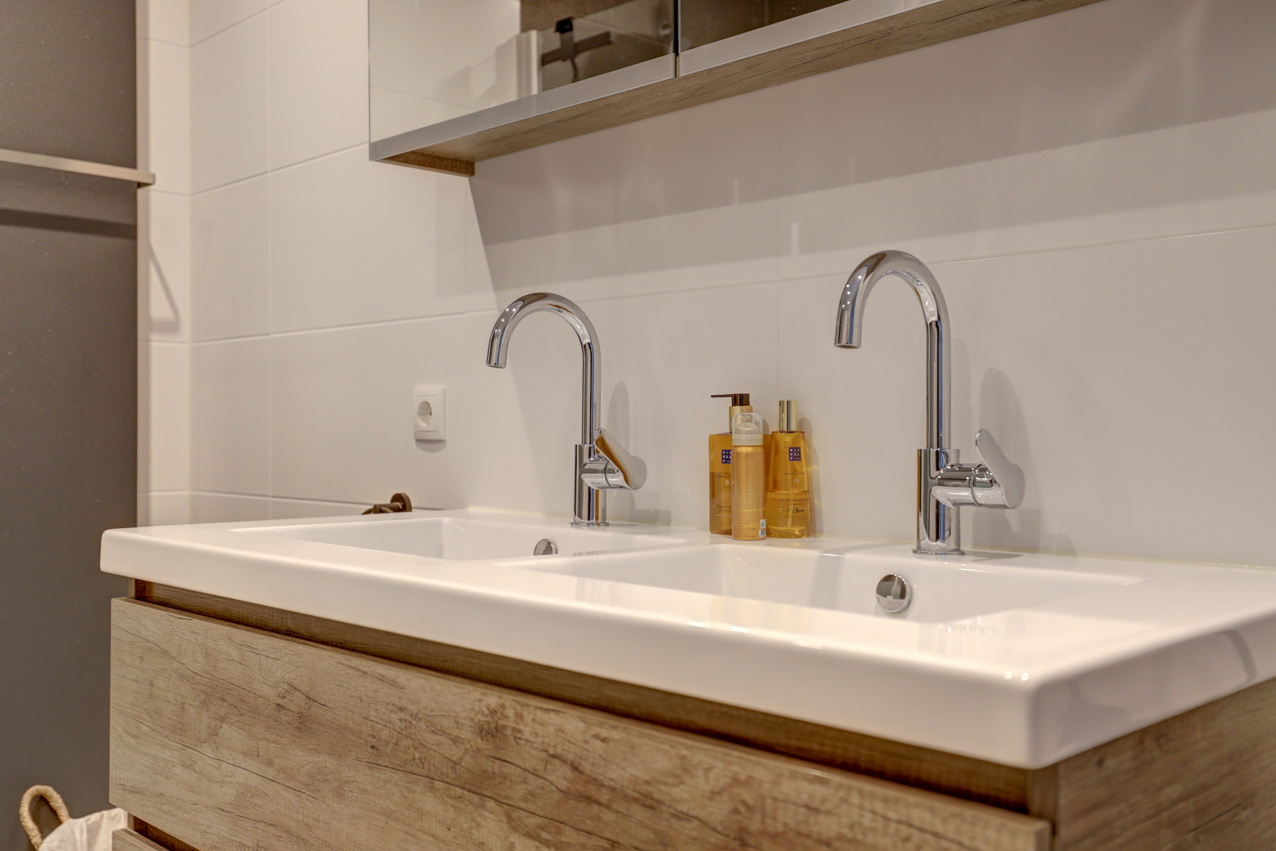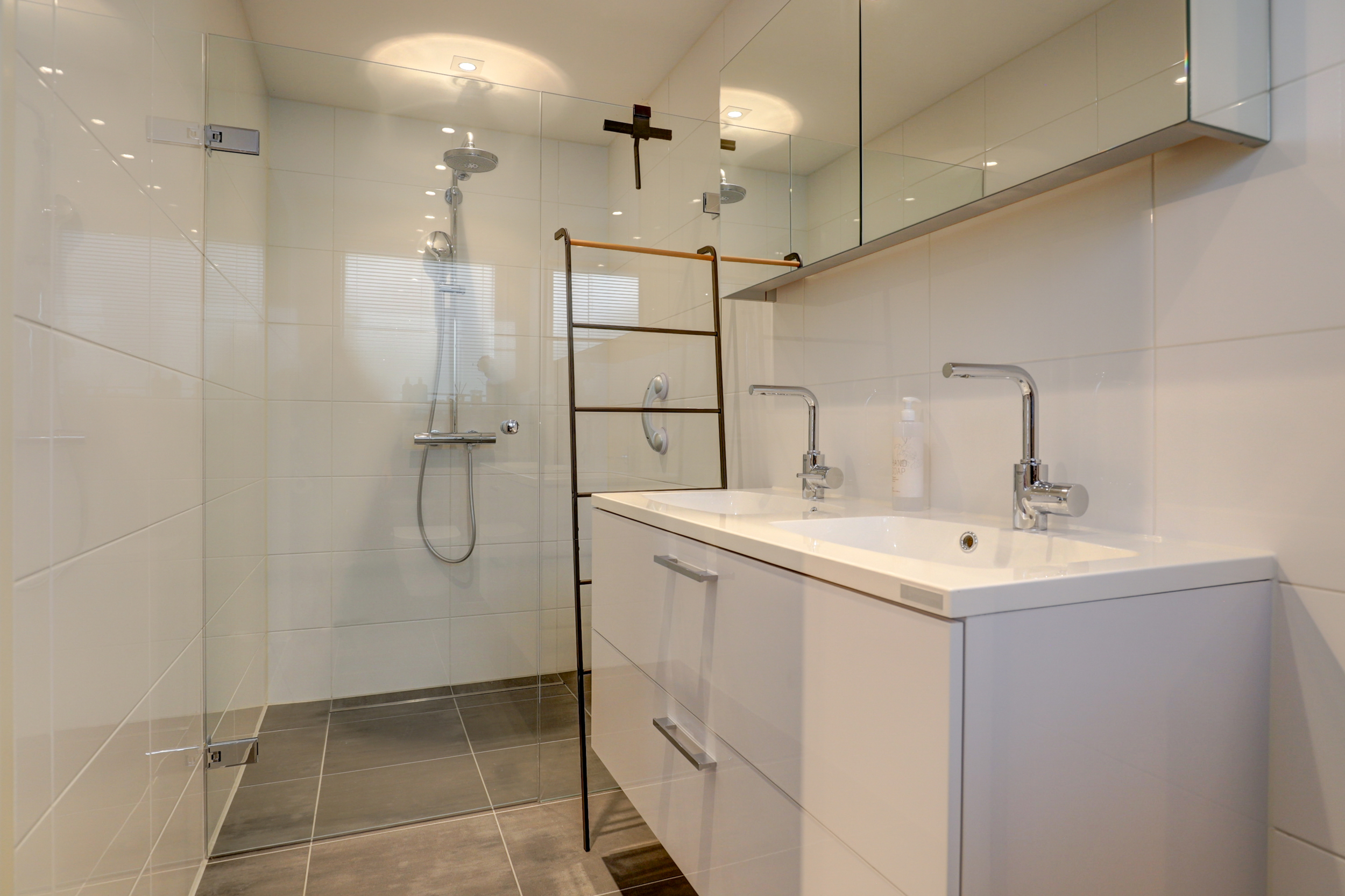 – Moderne badkamer met inloopdouche en dubbele wastafel;