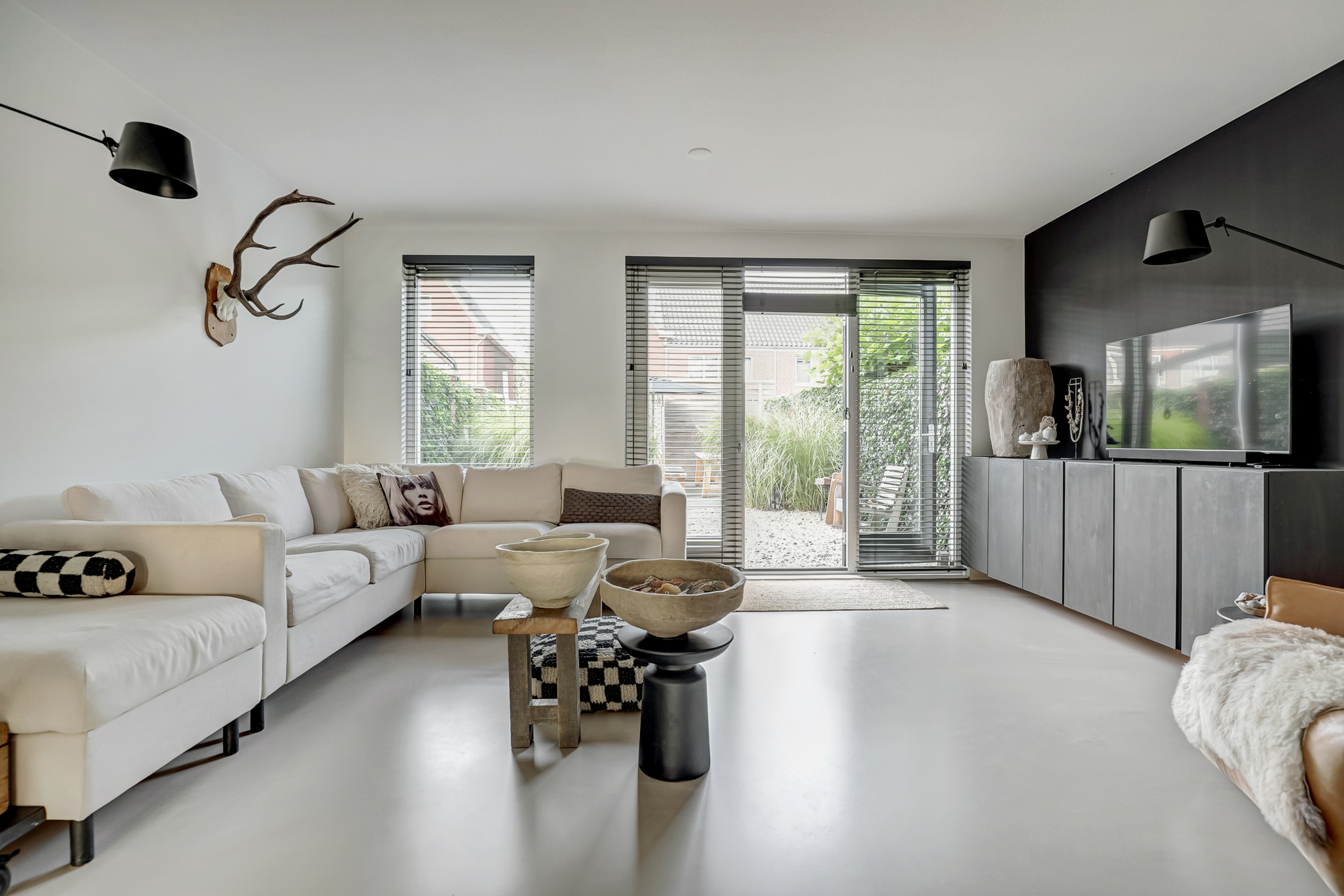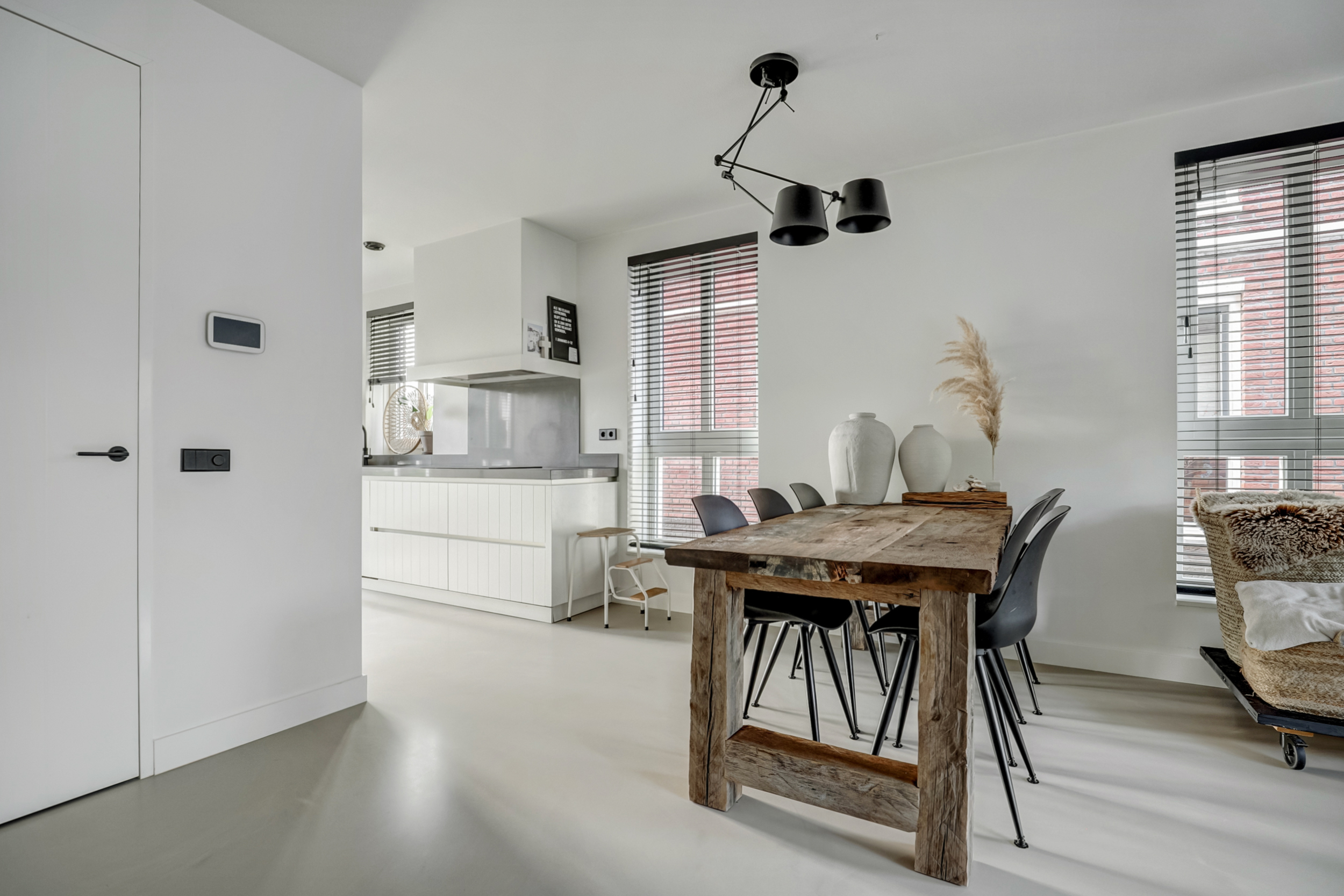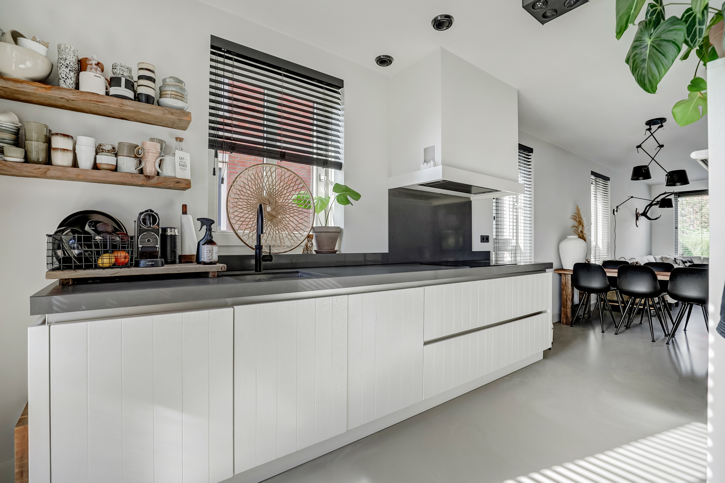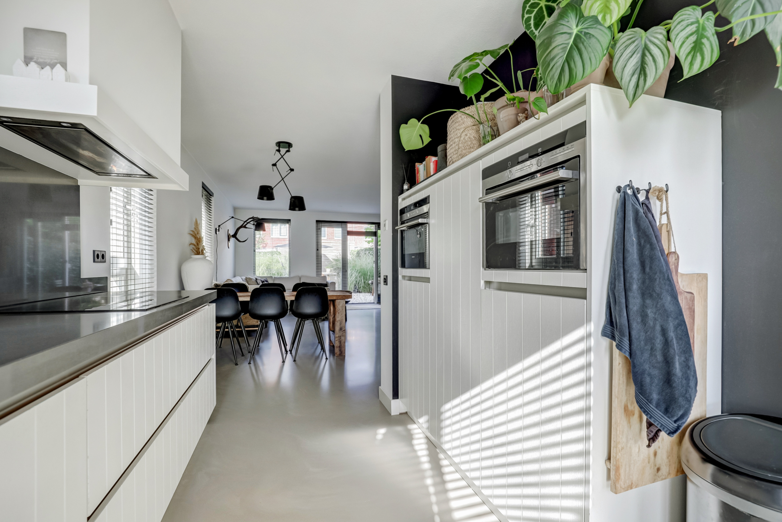 Via de entree komt u in de hal, voorzien van meterkast, trapopgang en een modern toilet met fontein. Vanuit de hal zijn zowel de woonkamer als de keuken bereikbaar. De royale en lichte woonkamer is strak afgewerkt, beschikt over grote raampartijen en een openslaande deur naar de zonnige achtertuin. Er is ruim plaats voor een comfortabele zithoek en een eettafel. De moderne lichtgrijze gietvloer geeft de ruimte een strakke en eigentijdse uitstraling. De open keuken aan de voorzijde van de woning is uitgevoerd in een stijlvol design met hardstenen werkblad en voorzien van hoogwaardige inbouwapparatuur, waaronder een Quooker, inductiekookplaat, oven, magnetron, afzuigkap, koelkast, vriezer en vaatwasser. De praktische indeling en strakke lijnen maken dit een ideale plek om te koken en samen te komen.