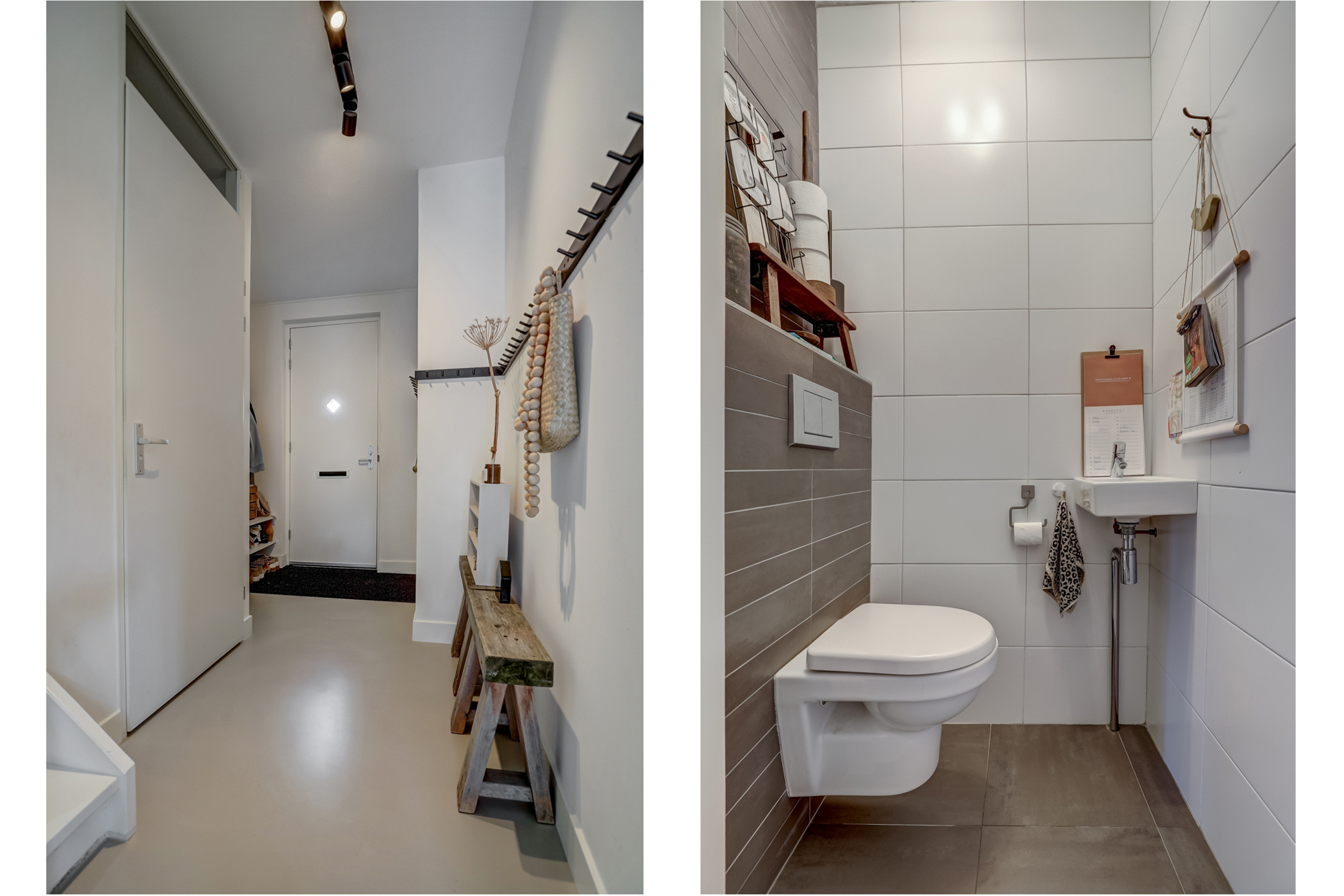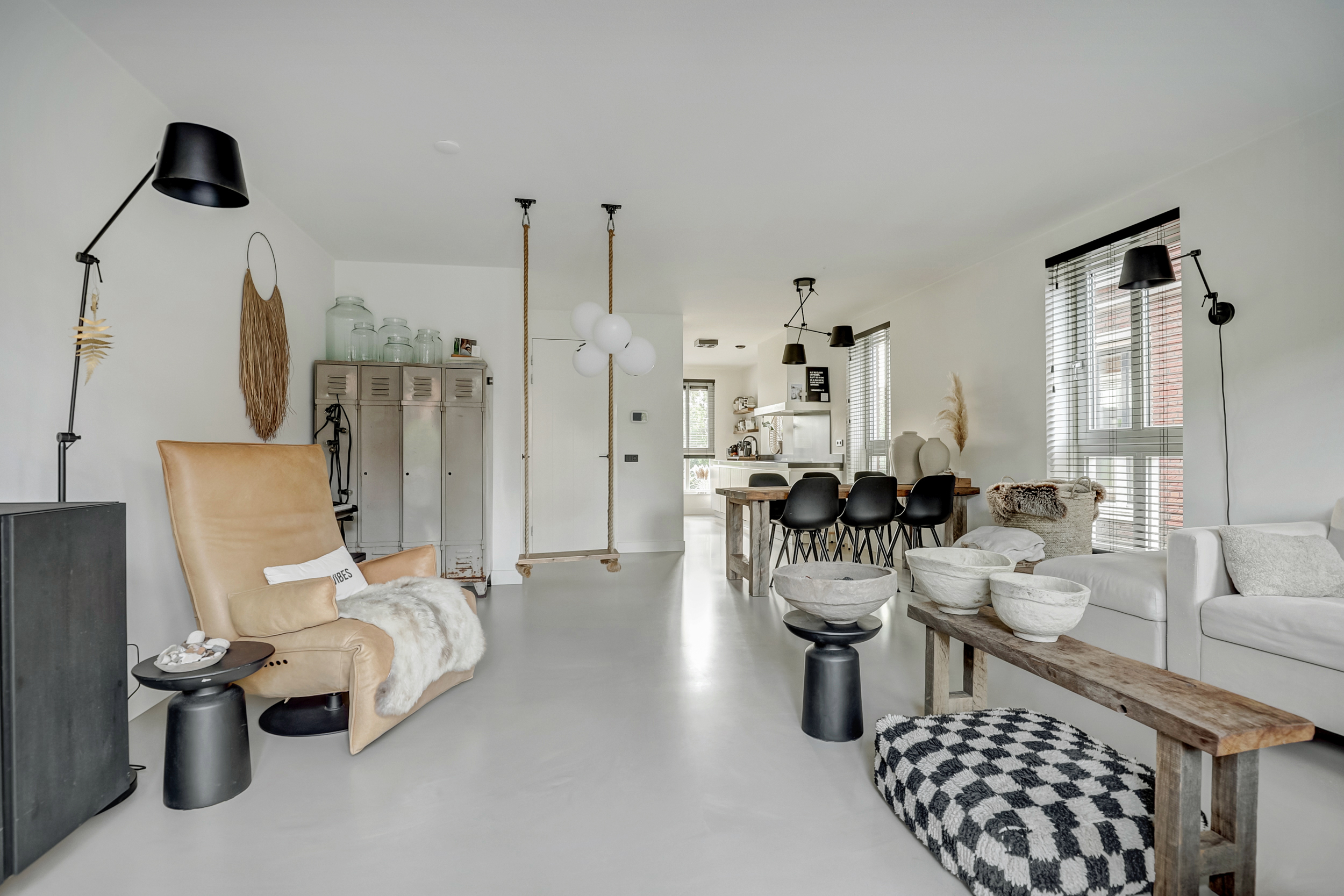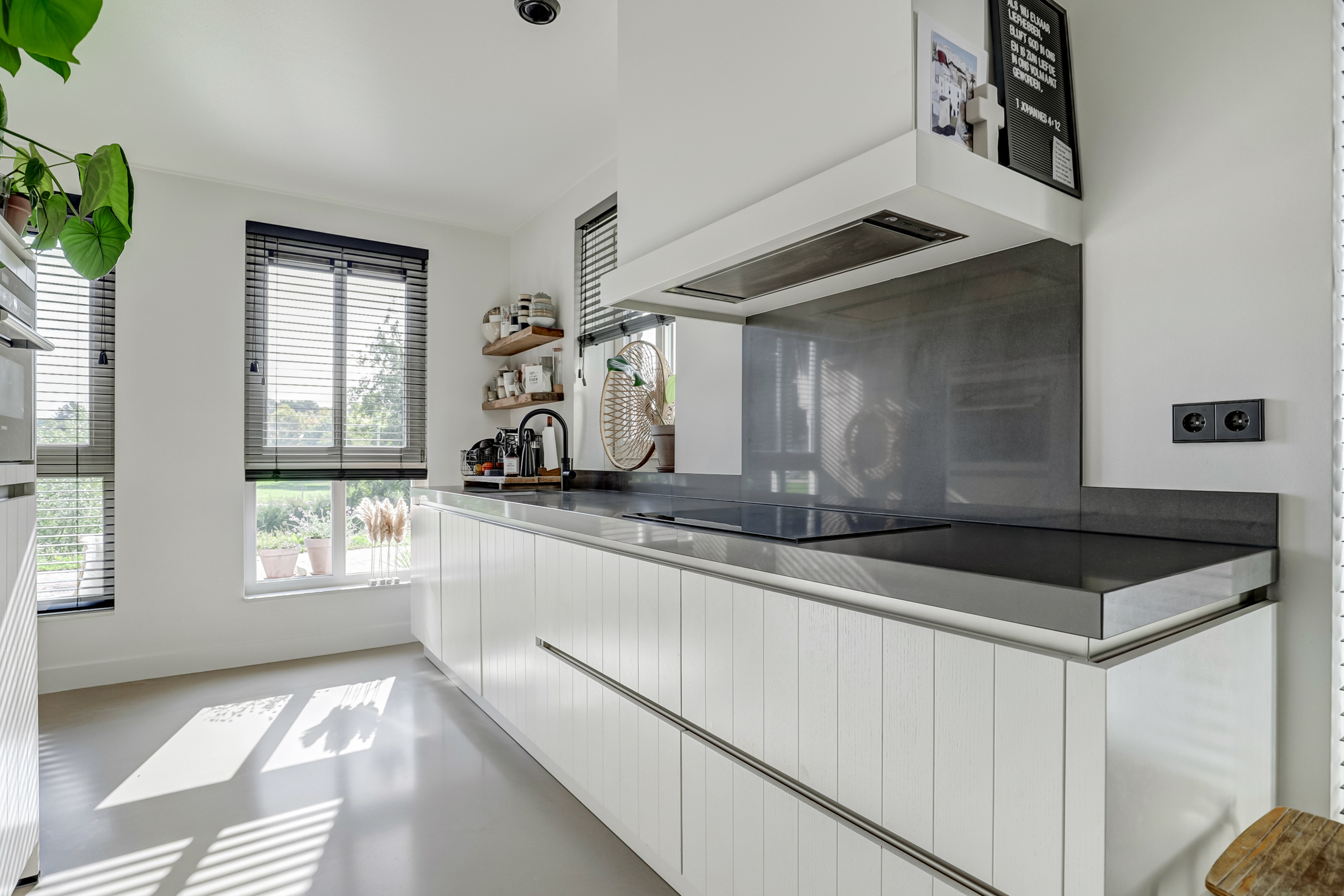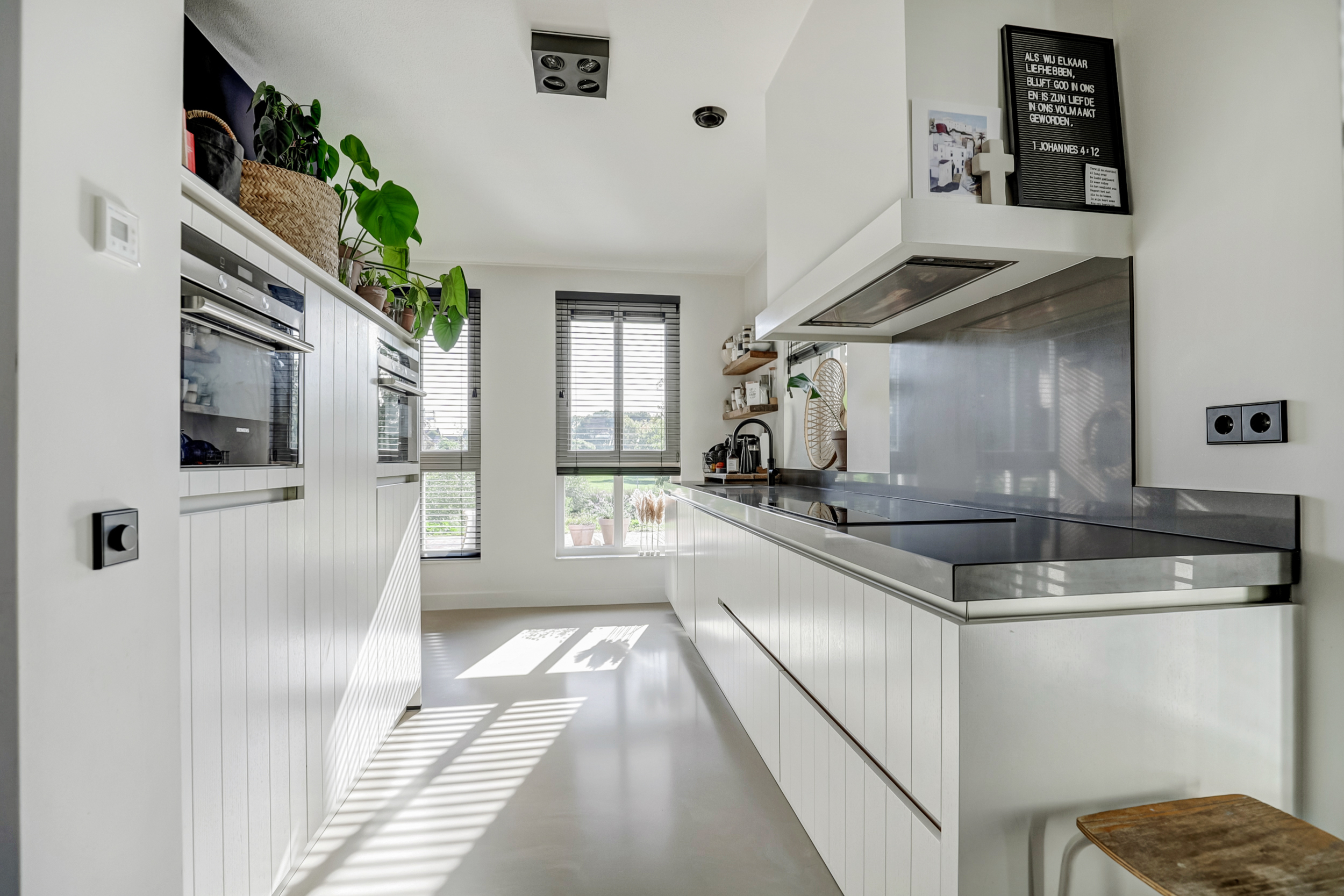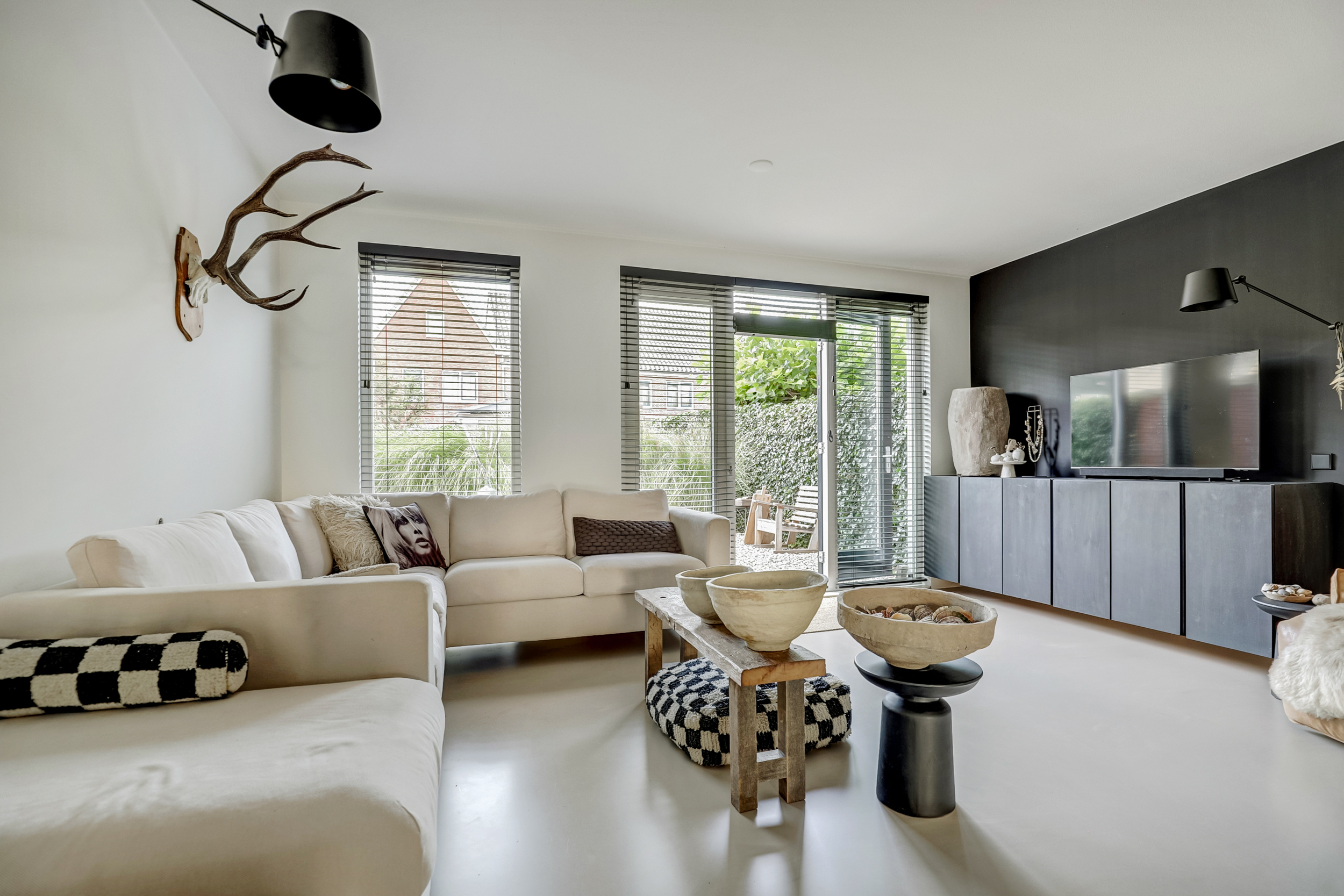 Via de entree komt u in de hal, voorzien van meterkast, trapopgang en een modern toilet met fontein. Vanuit de hal zijn zowel de woonkamer als de keuken bereikbaar. De royale en lichte woonkamer is strak afgewerkt, beschikt over grote raampartijen en een openslaande deur naar de zonnige achtertuin. Er is ruim plaats voor een comfortabele zithoek en een eettafel. De moderne lichtgrijze gietvloer geeft de ruimte een strakke en eigentijdse uitstraling. De open keuken aan de voorzijde van de woning is uitgevoerd in een stijlvol design met hardstenen werkblad en voorzien van hoogwaardige inbouwapparatuur, waaronder een Quooker, inductiekookplaat, oven, magnetron, afzuigkap, koelkast, vriezer en vaatwasser. De praktische indeling en strakke lijnen maken dit een ideale plek om te koken en samen te komen.