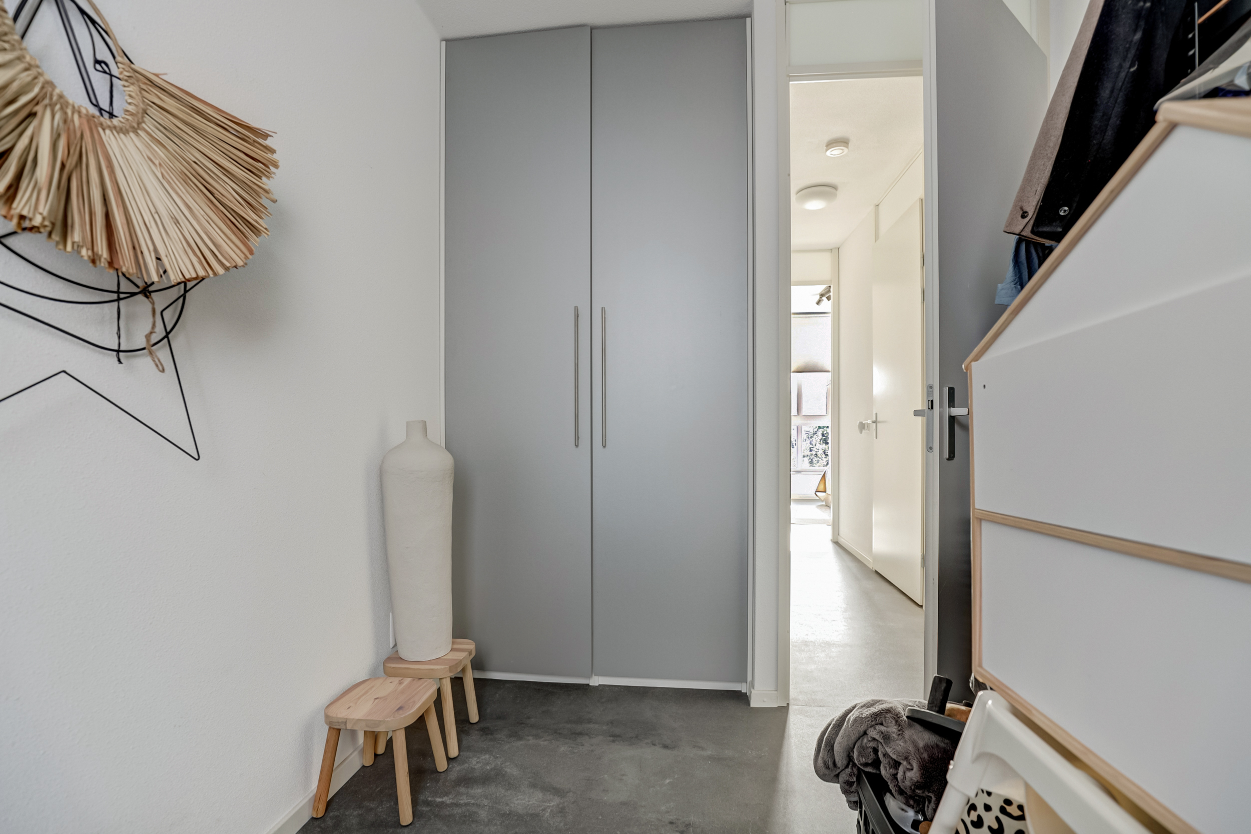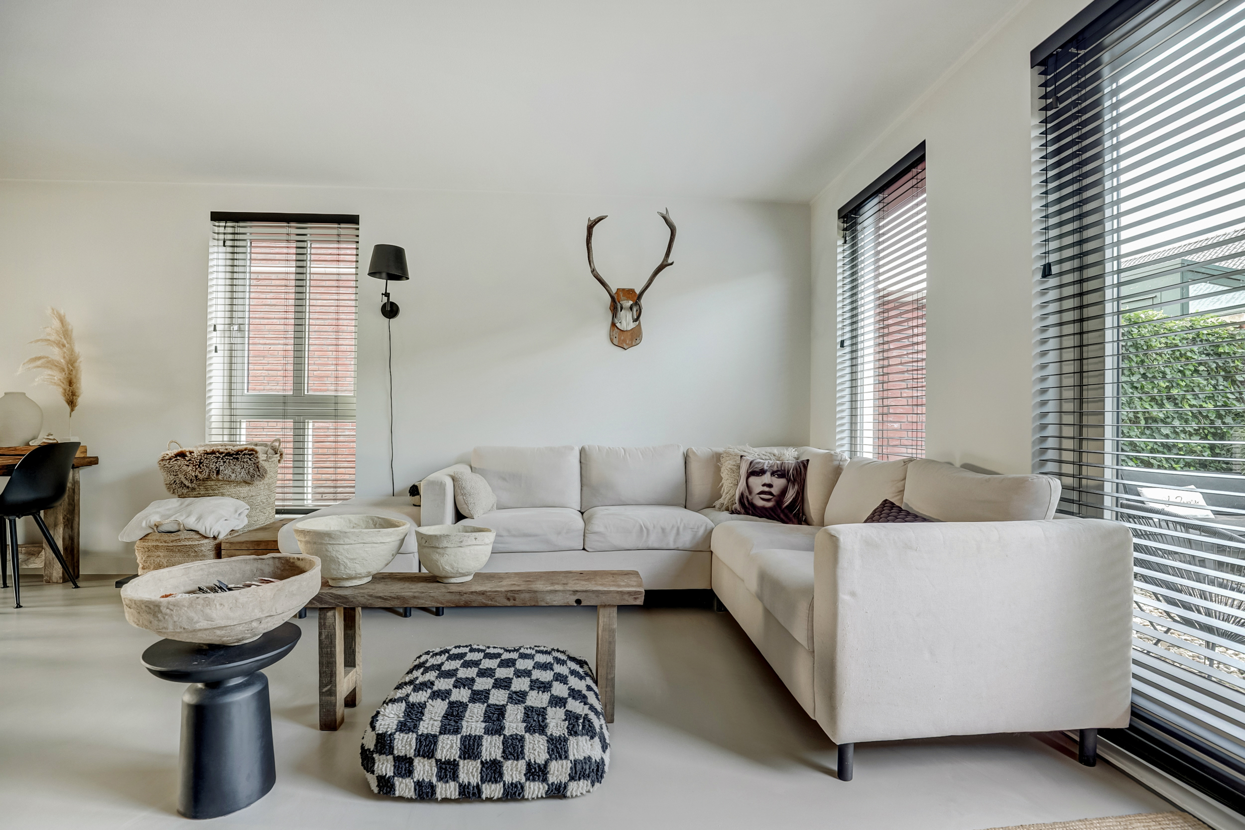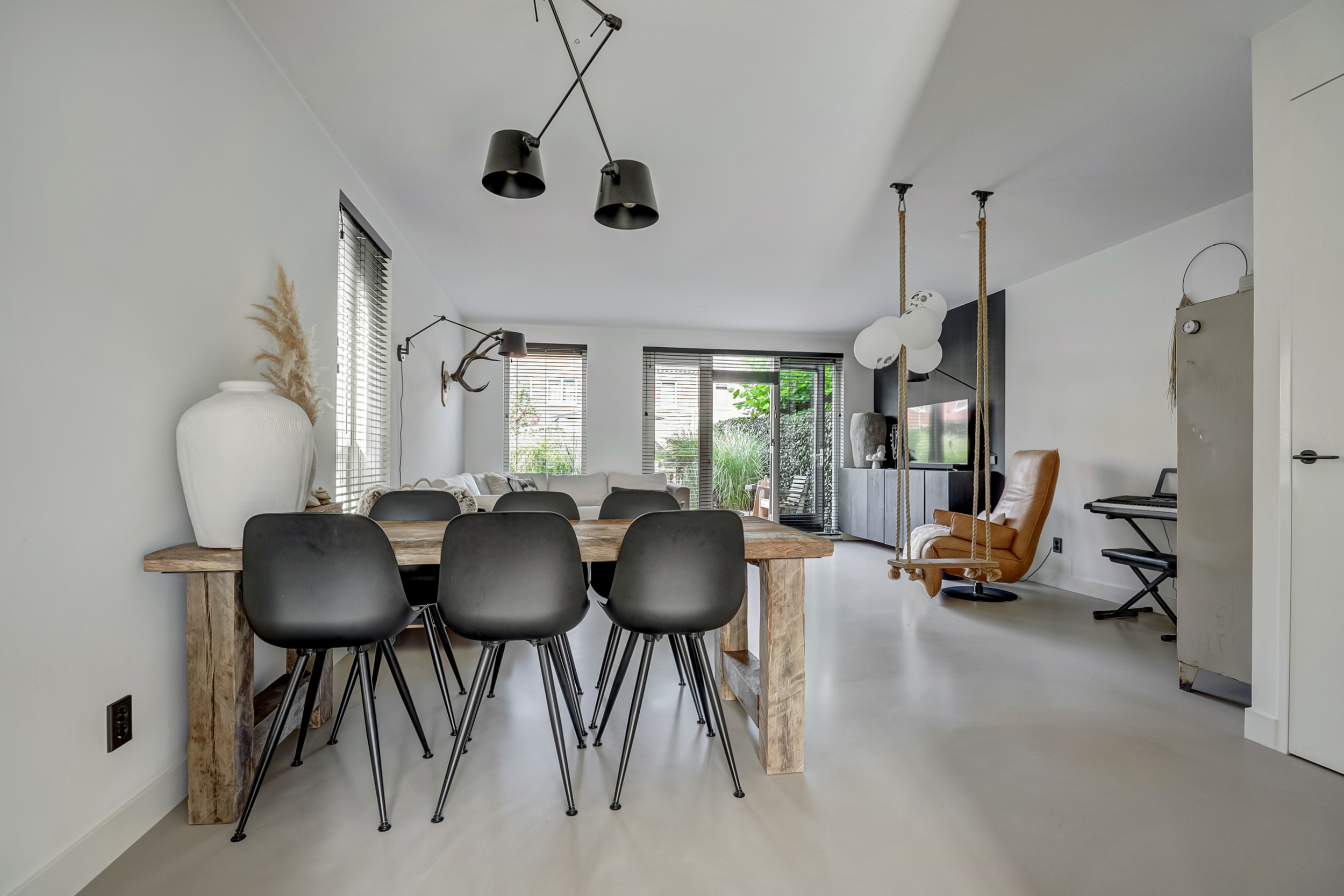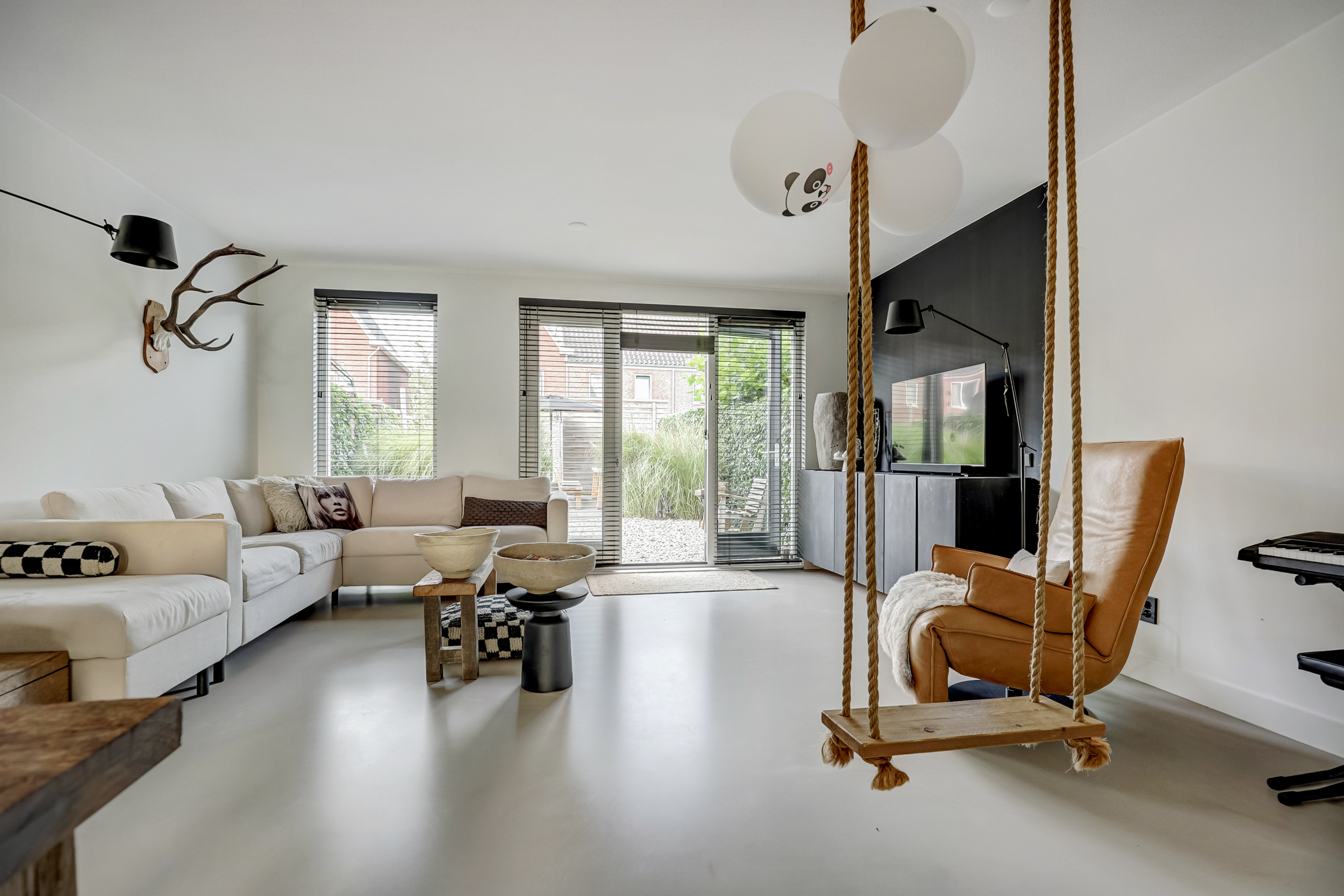 Via de entree komt u in de hal, voorzien van meterkast, trapopgang en een modern toilet met fontein. Vanuit de hal zijn zowel de woonkamer als de keuken bereikbaar. De royale en lichte woonkamer is strak afgewerkt, beschikt over grote raampartijen en een openslaande deur naar de zonnige achtertuin. Er is ruim plaats voor een comfortabele zithoek en een eettafel. De moderne lichtgrijze gietvloer geeft de ruimte een strakke en eigentijdse uitstraling. De open keuken aan de voorzijde van de woning is uitgevoerd in een stijlvol design met hardstenen werkblad en voorzien van hoogwaardige inbouwapparatuur, waaronder een Quooker, inductiekookplaat, oven, magnetron, afzuigkap, koelkast, vriezer en vaatwasser. De praktische indeling en strakke lijnen maken dit een ideale plek om te koken en samen te komen.