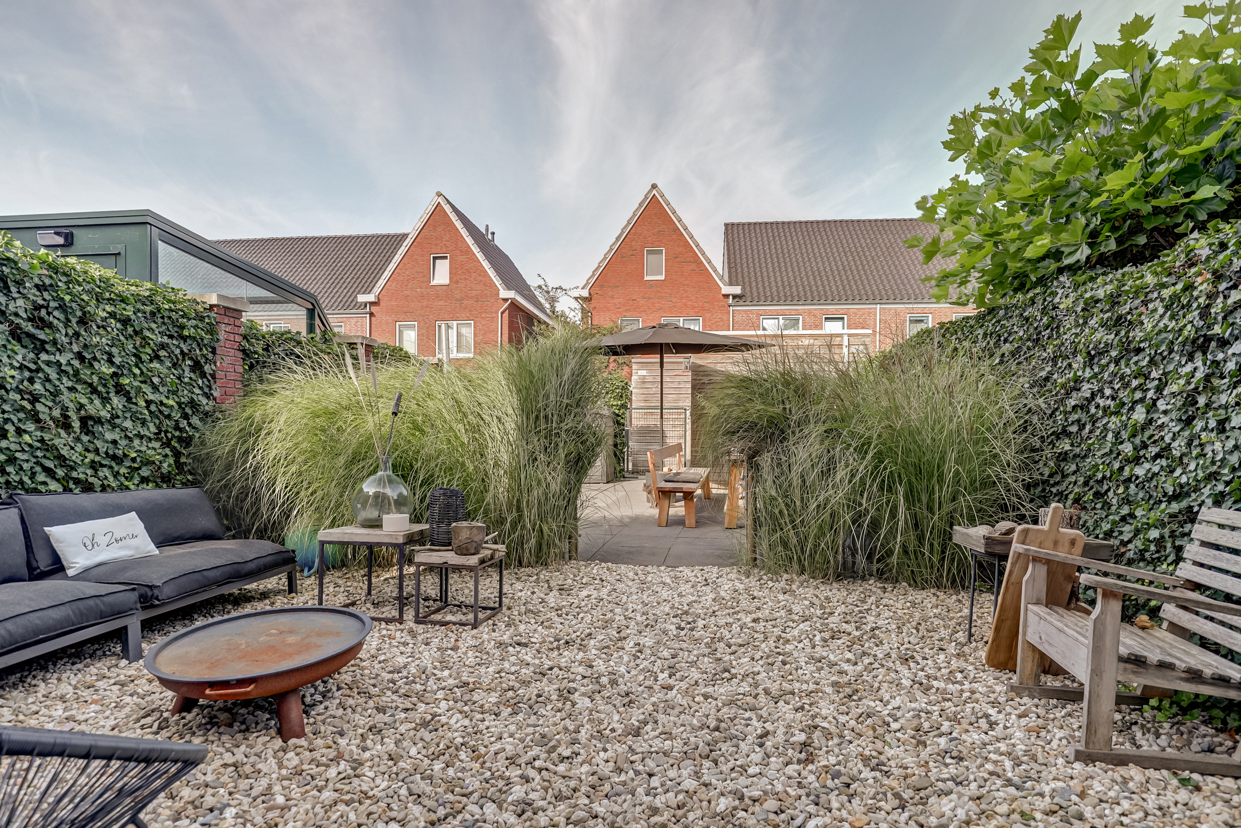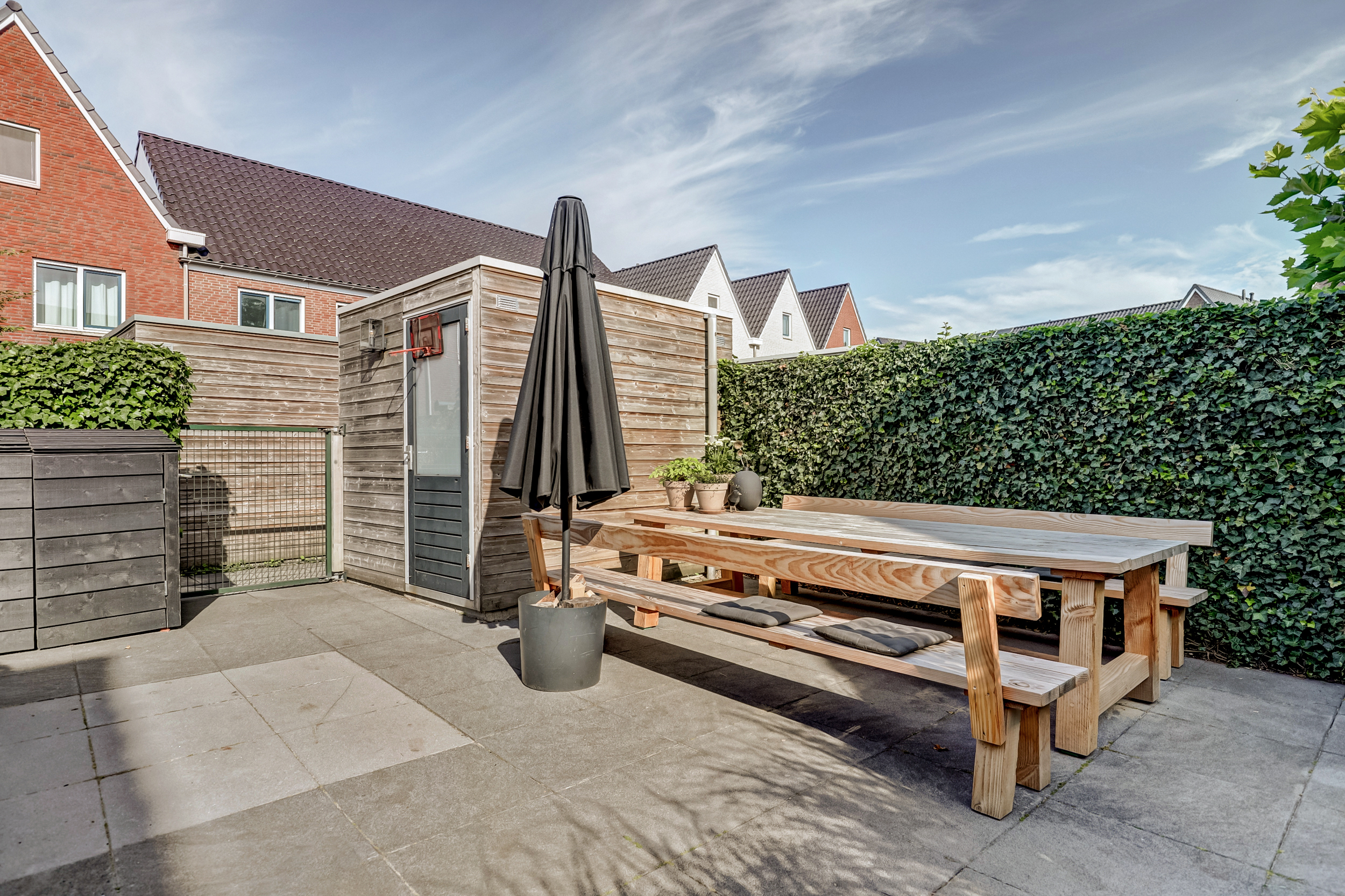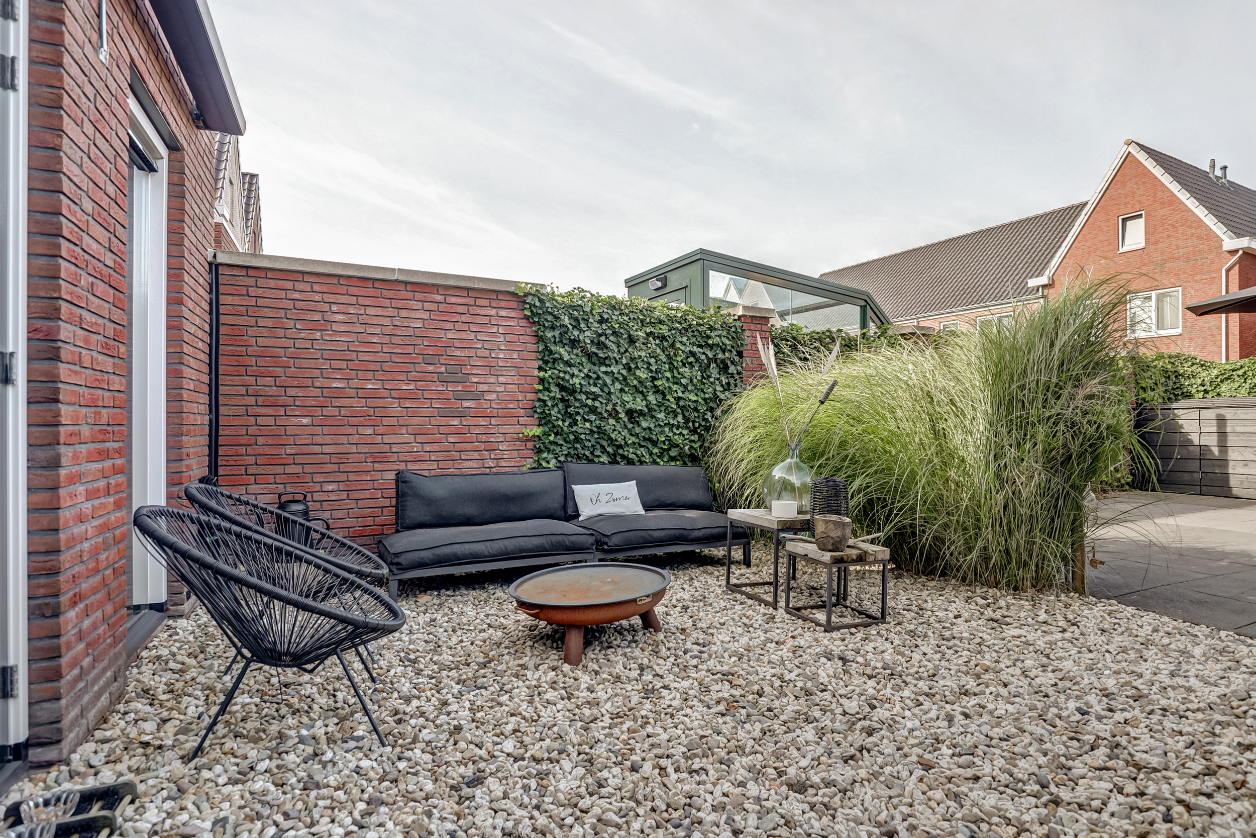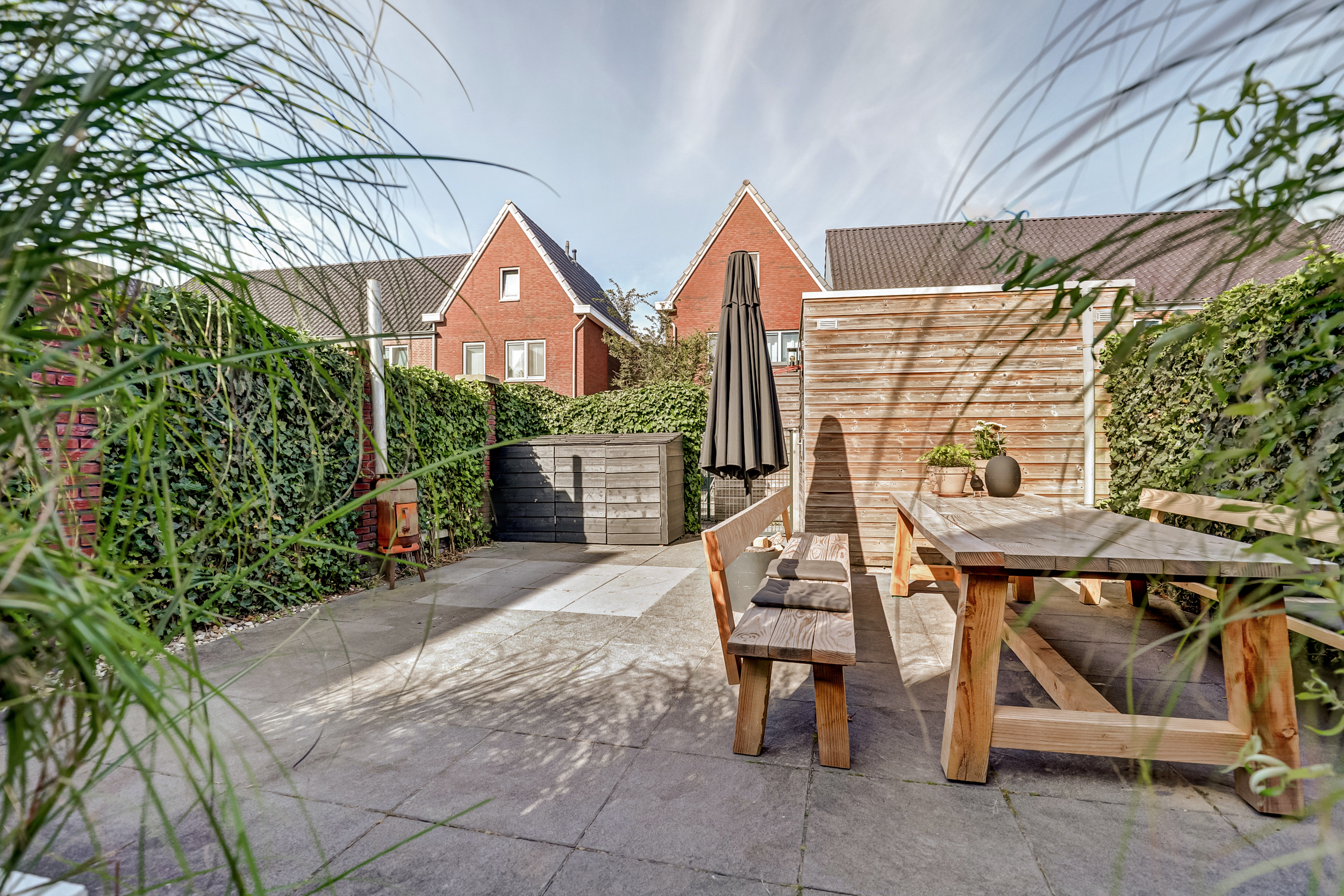 De achtertuin is verzorgd en onderhoudsvriendelijk aangelegd, met grote sierstenen, een ligging op het zuidwesten en veel privacy. Er zijn twee zitgedeeltes gecreëerd, waardoor er volop ruimte is voor zowel een loungeset als een eettafel om optimaal van de zon te genieten. Direct aan de woning ligt een strook siergrind en aan de achtergevel is een zonnescherm geplaatst. Verder is de tuin voorzien van een waterkraan en achterin bevindt zich een ruime vrijstaande houten schuur met betonnen vloer en elektriciteit, ideaal voor het opbergen van fietsen en tuingereedschap. De tuin is ook bereikbaar via een achterom.