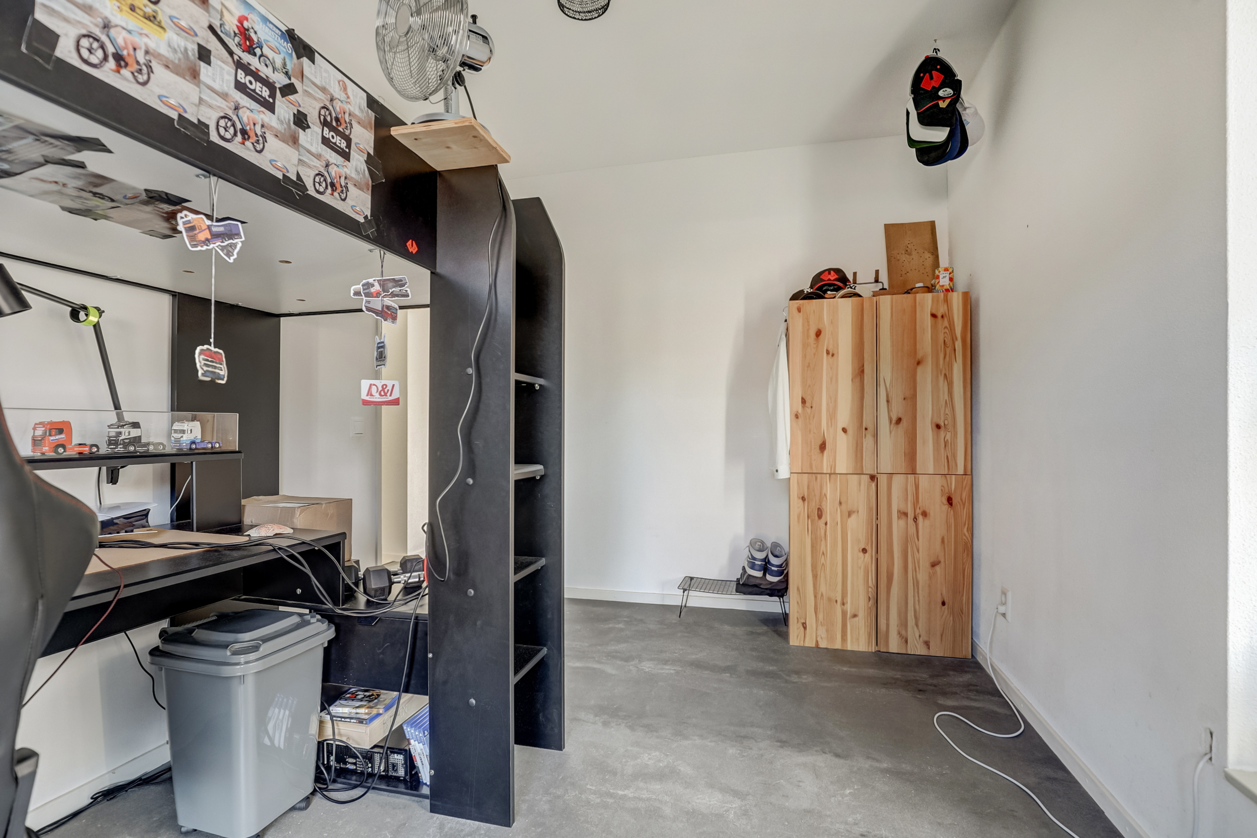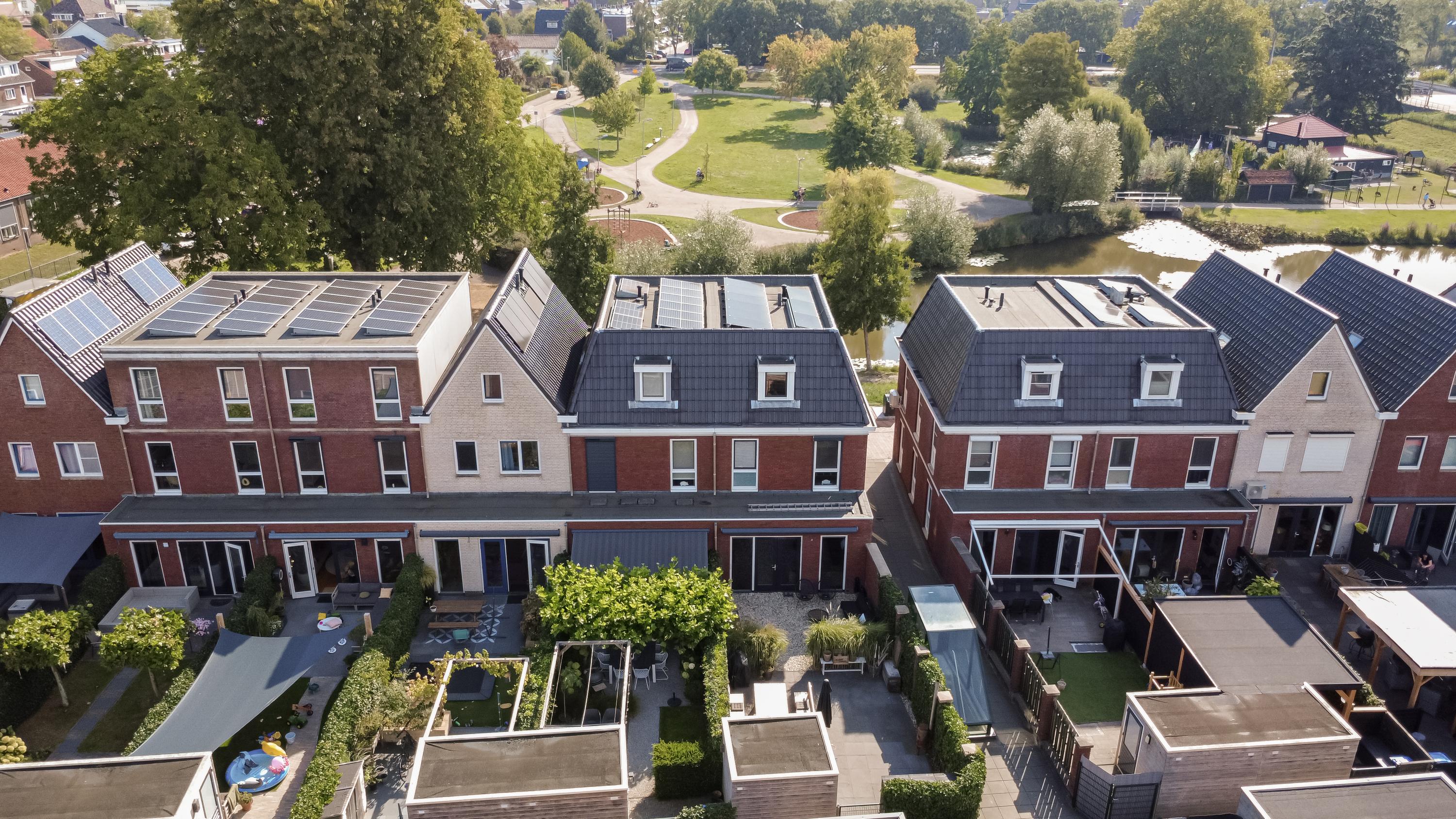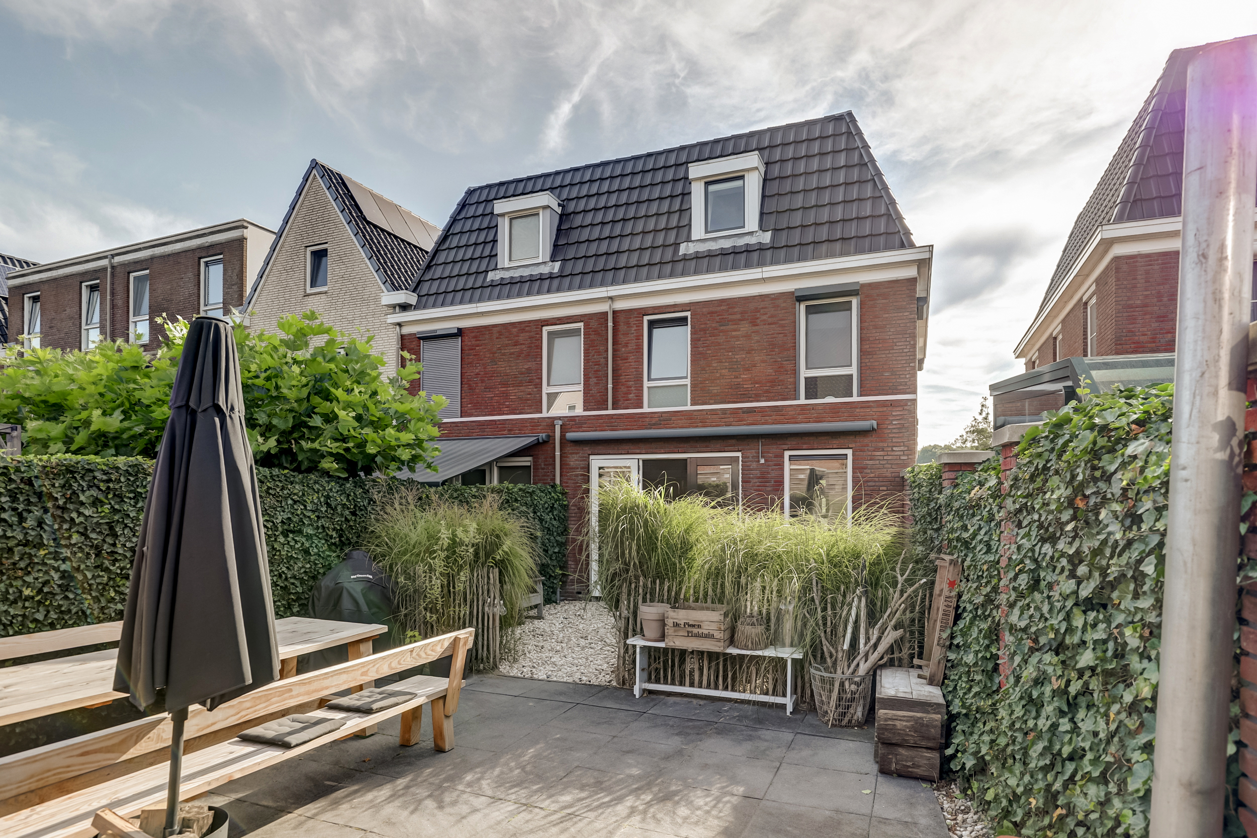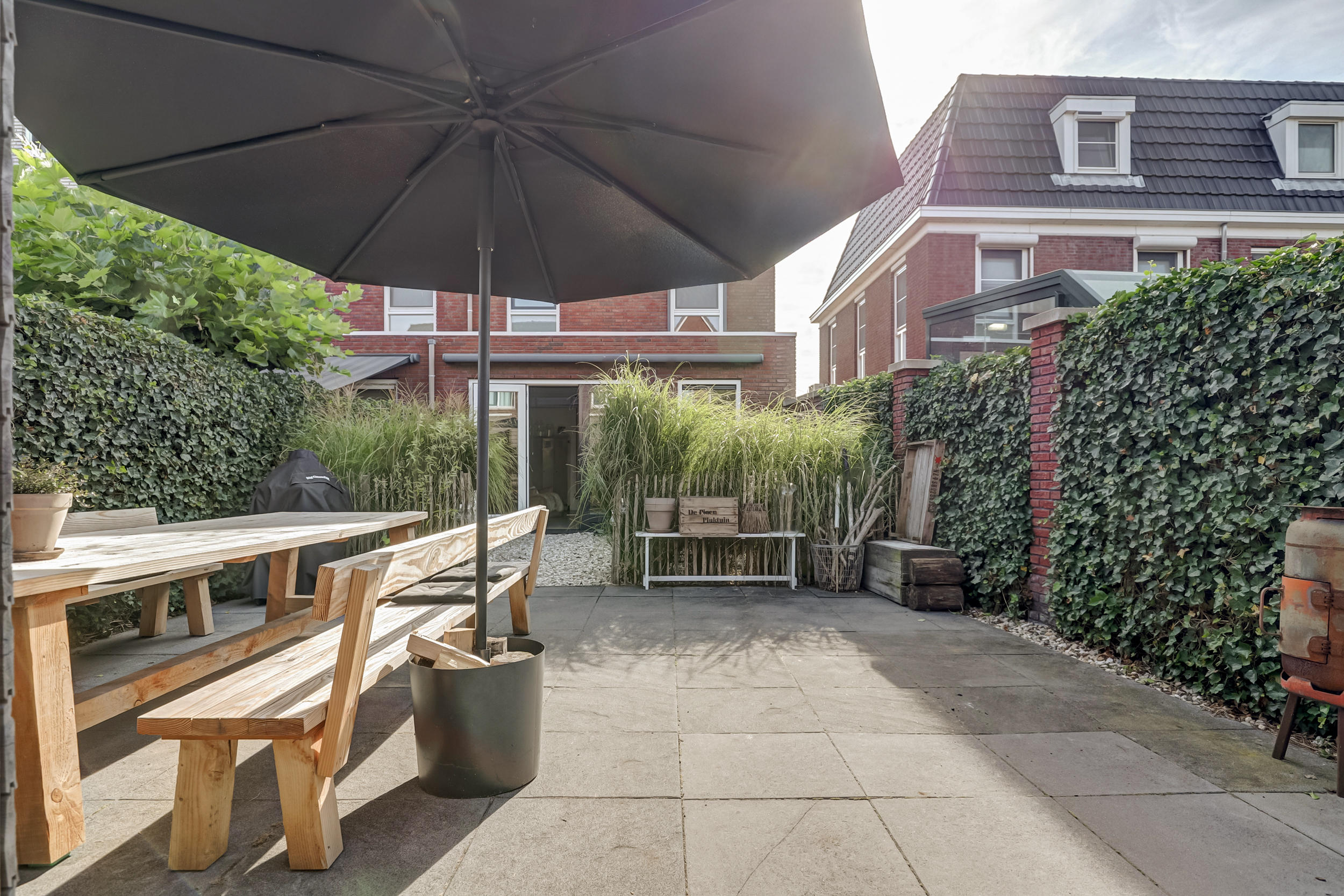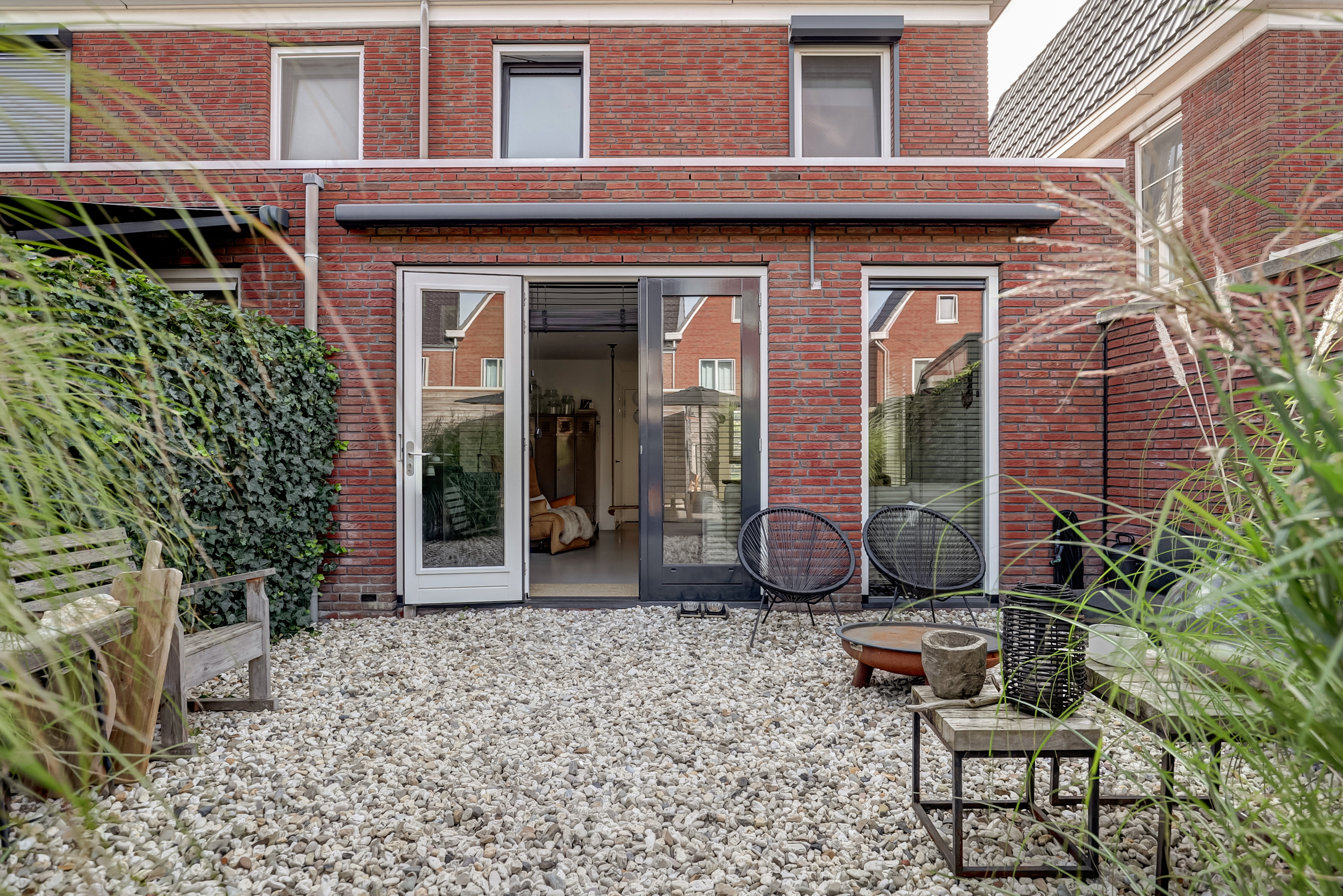 De achtertuin is verzorgd en onderhoudsvriendelijk aangelegd, met grote sierstenen, een ligging op het zuidwesten en veel privacy. Er zijn twee zitgedeeltes gecreëerd, waardoor er volop ruimte is voor zowel een loungeset als een eettafel om optimaal van de zon te genieten. Direct aan de woning ligt een strook siergrind en aan de achtergevel is een zonnescherm geplaatst. Verder is de tuin voorzien van een waterkraan en achterin bevindt zich een ruime vrijstaande houten schuur met betonnen vloer en elektriciteit, ideaal voor het opbergen van fietsen en tuingereedschap. De tuin is ook bereikbaar via een achterom.