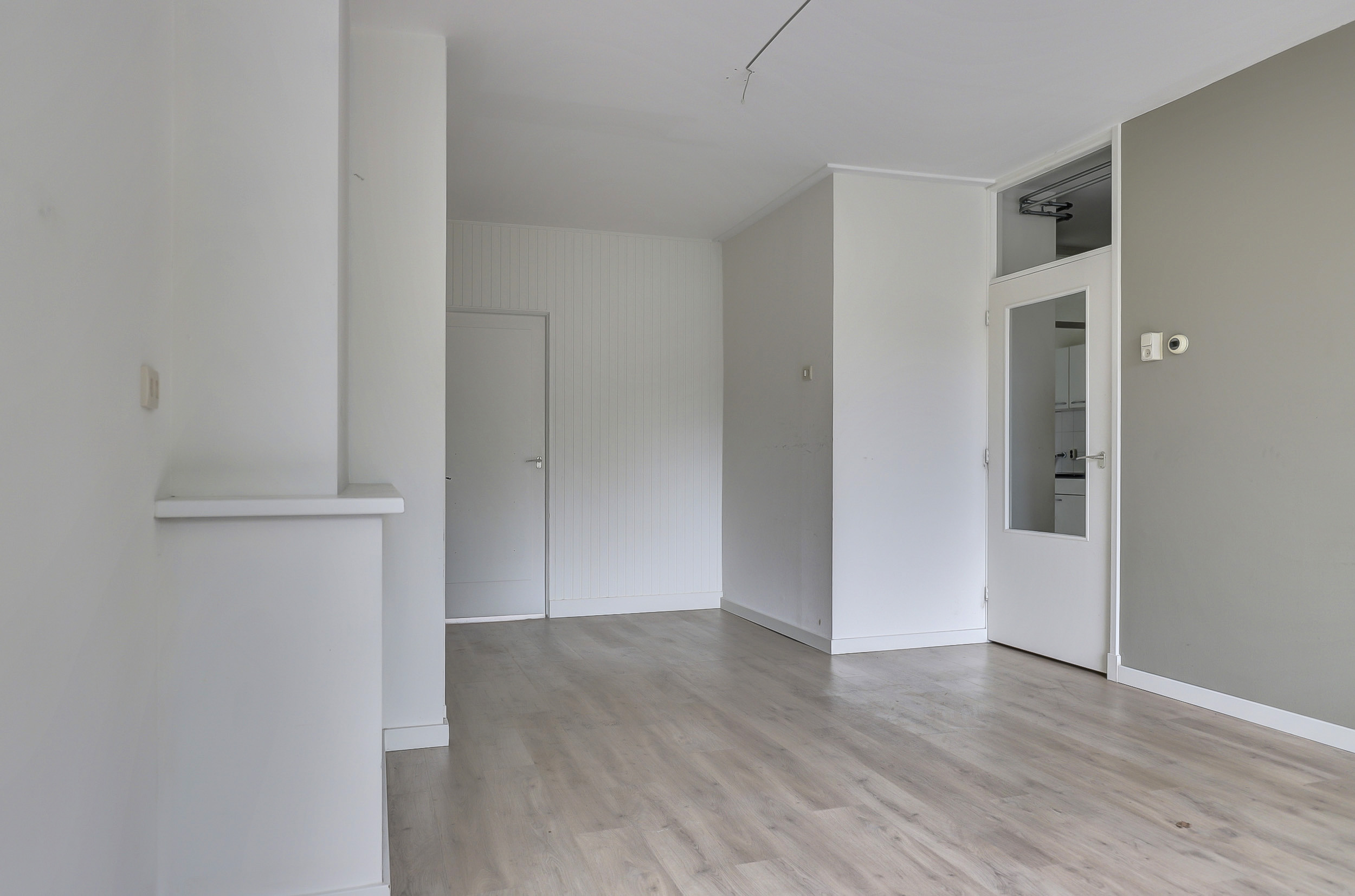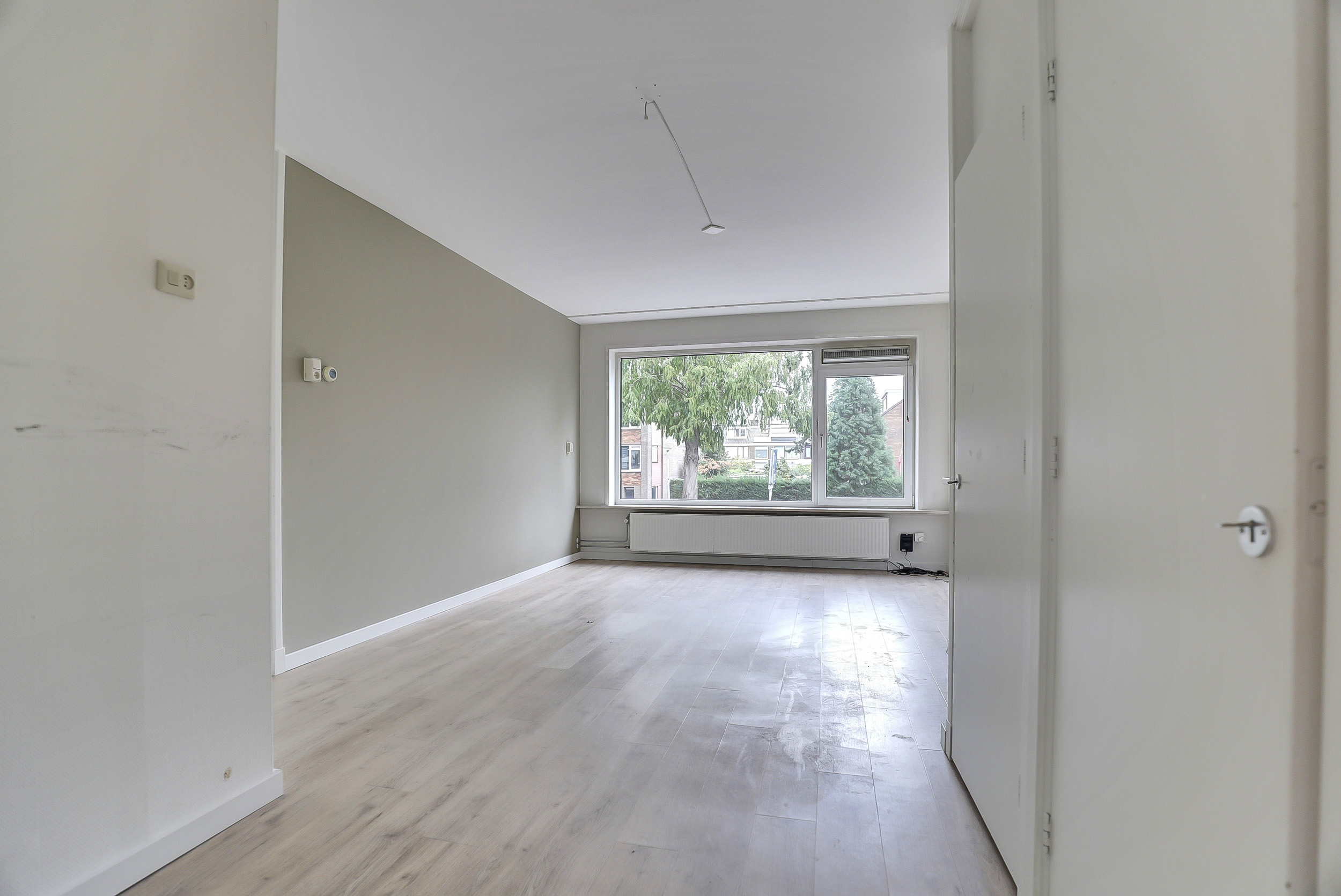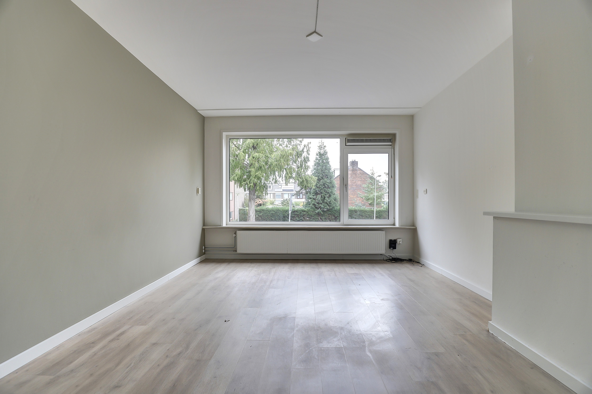 De woonkamer is ruim en licht, dankzij de grote raampartijen aan de voorzijde. De lichte vloer en neutrale wandafwerking zorgen voor een frisse uitstraling. Vanuit de woonkamer kijk je fraai uit over de straatzijde.