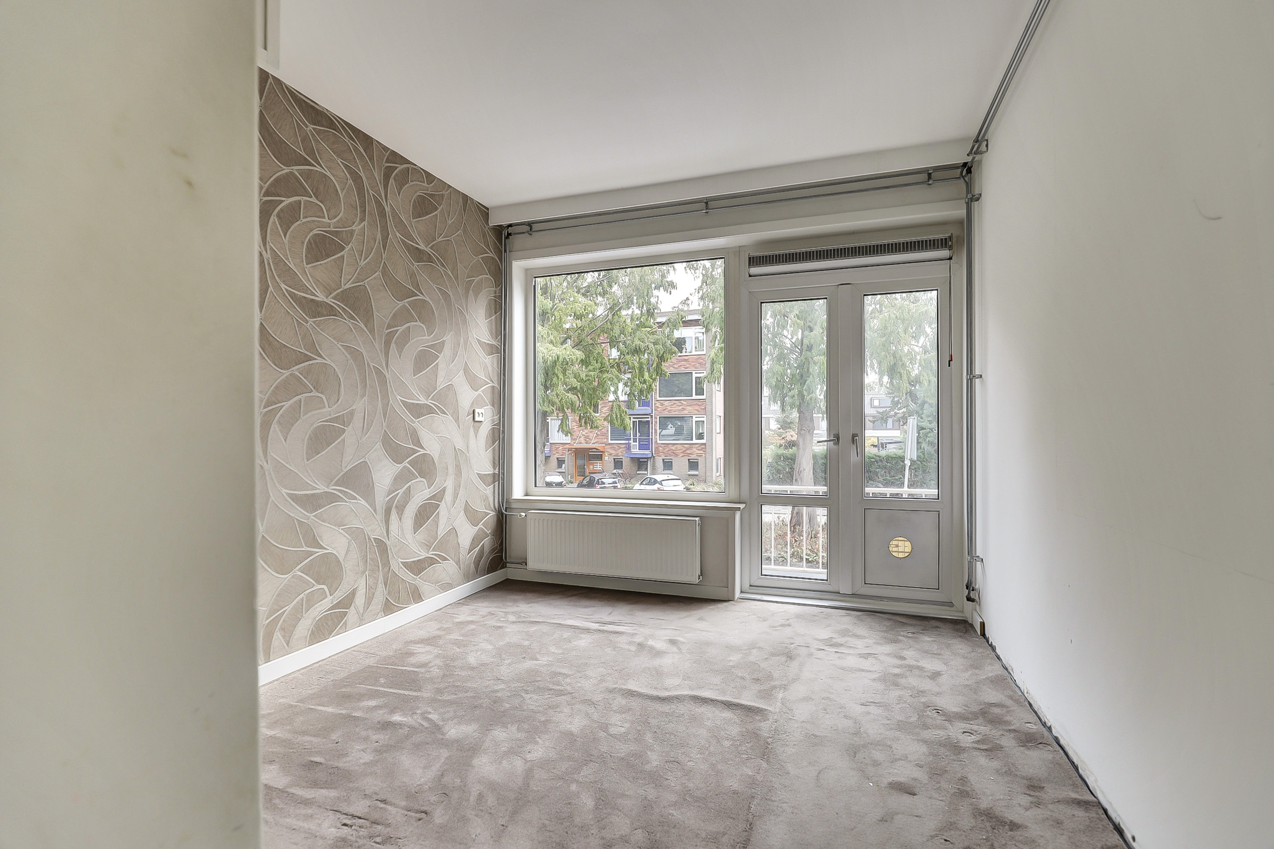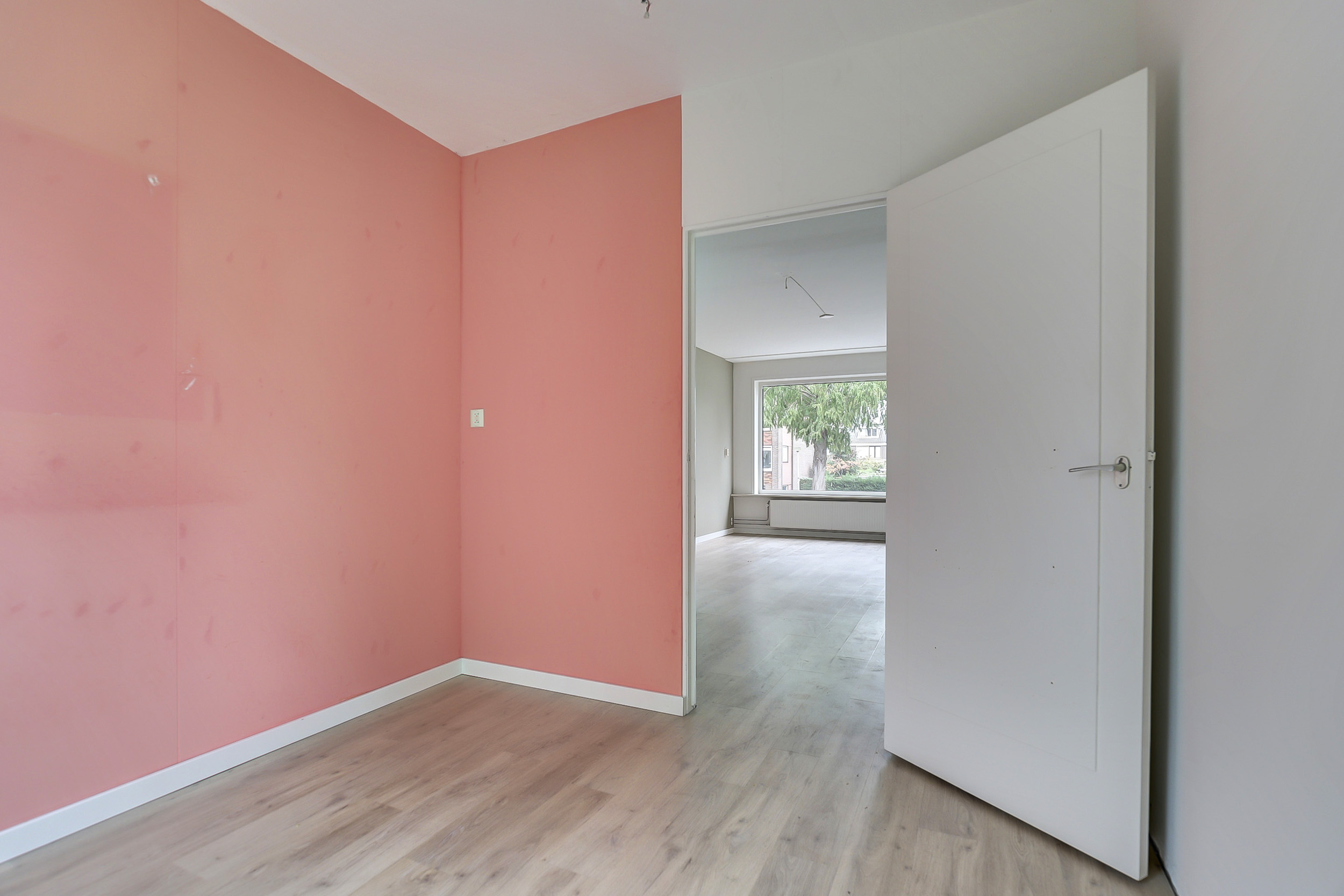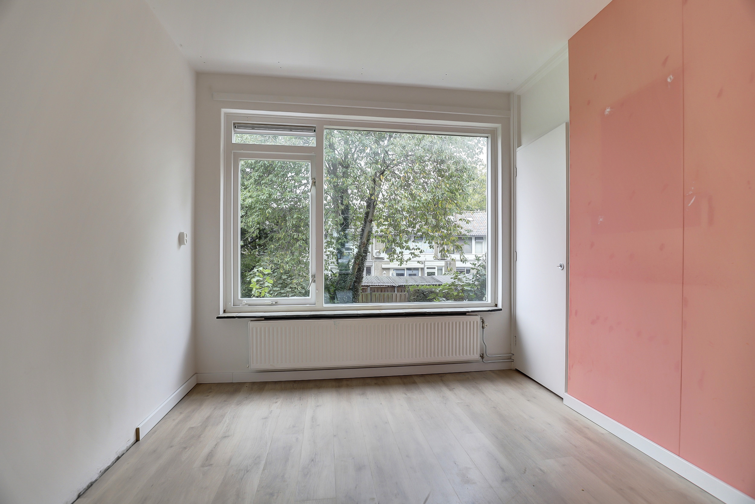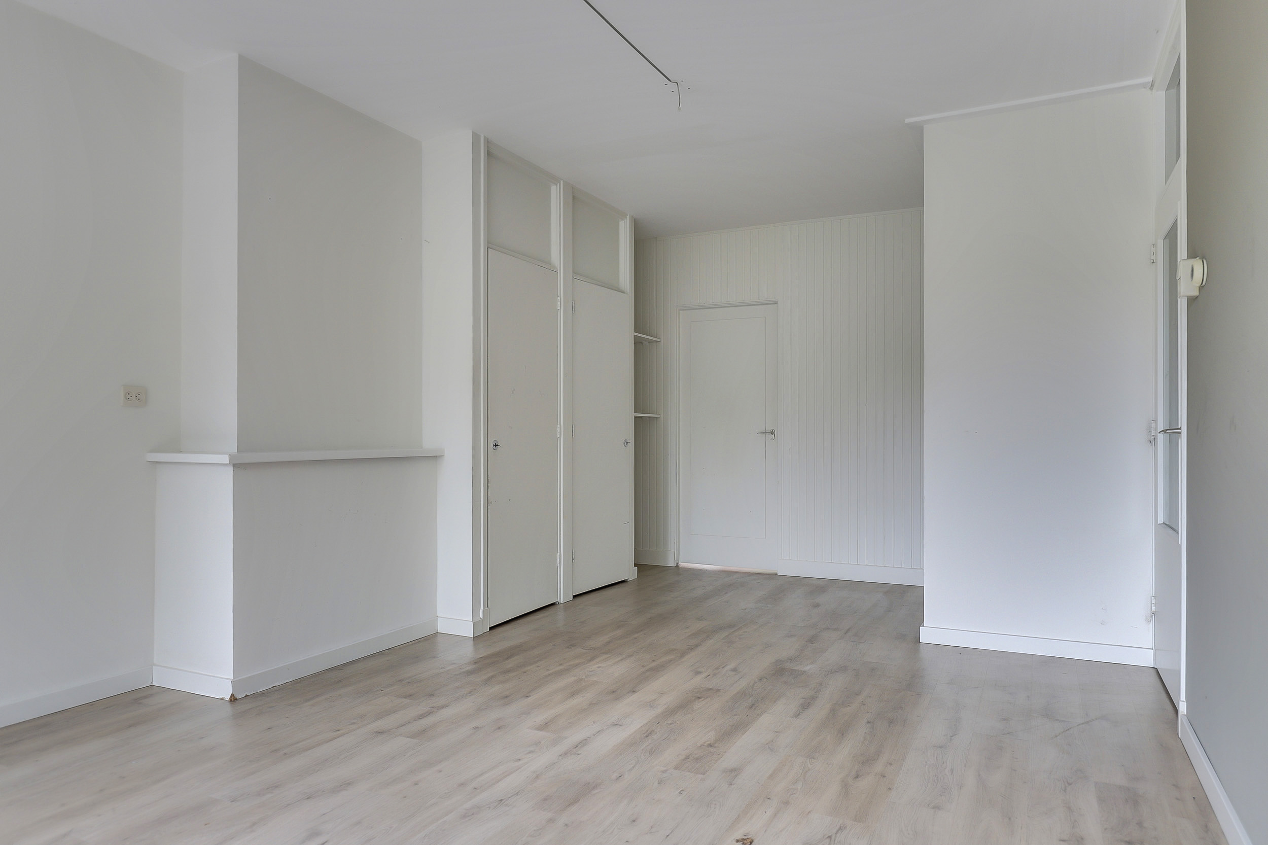 De woonkamer is ruim en licht, dankzij de grote raampartijen aan de voorzijde. De lichte vloer en neutrale wandafwerking zorgen voor een frisse uitstraling. Vanuit de woonkamer kijk je fraai uit over de straatzijde.