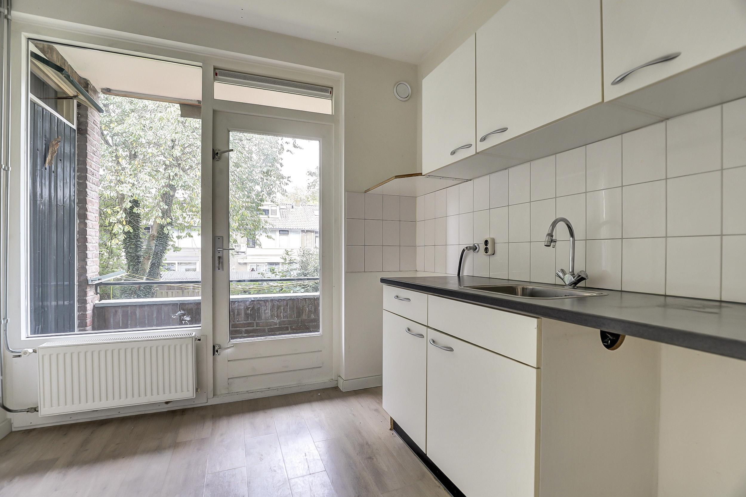 De keuken bevindt zich aan de achterzijde van de woning en is eenvoudig maar netjes uitgevoerd. De rechte opstelling biedt voldoende werk- en kastruimte, en via de deur heb je direct toegang tot het balkon.
