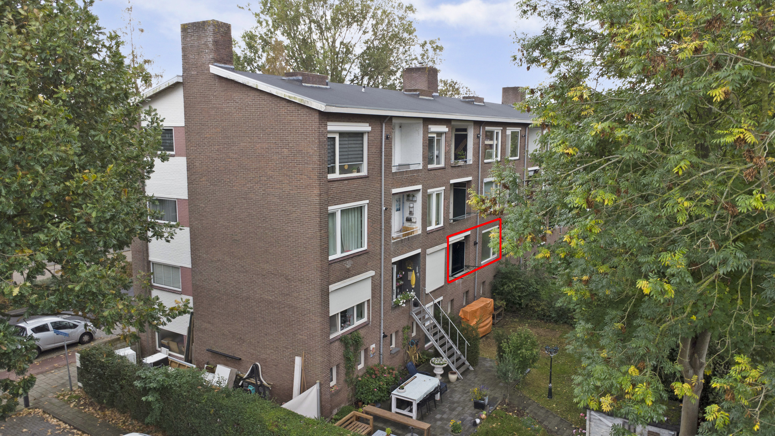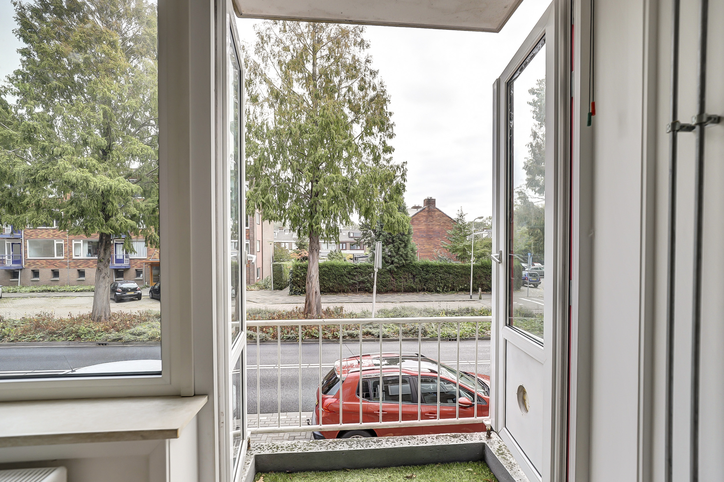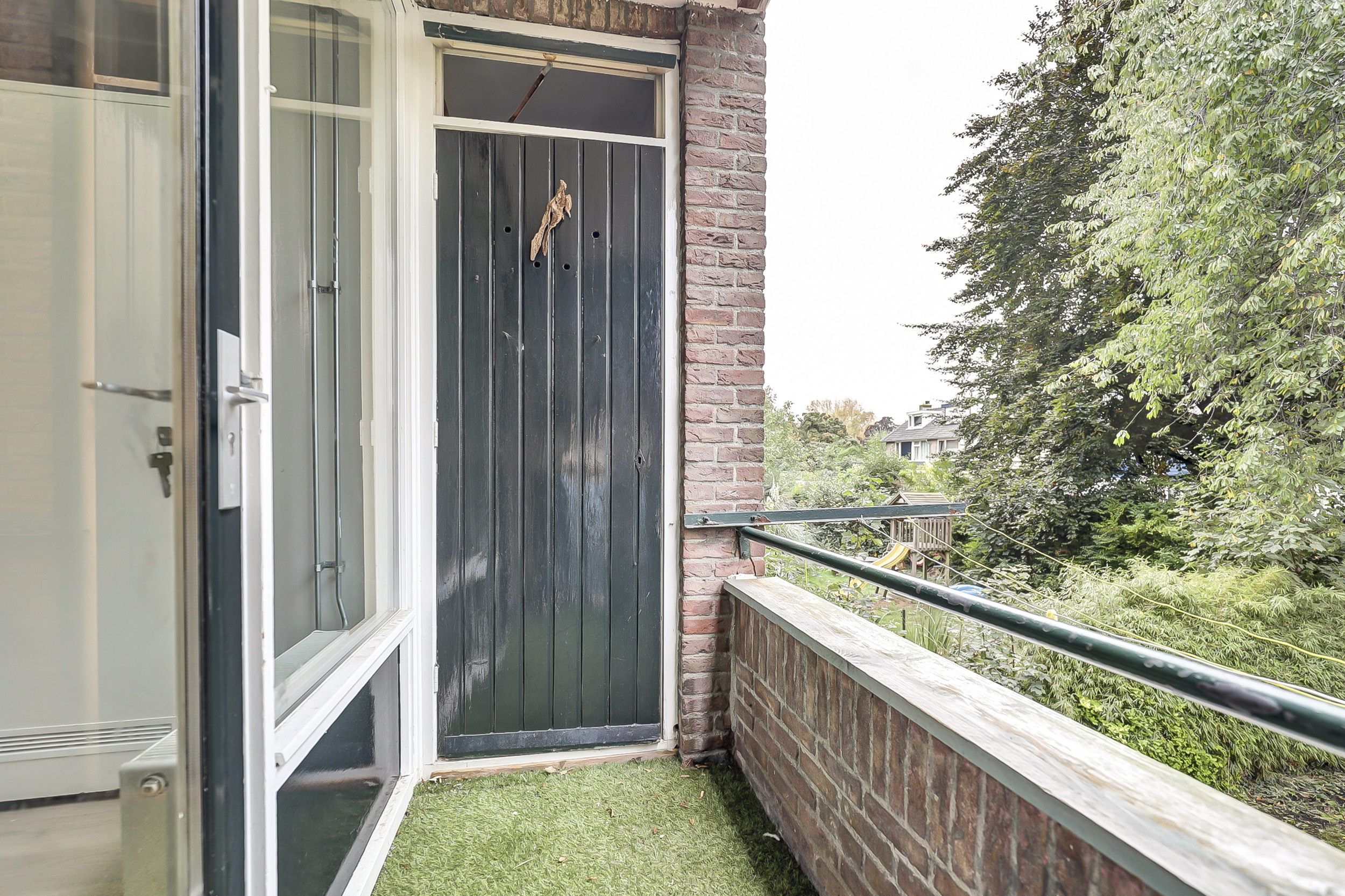 Aan de achterzijde bevindt zich het balkon, gelegen op het westen, waar je heerlijk van de middag- en avondzon kunt genieten. Het balkon biedt voldoende ruimte voor een gezellig zitje met uitzicht op het groen.