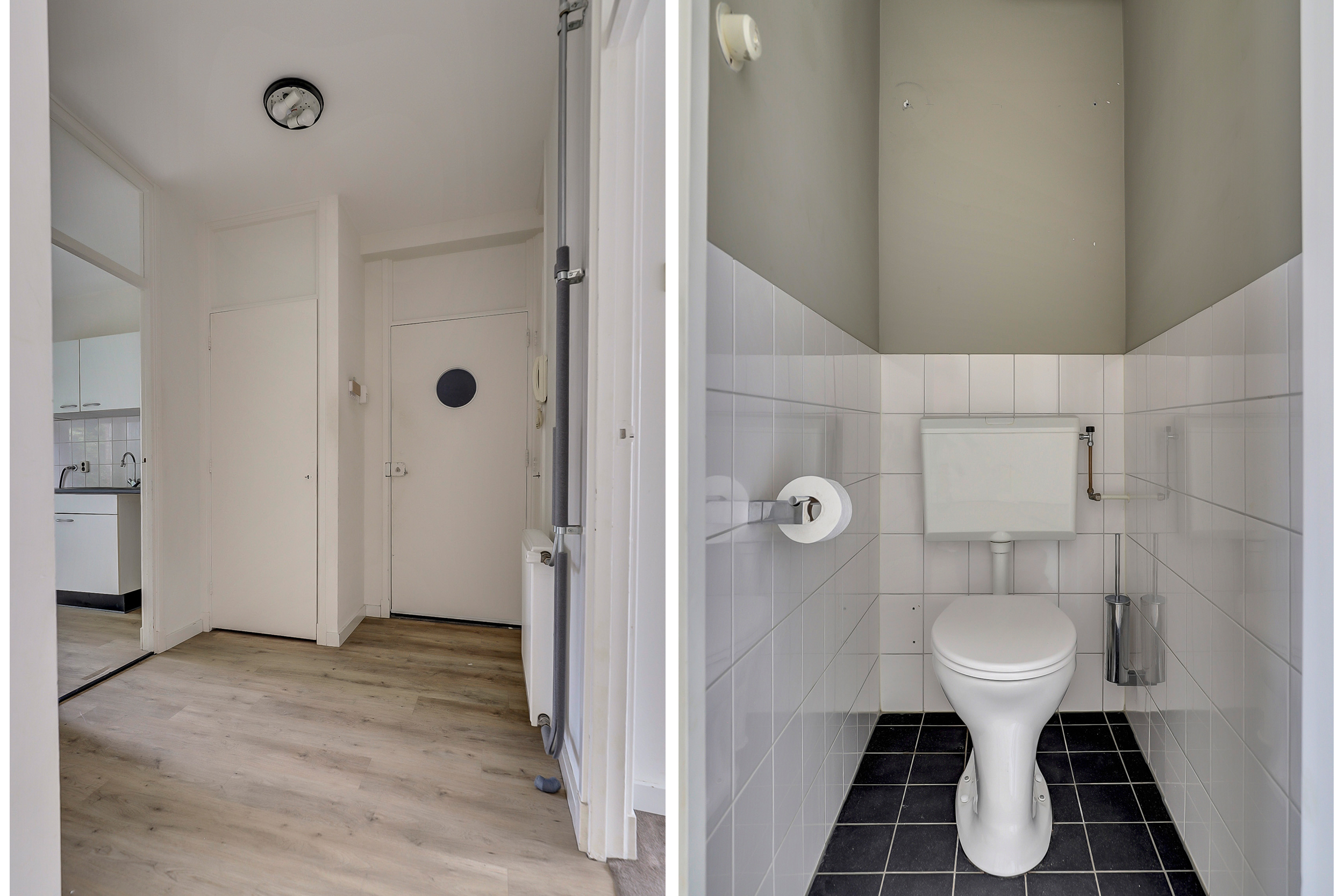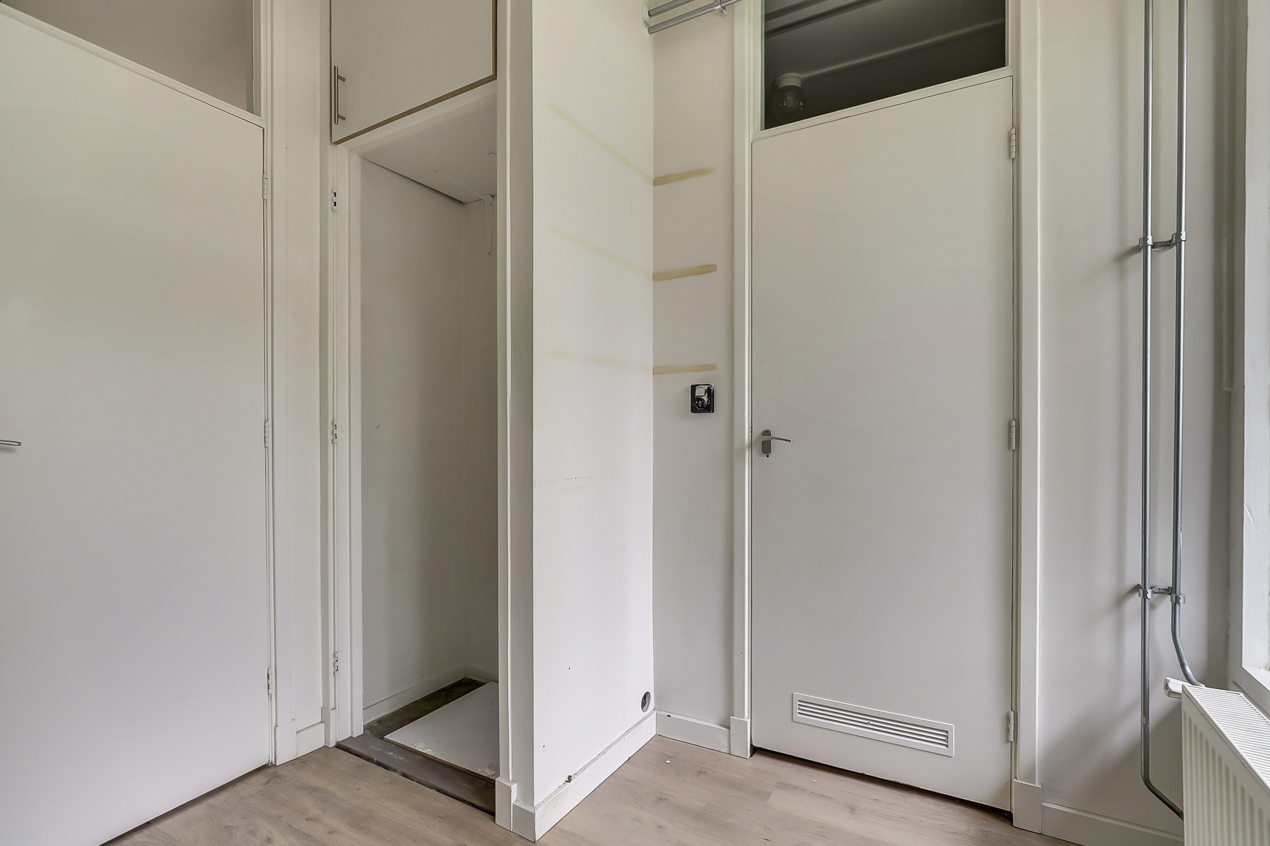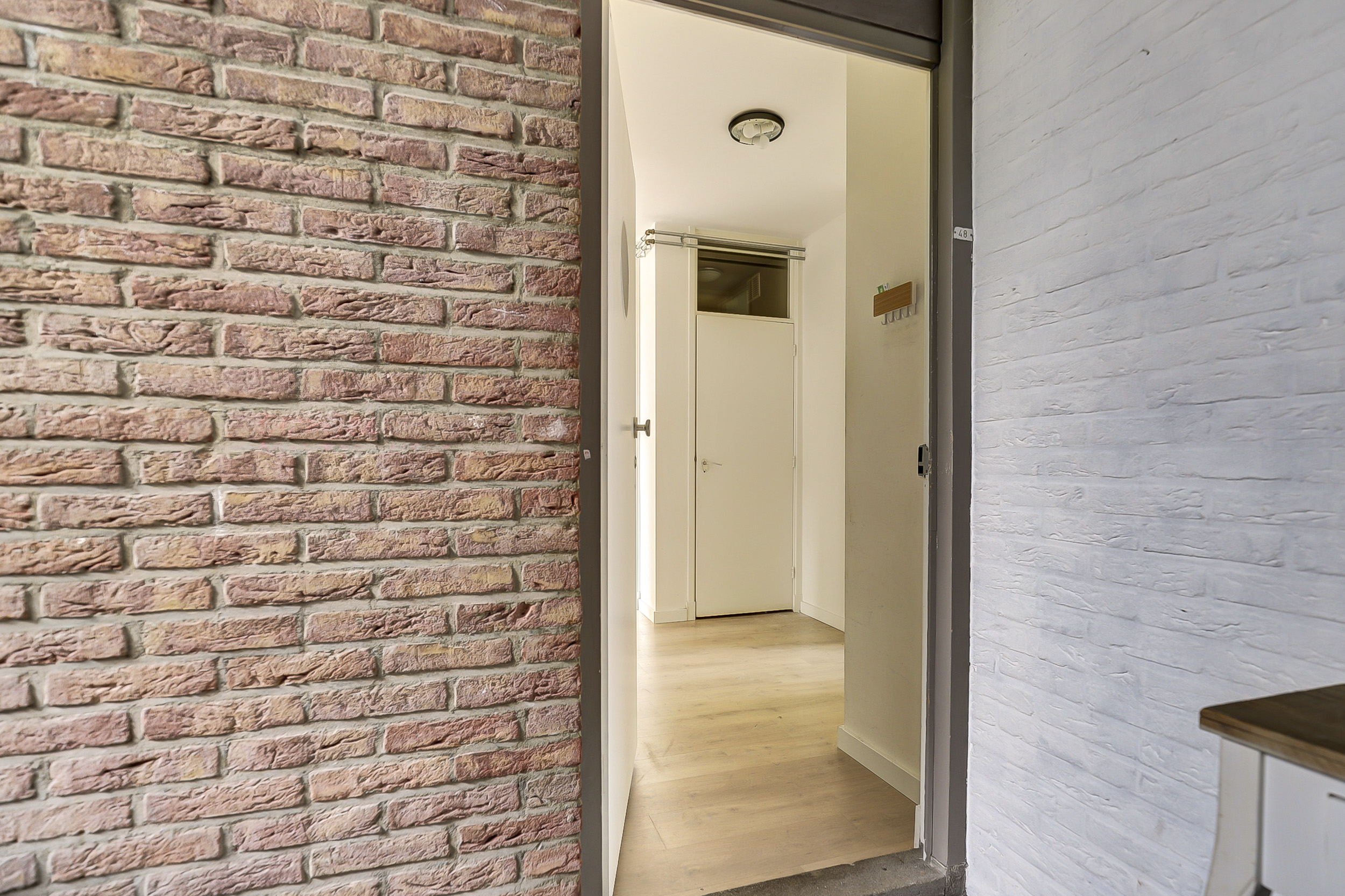 Bij binnenkomst via de afgesloten entree met intercom bereik je het appartement op de eerste verdieping. De hal biedt toegang tot de verschillende vertrekken.
