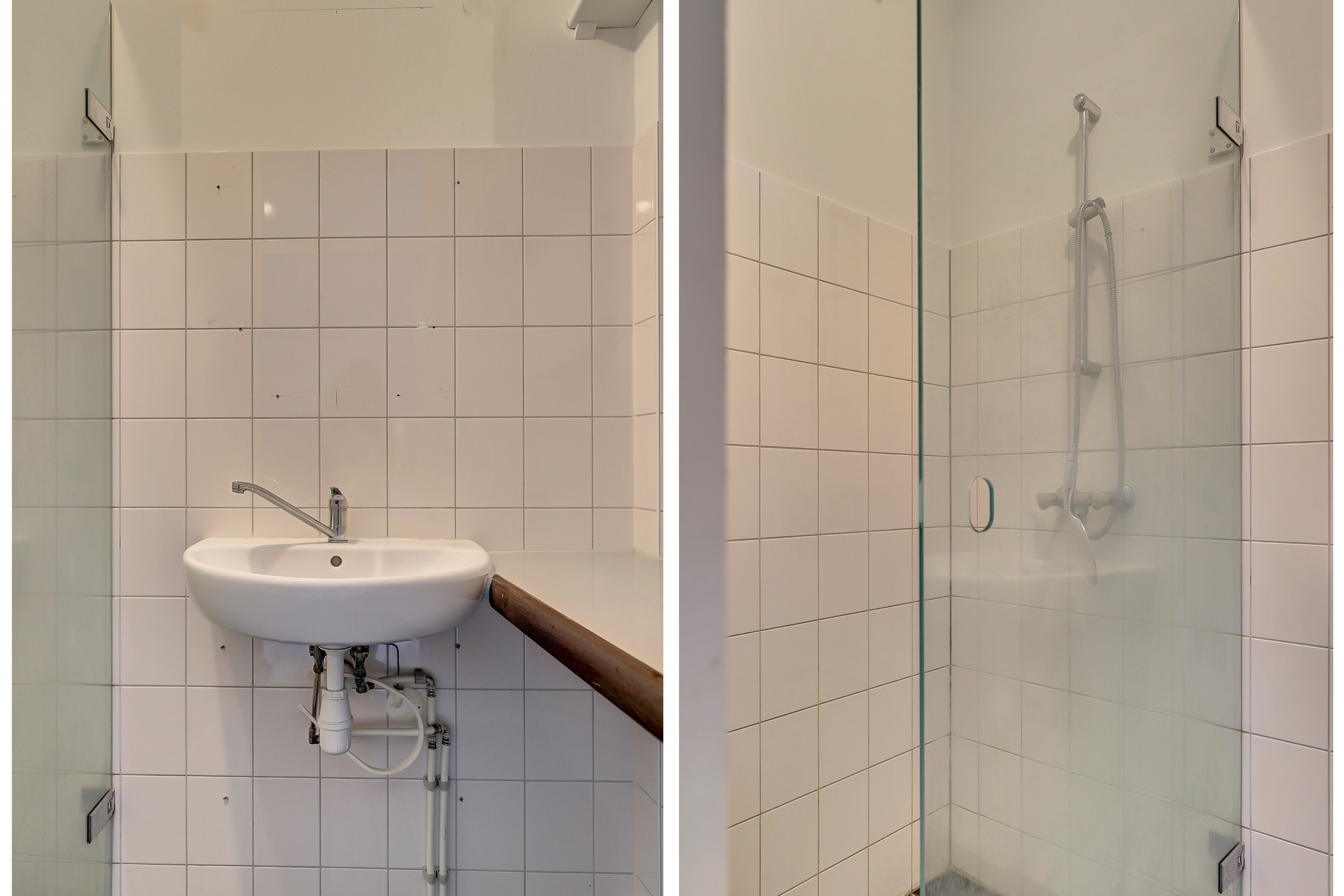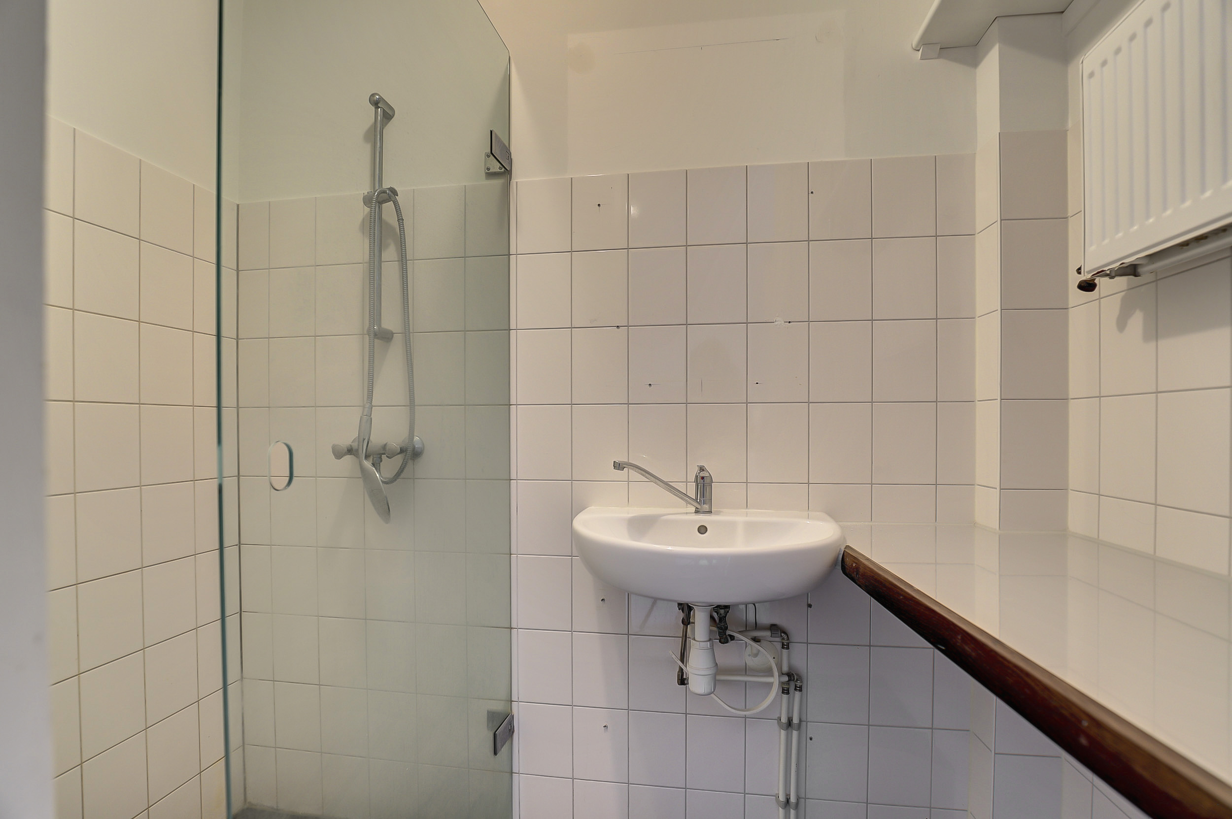 De badkamer is functioneel ingericht met een inloopdouche en wastafel, en er is een separaat toilet in het appartement aanwezig.