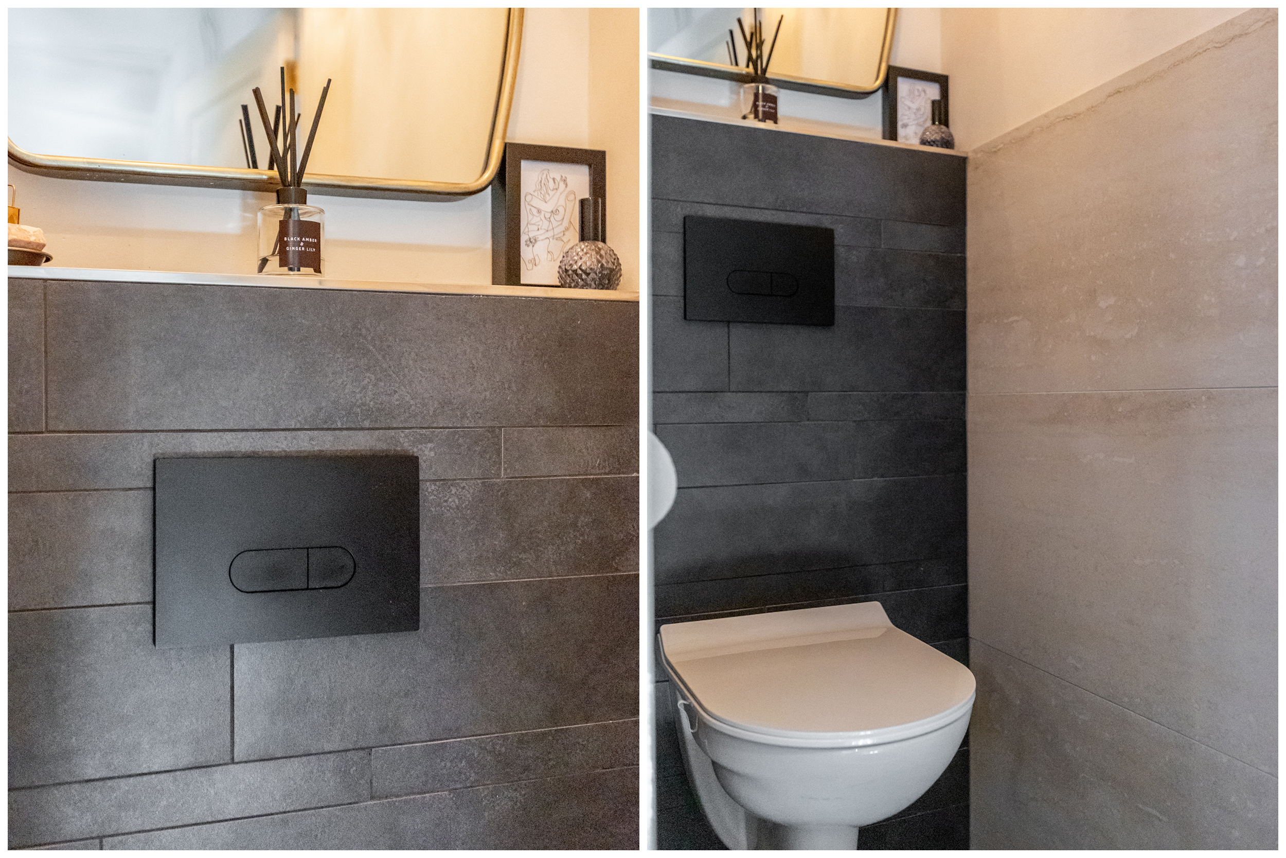 Ruime overloop met toegang tot de modern afgewerkte toiletruimte, voorzien van hangend closet en lichte betegeling. De royale, sfeervolle L-vormige woonkamer is afgewerkt met een laminaatvloer