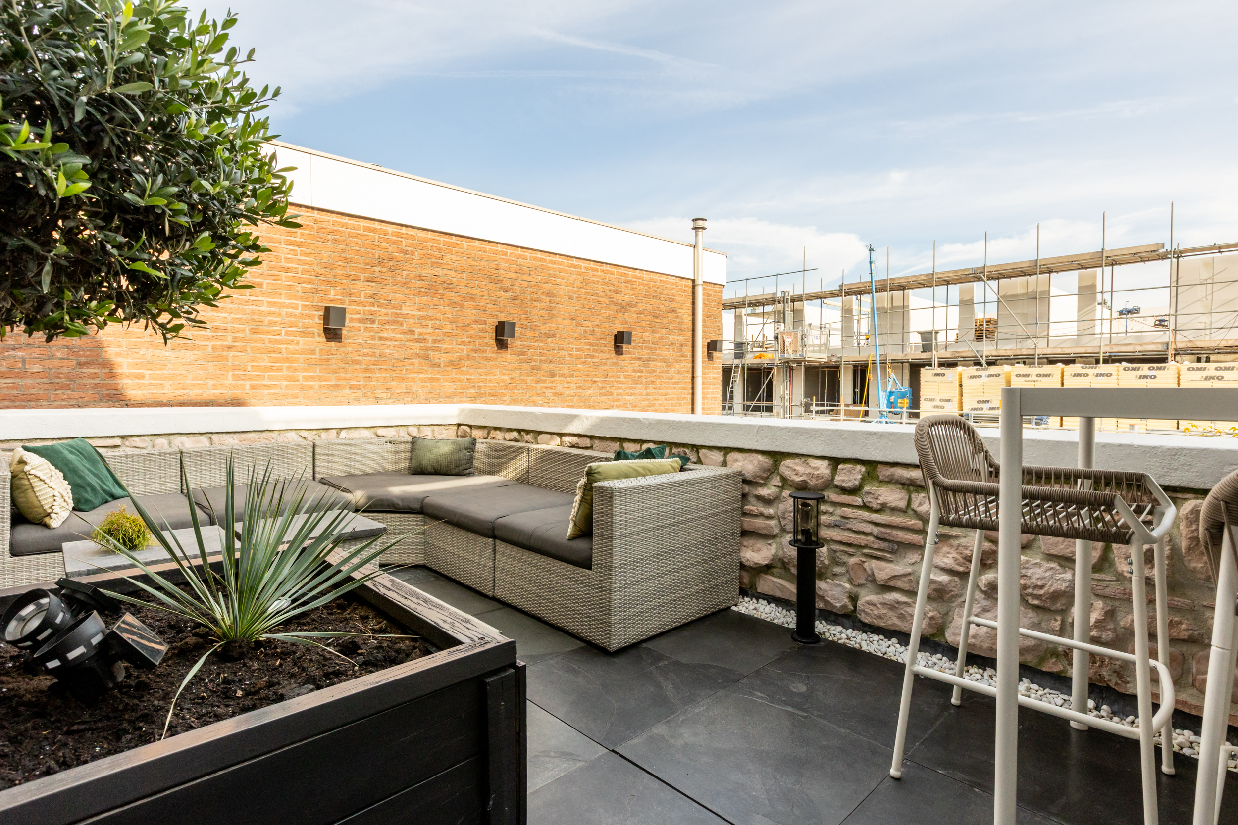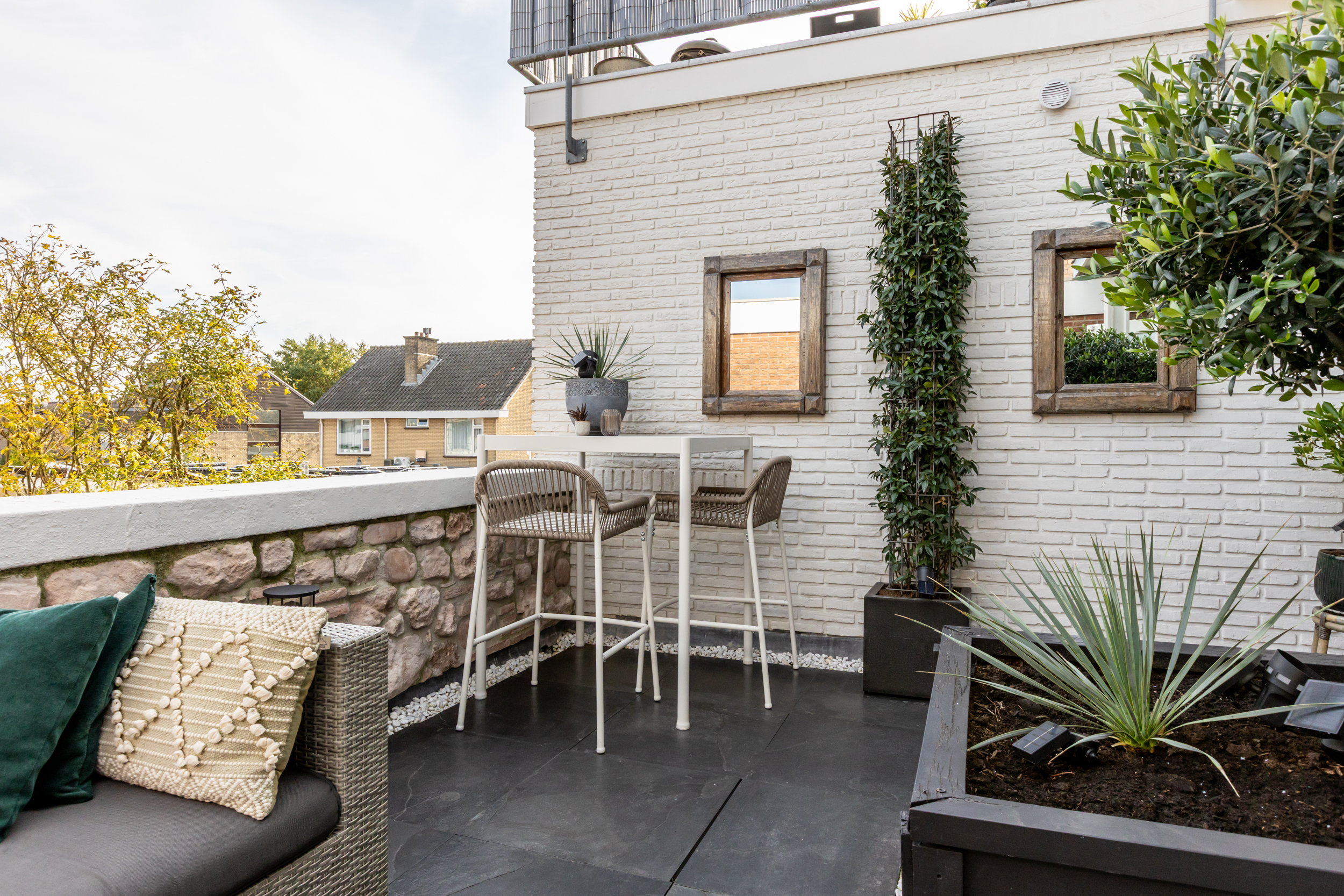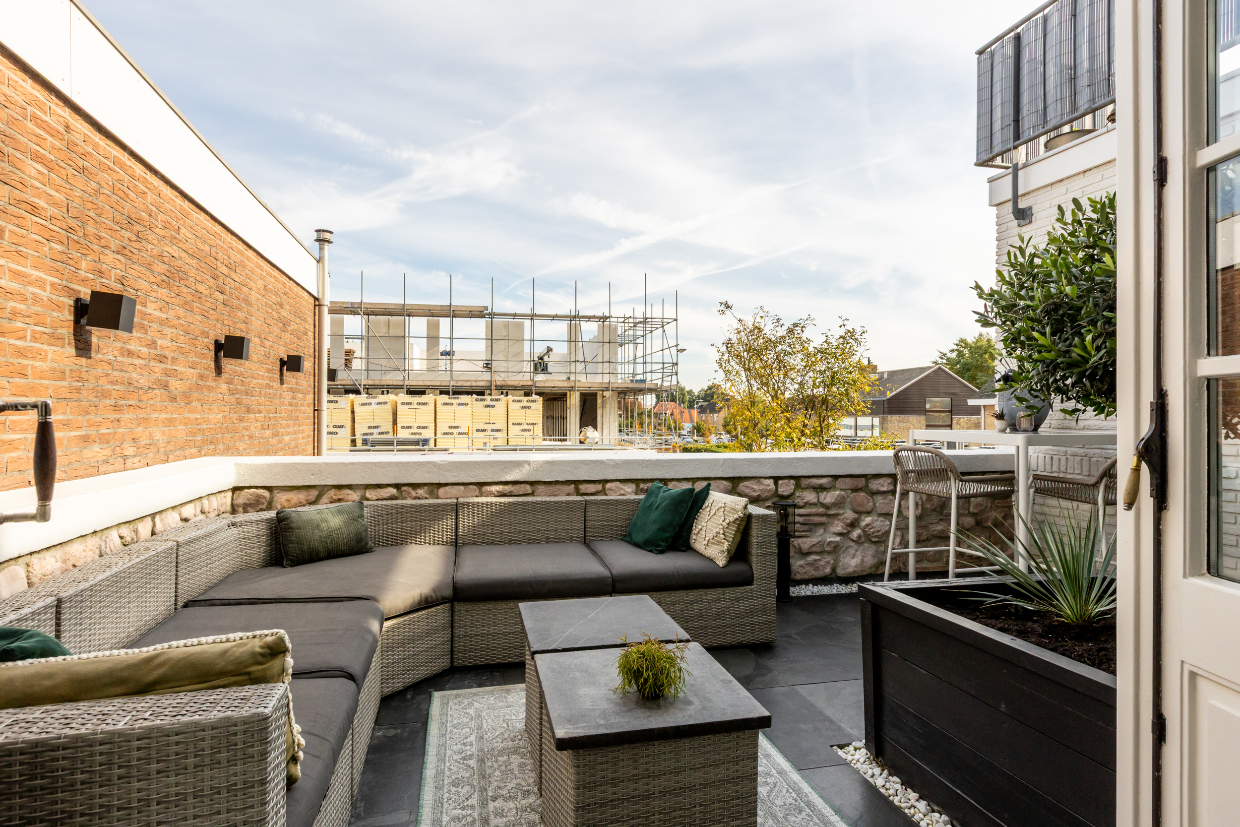 Ruime overloop met toegang tot de modern afgewerkte toiletruimte, voorzien van hangend closet en lichte betegeling. De royale, sfeervolle L-vormige woonkamer is afgewerkt met een laminaatvloer en wordt gekenmerkt door een klassiek marmeren schouw met gashaard; een echte eyecatcher. Dubbele openslaande deuren leiden naar het riante, zonnige dakterras op het oosten, compleet met sfeerverlichting en fraai tegelwerk. Dit een is een heerlijke plek om te ontspannen of te dineren in de buitenlucht. De open keuken in L-opstelling is modern vormgegeven en van alle gemakken voorzien, waaronder een gaskookplaat, vaatwasser, design afzuigkap en een vrijstaande koel-/vriescombinatie.