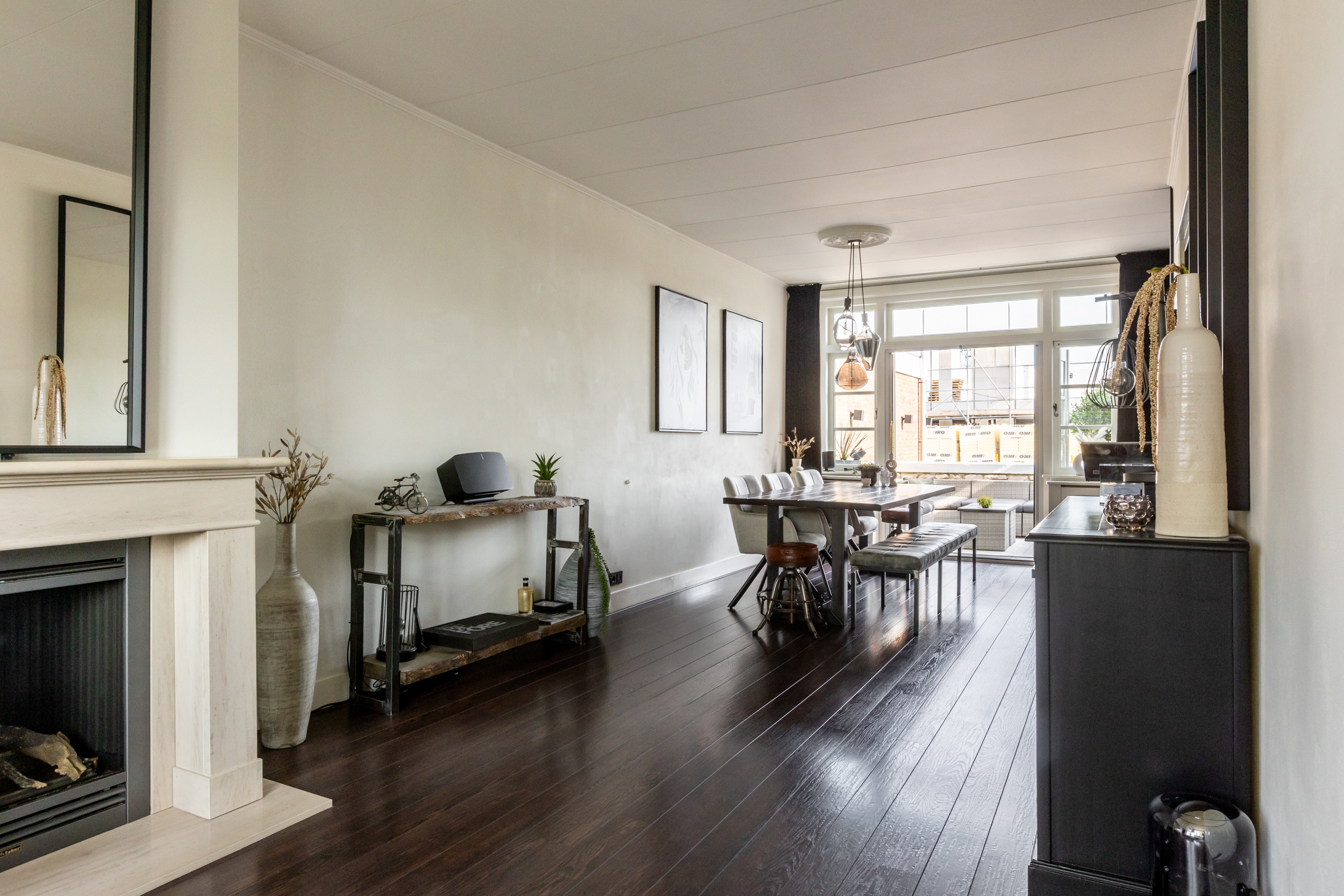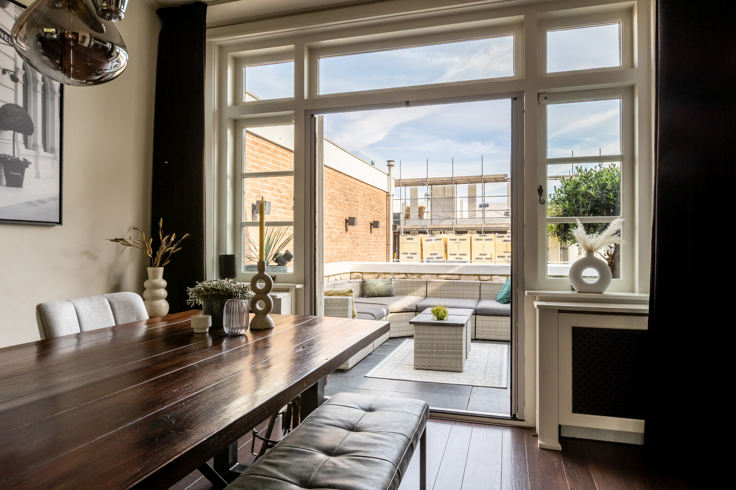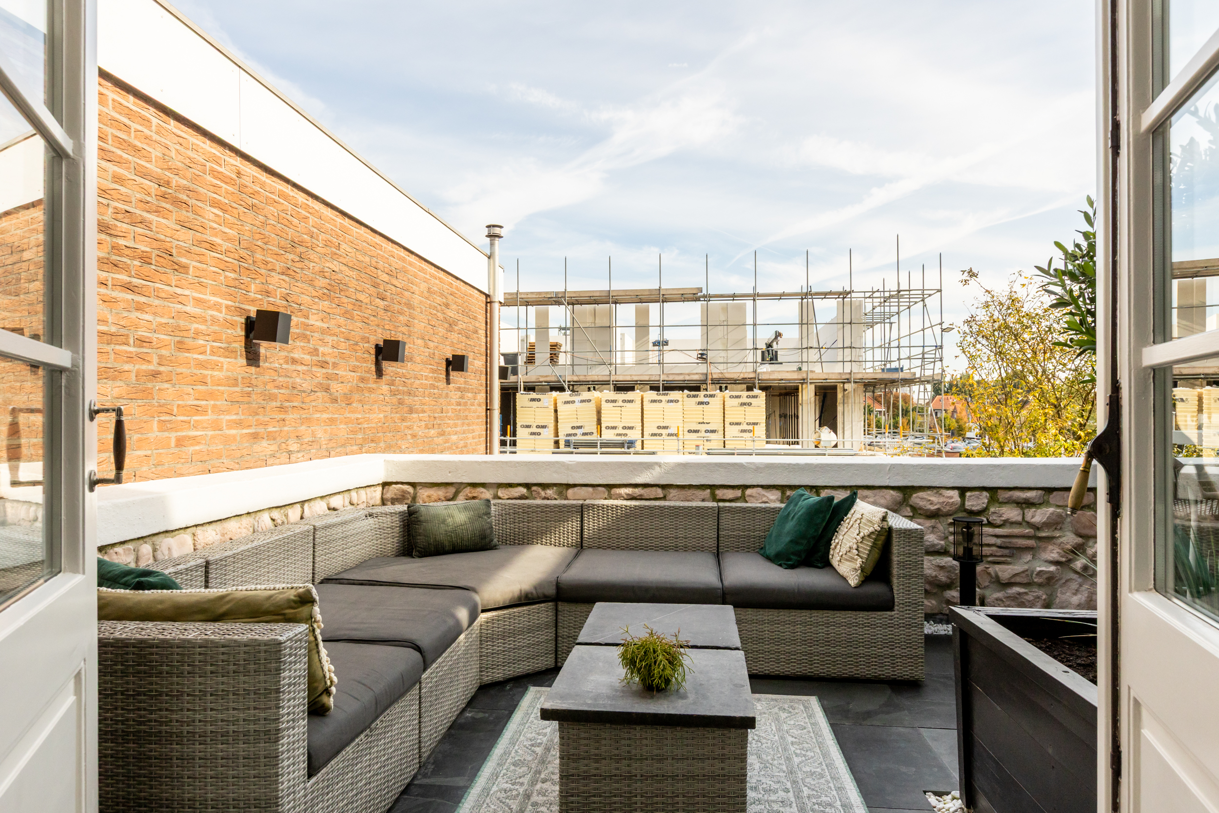 Ruime overloop met toegang tot de modern afgewerkte toiletruimte, voorzien van hangend closet en lichte betegeling. De royale, sfeervolle L-vormige woonkamer is afgewerkt met een laminaatvloer en wordt gekenmerkt door een klassiek marmeren schouw met gashaard; een echte eyecatcher. Dubbele openslaande deuren leiden naar het riante, zonnige dakterras op het oosten, compleet met sfeerverlichting en fraai tegelwerk. Dit een is een heerlijke plek om te ontspannen of te dineren in de buitenlucht. De open keuken in L-opstelling is modern vormgegeven en van alle gemakken voorzien, waaronder een gaskookplaat, vaatwasser, design afzuigkap en een vrijstaande koel-/vriescombinatie.