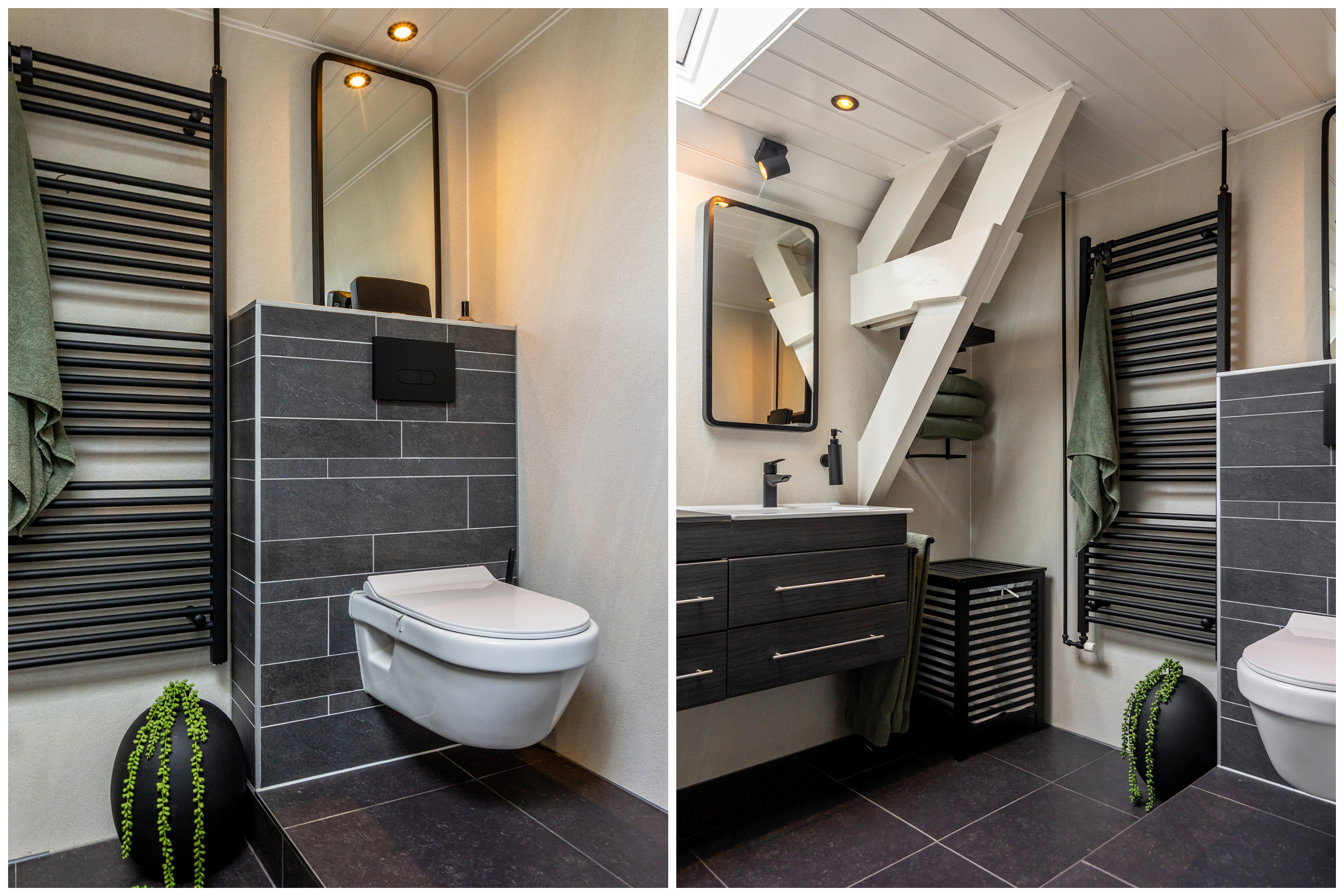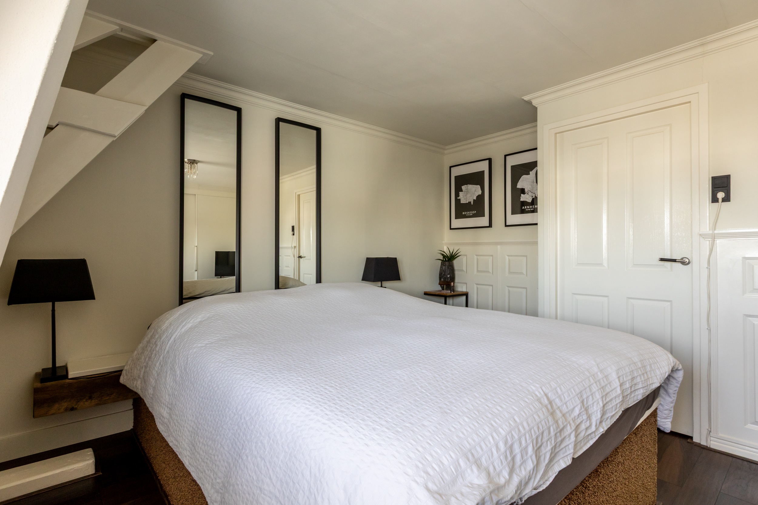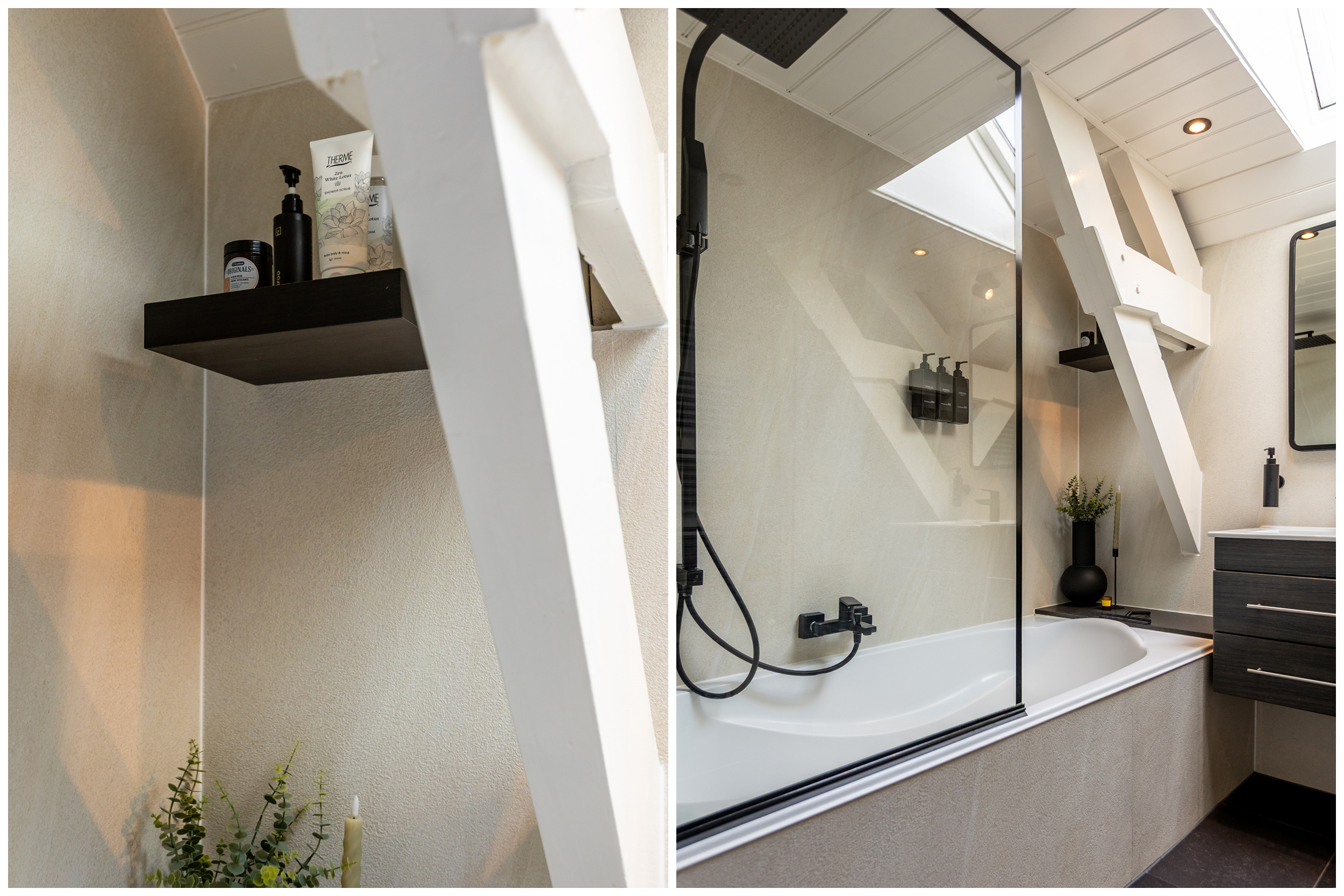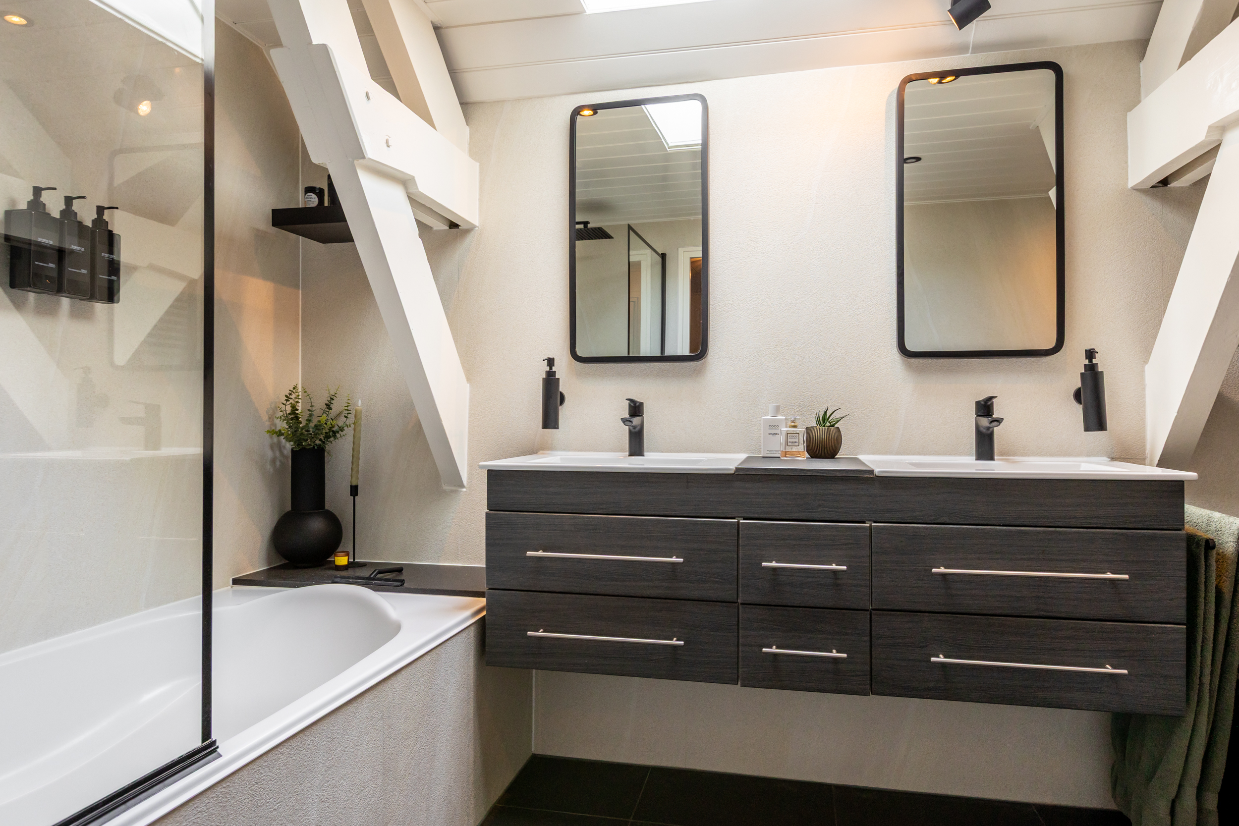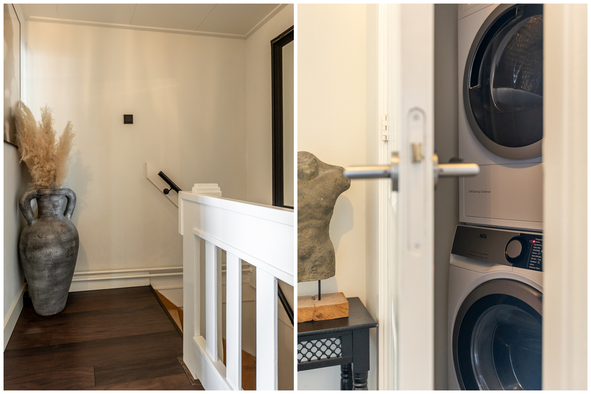 Overloop met toegang tot twee ruime slaapkamers, beide voorzien van dakkapel, dubbele beglazing, laminaatvloer en praktische vaste kastruimte. De recent gemoderniseerde badkamer is uitgerust met een ligbad, hangend toilet, stijlvol wastafelmeubel, designradiator en een velux dakraam voor natuurlijk daglicht. In de aparte technische ruimte vind je aansluitingen voor wasmachine en droger, alsmede de HR-combiketel.