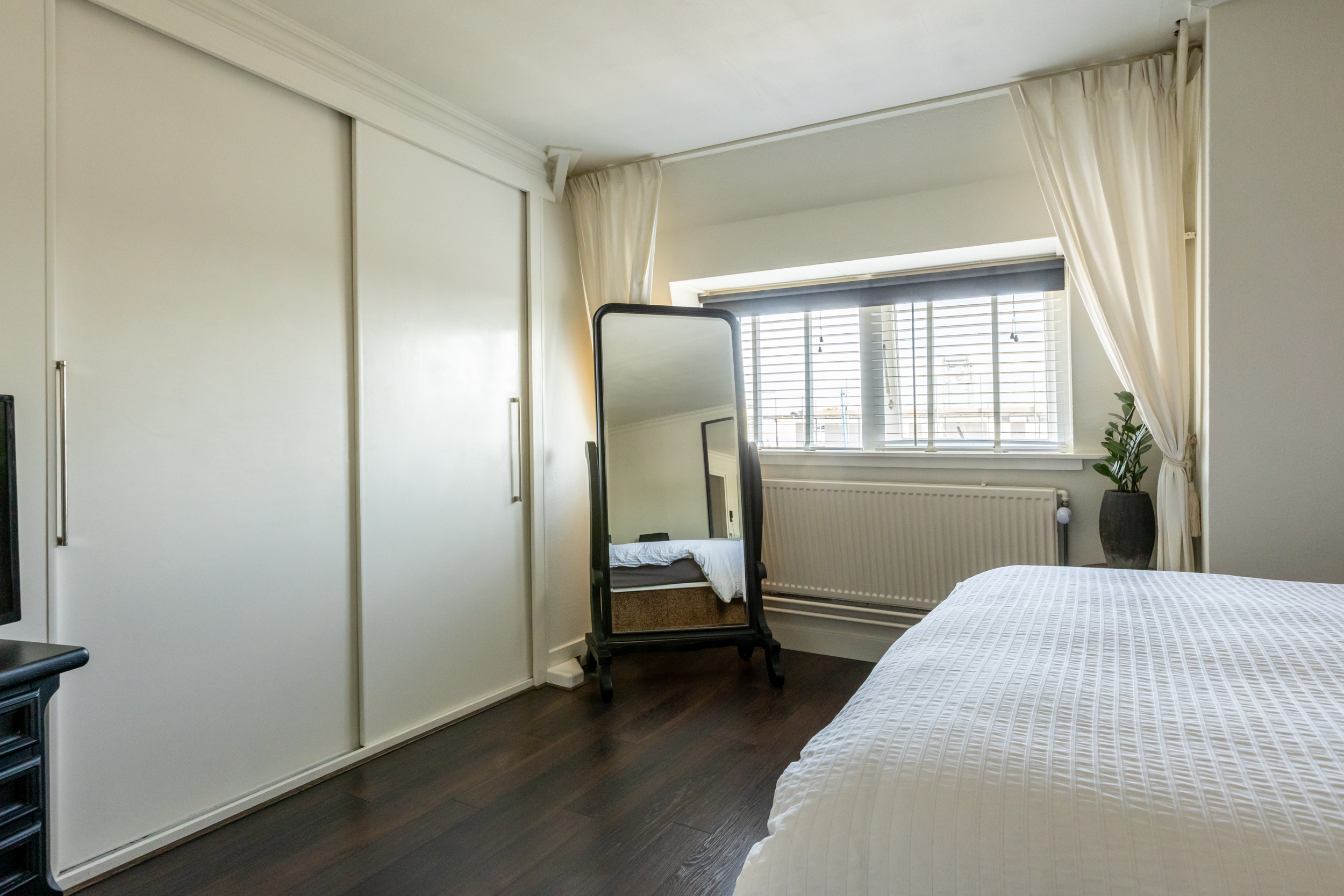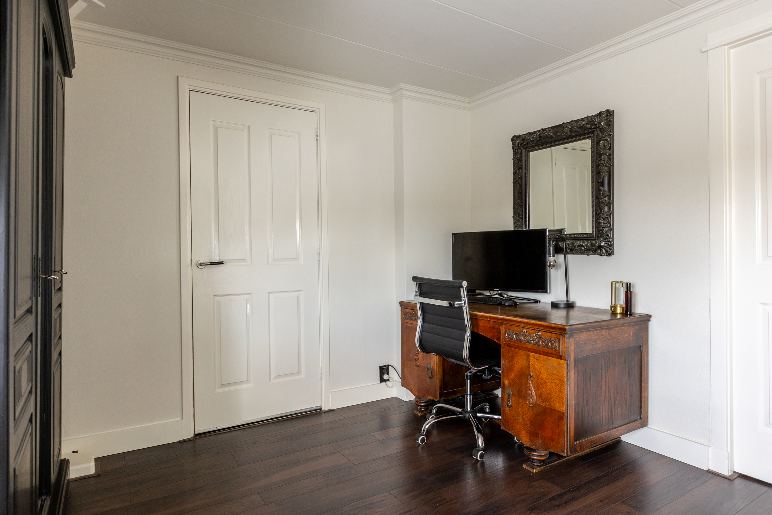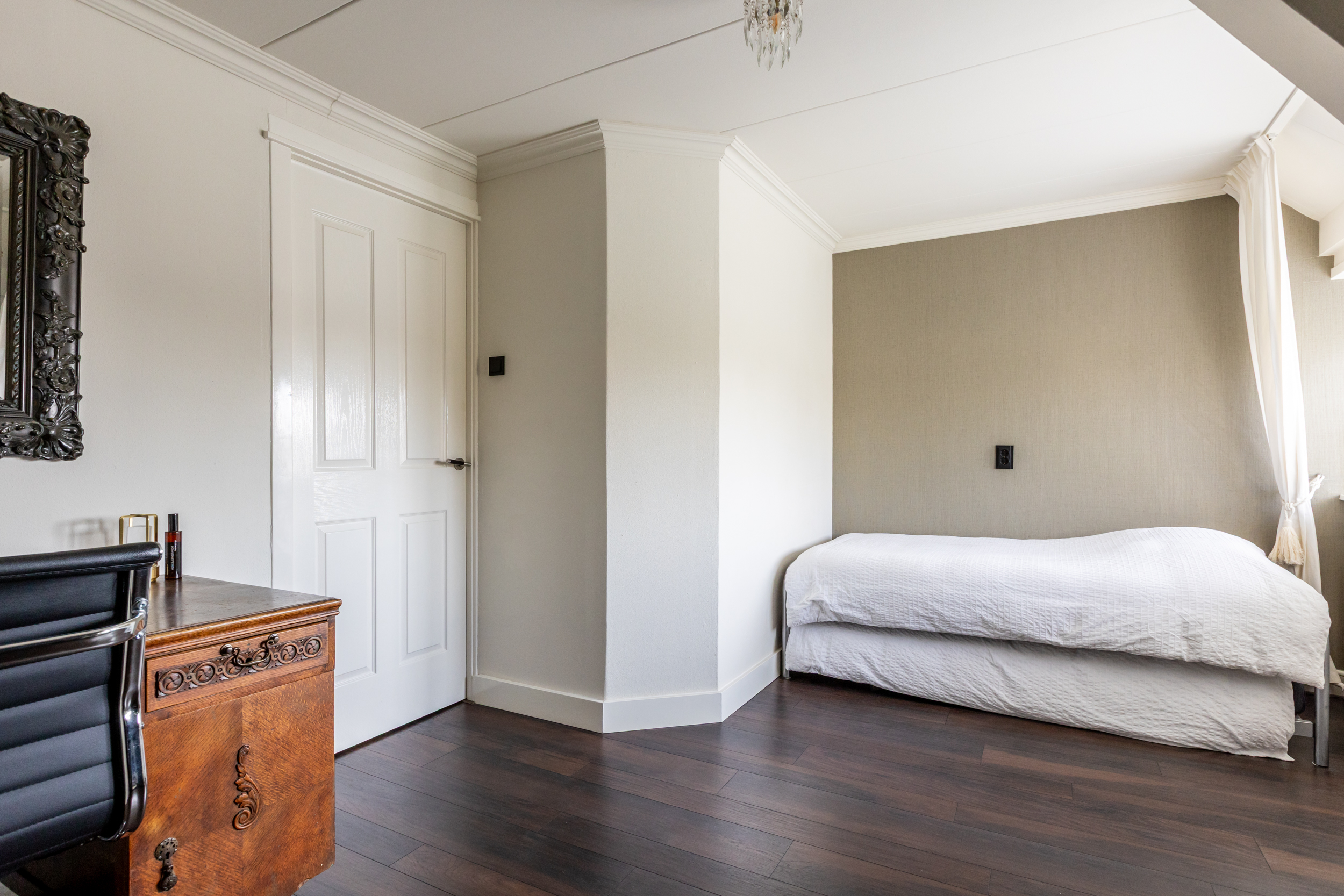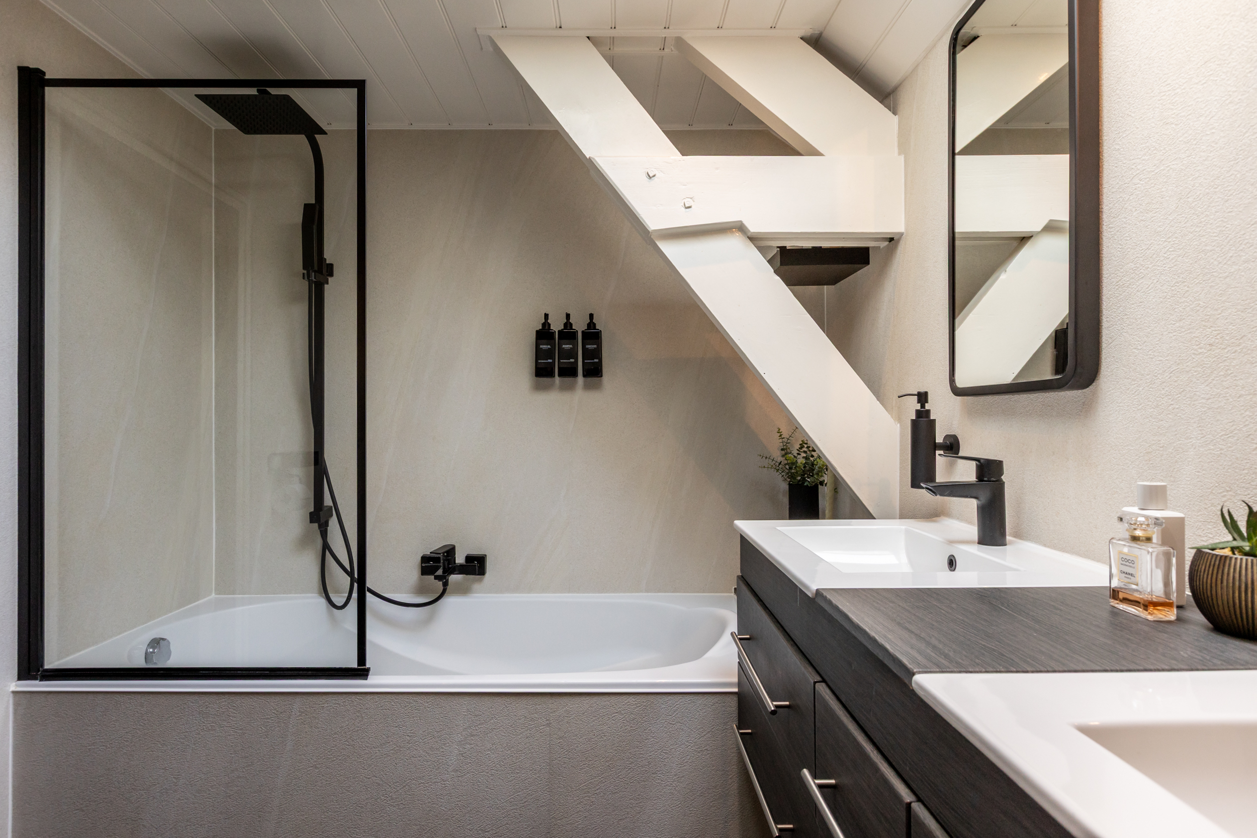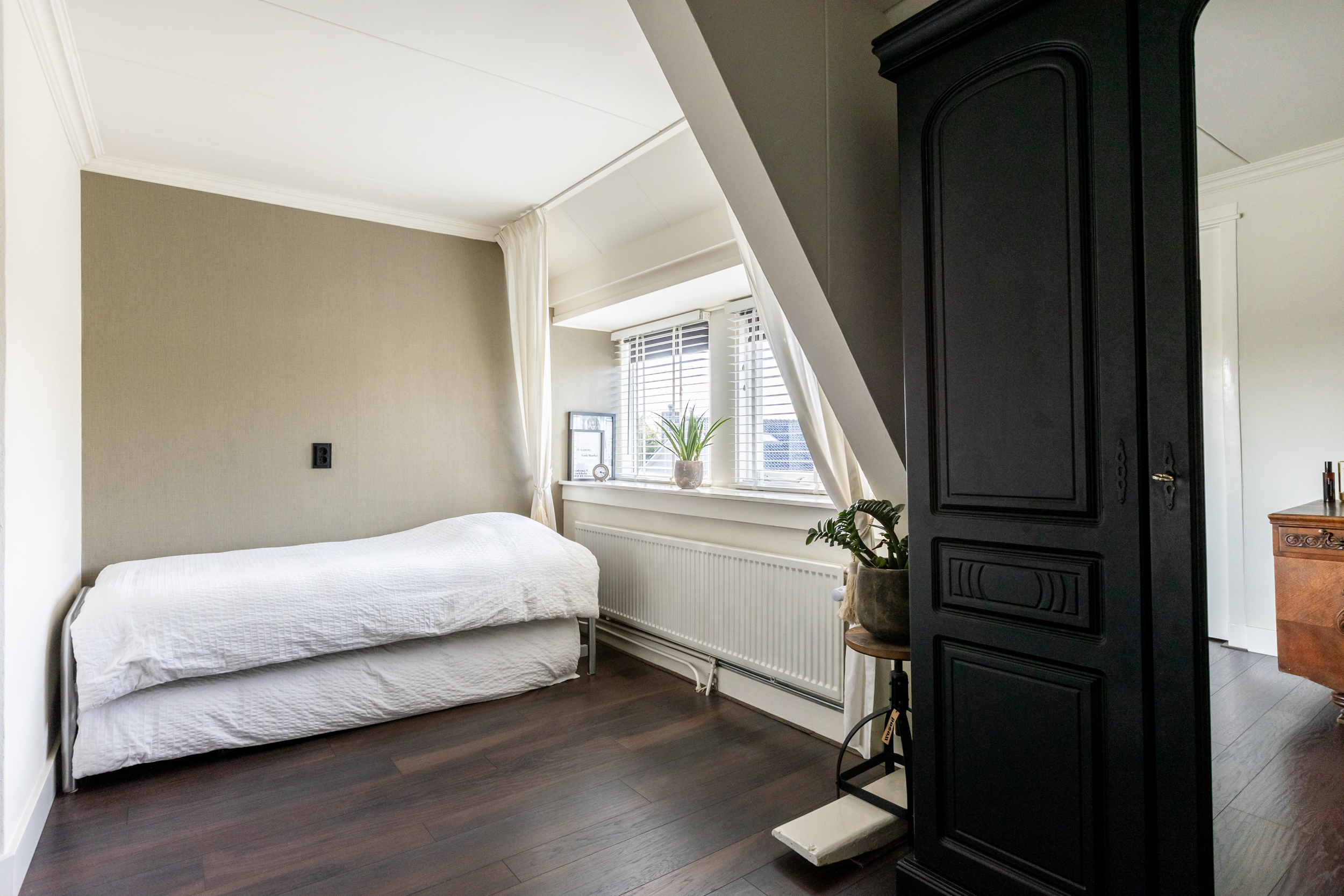 Overloop met toegang tot twee ruime slaapkamers, beide voorzien van dakkapel, dubbele beglazing, laminaatvloer en praktische vaste kastruimte. De recent gemoderniseerde badkamer is uitgerust met een ligbad, hangend toilet, stijlvol wastafelmeubel, designradiator en een velux dakraam voor natuurlijk daglicht. In de aparte technische ruimte vind je aansluitingen voor wasmachine en droger, alsmede de HR-combiketel.