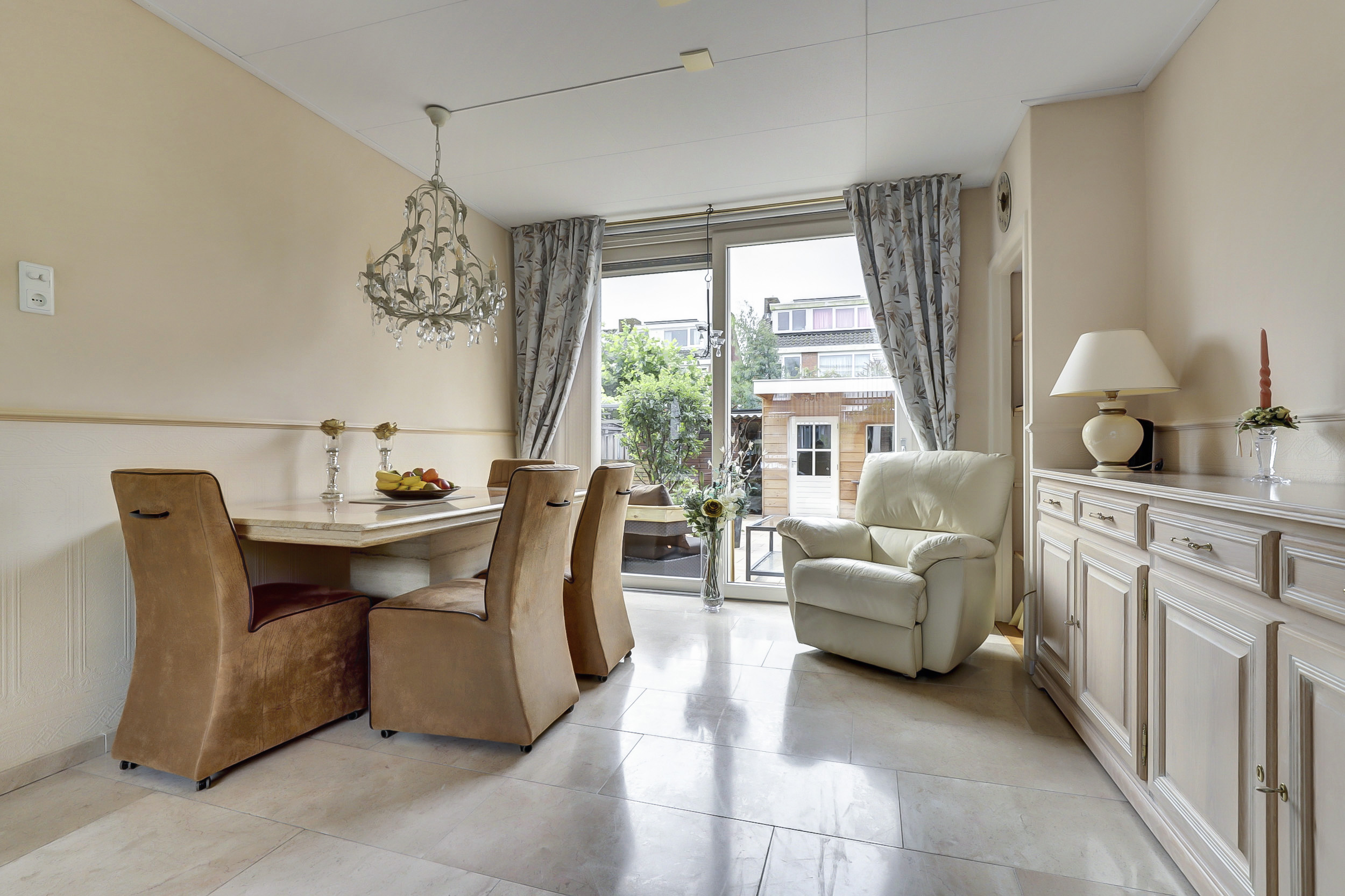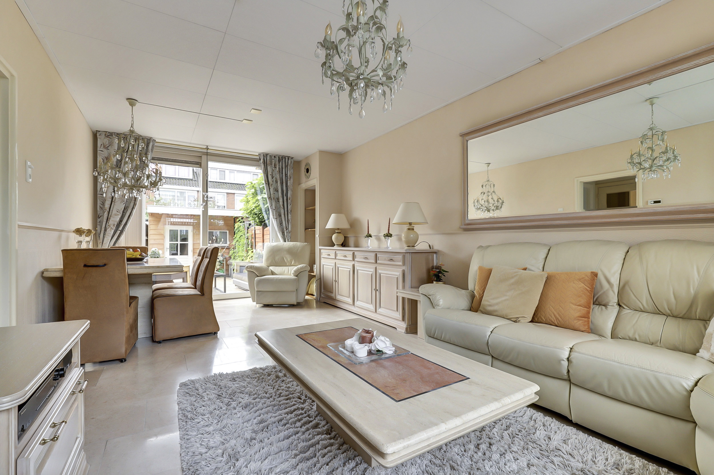 De woonkamer is een heerlijke doorzonruimte met veel daglicht door de grote ramen aan voor- en achterzijde. De klassieke inrichting met sierlijsten, een licht natuurstenen vloer en neutrale wandafwerking geven de ruimte een warme uitstraling. Vanuit de zithoek heeft u uitzicht op de groene voortuin, en via het eetgedeelte loopt u zo de achtertuin in via de schuifpui.