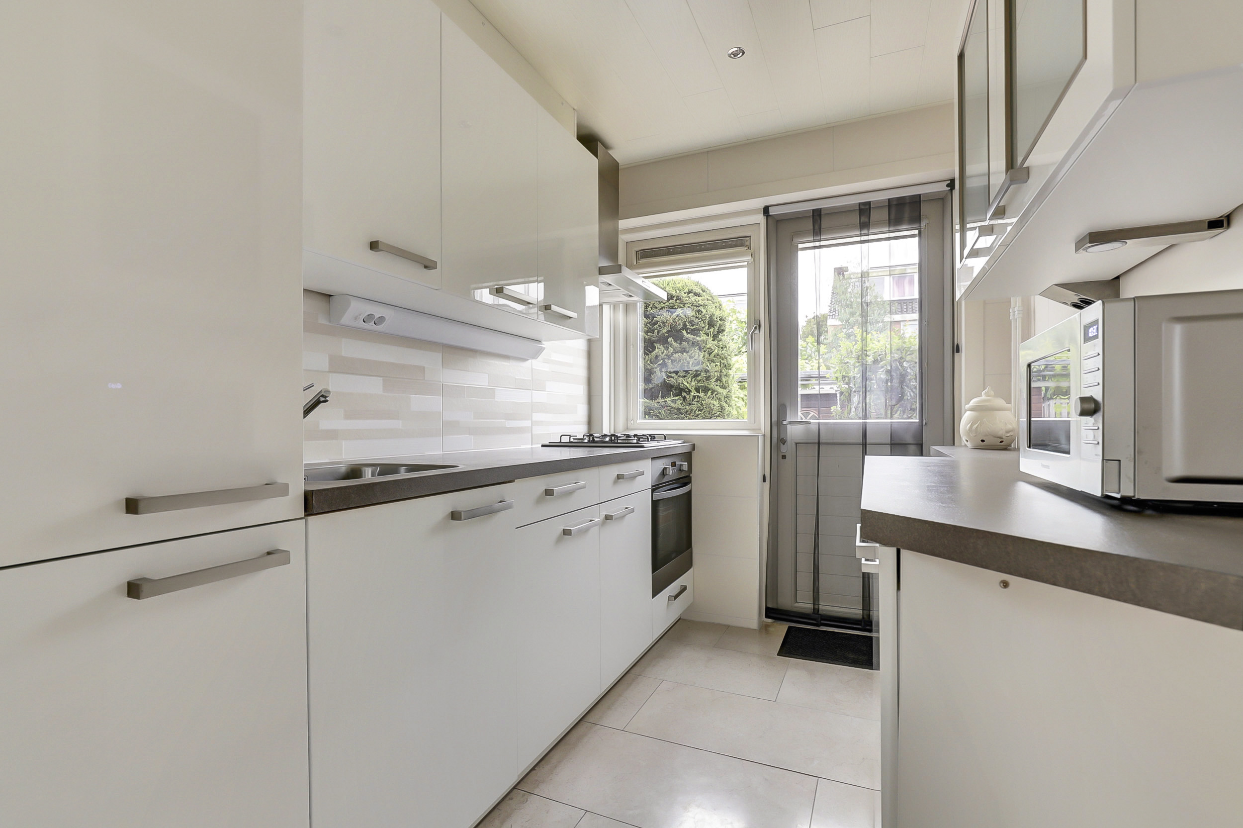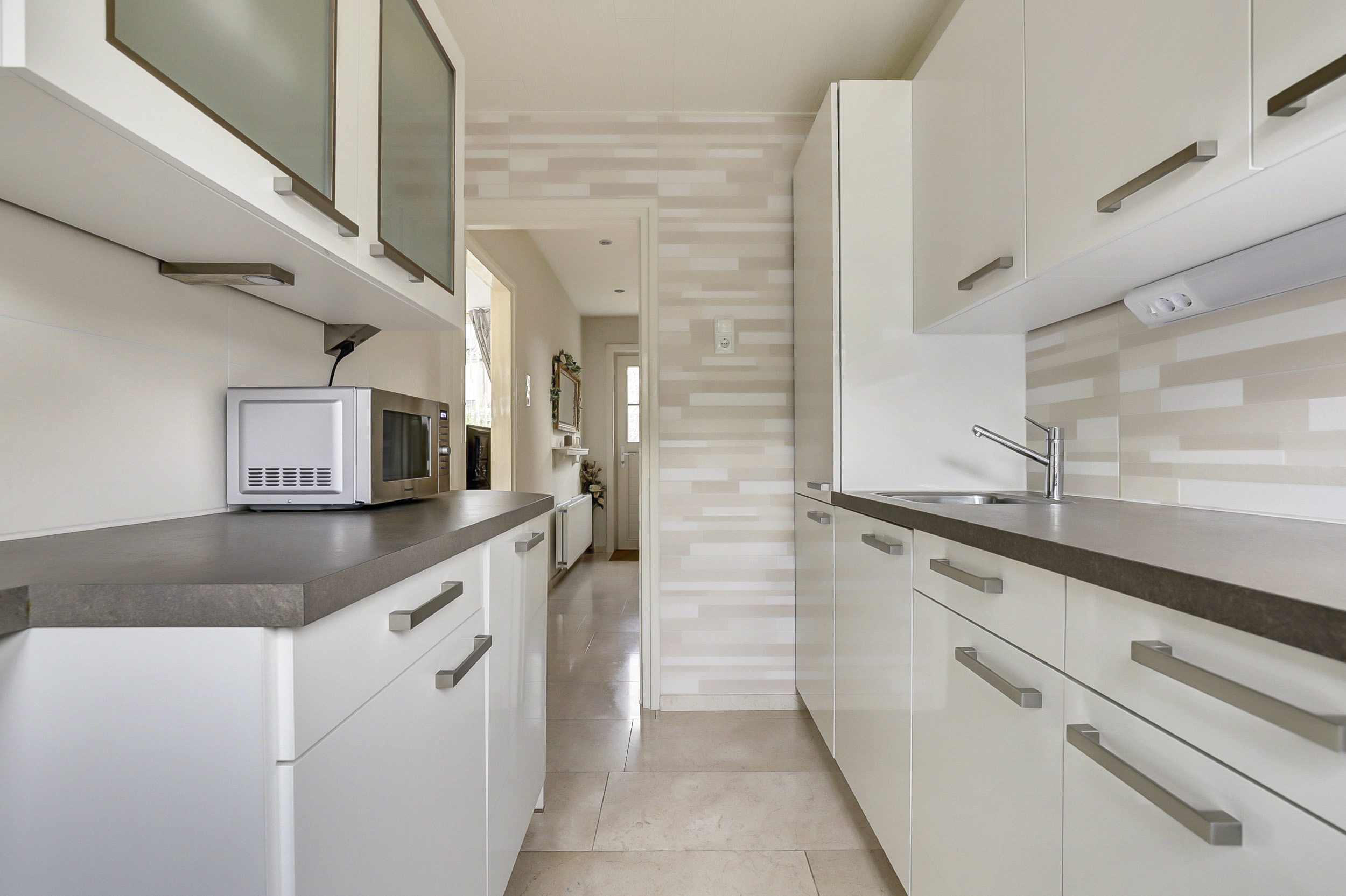 De keuken is gescheiden van de woonkamer en heeft een moderne, strakke afwerking in witte hoogglans met rvs-accenten. U vindt hier diverse inbouwapparatuur zoals een kookplaat, oven, koelkast, vriezer, vaatwasser en magnetron. De deur in de keuken biedt directe toegang tot de tuin, ideaal bij mooi weer of het uitladen van boodschappen. De volledige begane grond is voorzien van vloerverwarming.