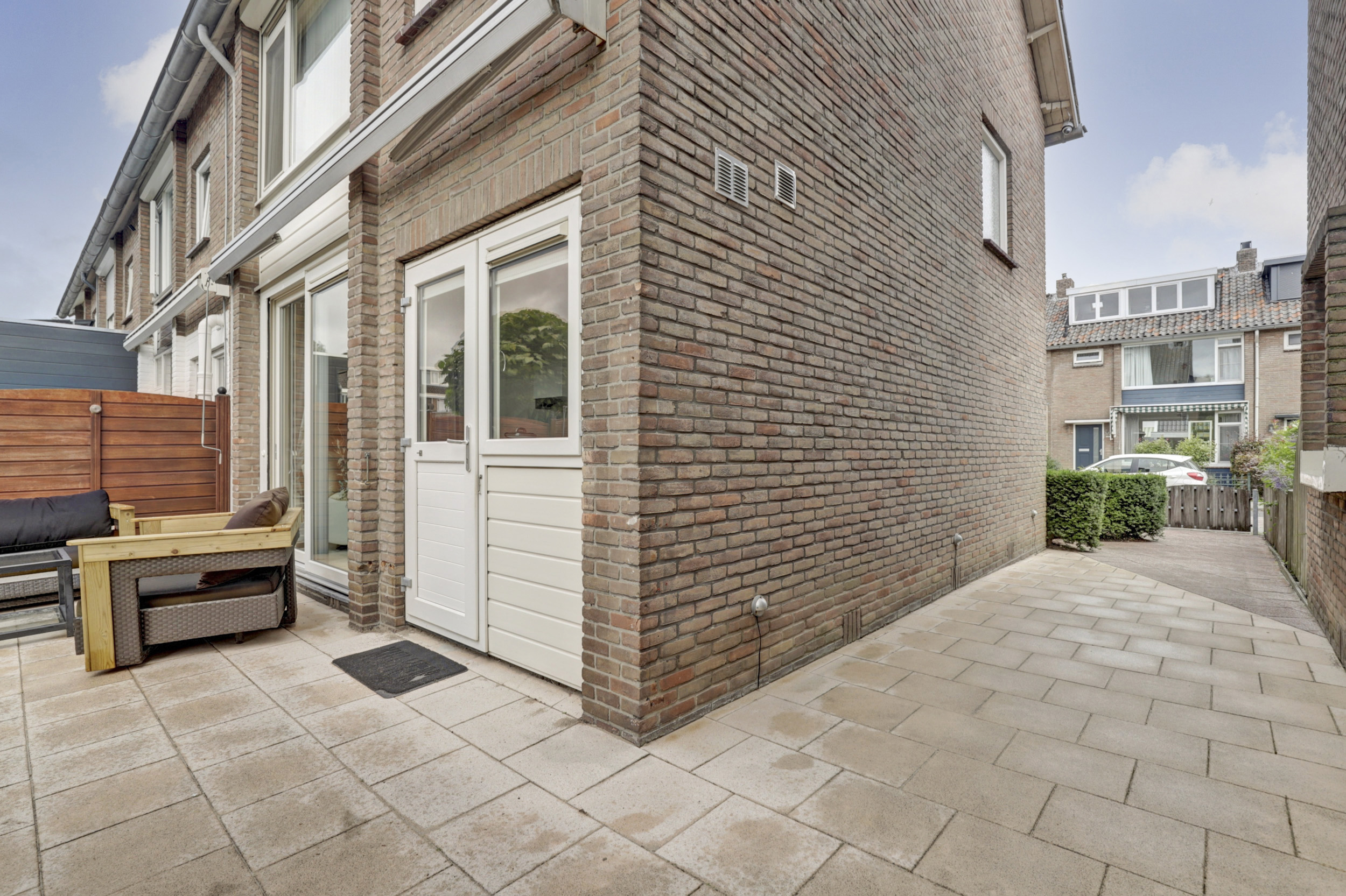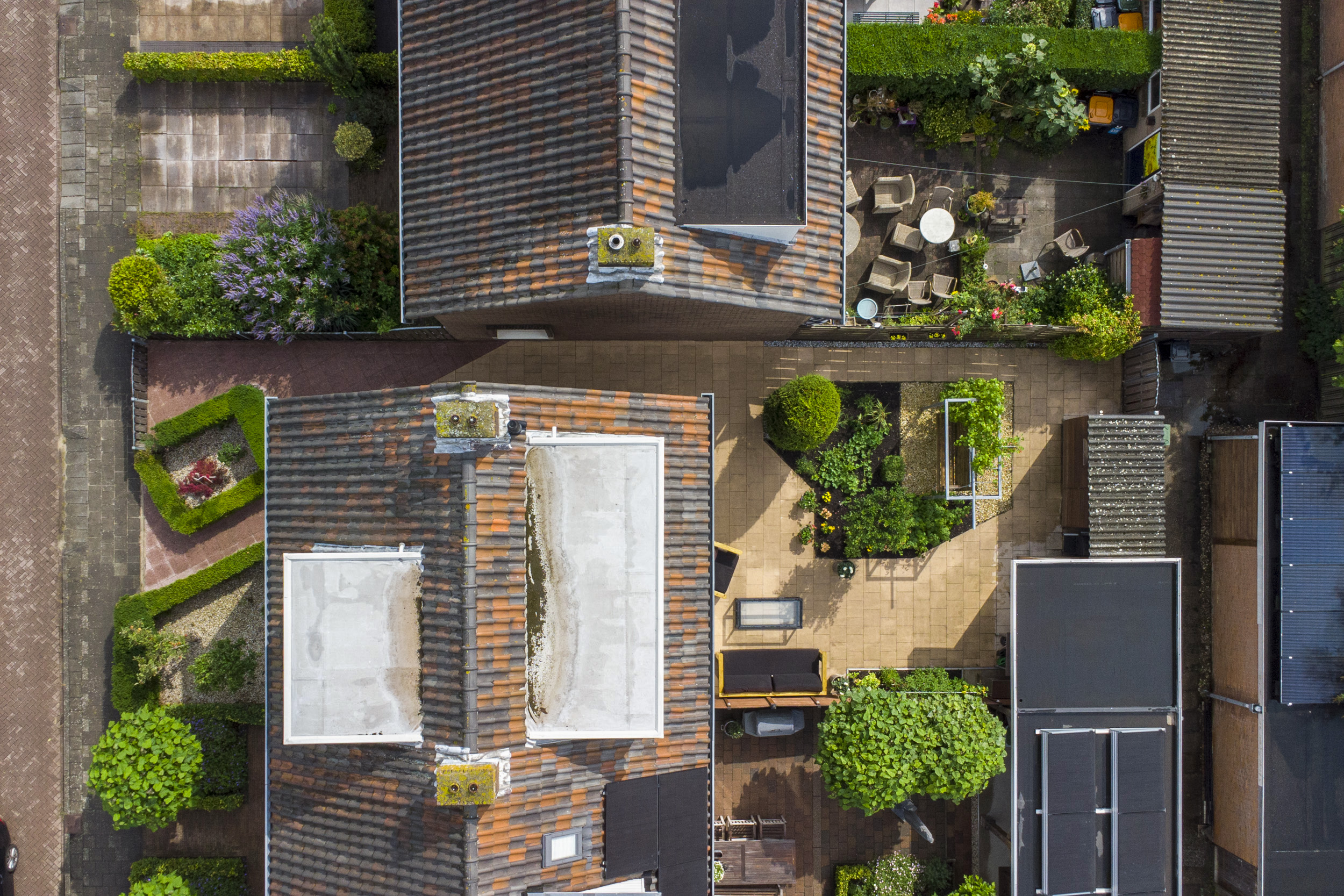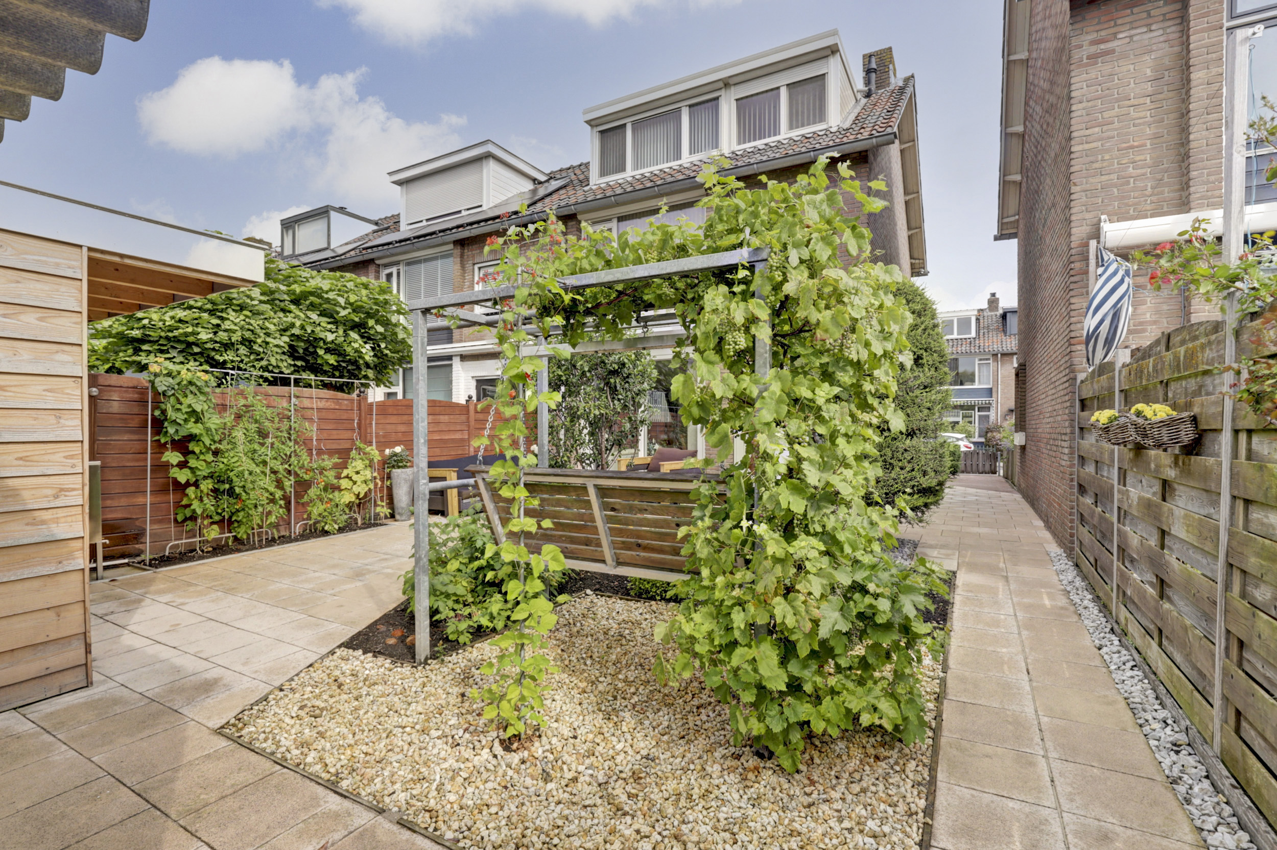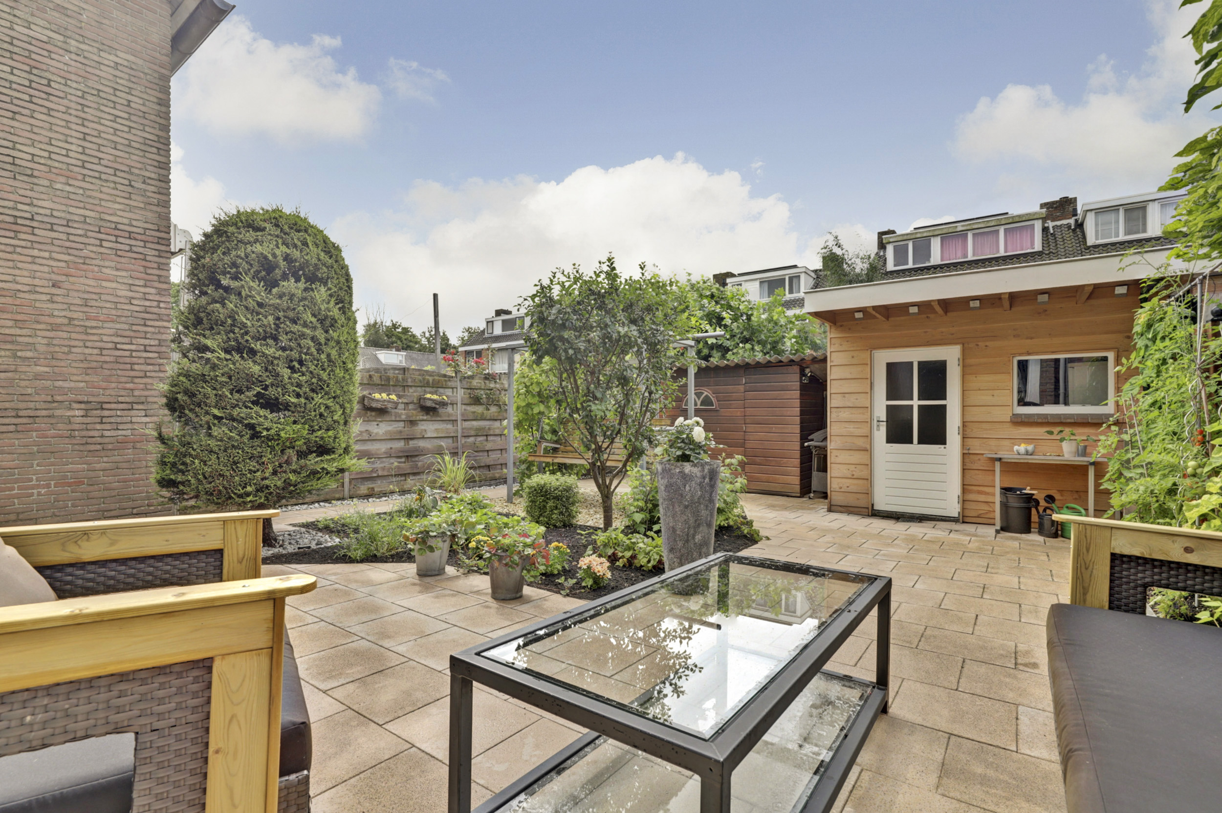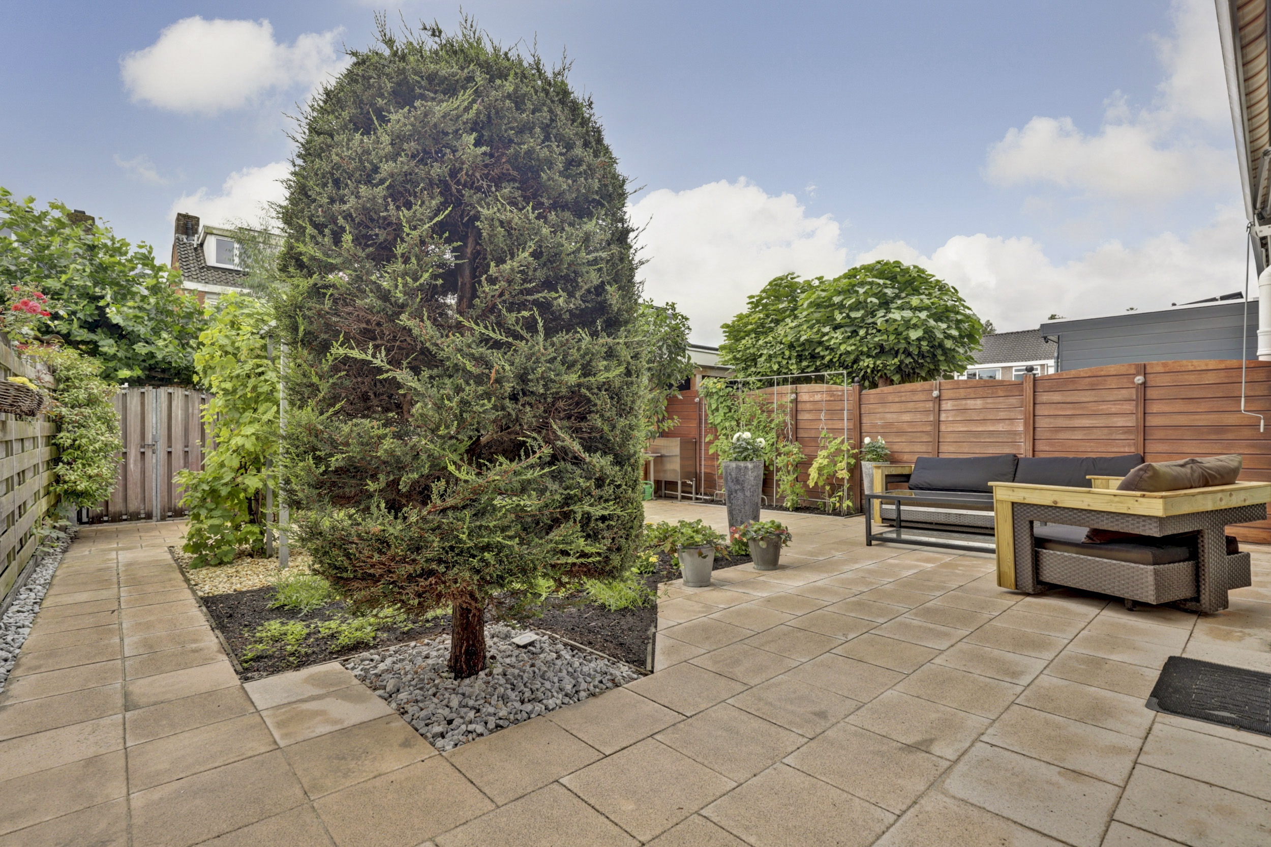 De zonnige achtertuin is onderhoudsvriendelijk aangelegd met sierbestrating, borders en volwassen groen. Er is ruimte genoeg voor een lounge set, eettafel of speeltoestel. Achterin de tuin bevindt zich een dubbele berging, perfect voor fietsen, gereedschap of hobbyruimte. Er is tevens een achterom aanwezig.
