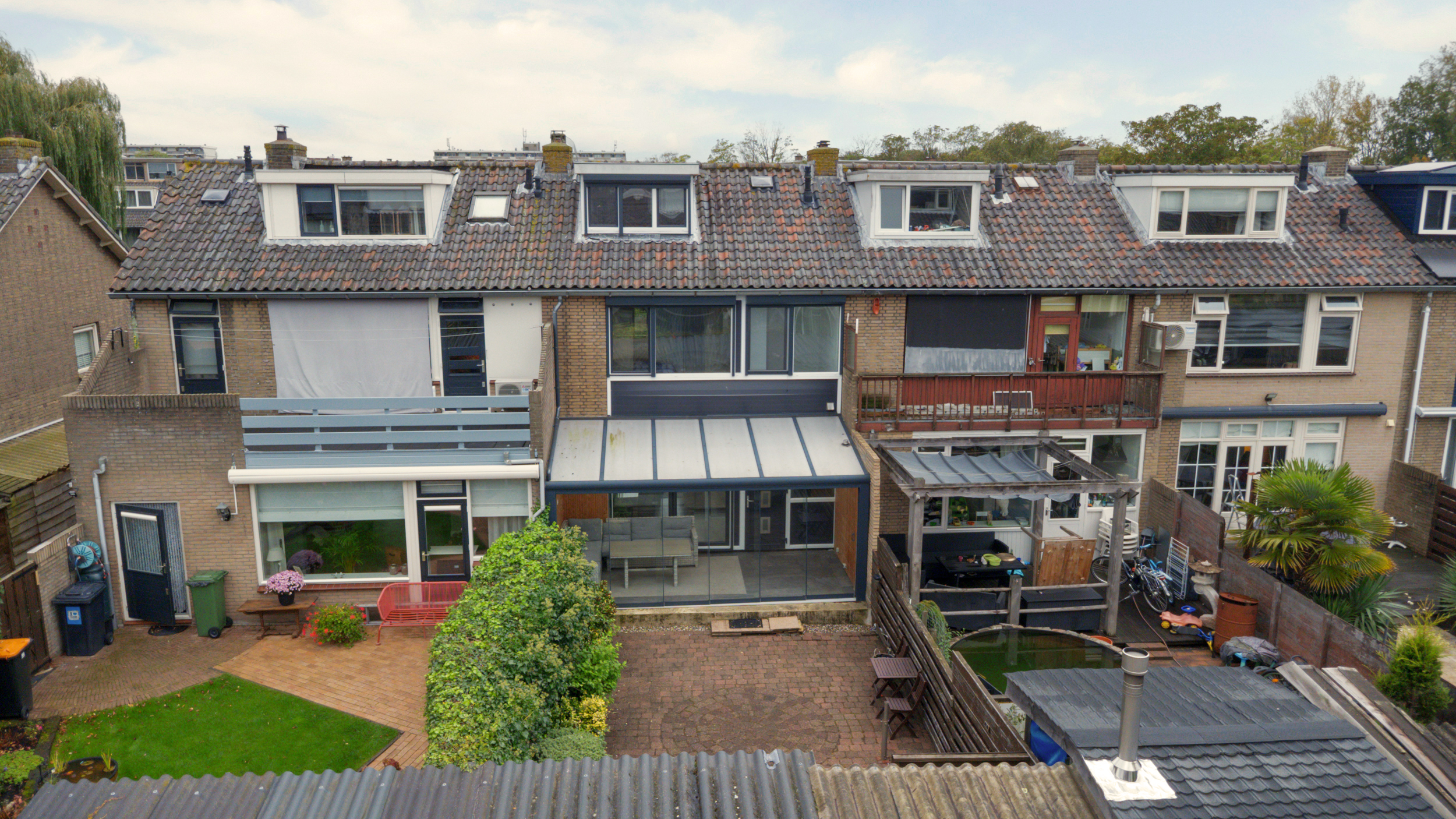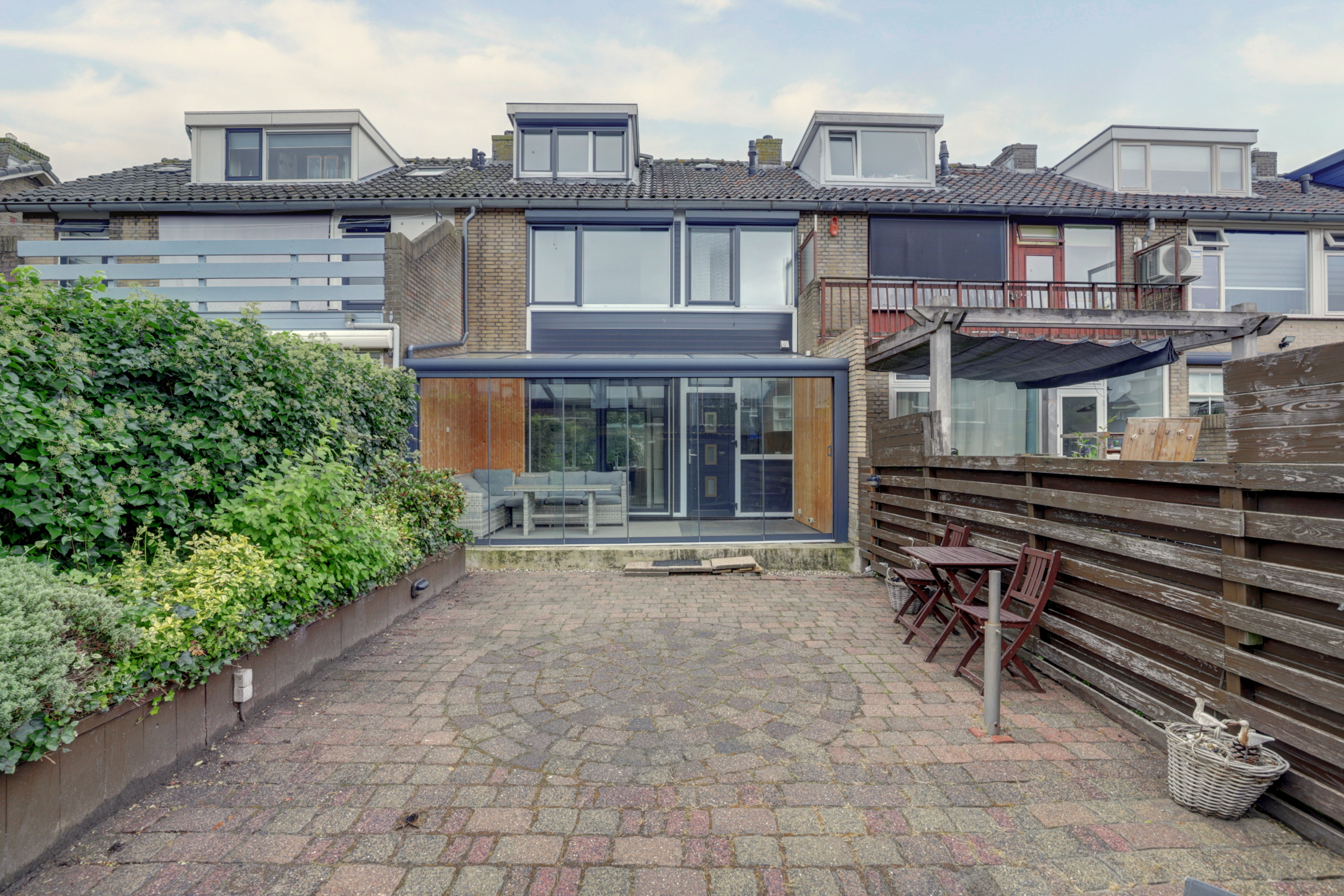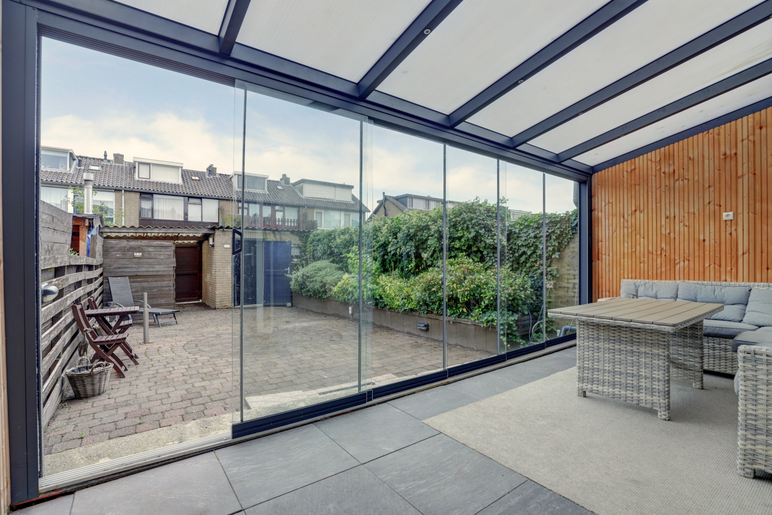 De achtertuin is verzorgd aangelegd met sierbestrating en een ruime zithoek. De ligging op het oosten zorgt voor zon of schaduw, ideaal om te genieten van het buitenleven. De overkapping met glazen schuifwanden maakt het mogelijk om vrijwel het hele jaar door buiten te zitten. Achterin de tuin bevindt zich een berging en een achterom voor extra gemak.