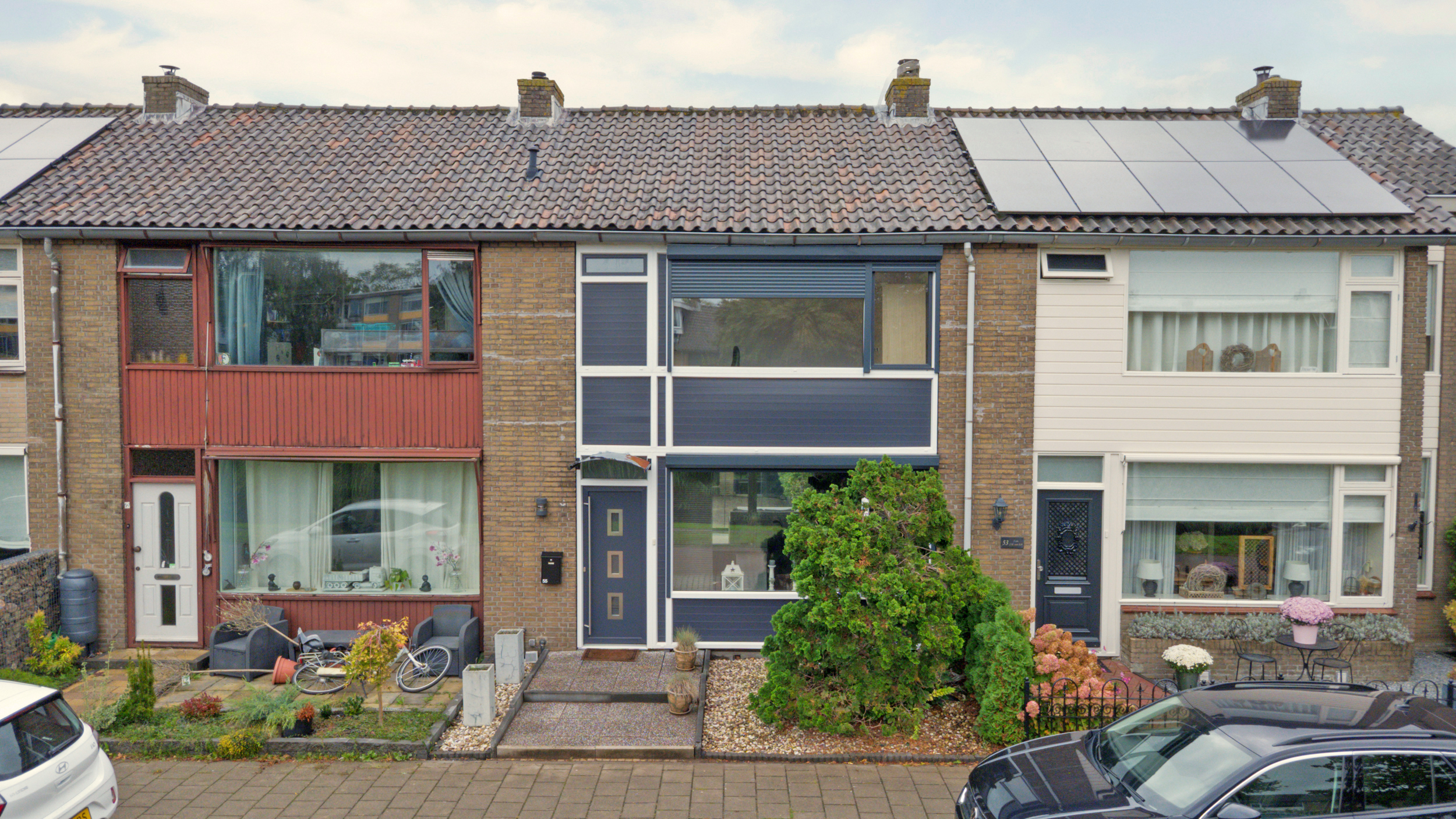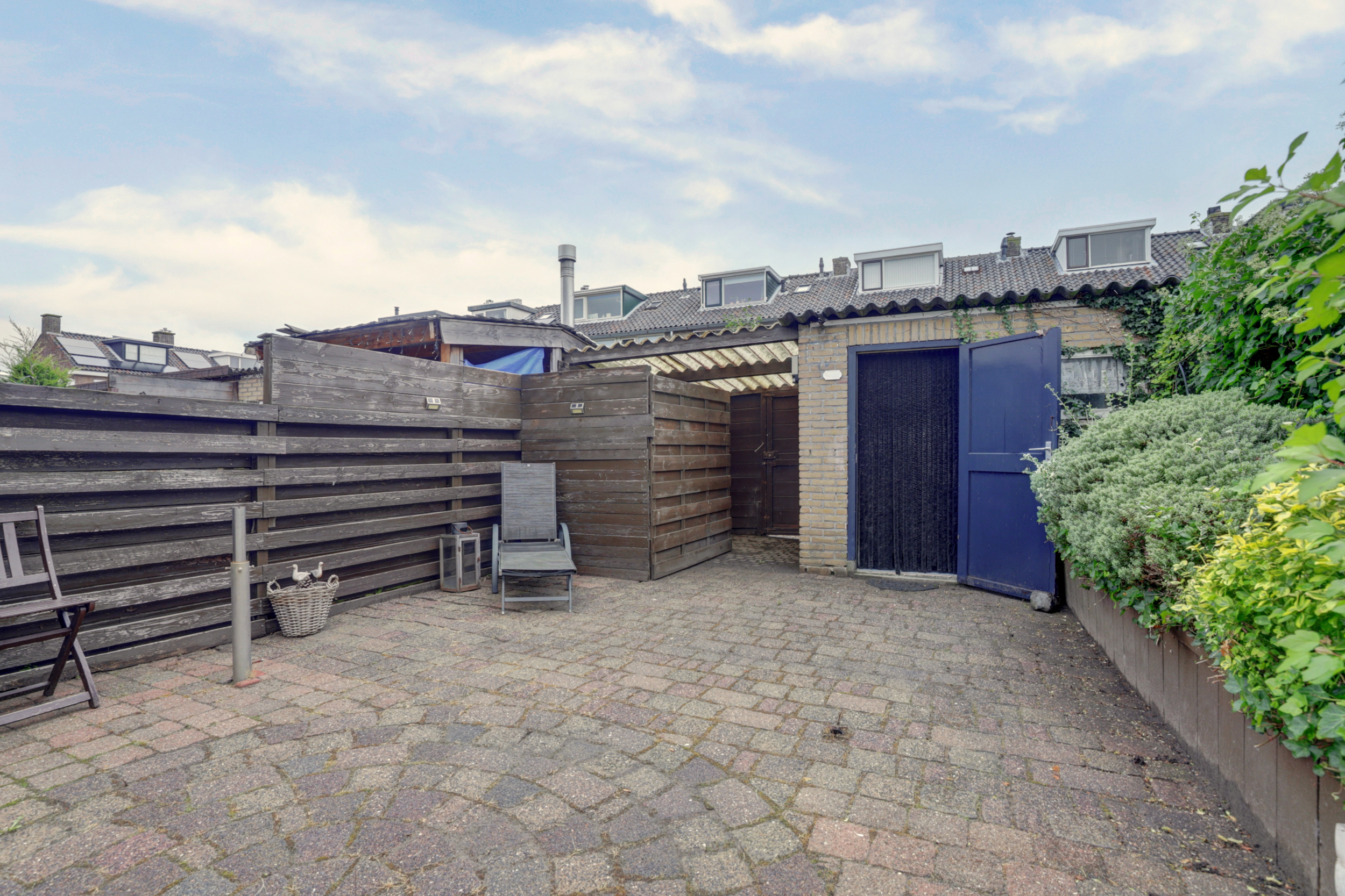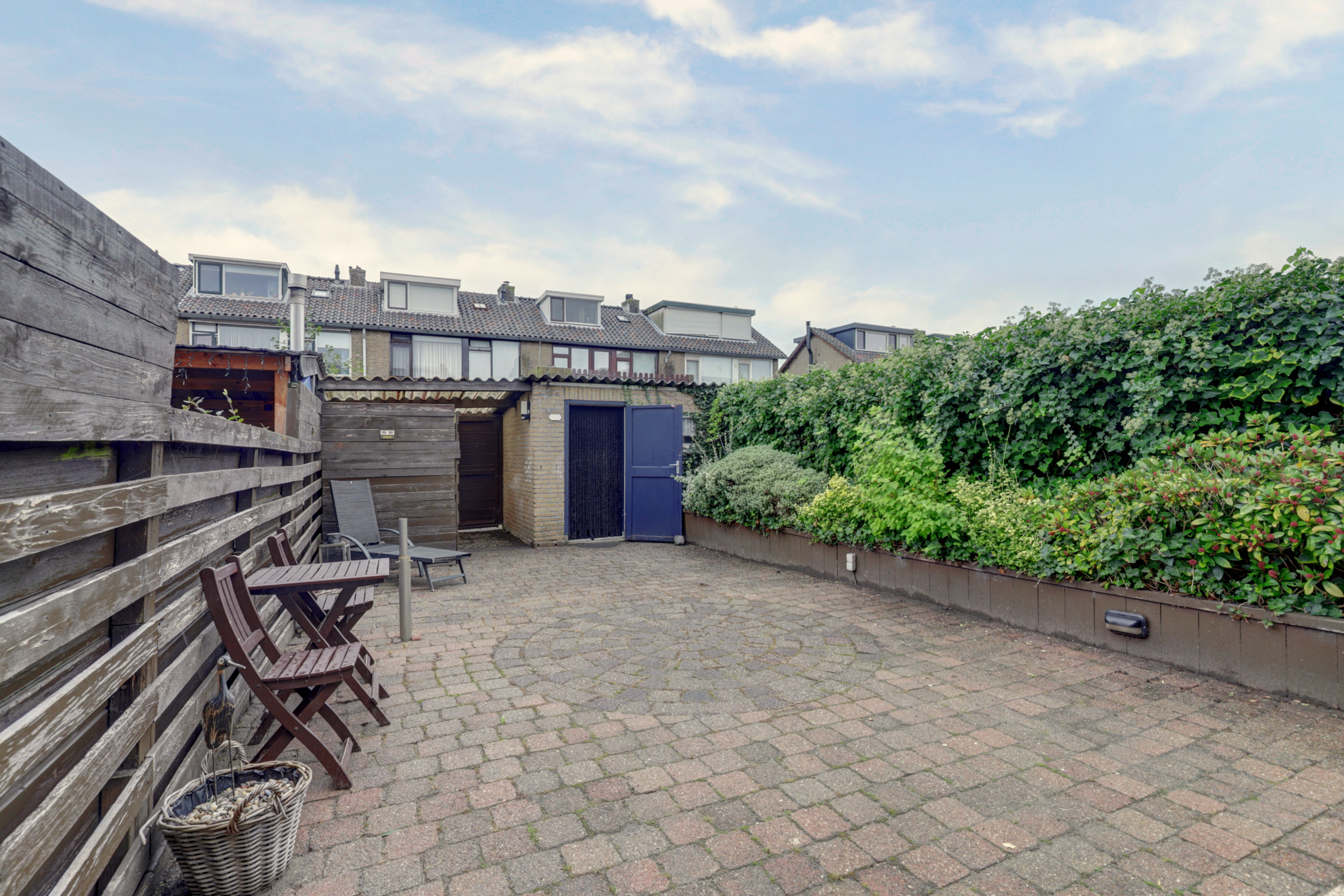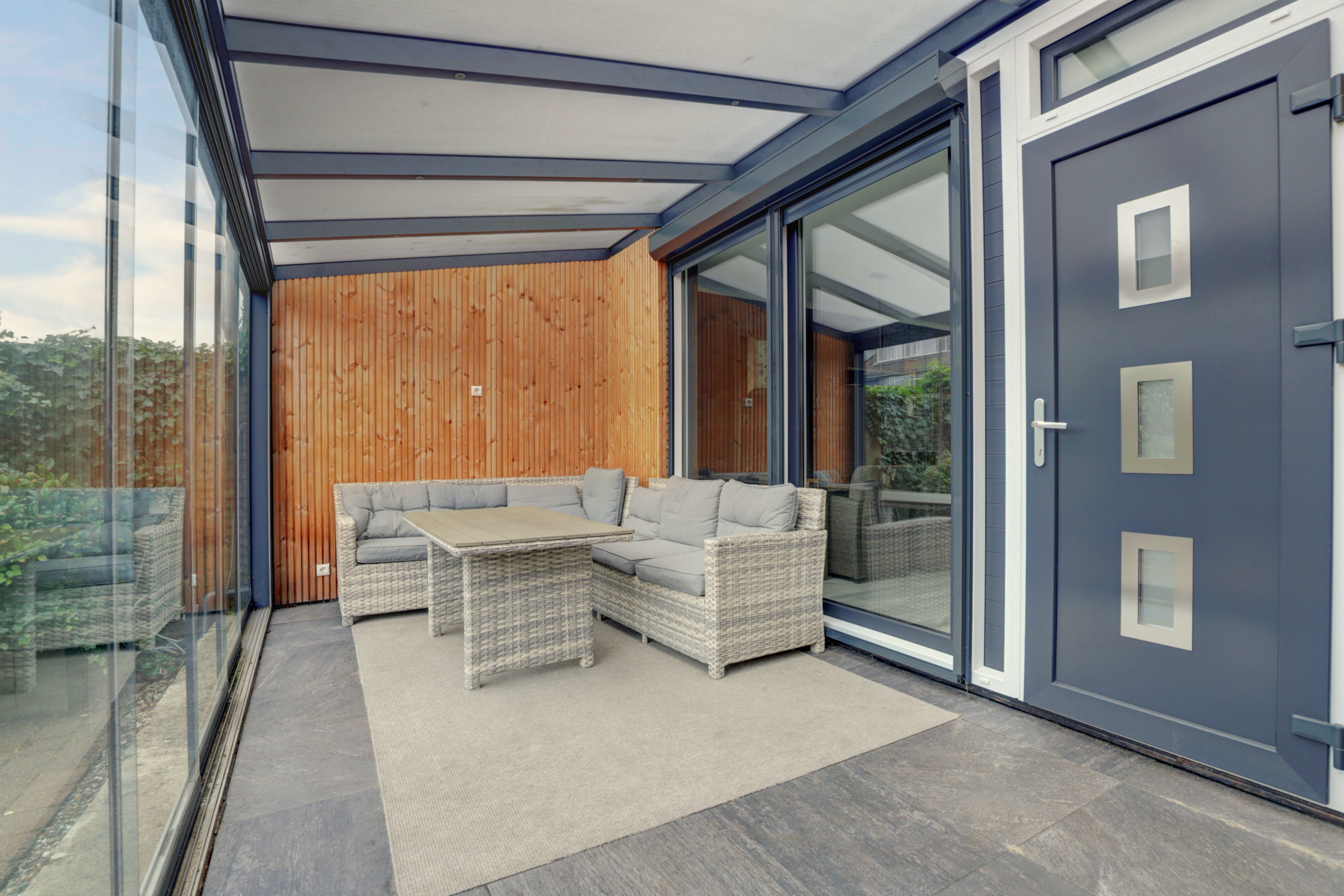 De achtertuin is verzorgd aangelegd met sierbestrating en een ruime zithoek. De ligging op het oosten zorgt voor zon of schaduw, ideaal om te genieten van het buitenleven. De overkapping met glazen schuifwanden maakt het mogelijk om vrijwel het hele jaar door buiten te zitten. Achterin de tuin bevindt zich een berging en een achterom voor extra gemak.