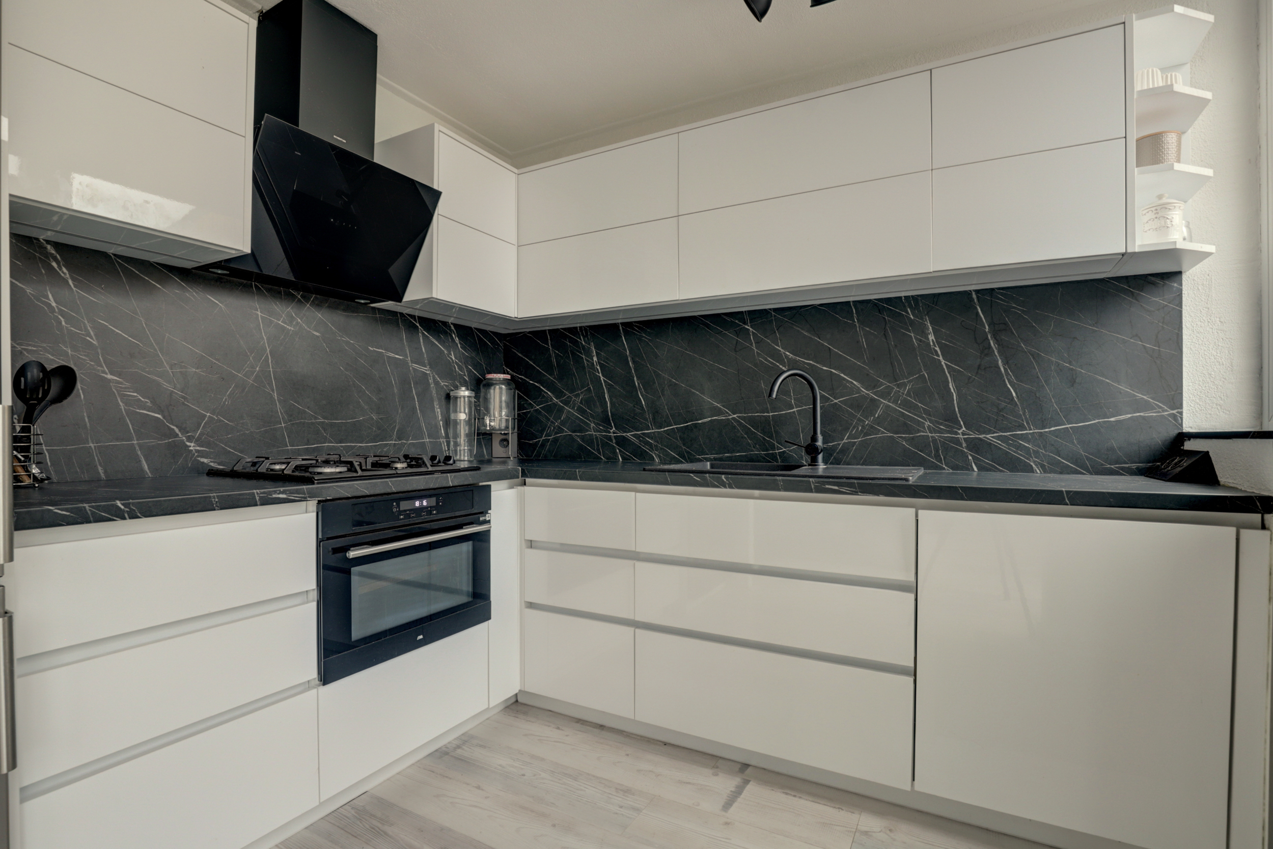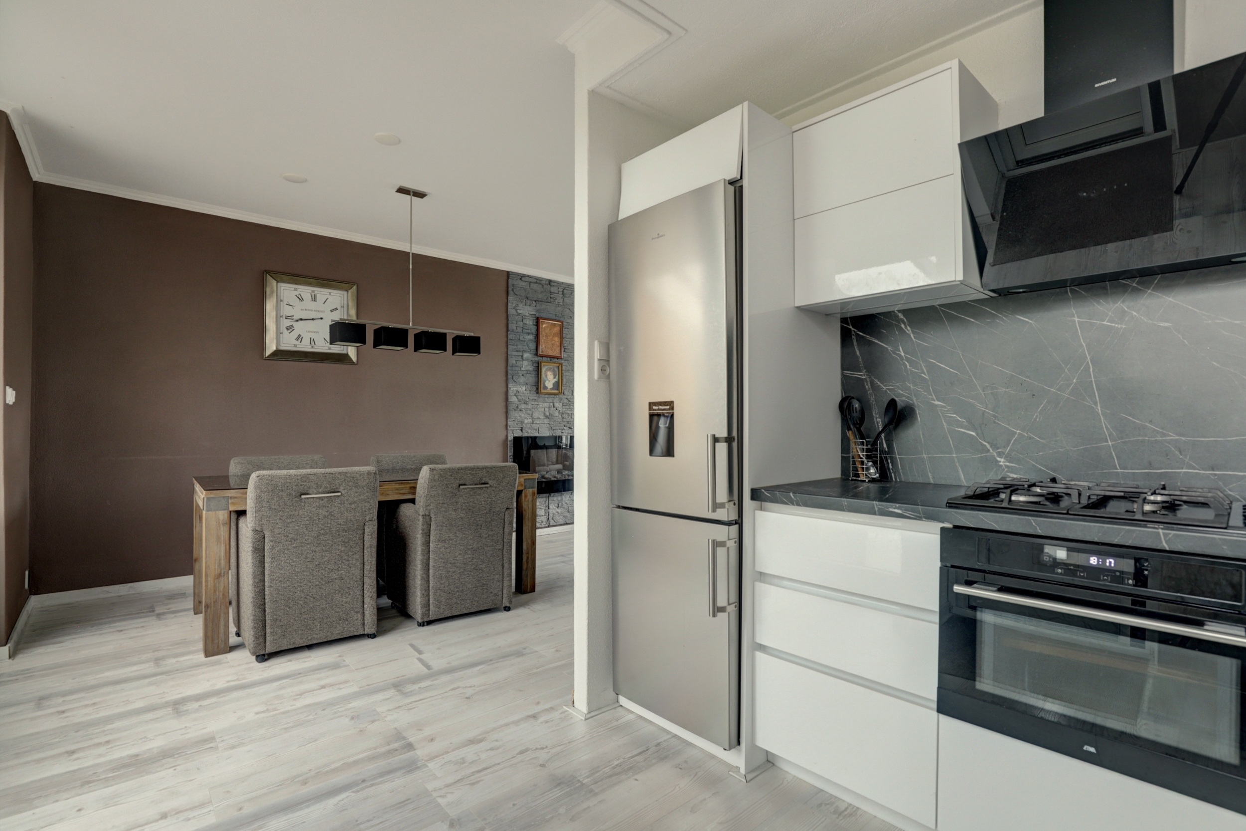 Aan de achterzijde bevindt zich de open keuken in een moderne L-opstelling, voorzien van witte fronten en een donker werkblad. De keuken is uitgerust met diverse inbouwapparatuur, waaronder een koel-vriescombinatie, oven, gaskookplaat, afzuigkap en vaatwasser. Vanuit de keuken is er toegang tot de ruime overkapping/serre, waardoor binnen en buiten mooi in elkaar overlopen.