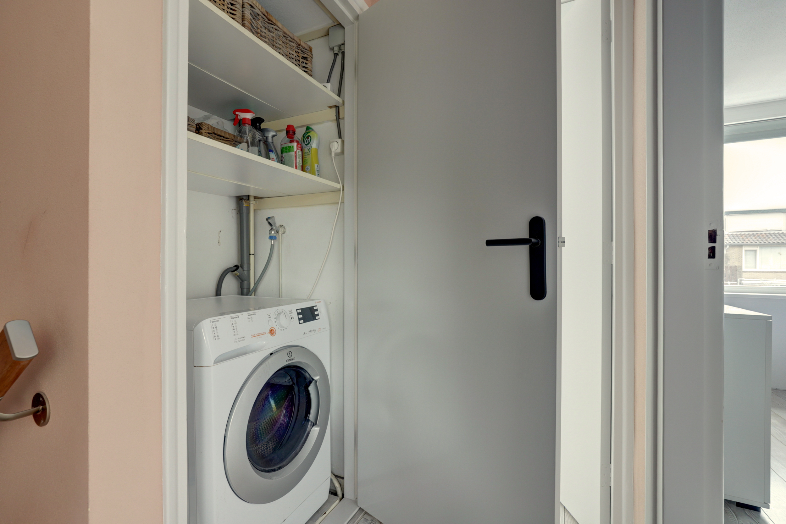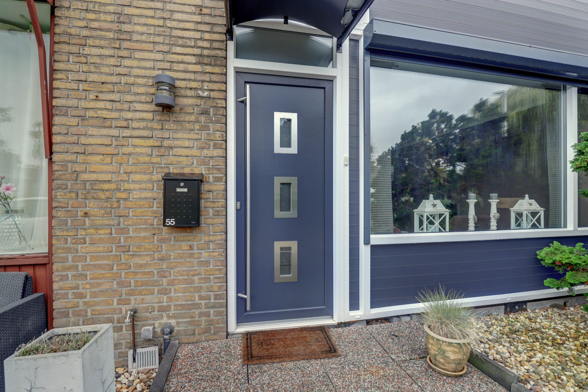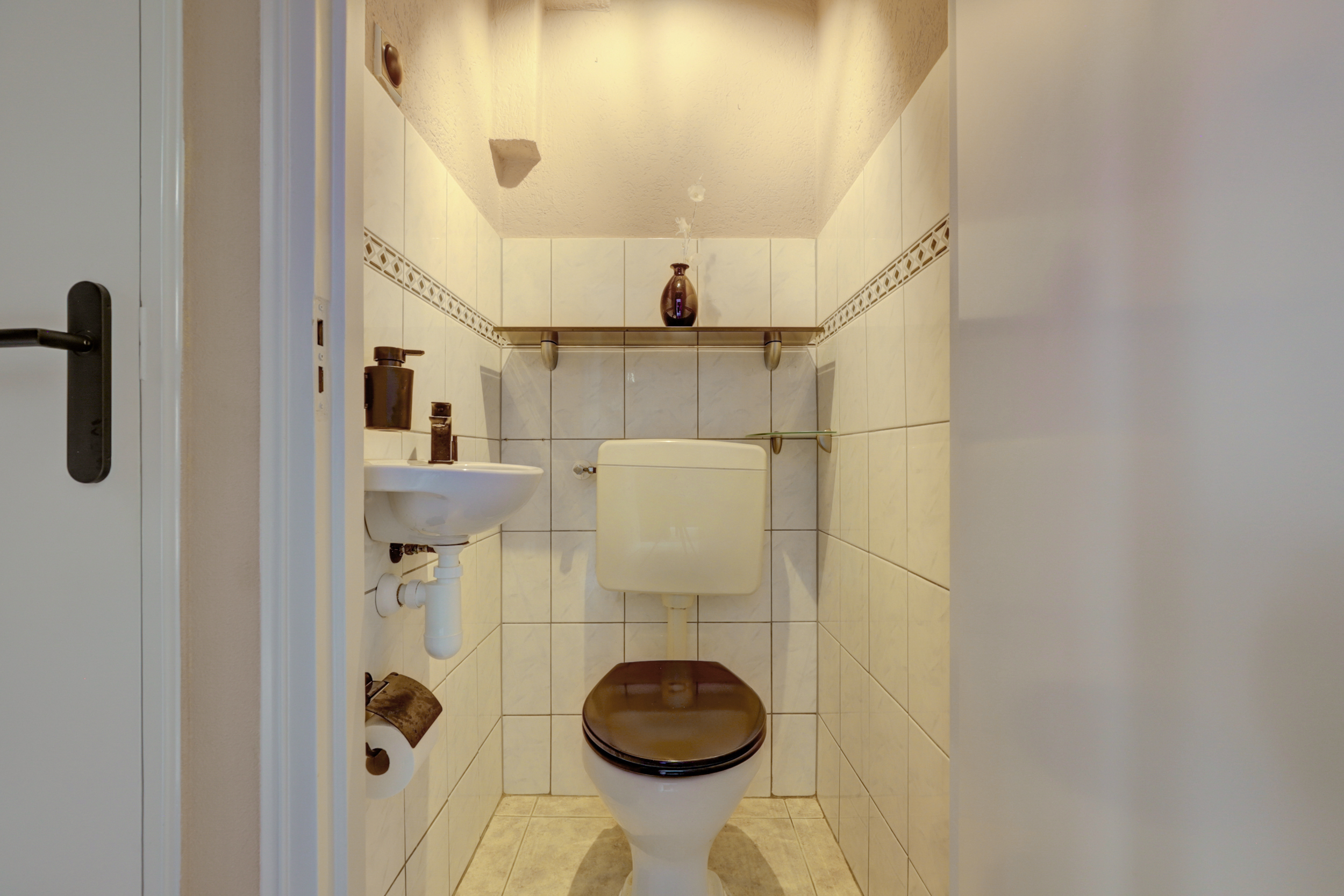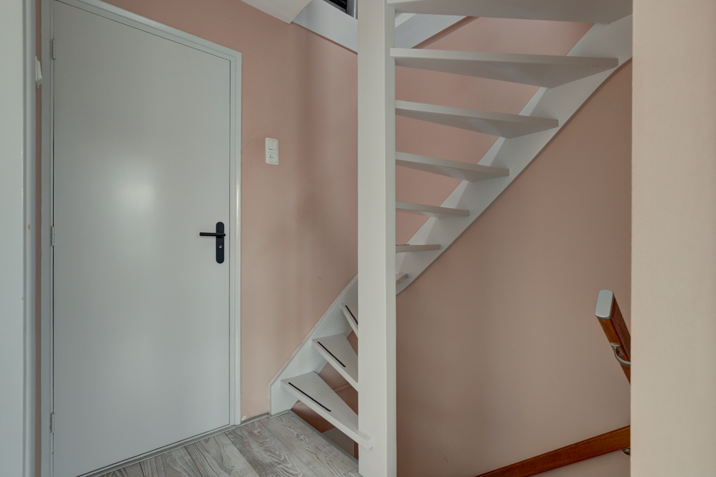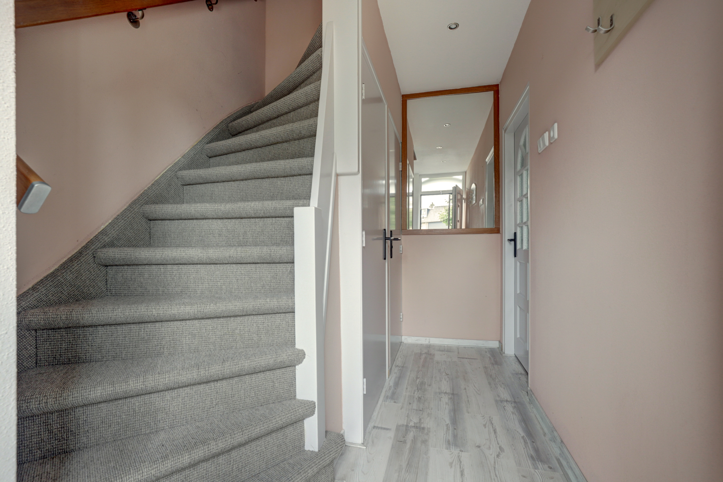 De entree bevindt zich aan de voorzijde van de woning, achter de nette voortuin. In de hal bevinden zich het toilet, de meterkast en de trapopgang naar de eerste verdieping.