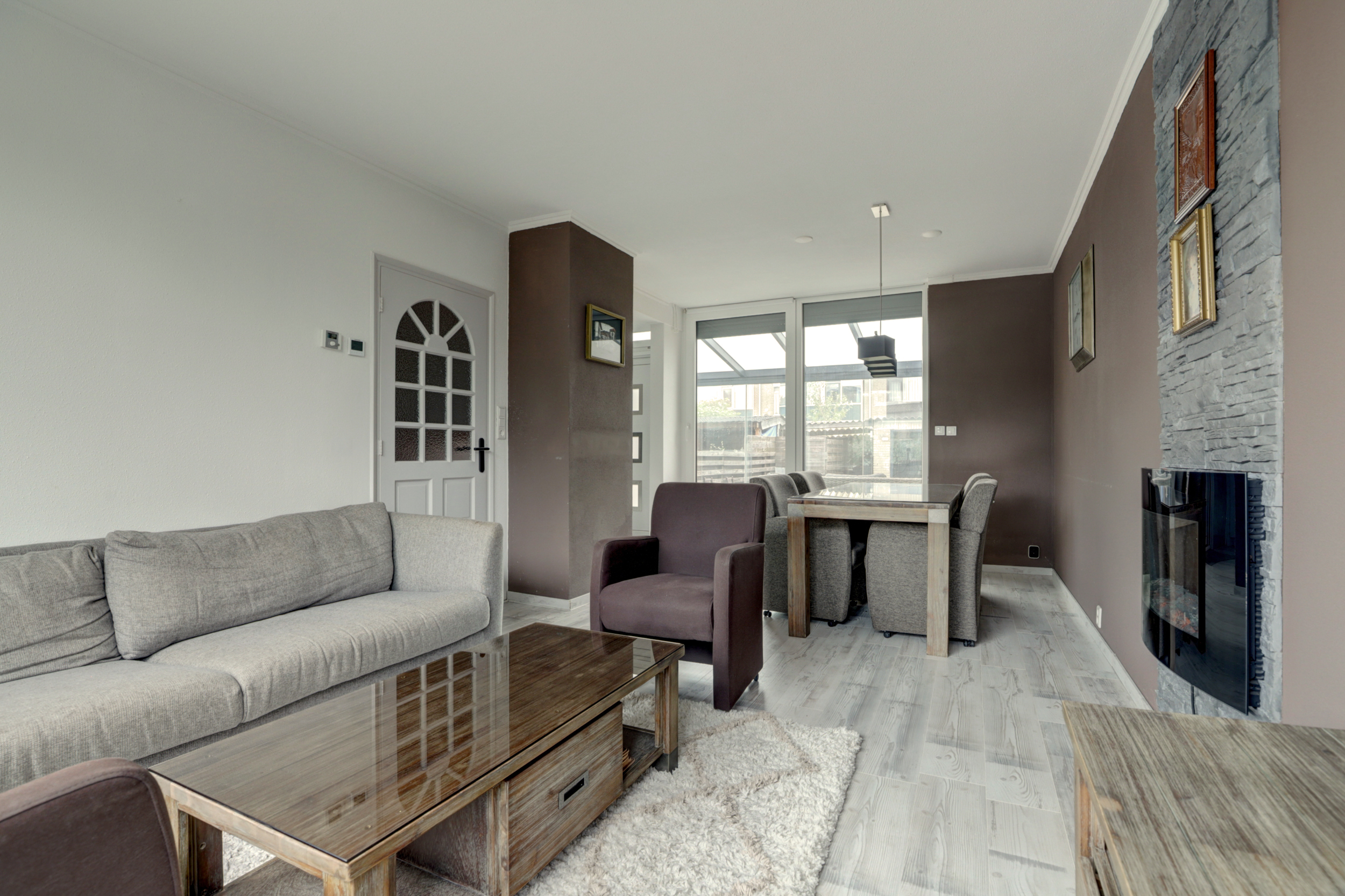De lichte doorzonwoonkamer heeft grote ramen aan de voor- en achterzijde, wat zorgt voor een prettige lichtinval. De moderne laminaatvloer en de strakke afwerking geven de ruimte een eigentijdse uitstraling.