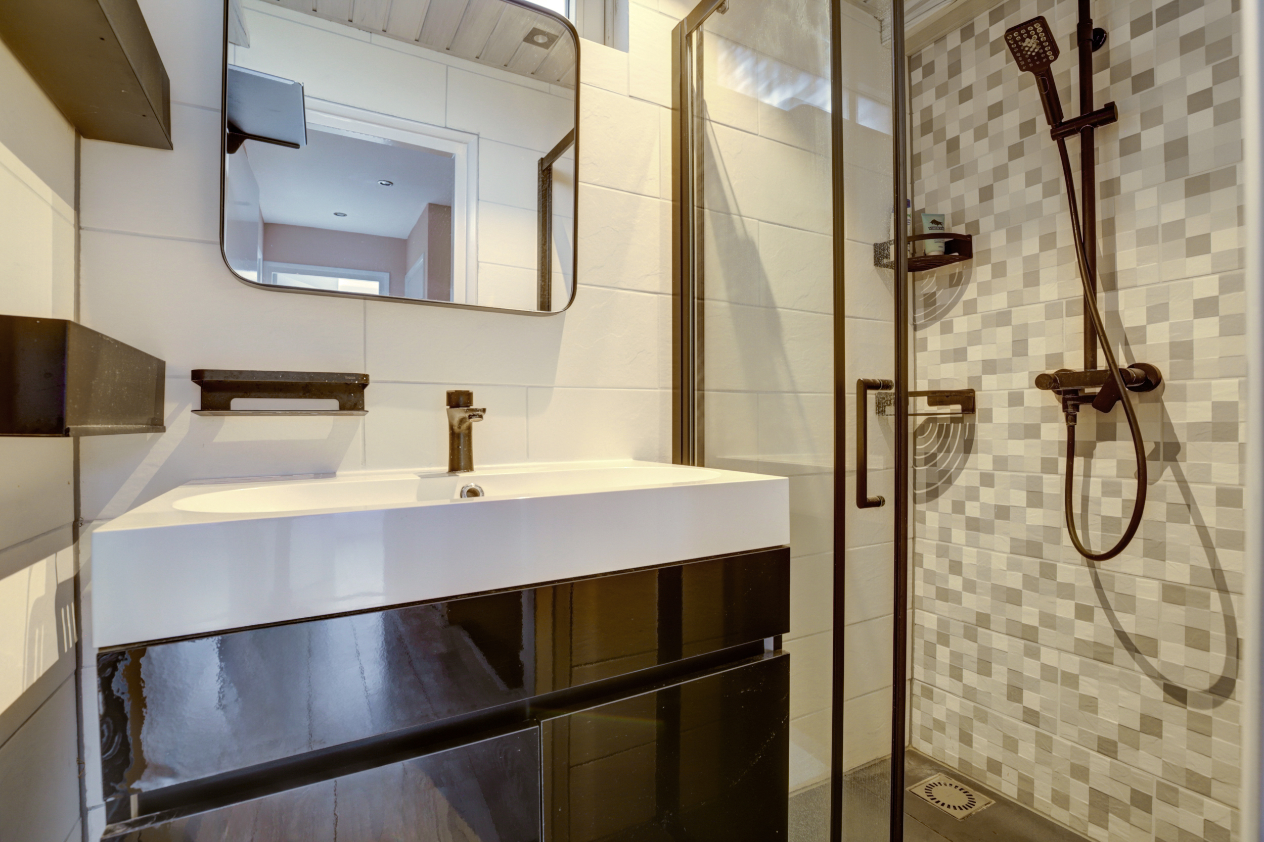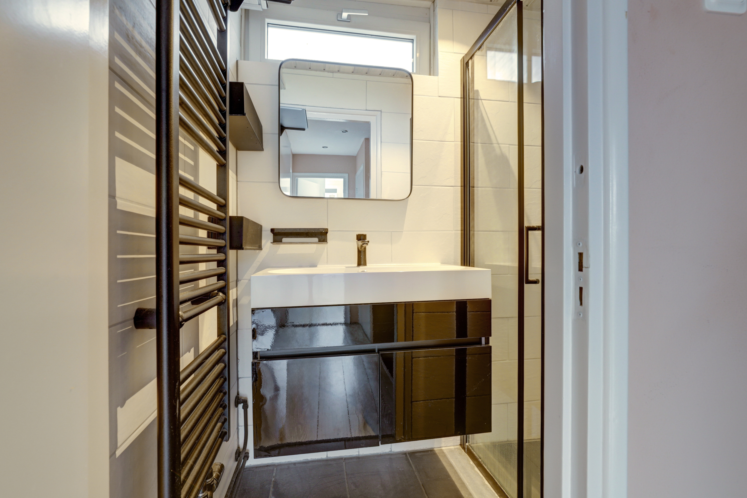 De badkamer is smaakvol vernieuwd en beschikt over een inloopdouche met glazen wand en zwarte accenten, een modern wastafelmeubel en stijlvolle betegeling in grijstinten.