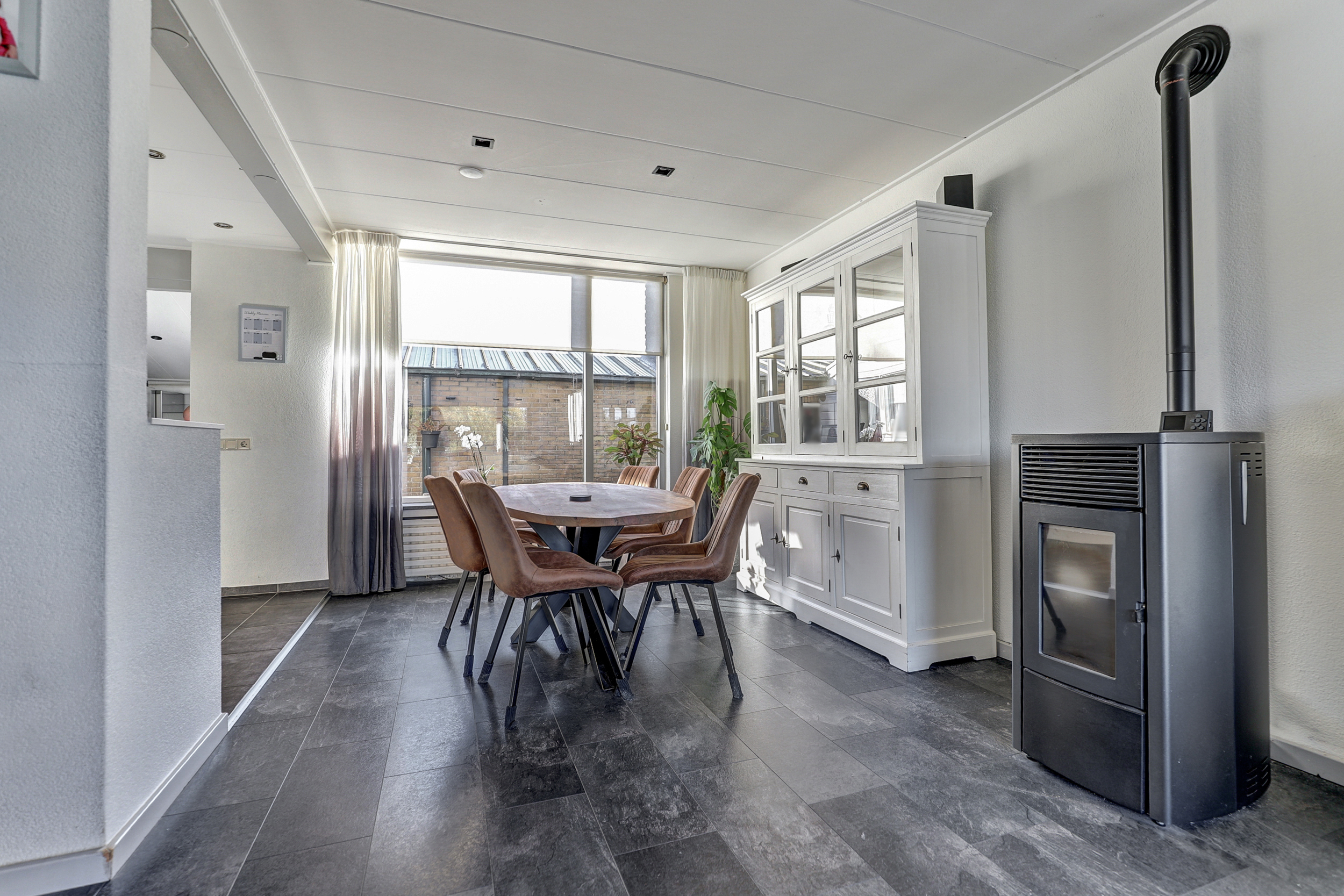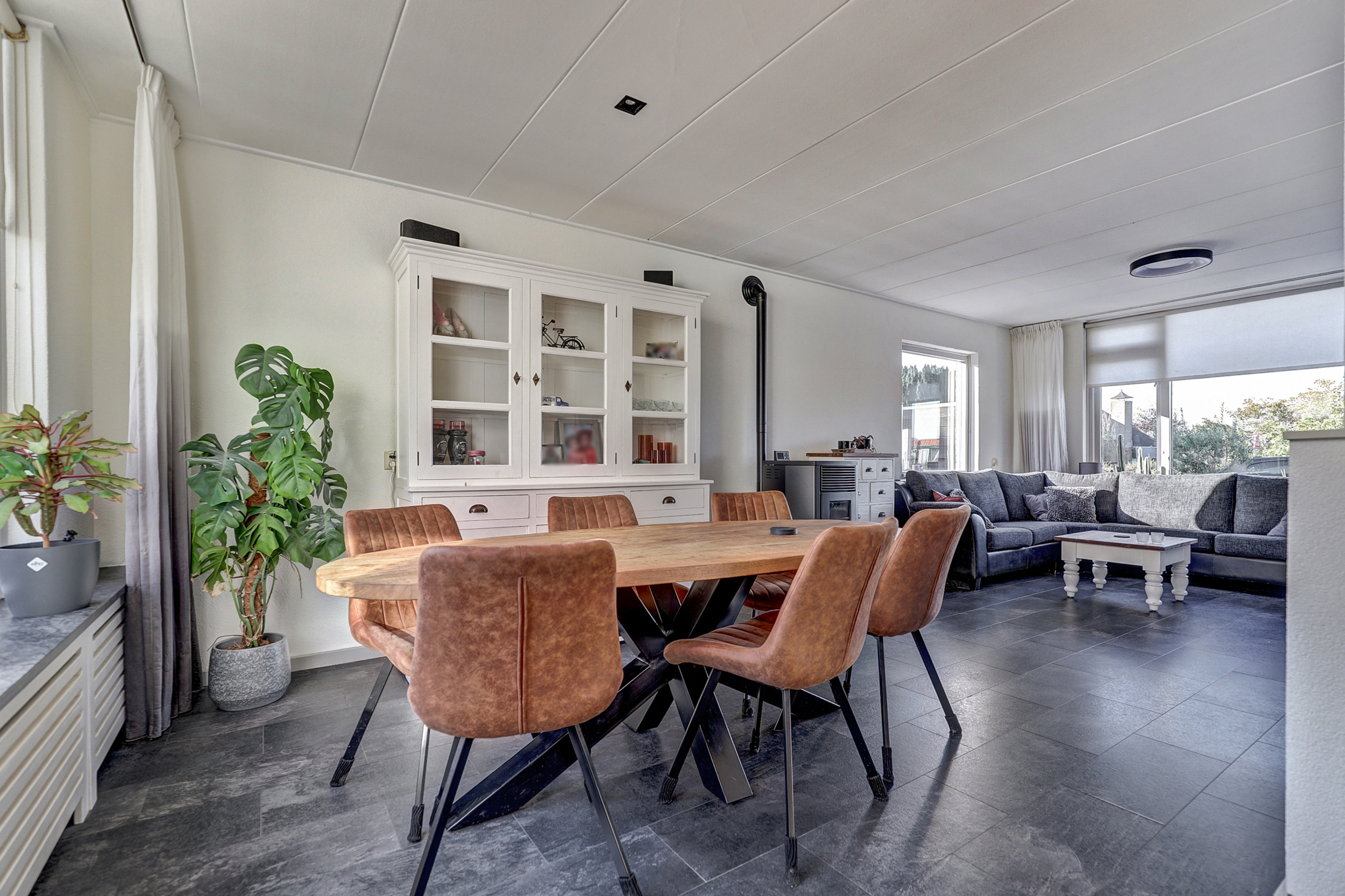 Aan de achterzijde bevindt zich de eetkamer, met ruimte voor een grote eettafel. Vanuit hier kijkt u via het brede raam uit op de tuin, waardoor binnen en buiten mooi in elkaar overlopen.