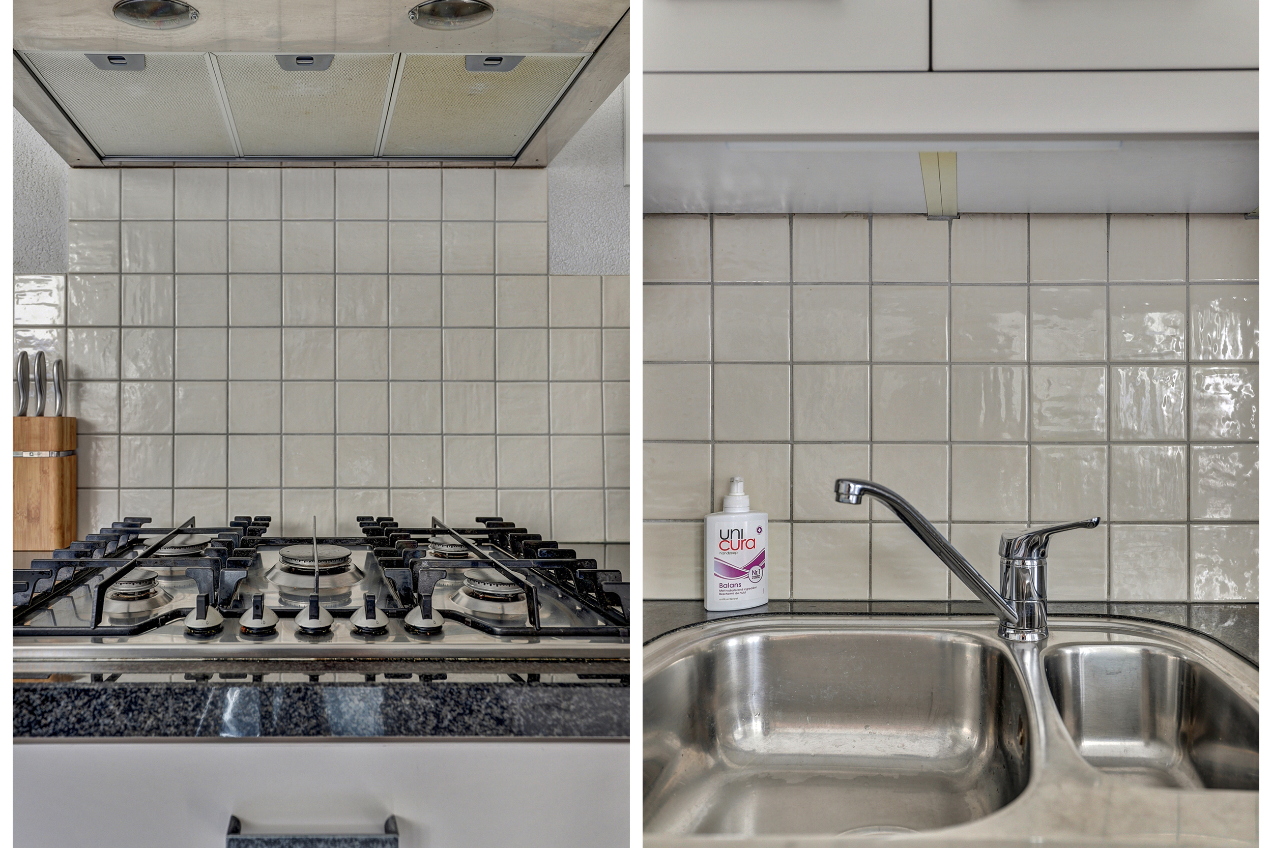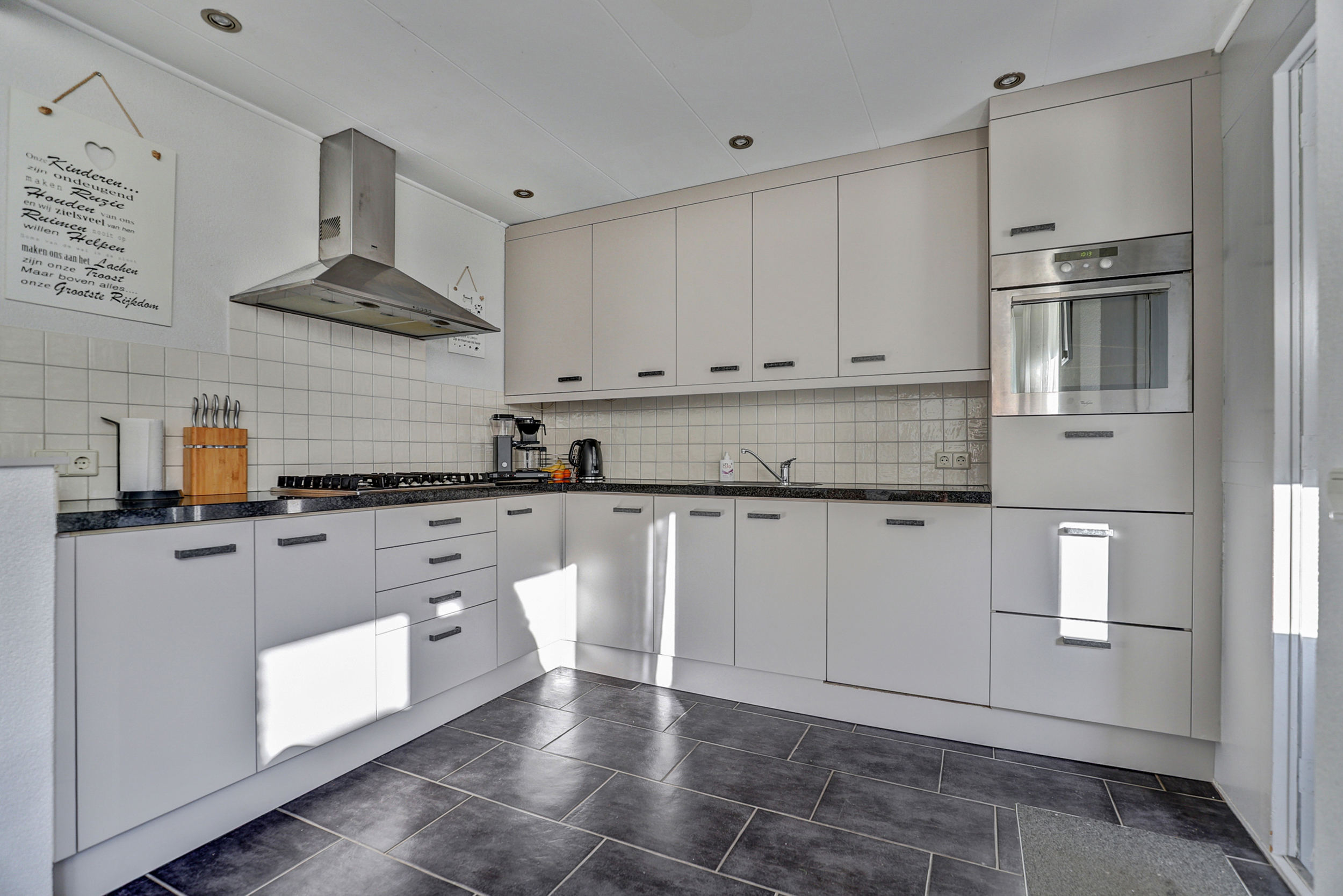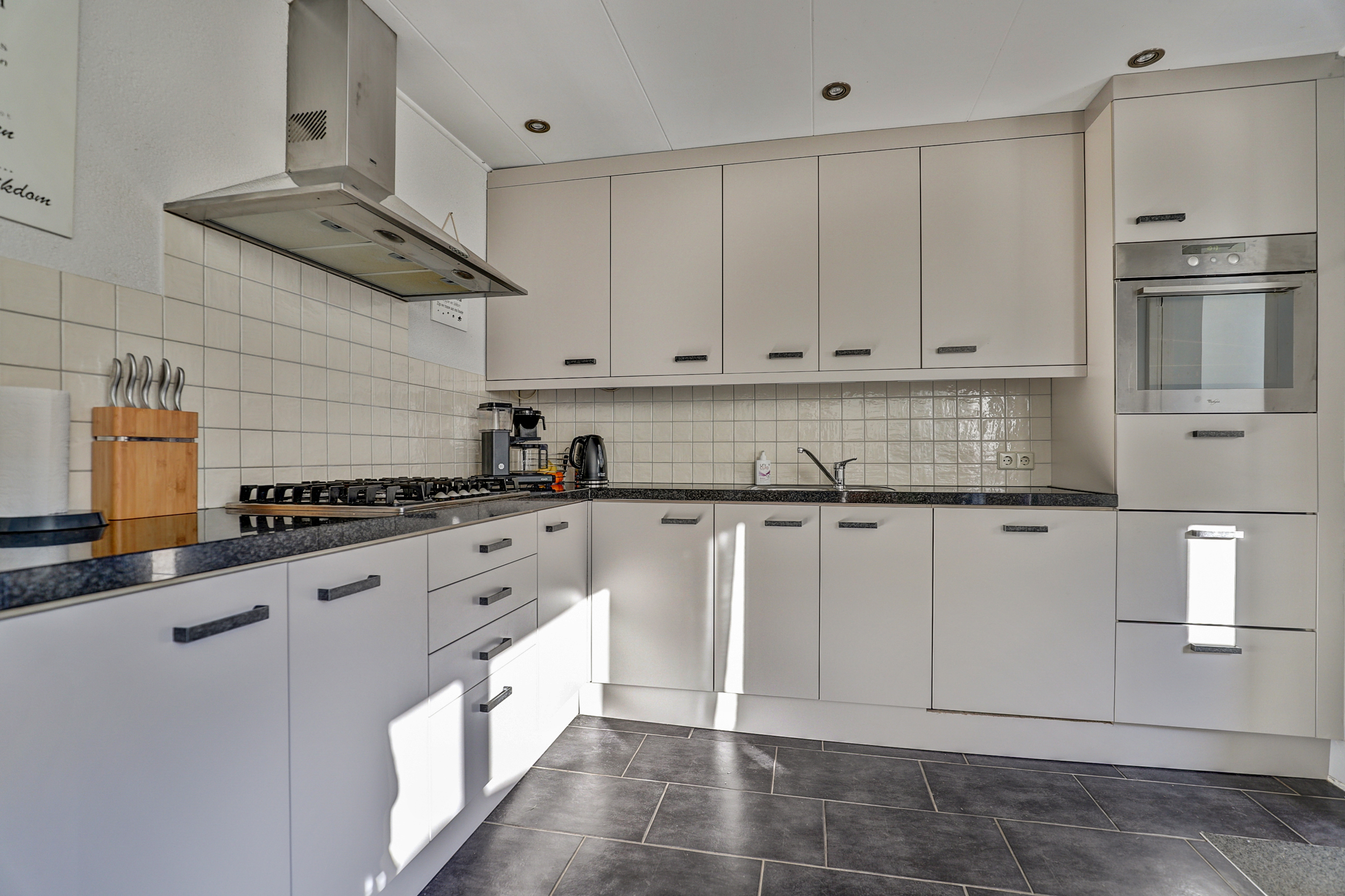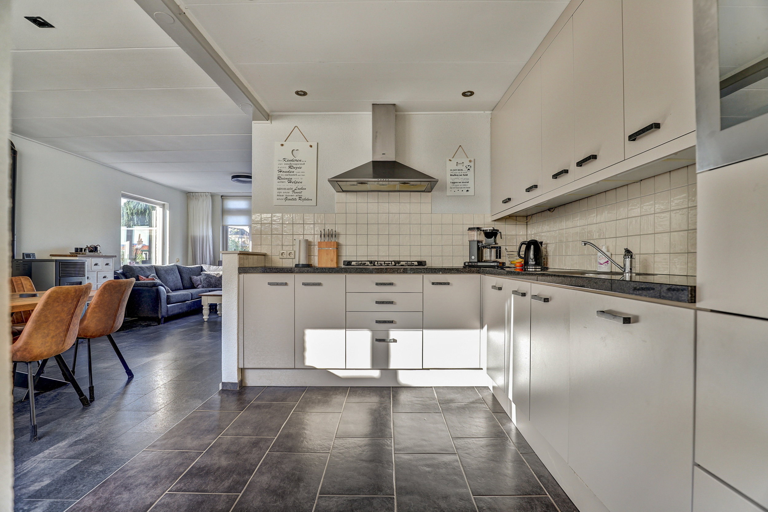 De halfopen keuken is in een L-opstelling geplaatst en uitgevoerd in een lichte tint met donkere werkbladen. Deze is voorzien van moderne inbouwapparatuur, waaronder een gasfornuis met afzuigkap, vaatwasser, koelkast en oven. De lichte wandtegels en de donkere vloertegels creëren een tijdloze uitstraling.