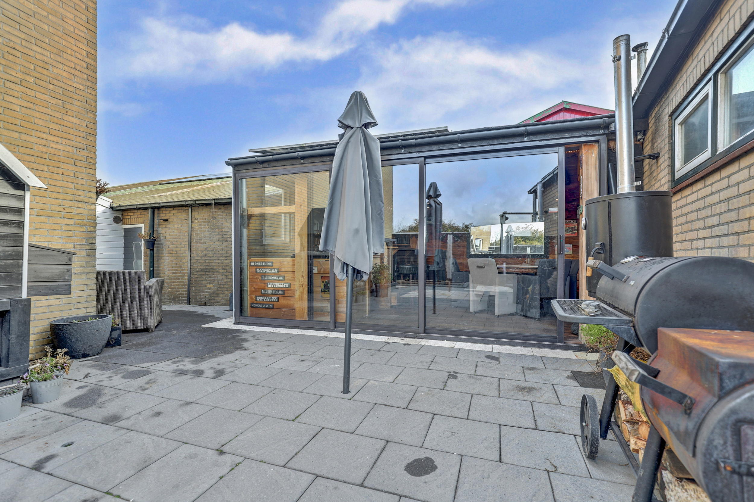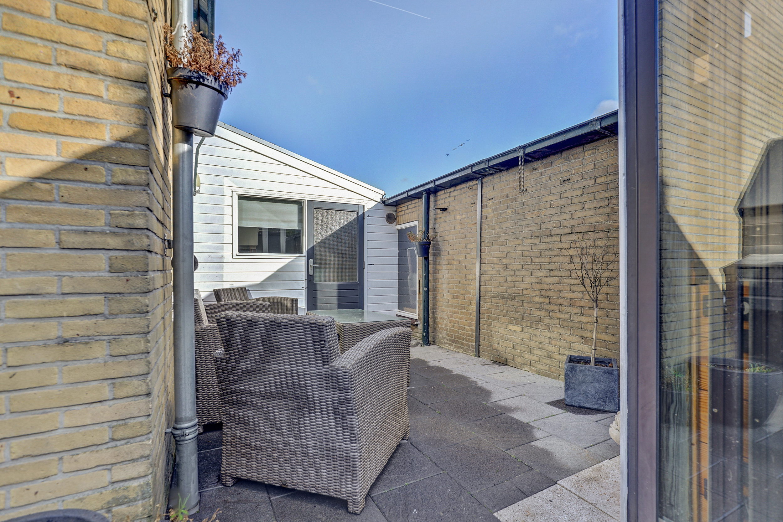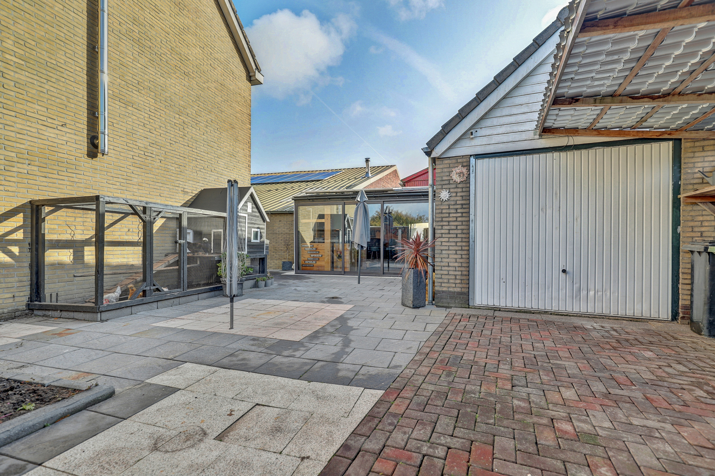 De tuin is onderhoudsvriendelijk aangelegd met grote grijze terrastegels en rode klinkers, en biedt volop ruimte om te zitten en te genieten van de zon. De tuin is volledig omsloten, wat zorgt voor veel privacy. Achter in de tuin bevindt zich een grote vrijstaande garage met openslaande deuren, ideaal voor het stallen van auto, motor of fietsen. Daarnaast staat er een sfeervolle houten berging, ingericht als gezellige bar-/ontspanningsruimte met houten wanden, sfeerverlichting, bar en zithoek. Een unieke plek voor gezellige avonden met familie of vrienden!