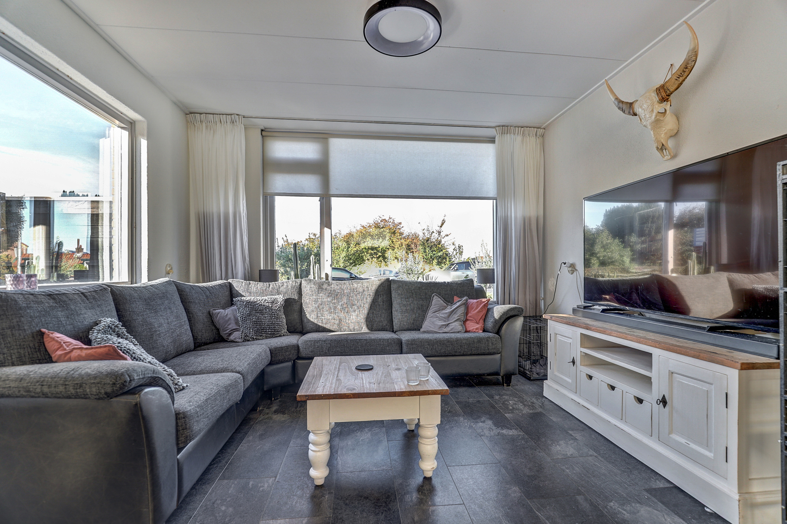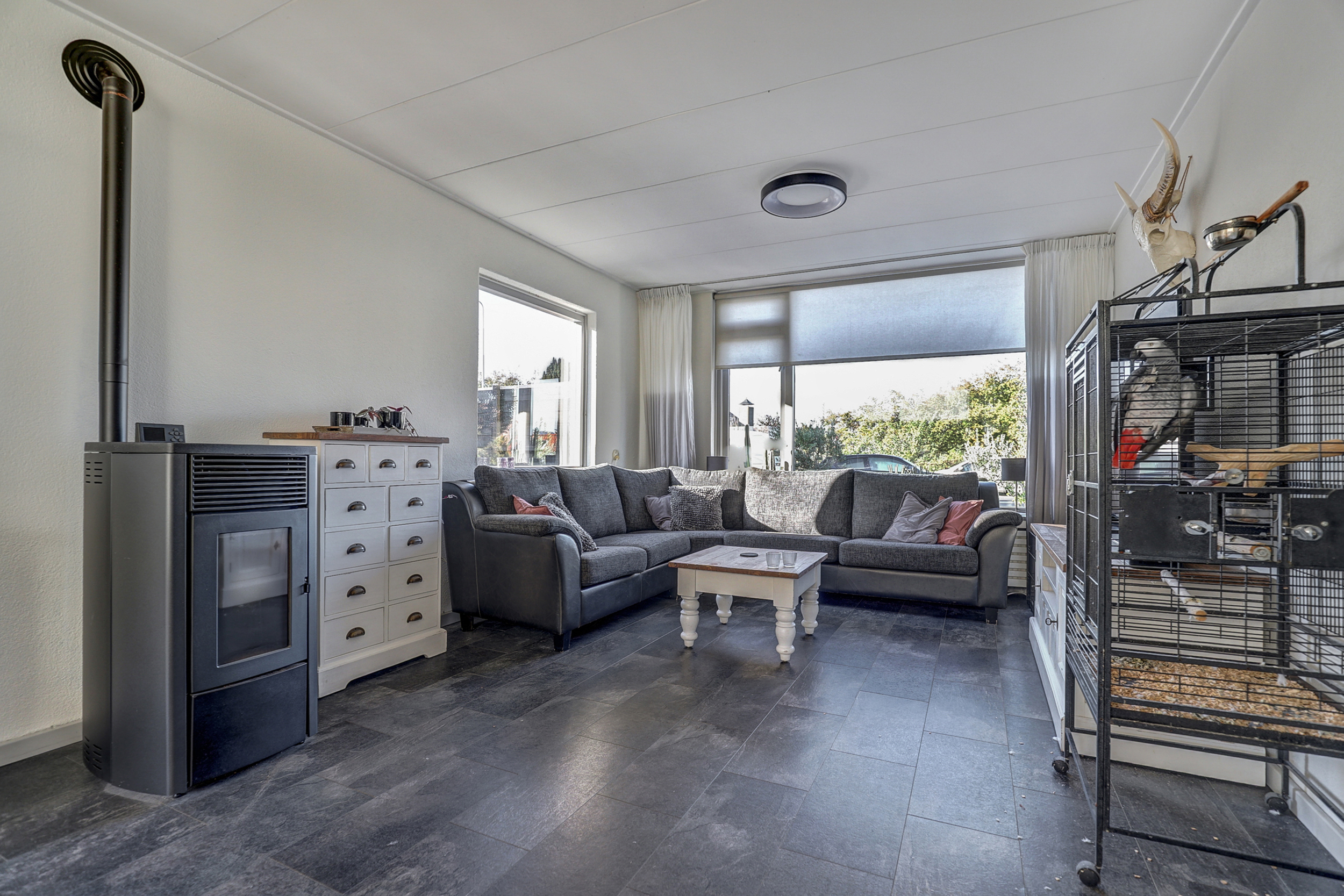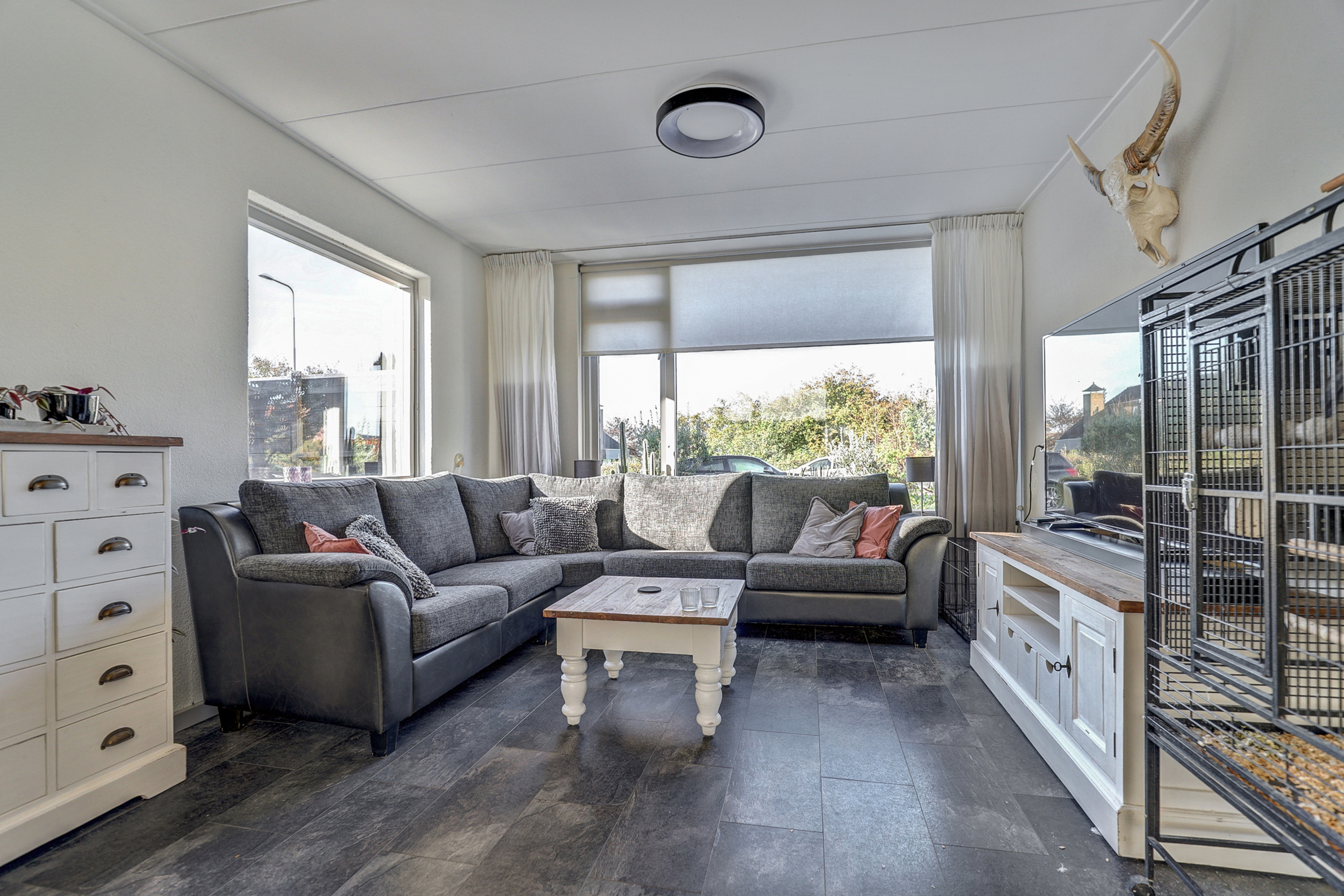 De lichte woonkamer aan de voorzijde is een heerlijke leefruimte. Dankzij de grote raampartijen aan voor- en achterzijde stroomt er veel daglicht binnen. De strak gestucte witte wanden zorgen voor een moderne, rustige basis. Blikvanger is de pellet kachel, die niet alleen warmte, maar ook extra sfeer brengt tijdens koude dagen!
