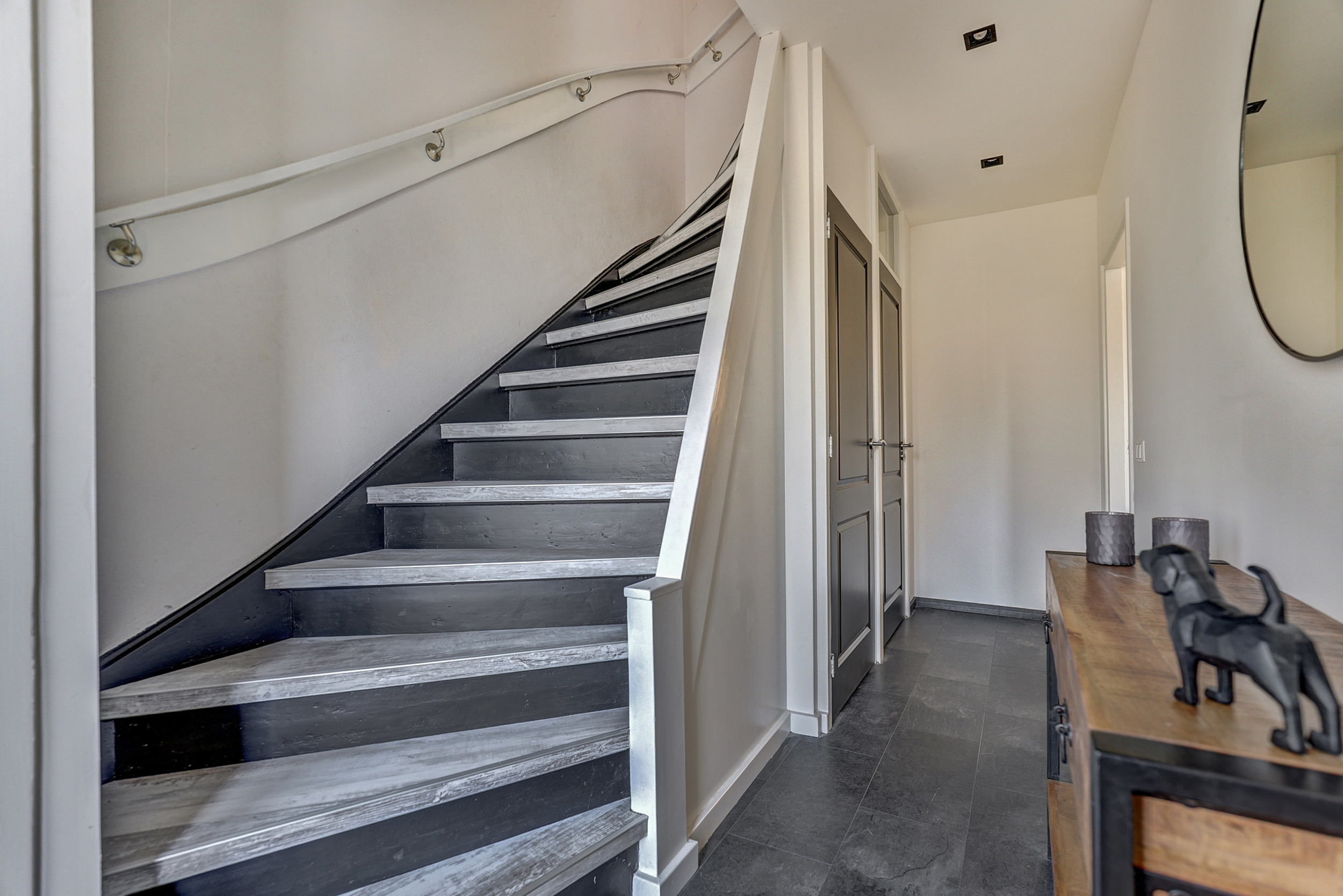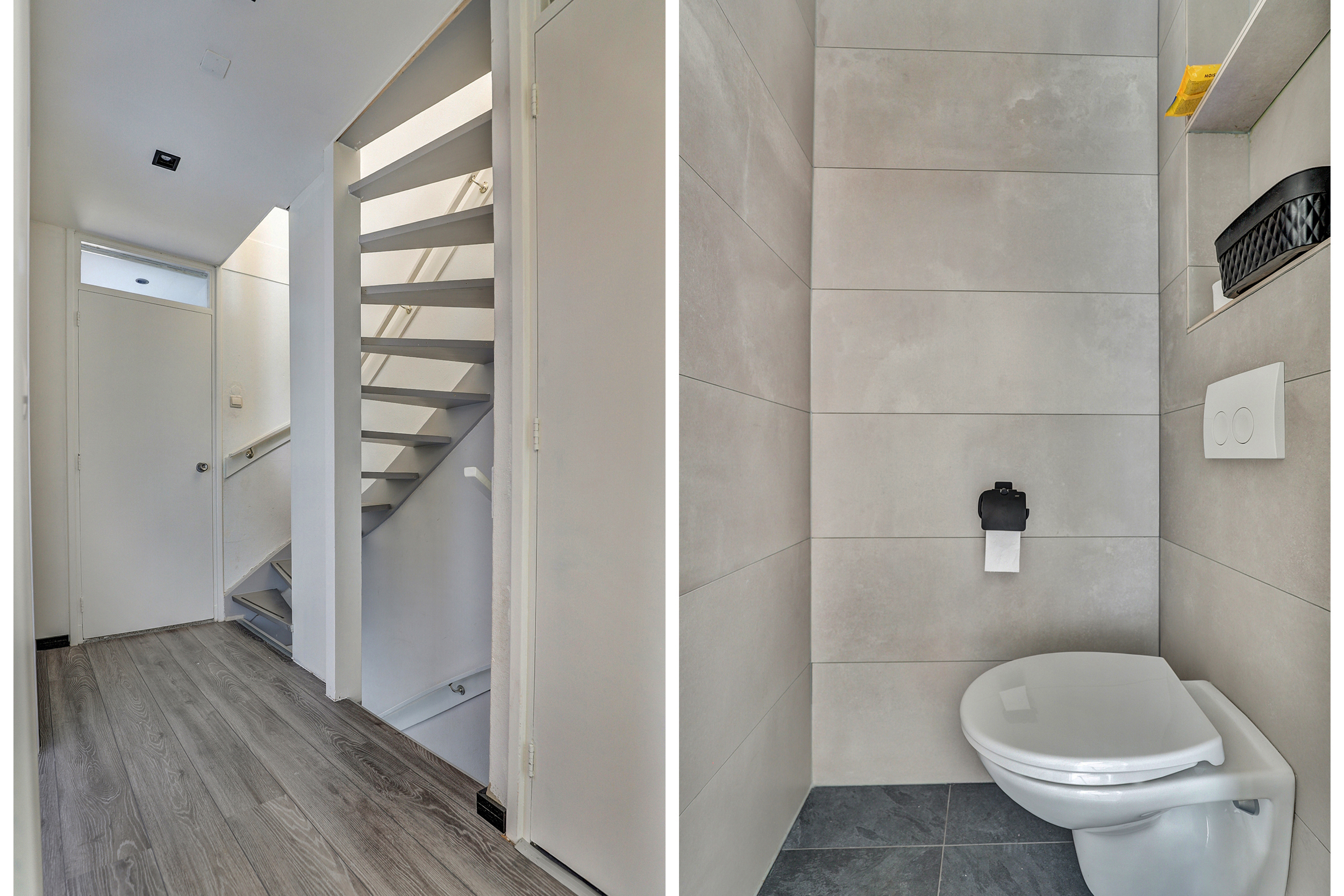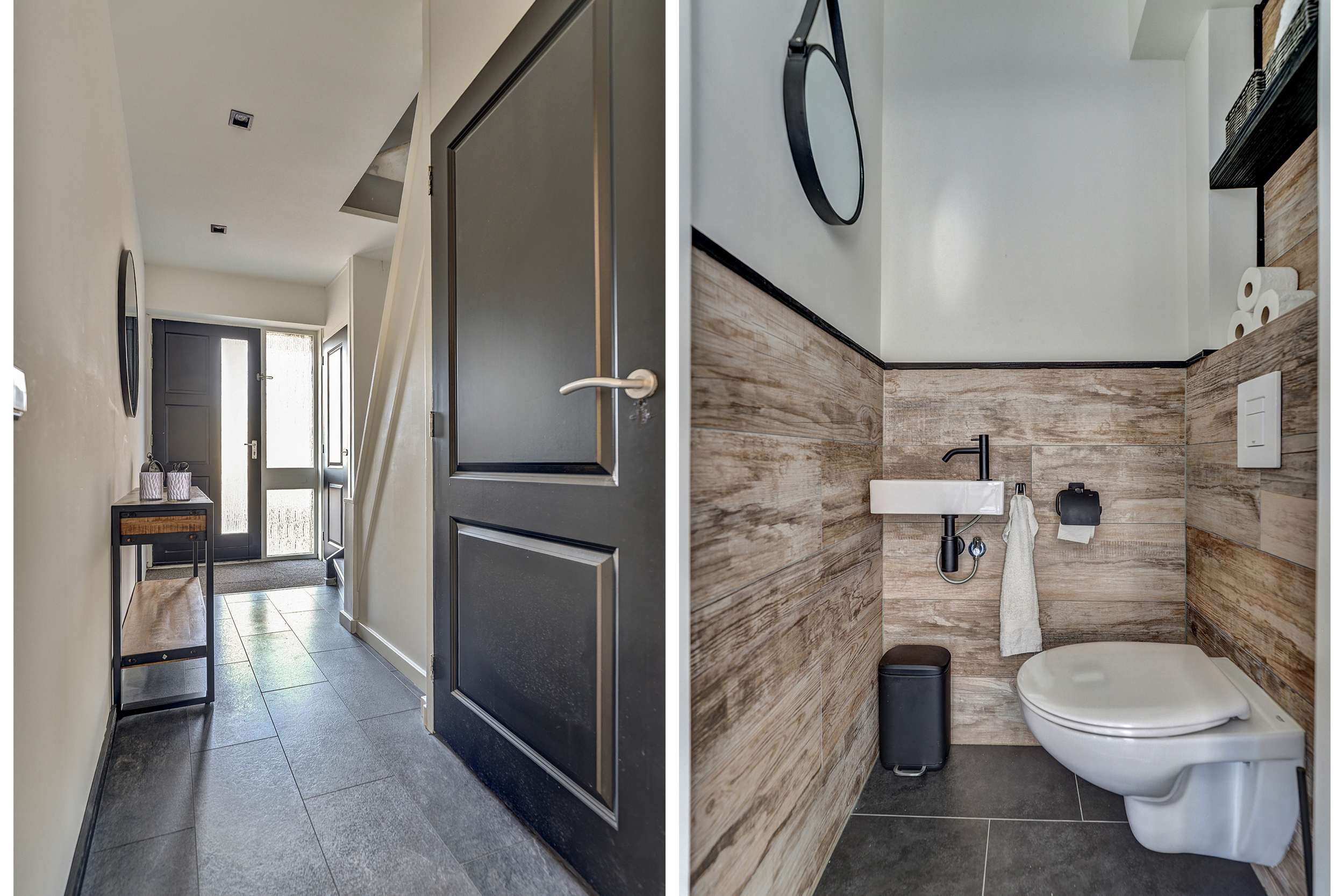 U betreedt de woning via de nette voortuin met oprit, waar ruimte is voor meerdere auto’s. De entreehal biedt toegang tot het toilet, de meterkast en de trapopgang.