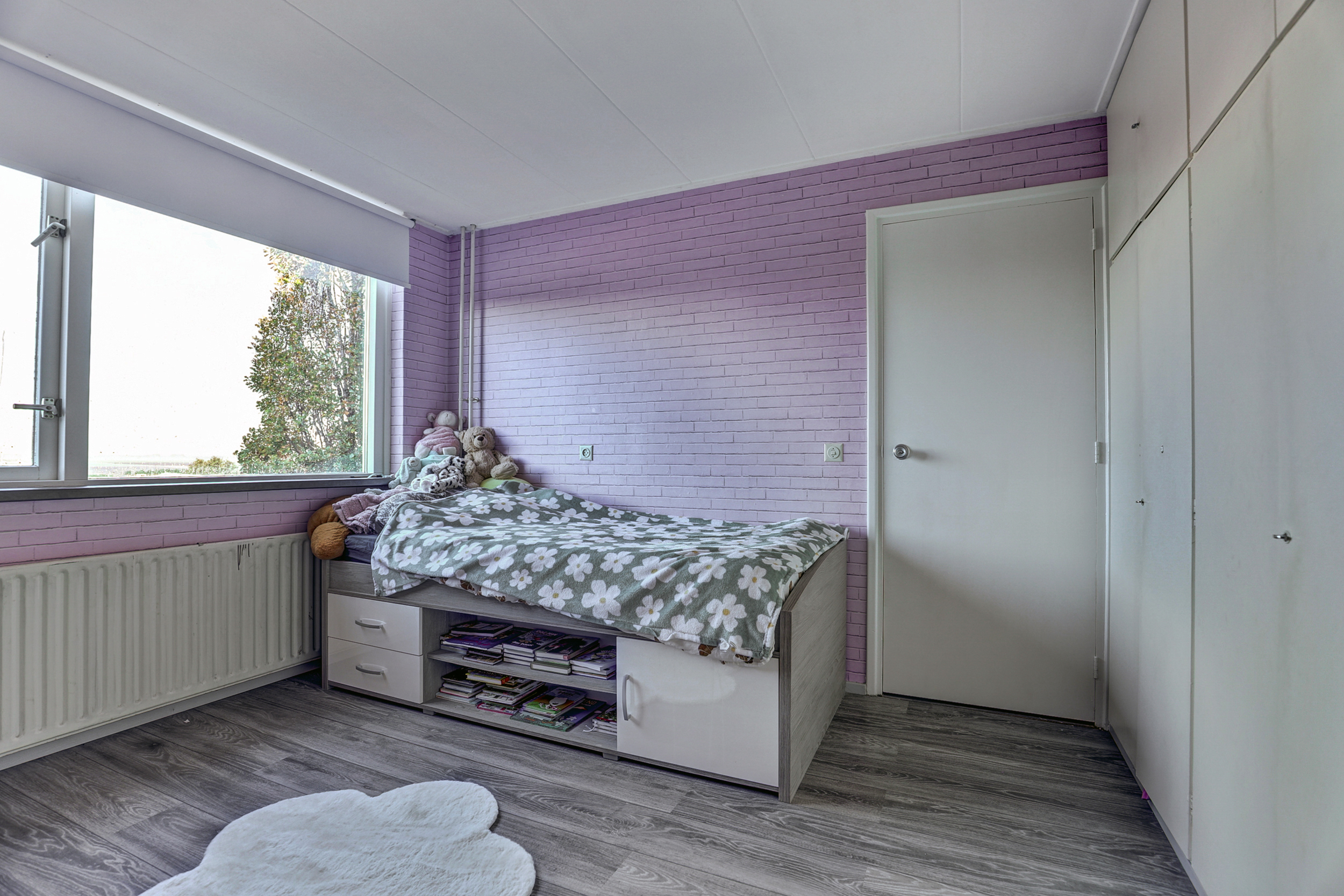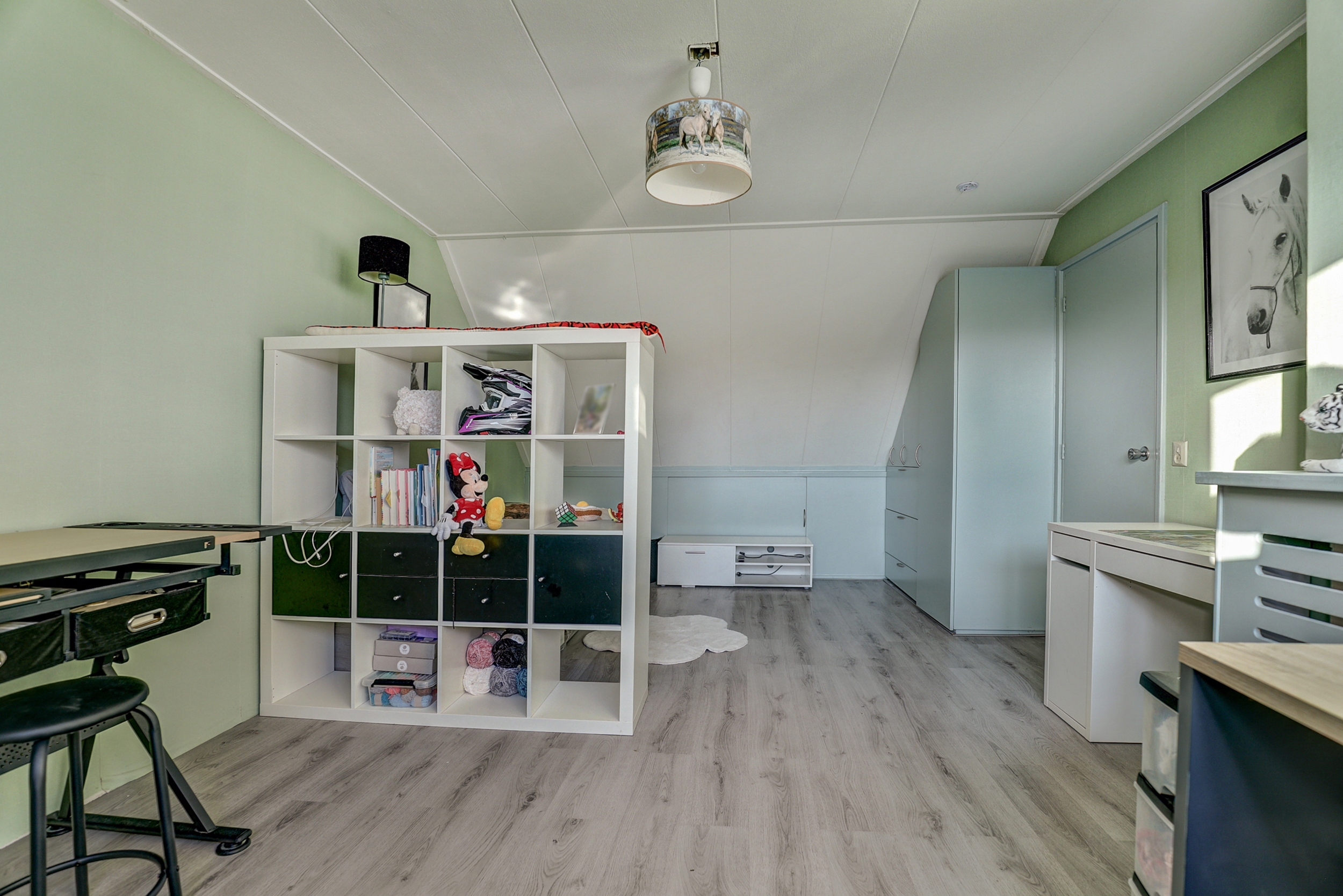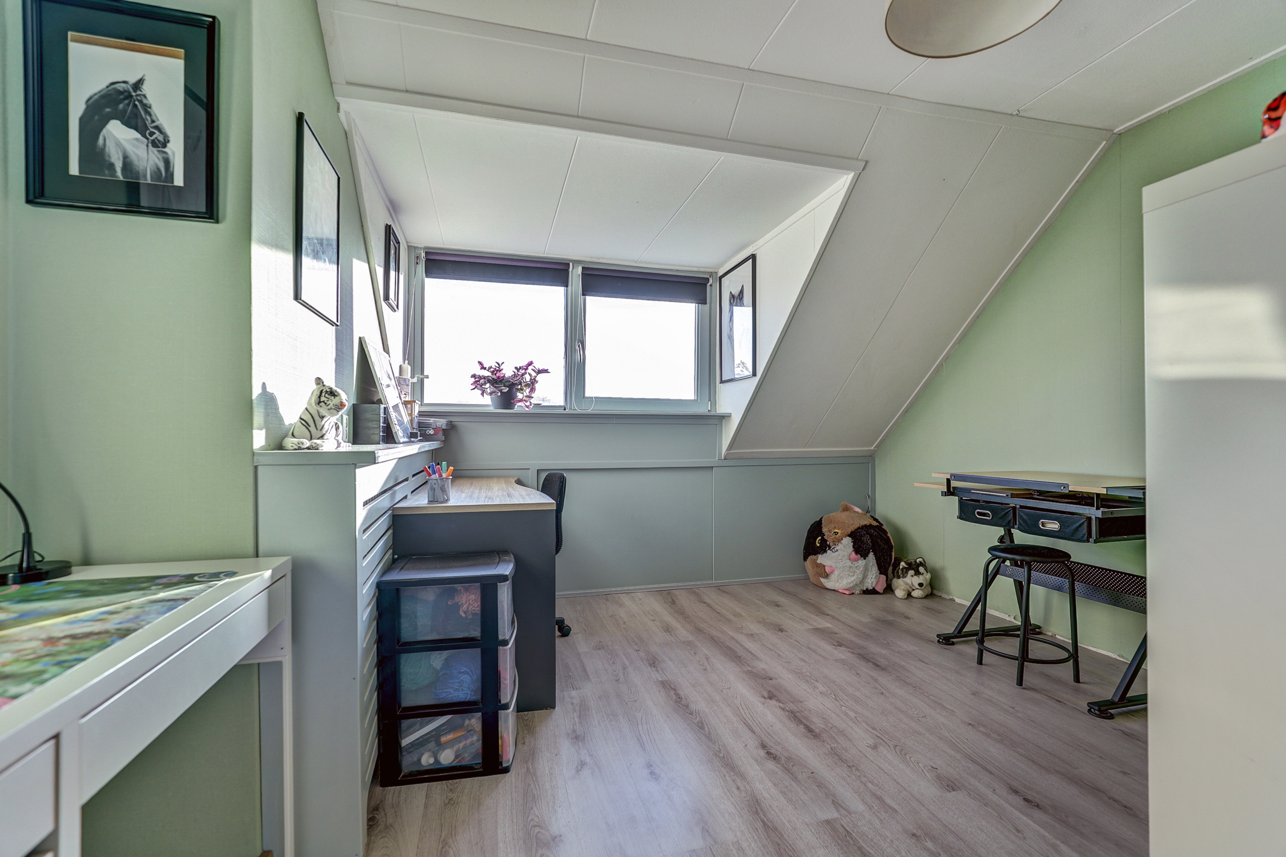 De tweede verdieping is verrassend ruim. Hier vindt u een derde ruime slaapkamer met veel daglicht dankzij de grote dakkapel aan de achterzijde. Deze kamer is afgewerkt in een zachte groentint, met een lichte laminaatvloer en strak afgewerkte wanden, ideaal als kinderkamer of thuiswerkplek. De kamer beschikt over vaste kasten onder de schuine dakdelen, ideaal voor kleding of seizoensopslag. Op de voorzolder bevindt zich bovendien een grote bergkast, een dakraam en de cv-installatie, wat deze verdieping extra praktisch maakt.