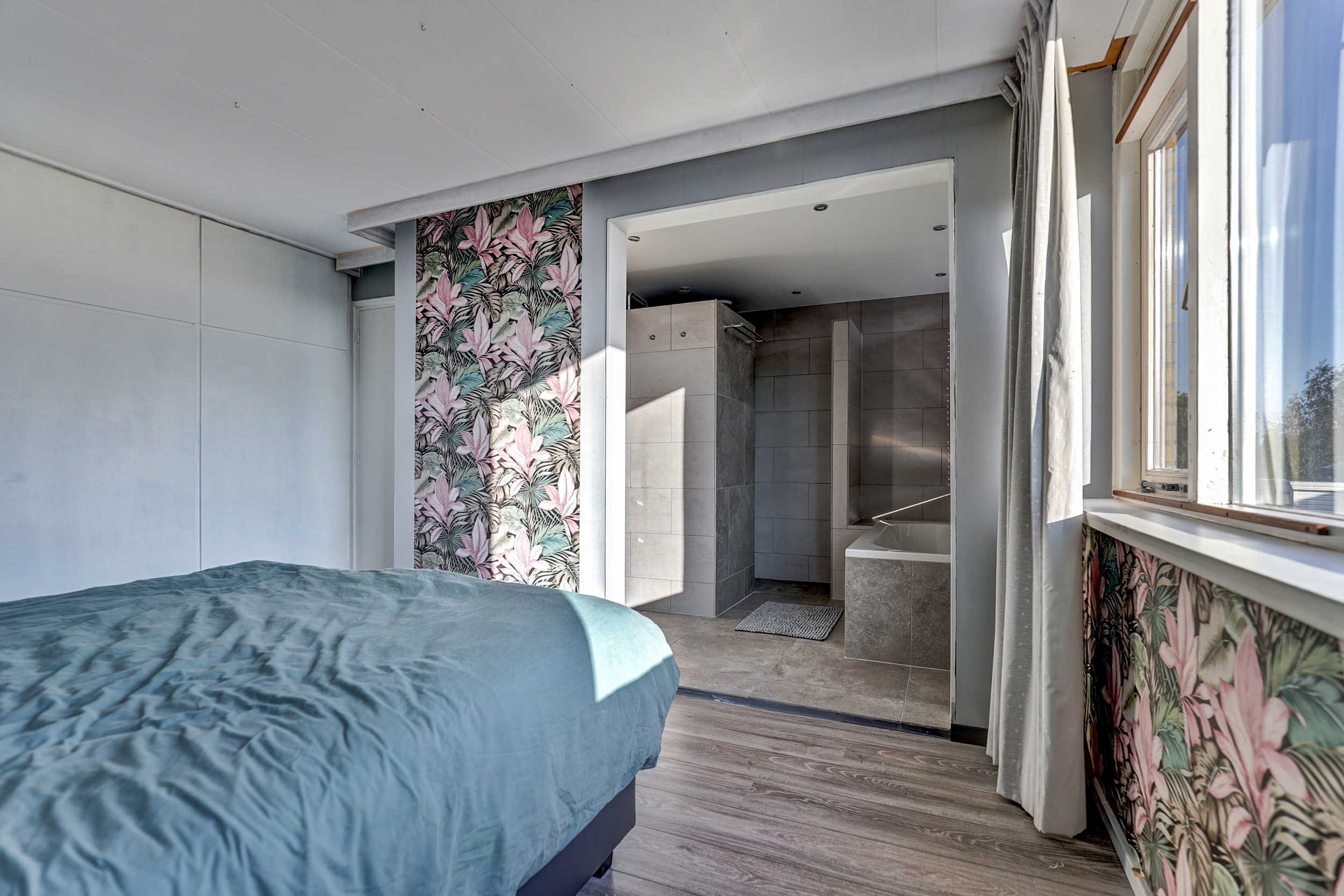 Op de eerste verdieping vindt u een ruime overloop met toegang tot twee slaapkamers, een badkamer en een separaat toilet. De hoofdslaapkamer is ruim en licht, met een groot raam aan de tuinzijde en beschikt over een badkamer en suite. Deze badkamer is luxe uitgevoerd met grote lichtgrijze tegels, een modern wastafelmeubel, een ligbad en een aparte inloopdouche. De andere slaapkamer aan de voorzijde heeft een prettige indeling en kan gebruikmaken van de badkamer op de overloop, die is voorzien van een inloopdouche met regendouche, een wastafelmeubel en een separaat tweede toilet.