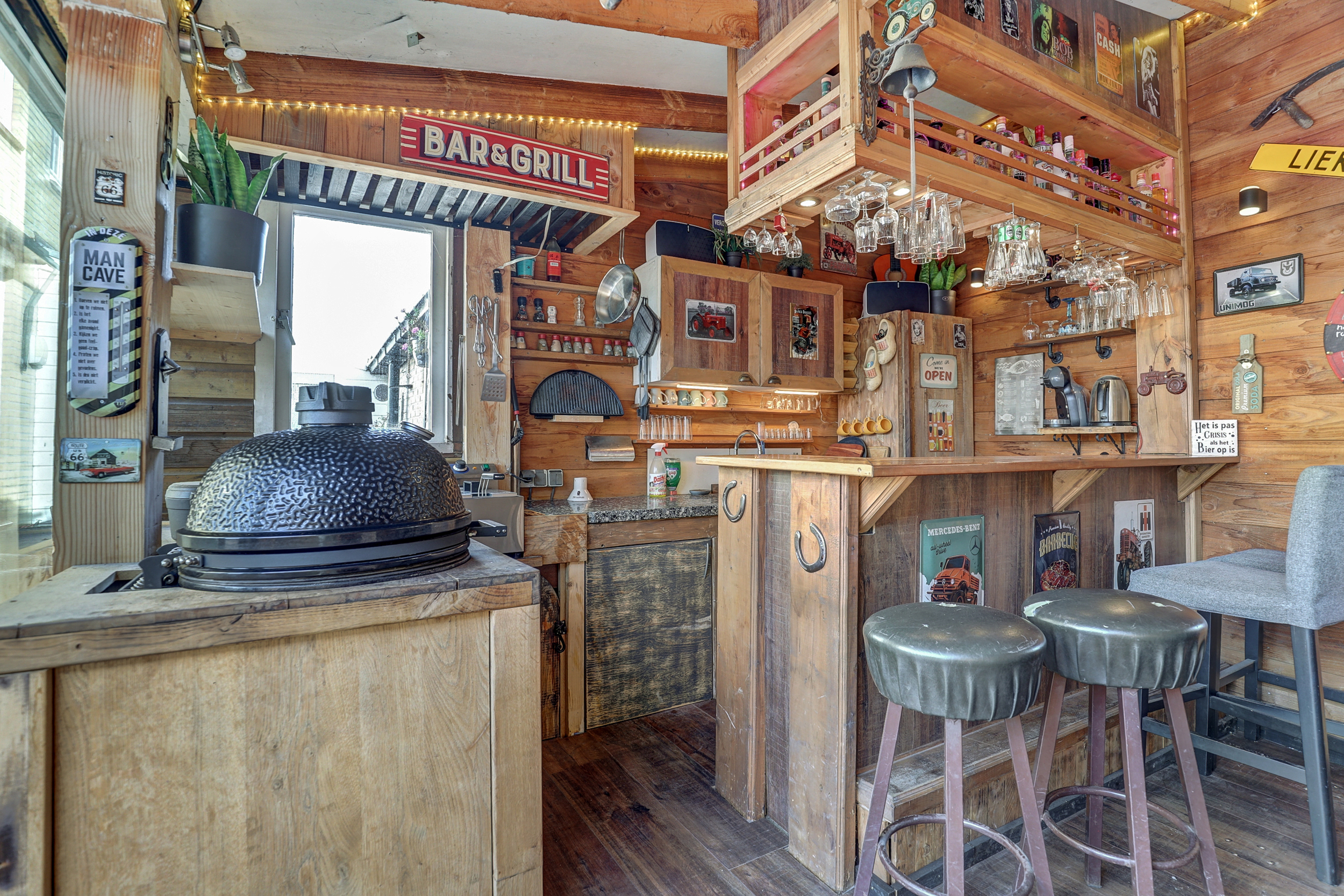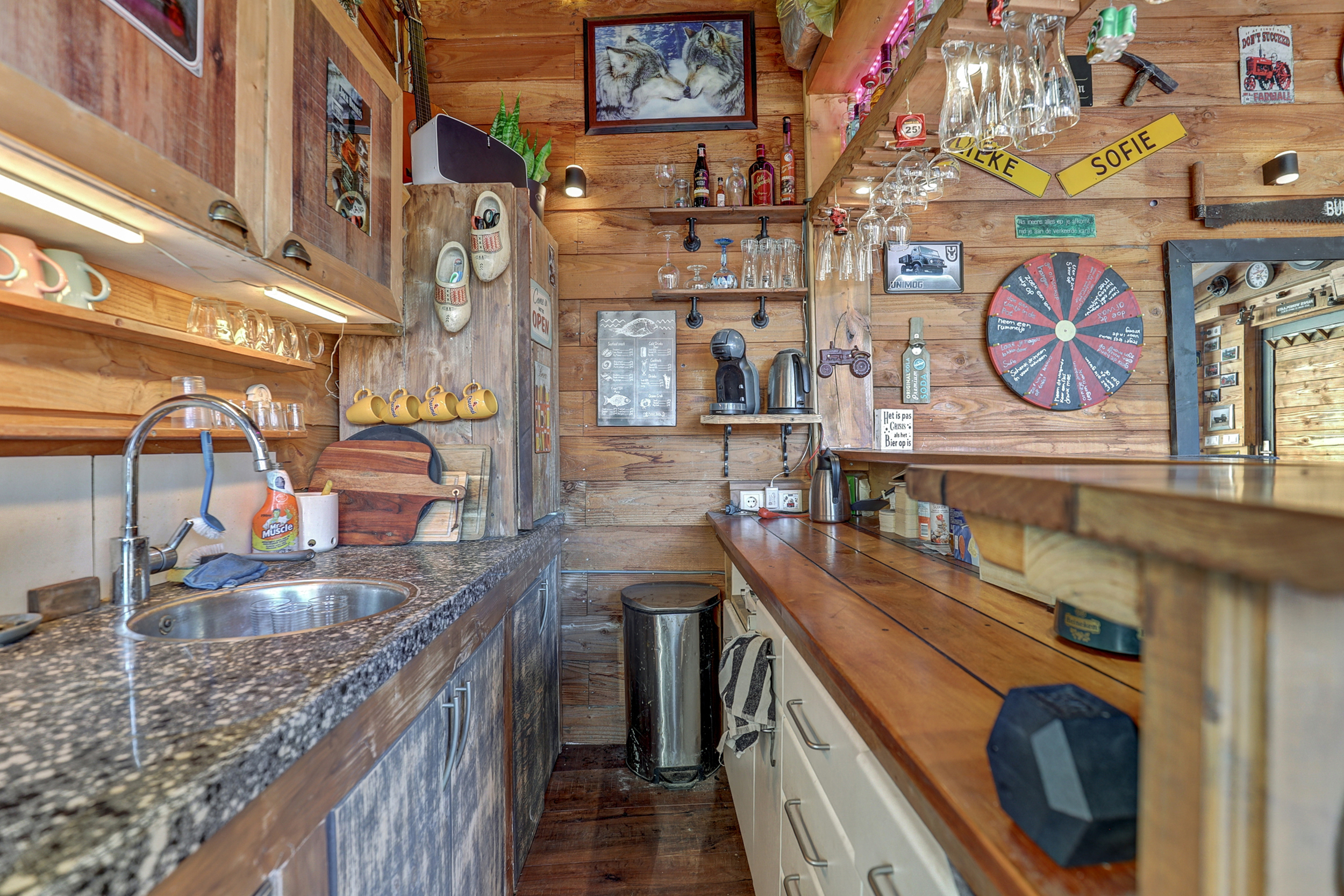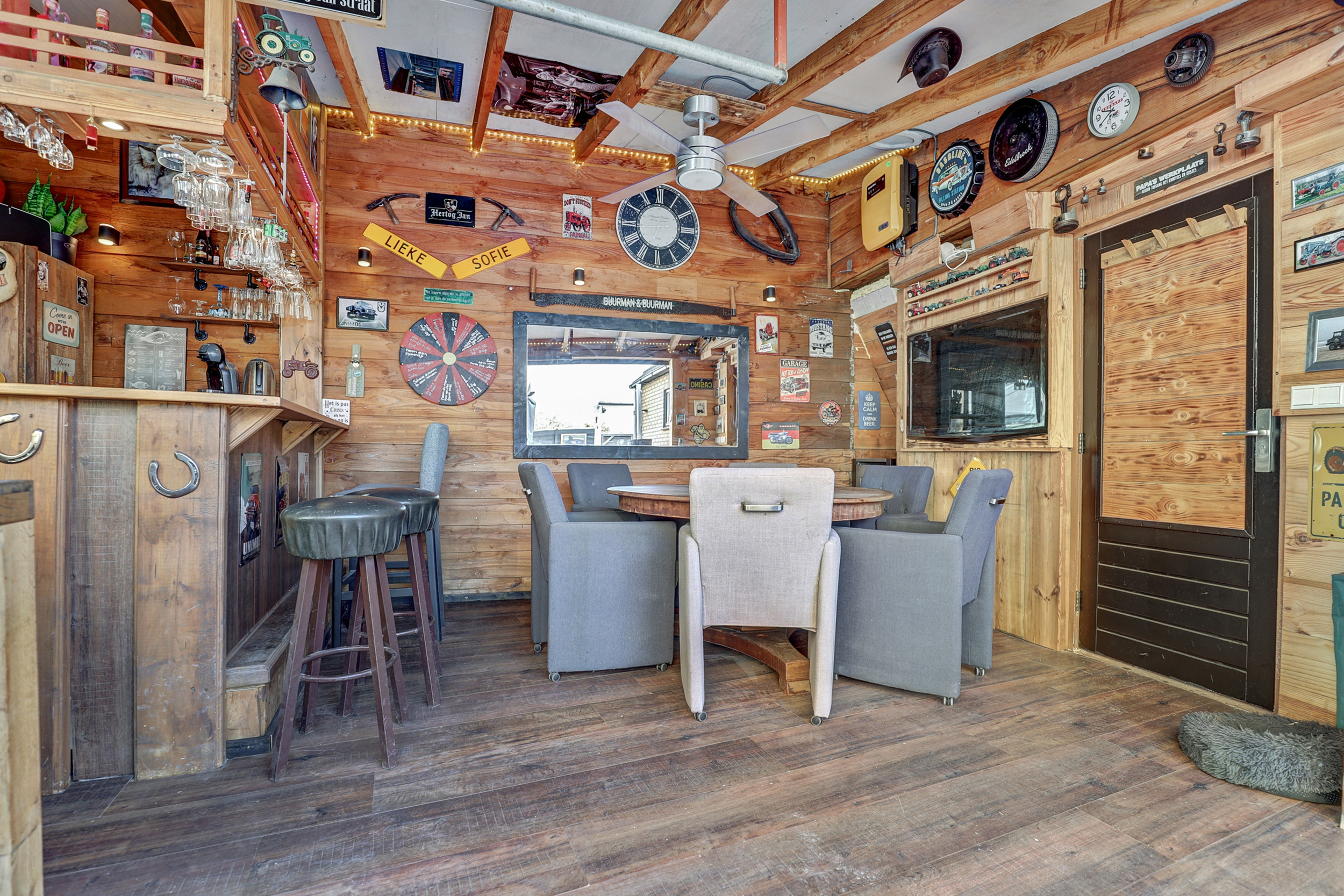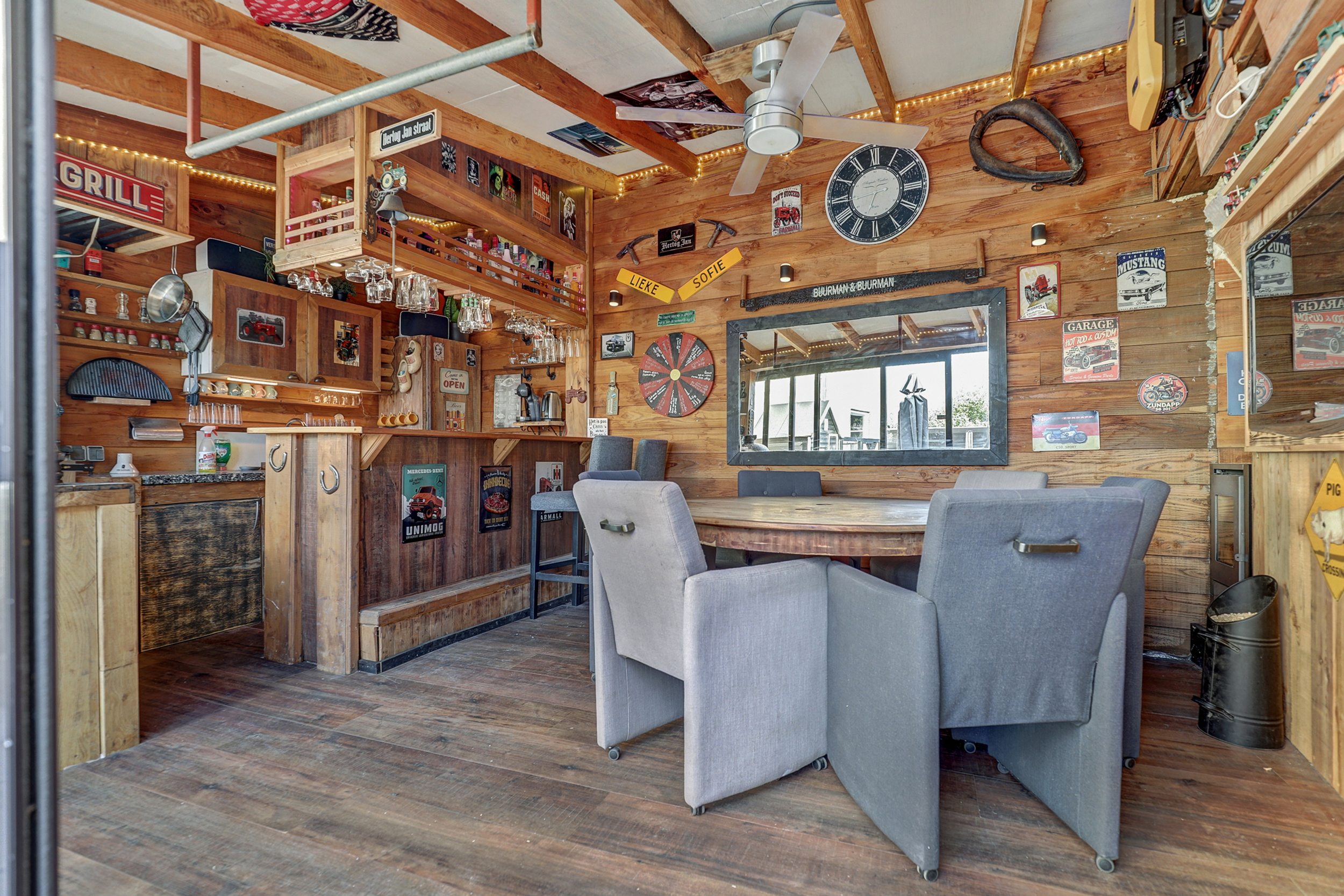 • Vrijstaande garage en houten berging/barruimte met gezellige inrichting