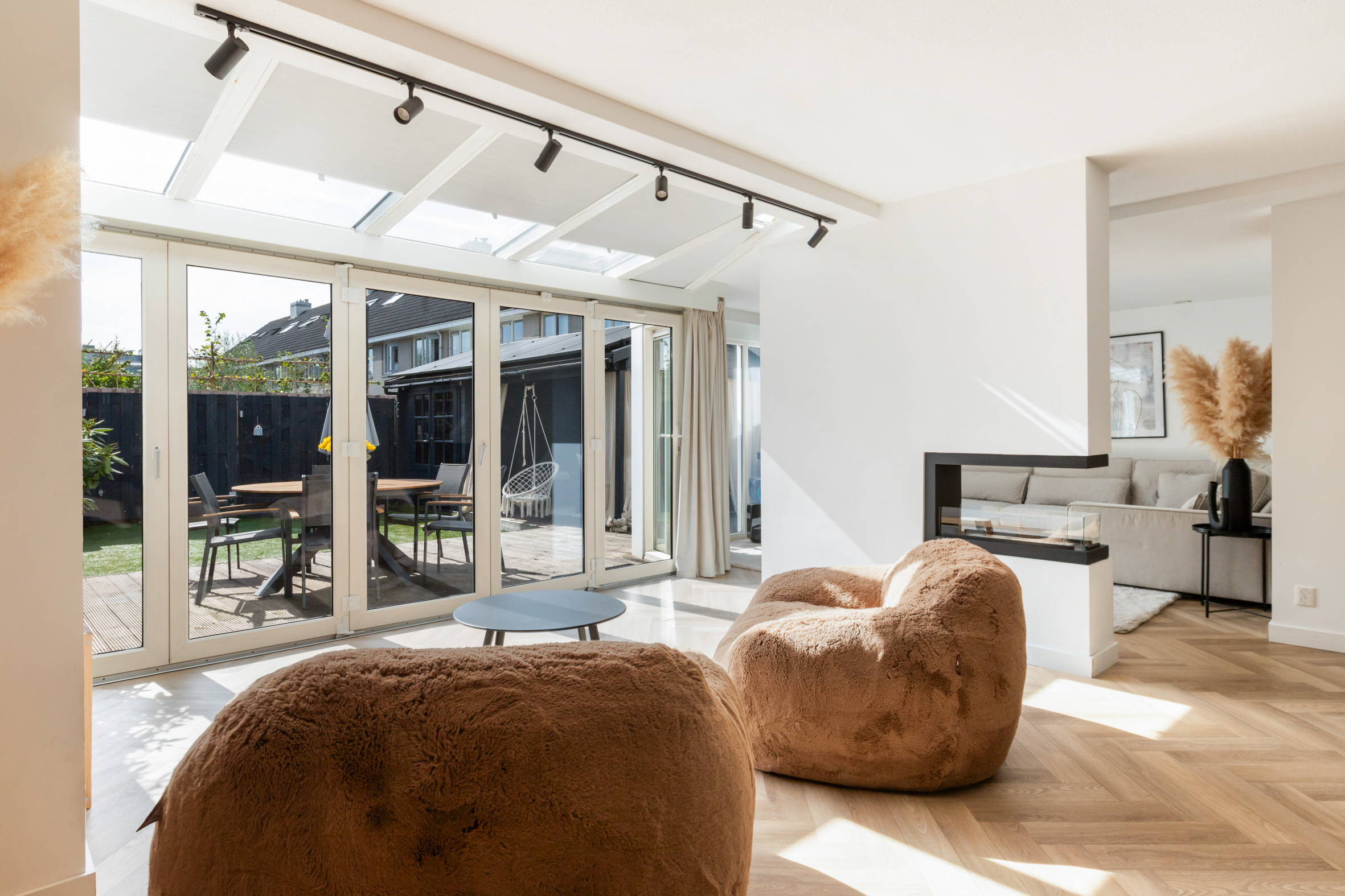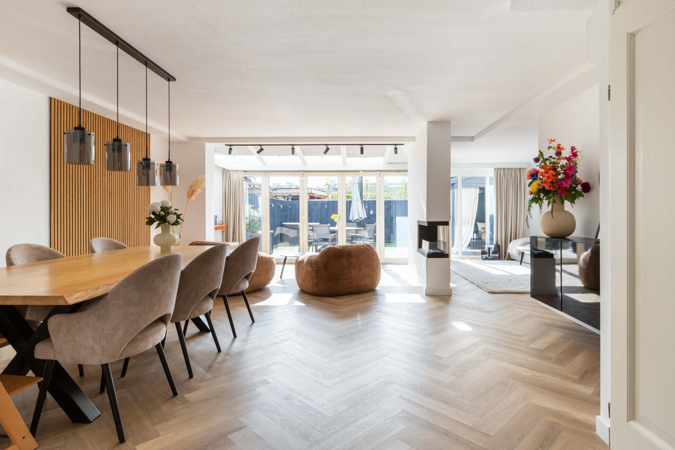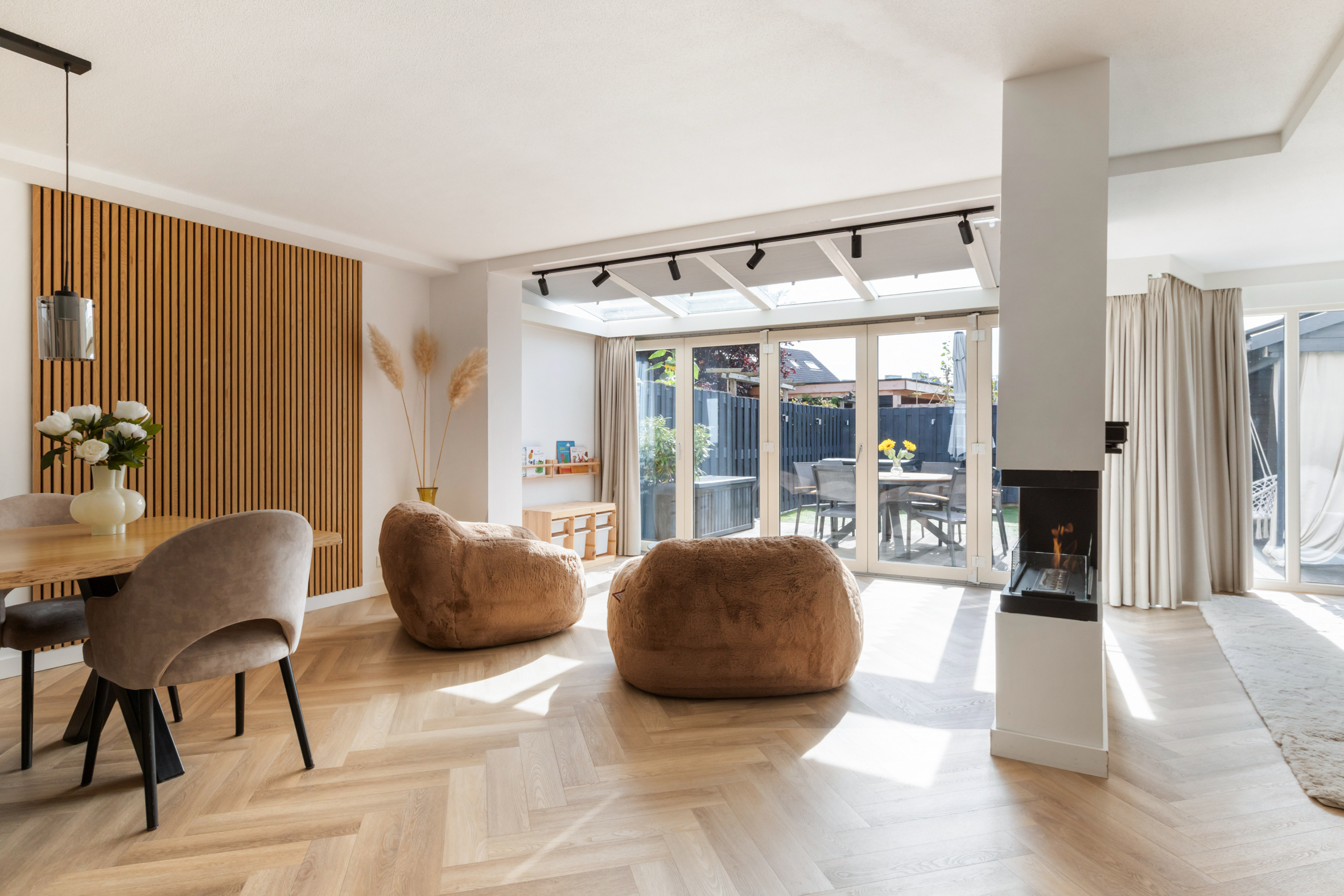 Royale uitgebouwde woonkamer met veel lichtinval en een sfeervolle haard. Door de praktische indeling en serre kunt u meerdere zit- en eetgedeeltes maken, waardoor de