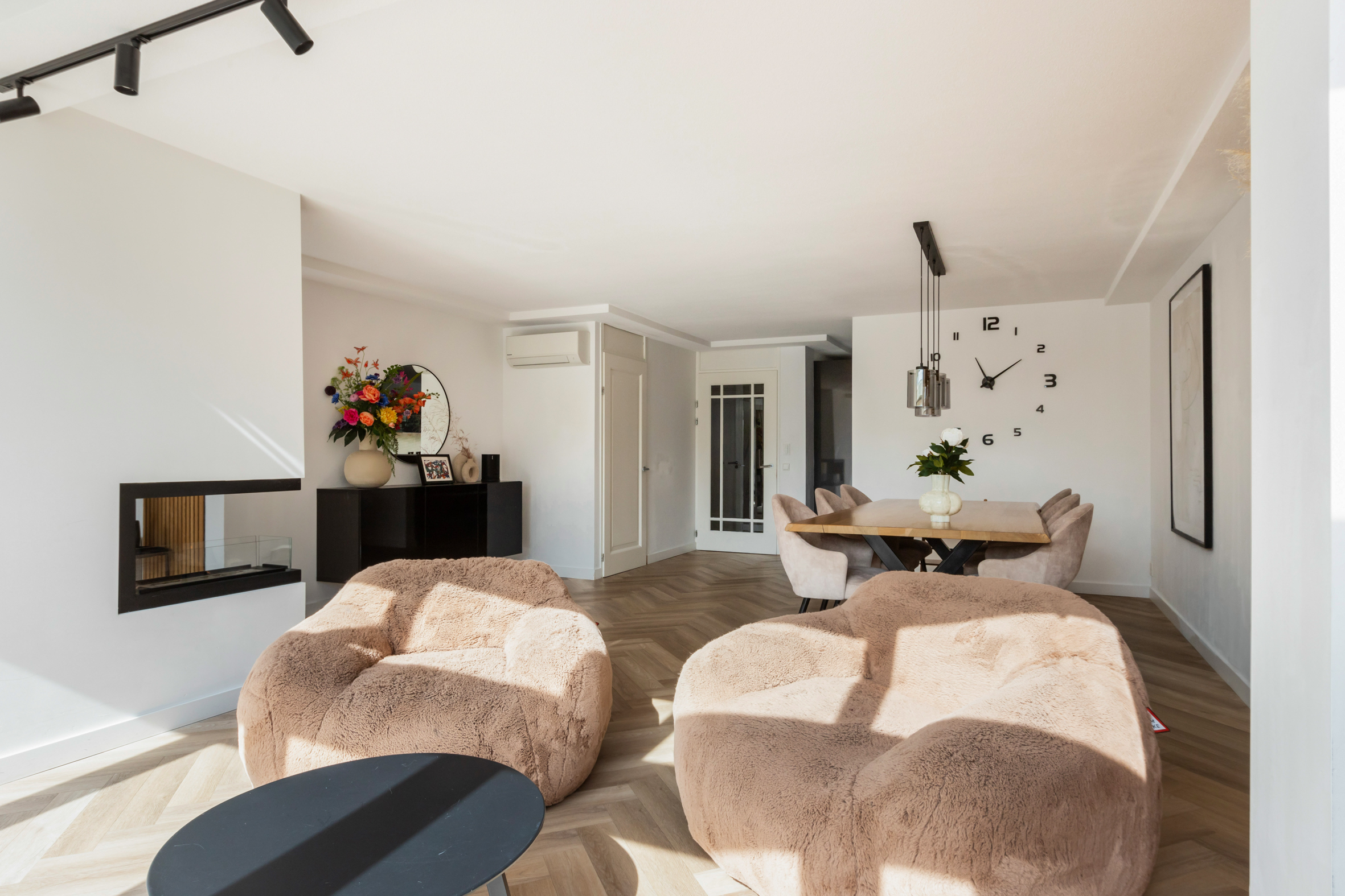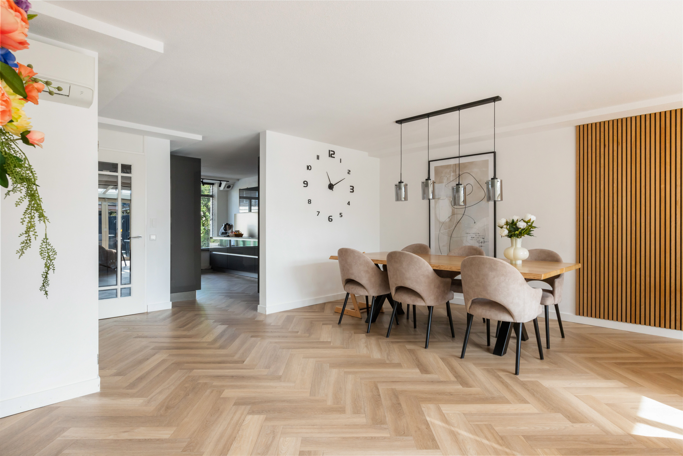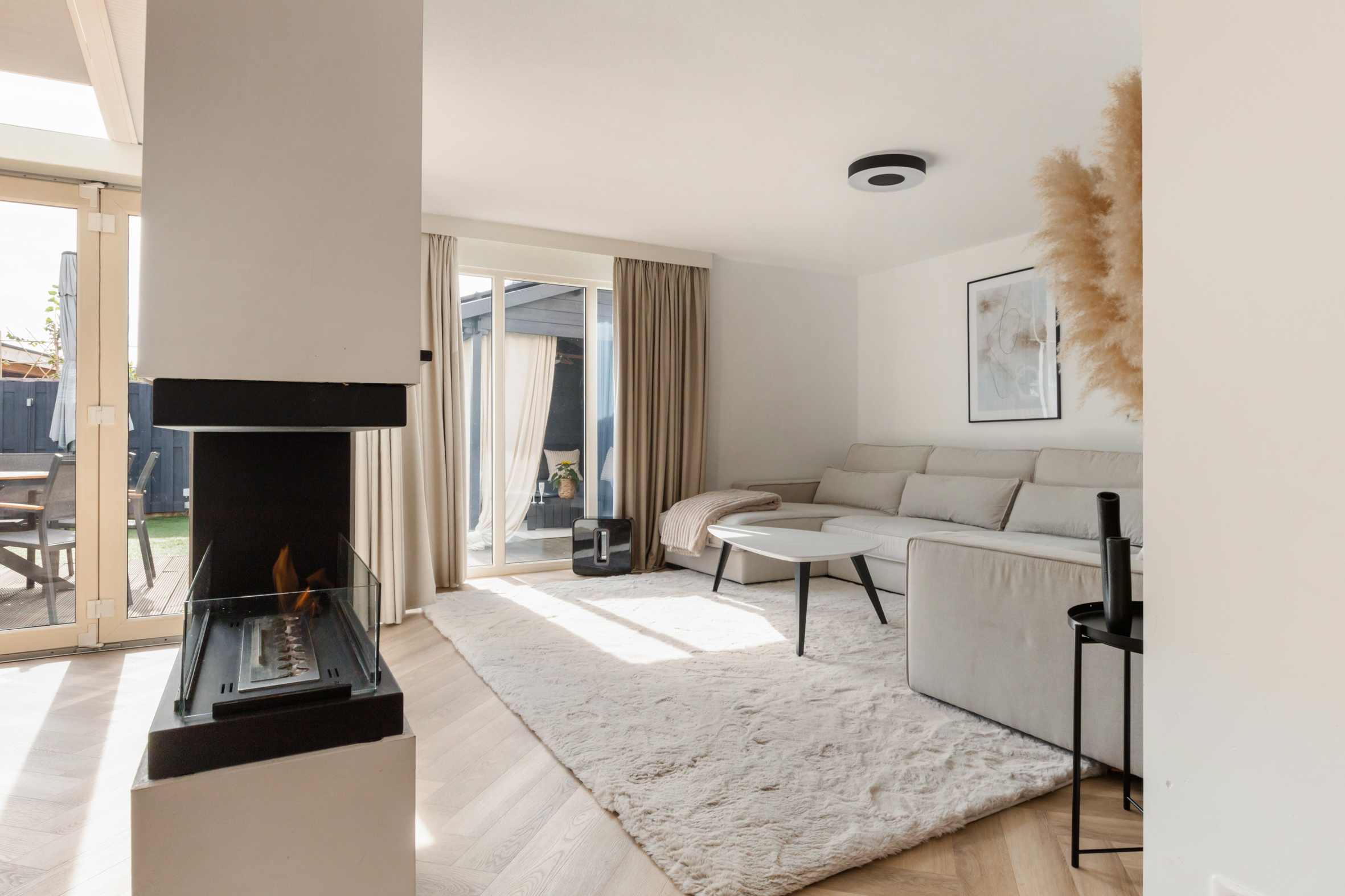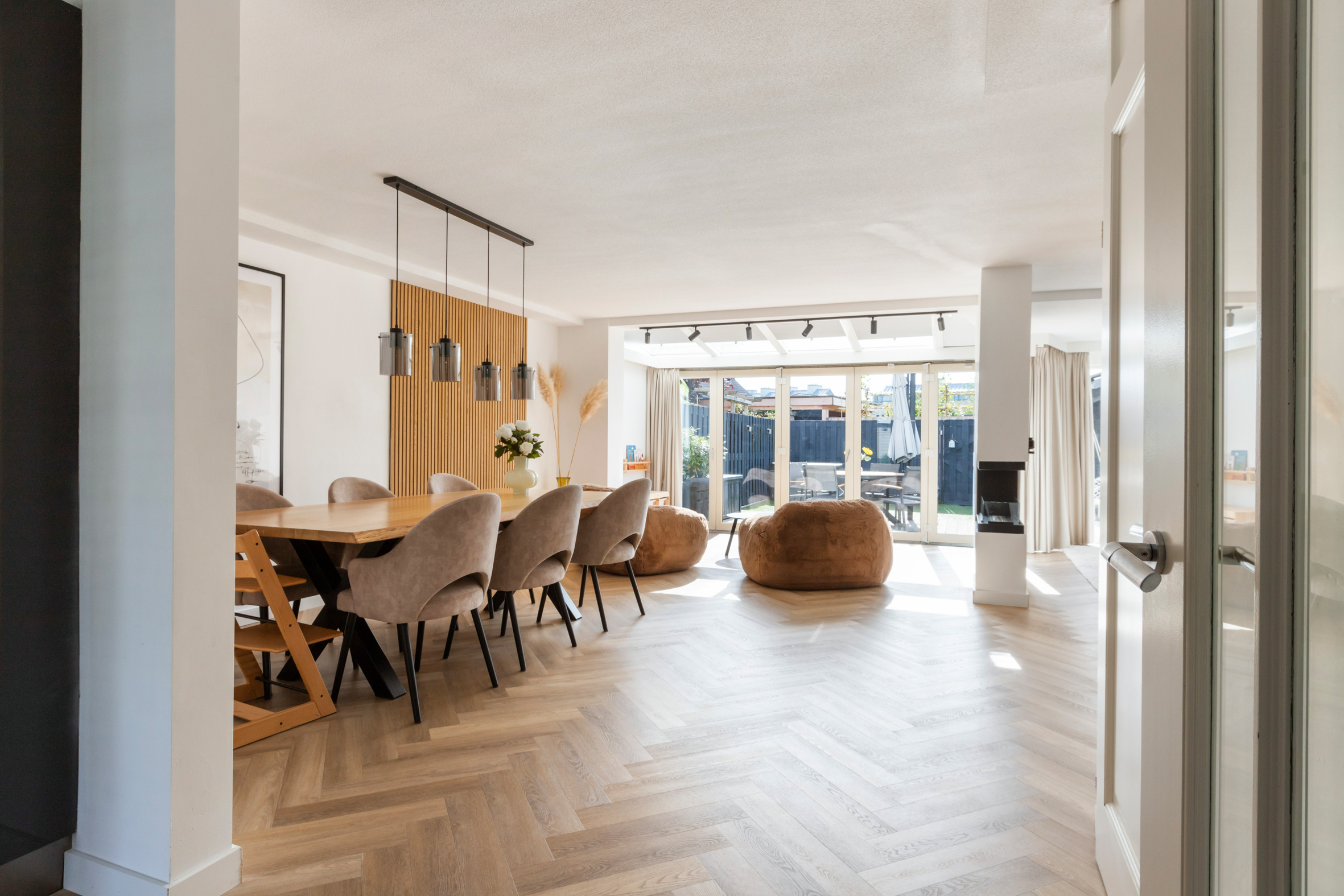 Royale uitgebouwde woonkamer met veel lichtinval en een sfeervolle haard. Door de praktische indeling en serre kunt u meerdere zit- en eetgedeeltes maken, waardoor de