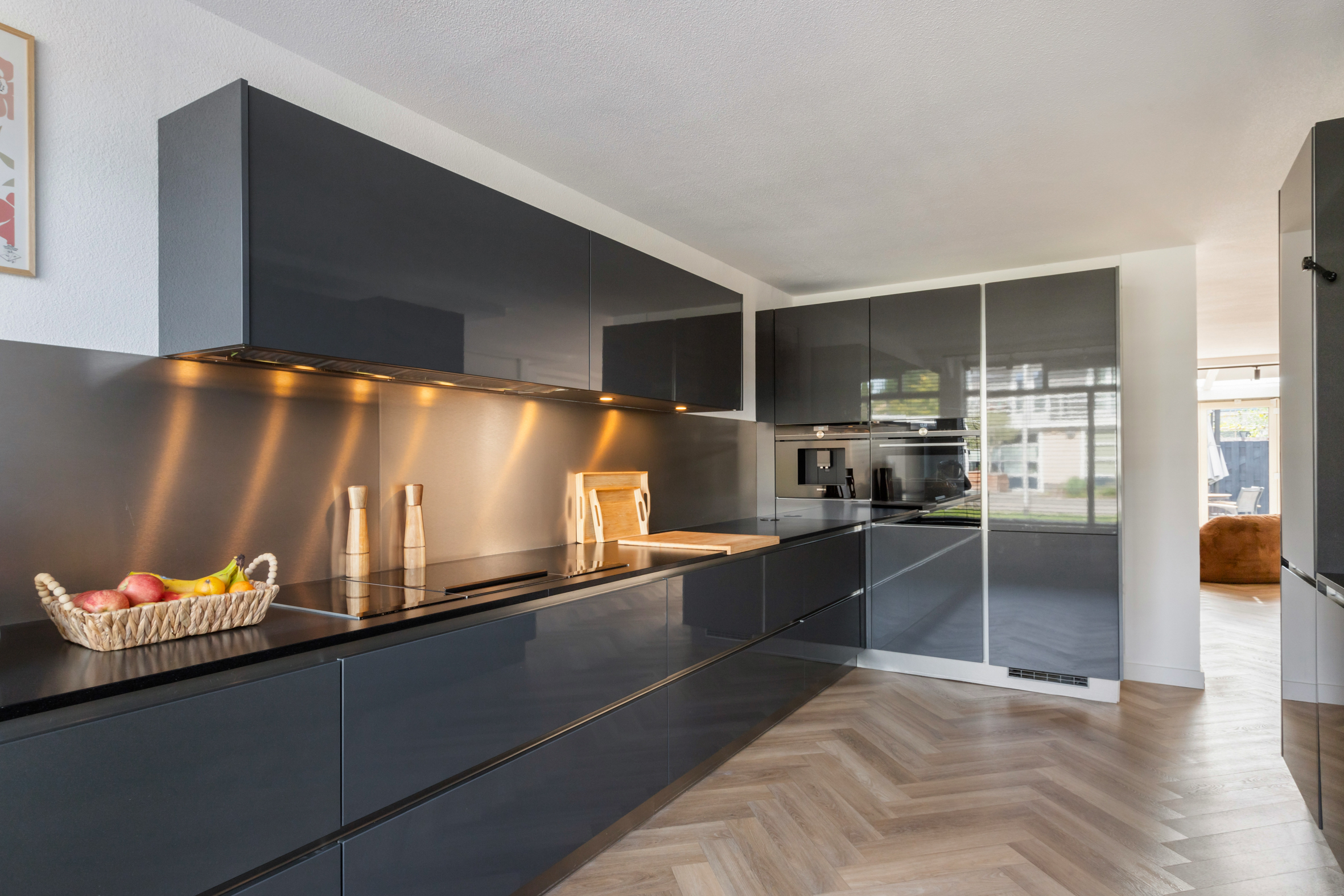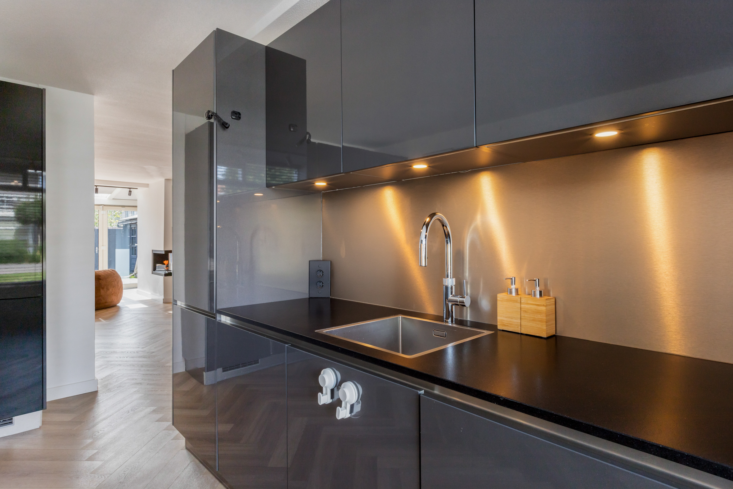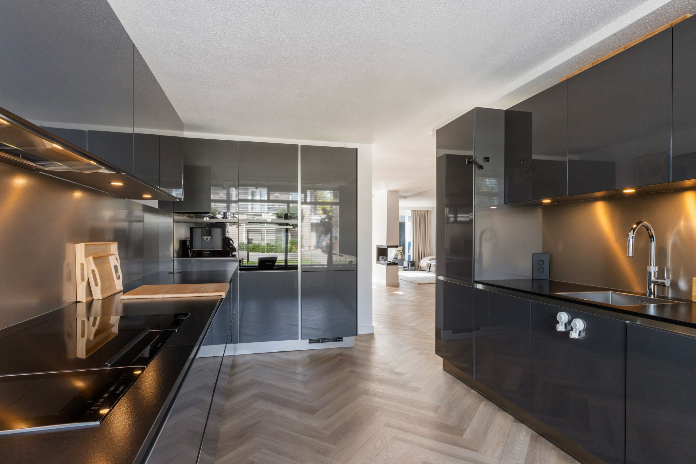De moderne keuken is gelegen aan de voorzijde van de woning en biedt bijzonder veel kastruimte en luxe siemens apparatuur, waaronder twee inductiekookplaten, een Tepan-Yaki bakplaat, vaatwasser, afzuigkap, koffiemachine, stoomoven en koel/vriescombinatie.