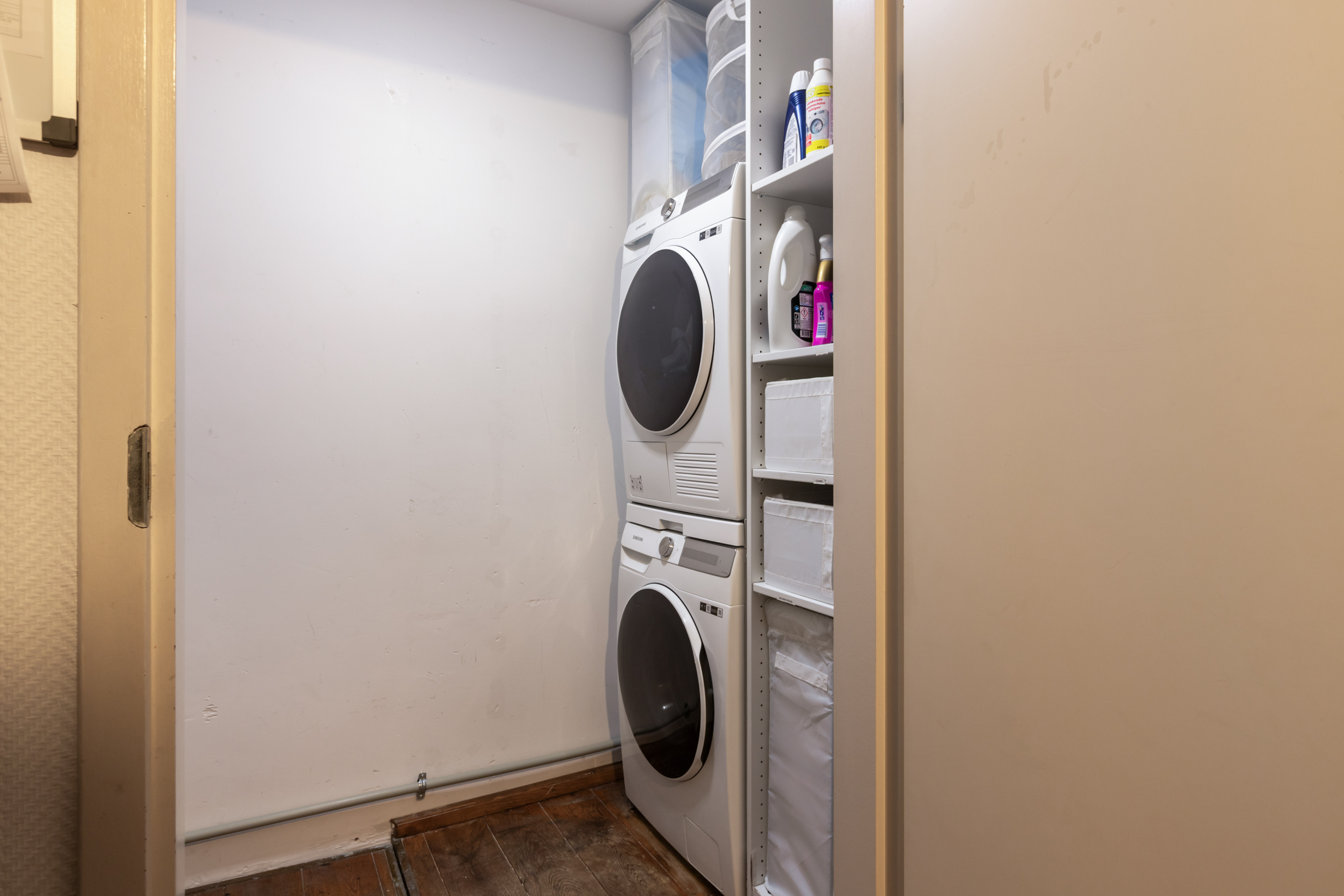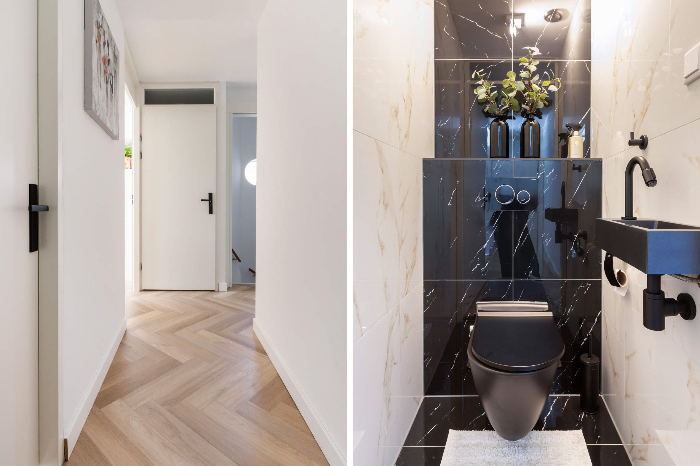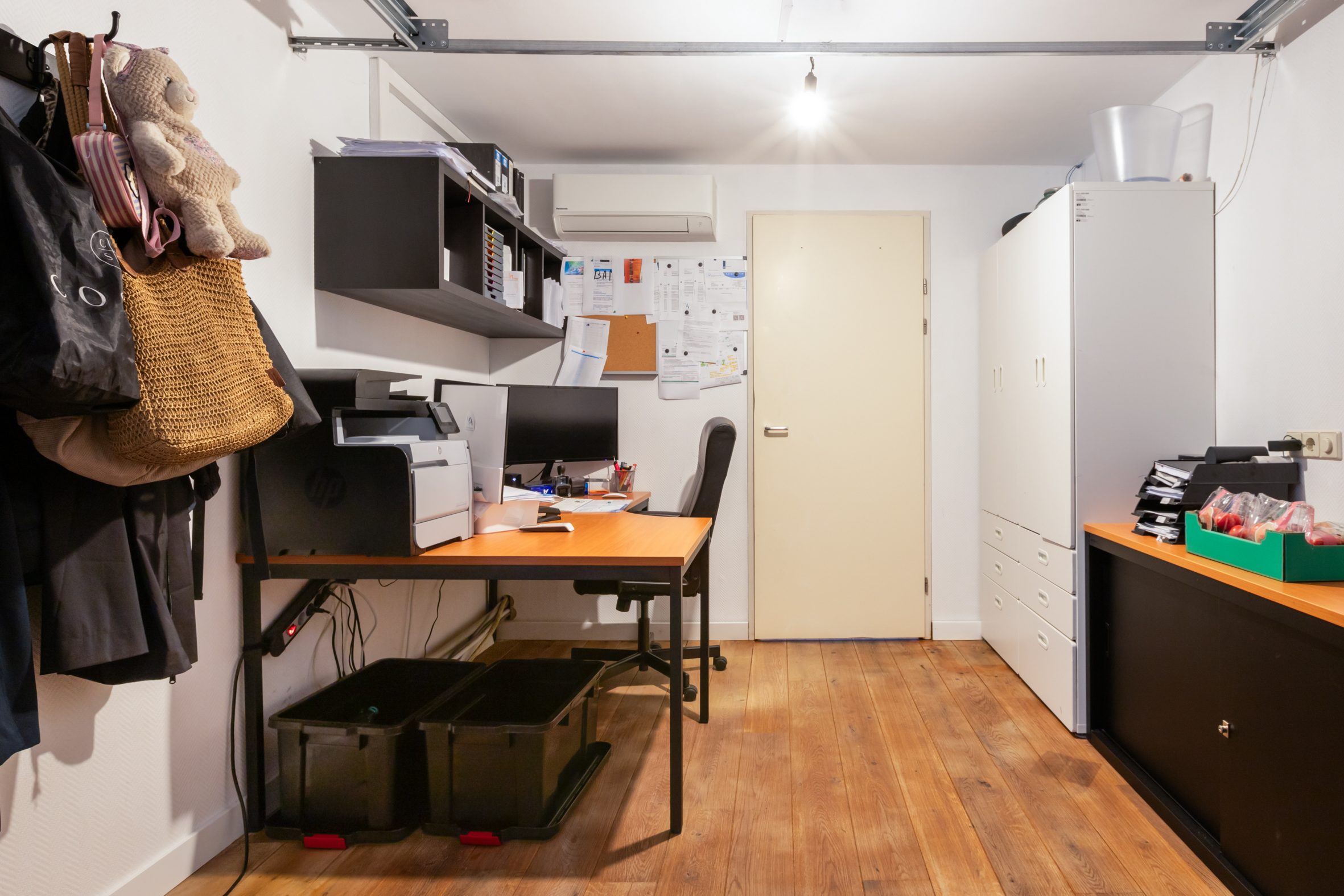 Royale hal met meterkast, fraai betegelde toilet met fonteintje. Toegang tot de voormalige garage alwaar momenteel een fijne werk/slaapruimte gecreëerd is, met een doorloop naar de technische ruimte met opstelplaats warmtepomp en aansluiting voor de was apparatuur.