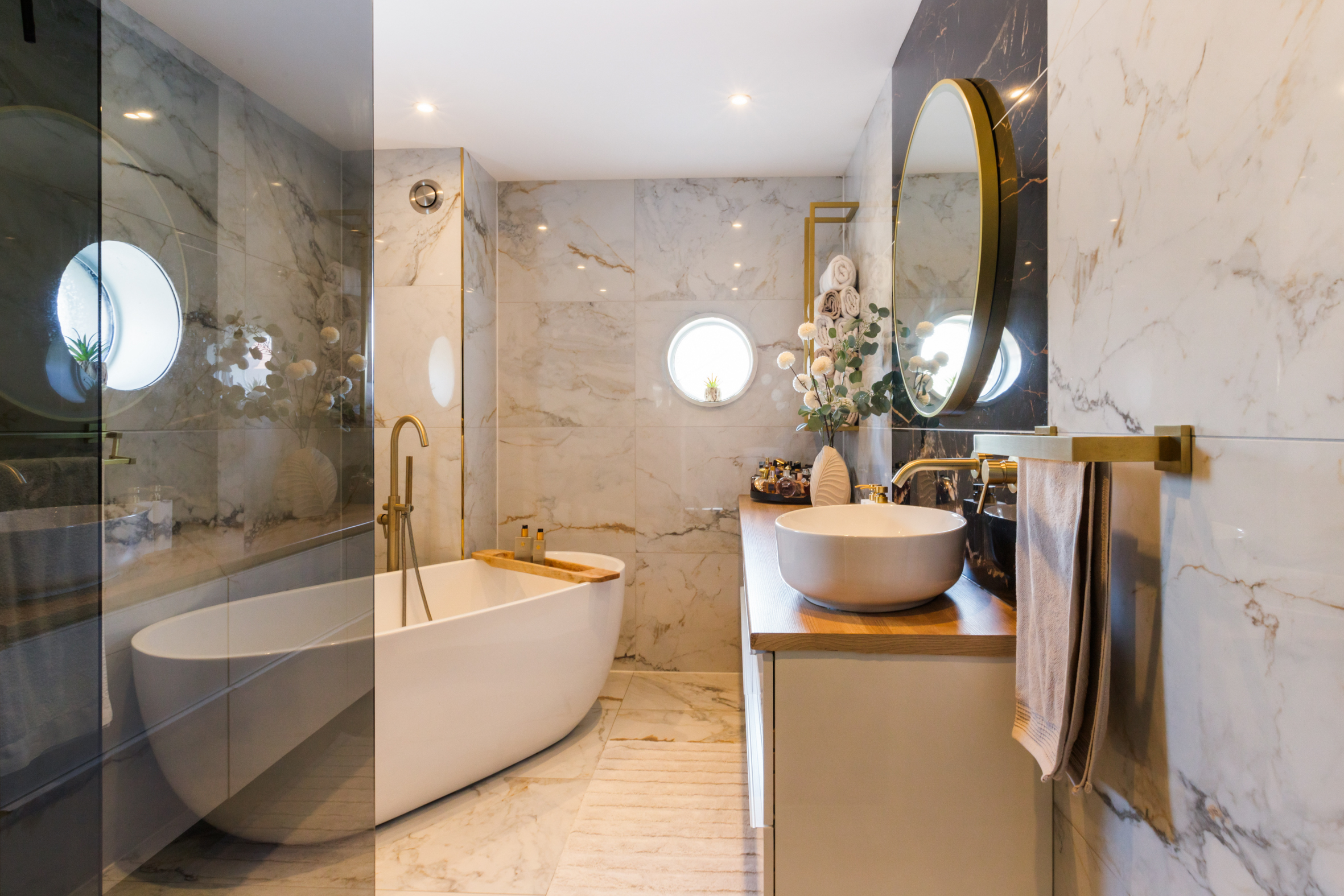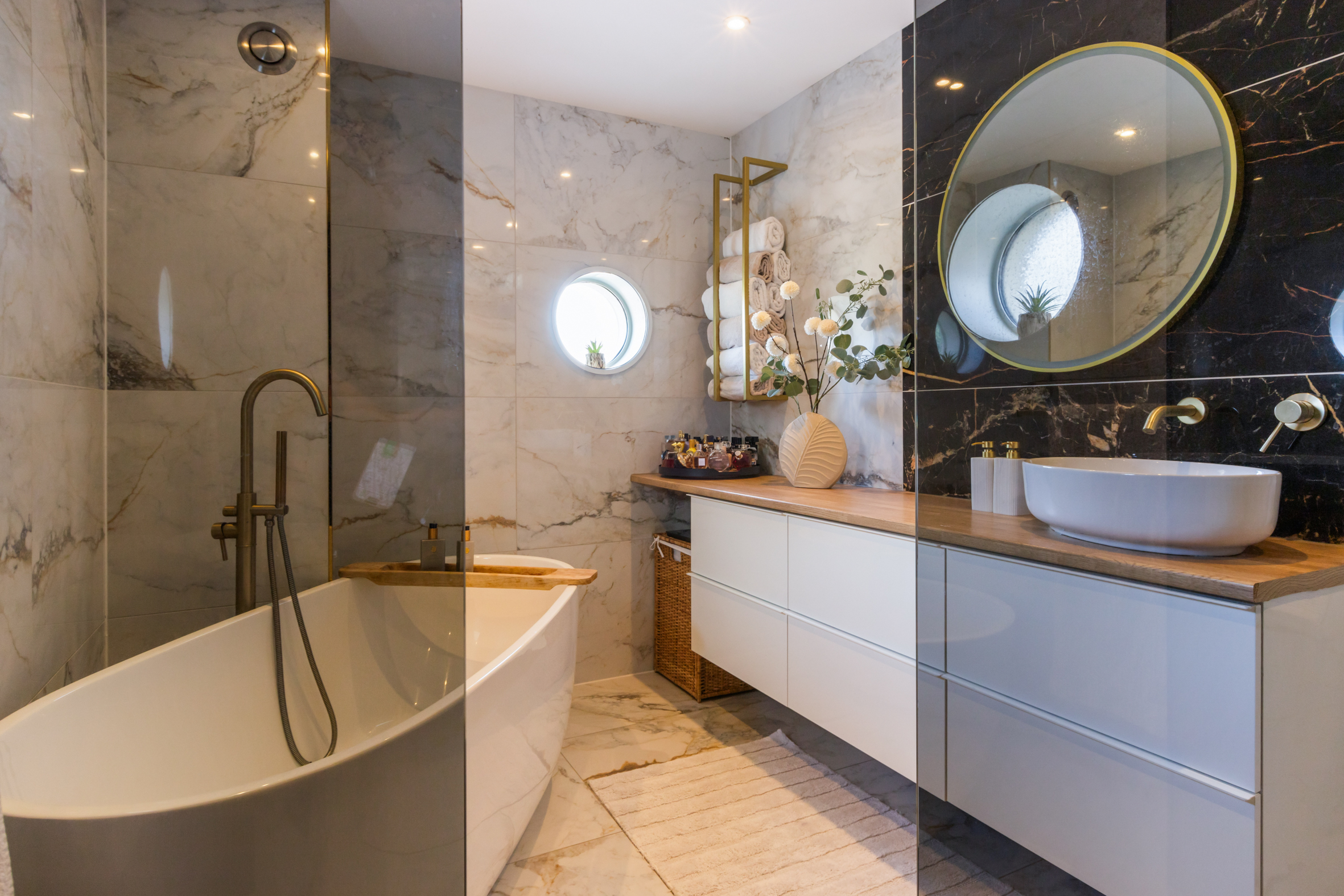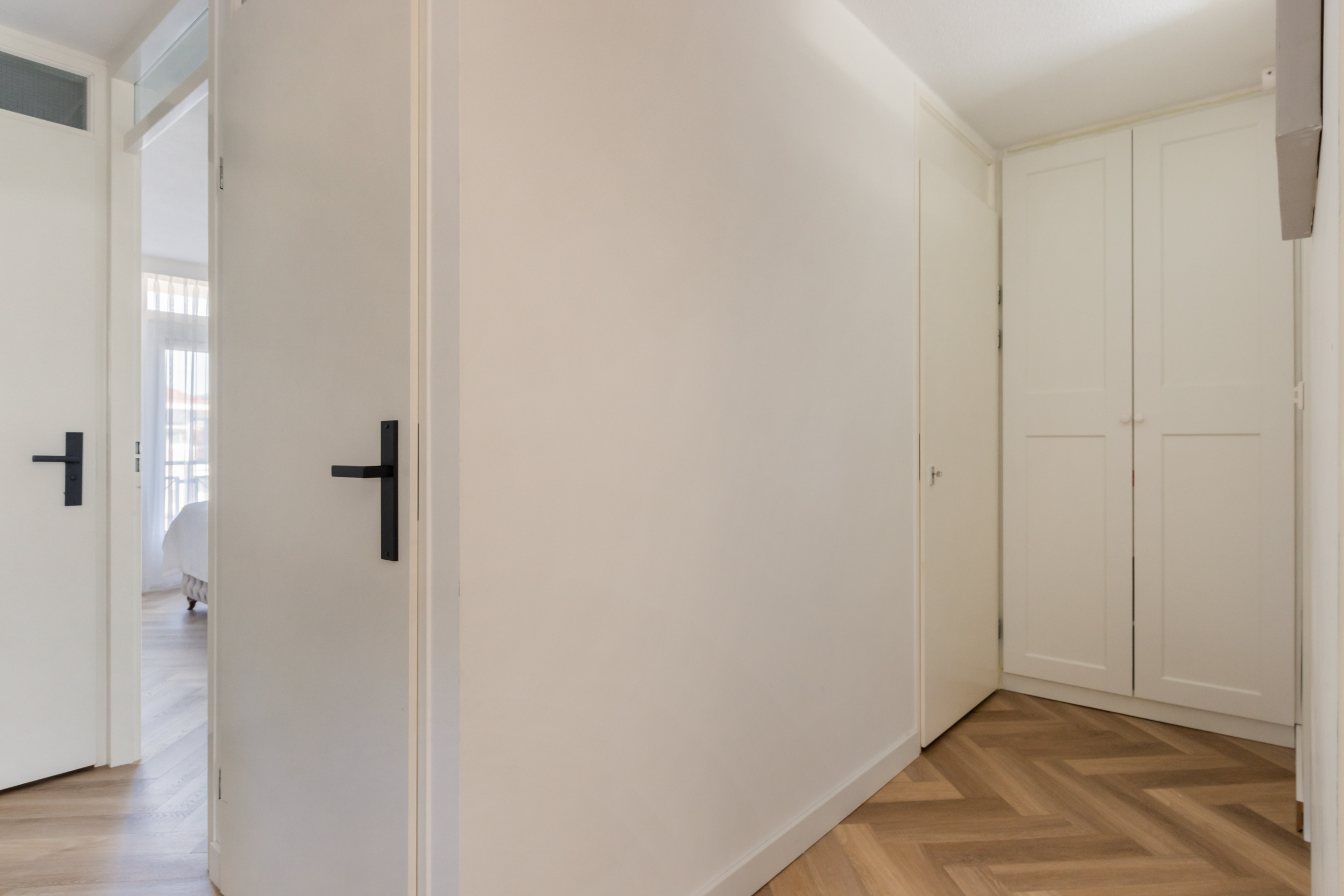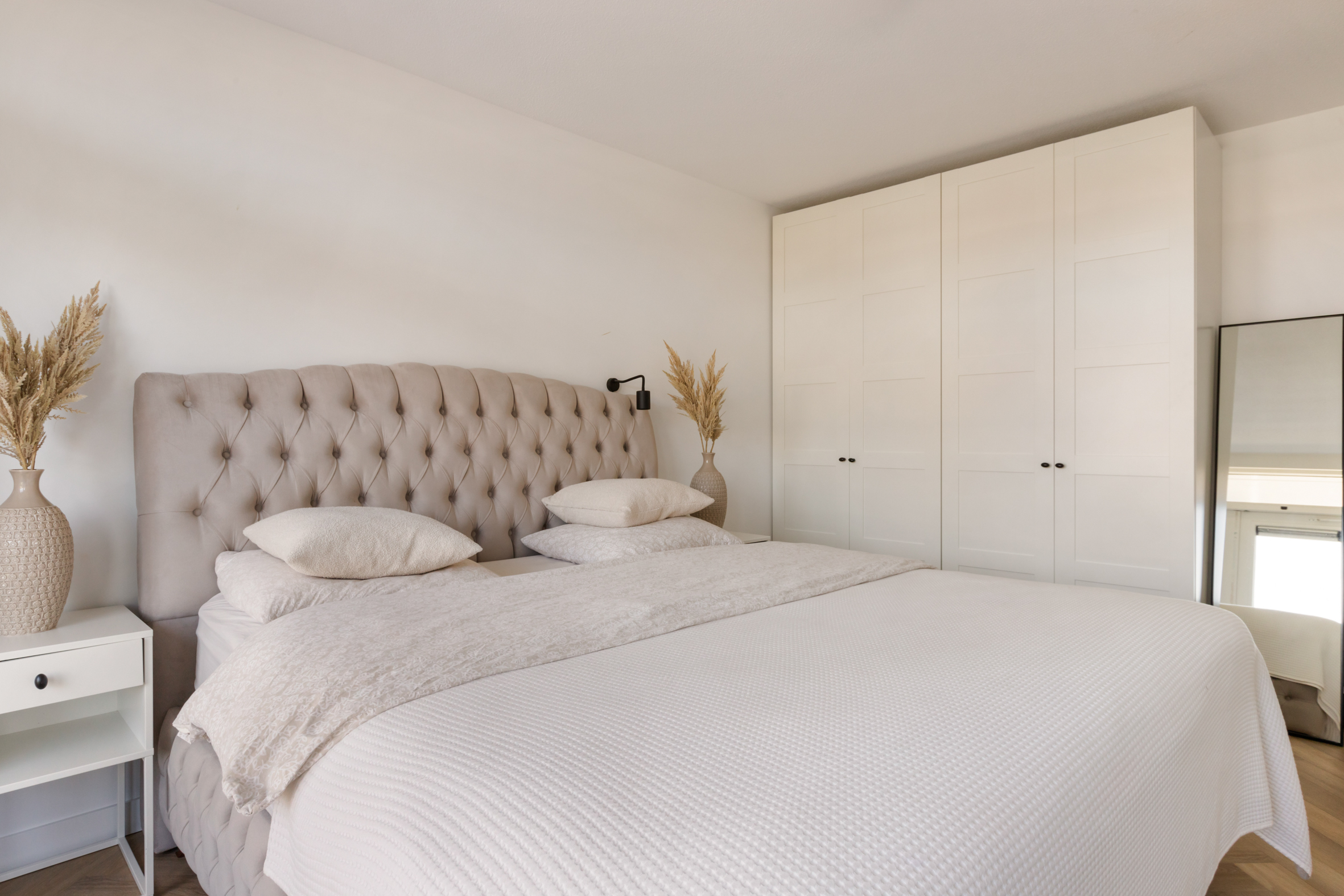 Ruime overloop met toiletruimte, vaste kast en trapopgang naar de tweede verdieping. Royale voorslaapkamer met openslaande deuren naar het balkon. Luxe badkamer voorzien van vrijstaand bad, inloopdouche en fraai meubel met waskom en spiegel. Er zijn twee ruime slaapkamers aan de achterzijde van de woning. De gehele eerste verdieping is voorzien van vloerverwarming.