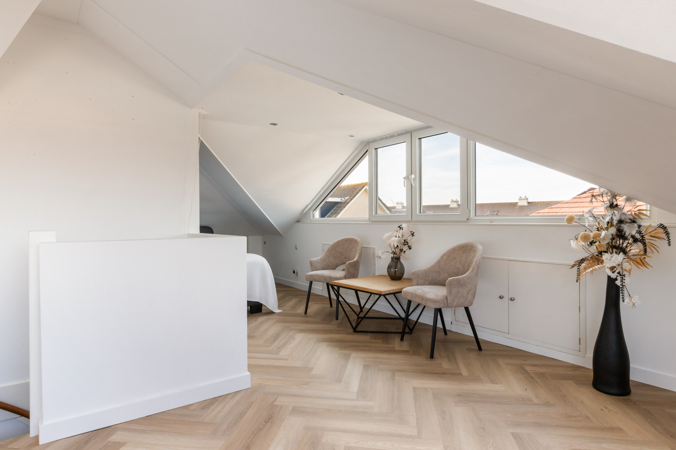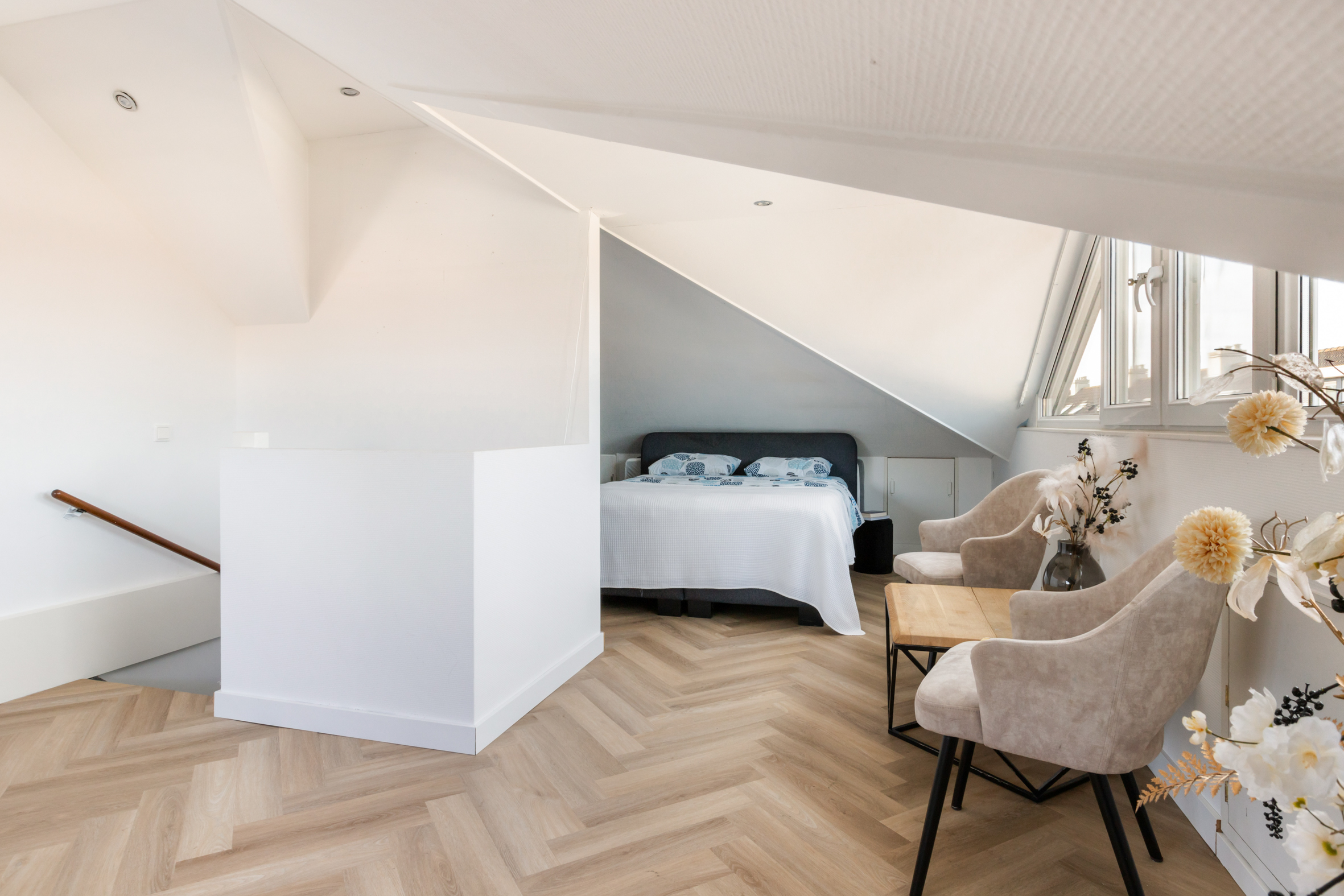Grote speels ingedeelde slaapkamer met 2 dakkapellen en veel bergruimte. Tevens is er op deze etage een ruime bergkast en een mogelijkheid voor het plaatsen van een extra wastafel.