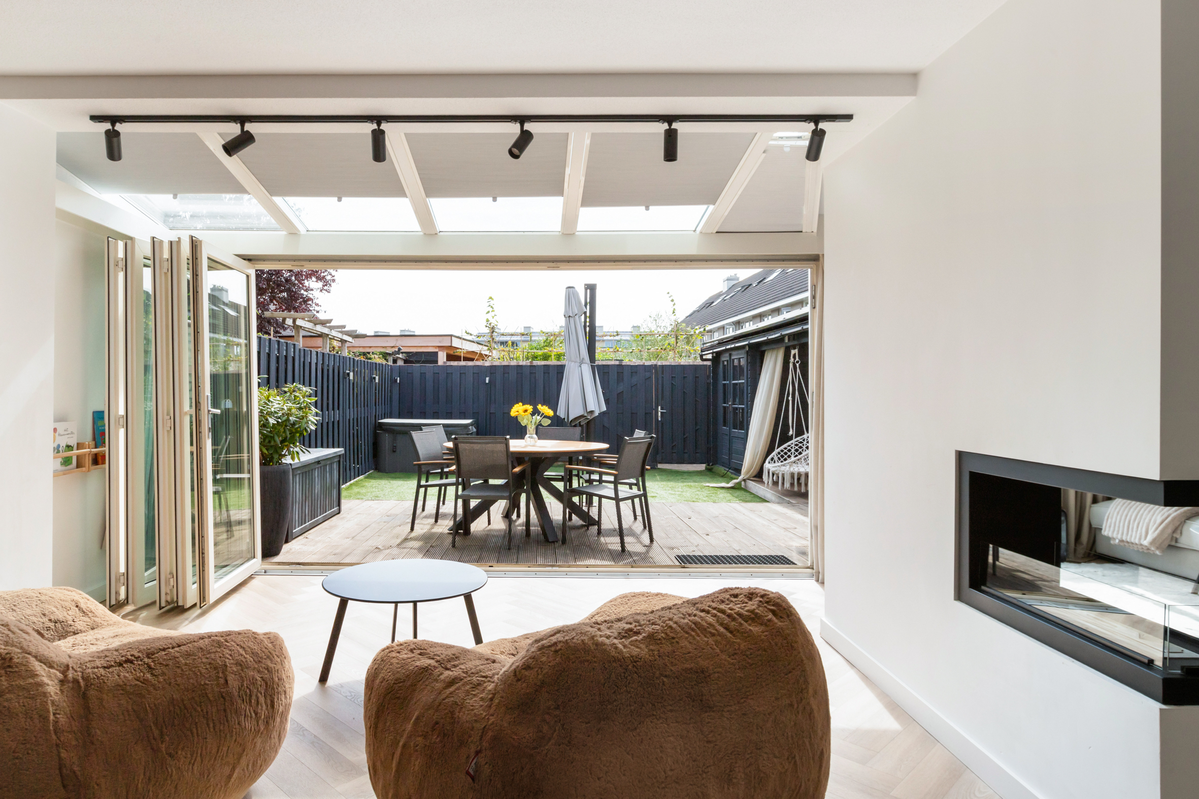 Royale uitgebouwde woonkamer met veel lichtinval en een sfeervolle haard. Door de praktische indeling en serre kunt u meerdere zit- en eetgedeeltes maken, waardoor de ruimte sfeervol is in te delen. Bij mooi weer schuif je de kunststof vouwdeuren open waardoor de tuin een verlengstuk is van je woning. Tevens biedt een woonkamer een praktische trapkast.