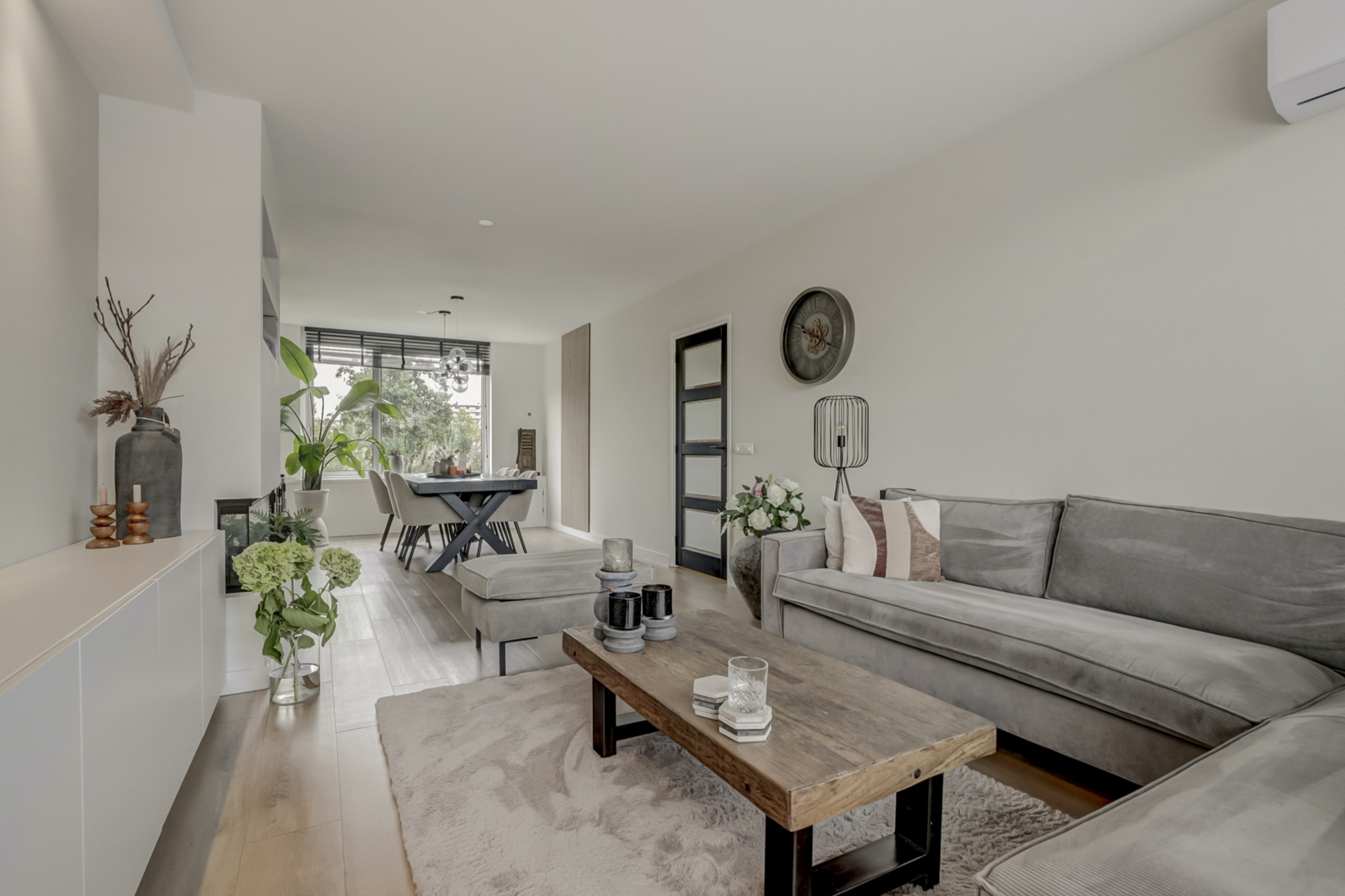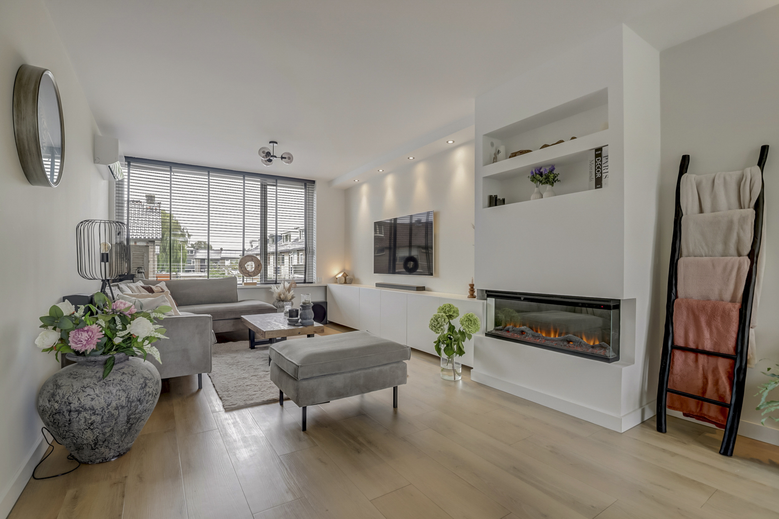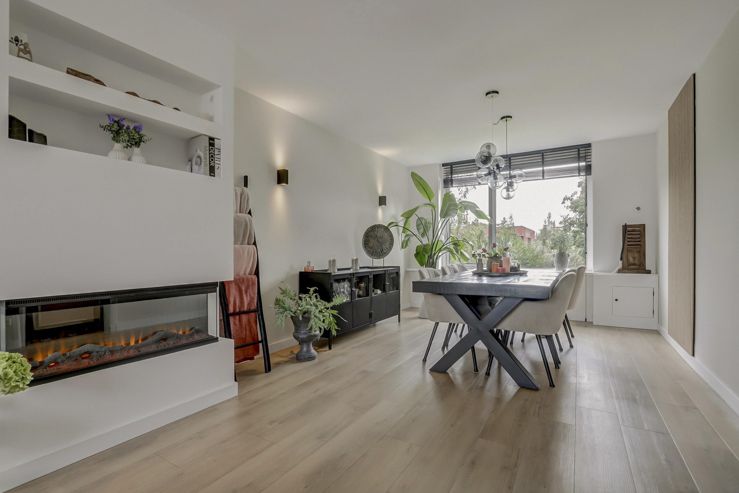 Op de eerste verdieping valt direct de ruime, lichte woonkamer op. De grote raampartijen aan zowel voor- als achterzijde zorgen voor een open en luchtige sfeer, terwijl de fraaie vloer en de strakke wanden voor een moderne uitstraling zorgen. Een elektrische haard vormt een sfeervol middelpunt.