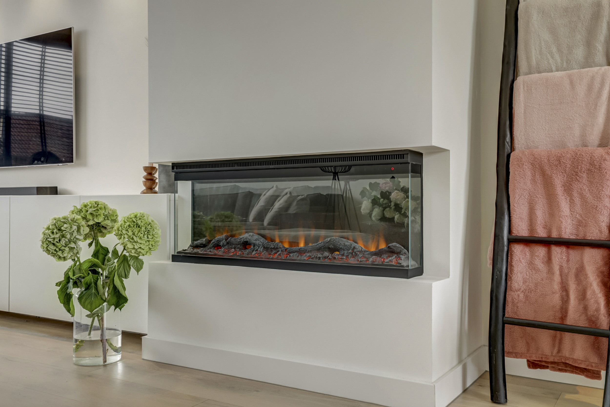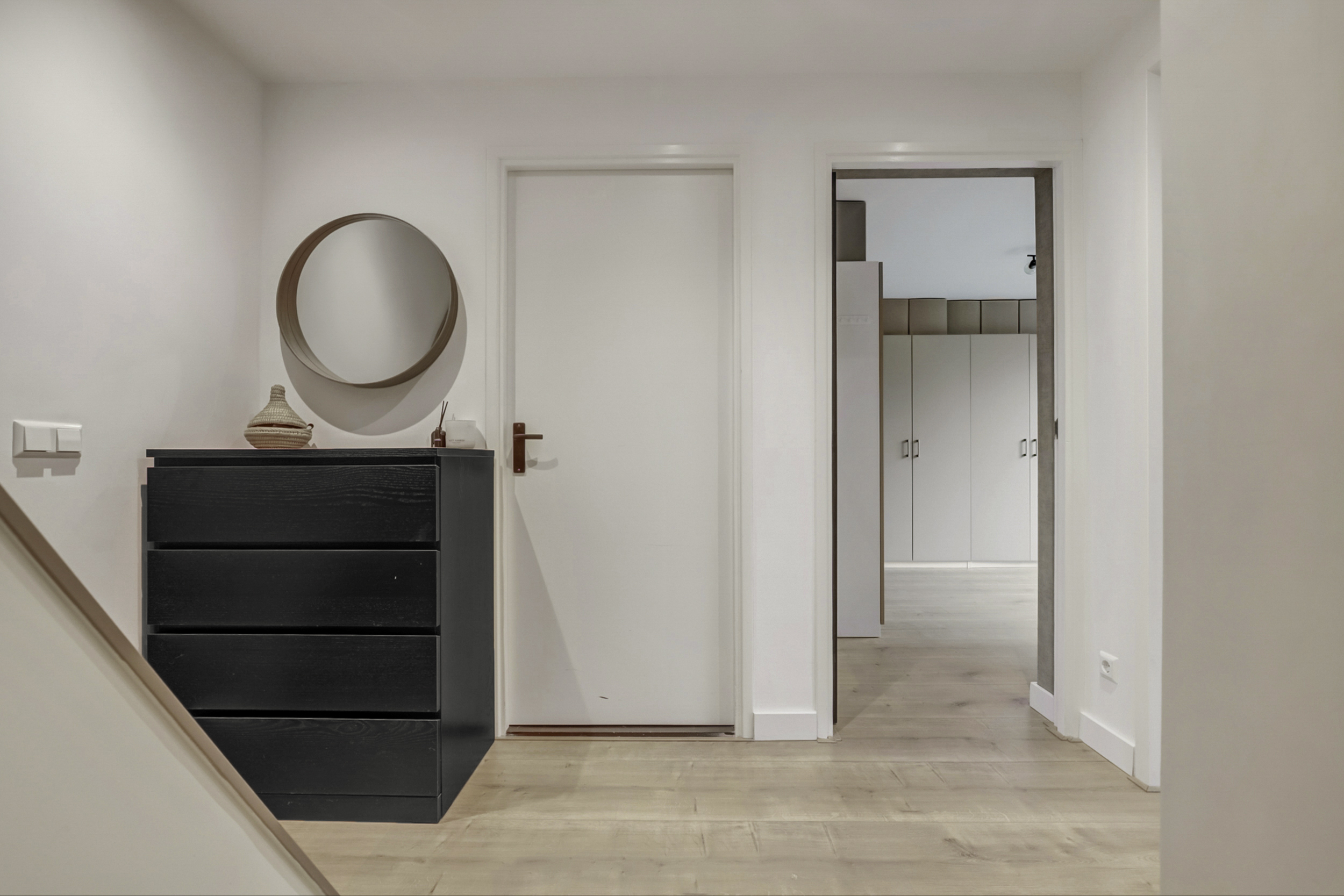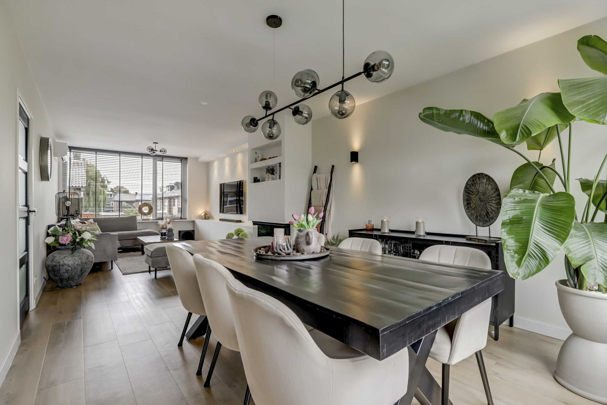 Op de eerste verdieping valt direct de ruime, lichte woonkamer op. De grote raampartijen aan zowel voor- als achterzijde zorgen voor een open en luchtige sfeer, terwijl de fraaie vloer en de strakke wanden voor een moderne uitstraling zorgen. Een elektrische haard vormt een sfeervol middelpunt.