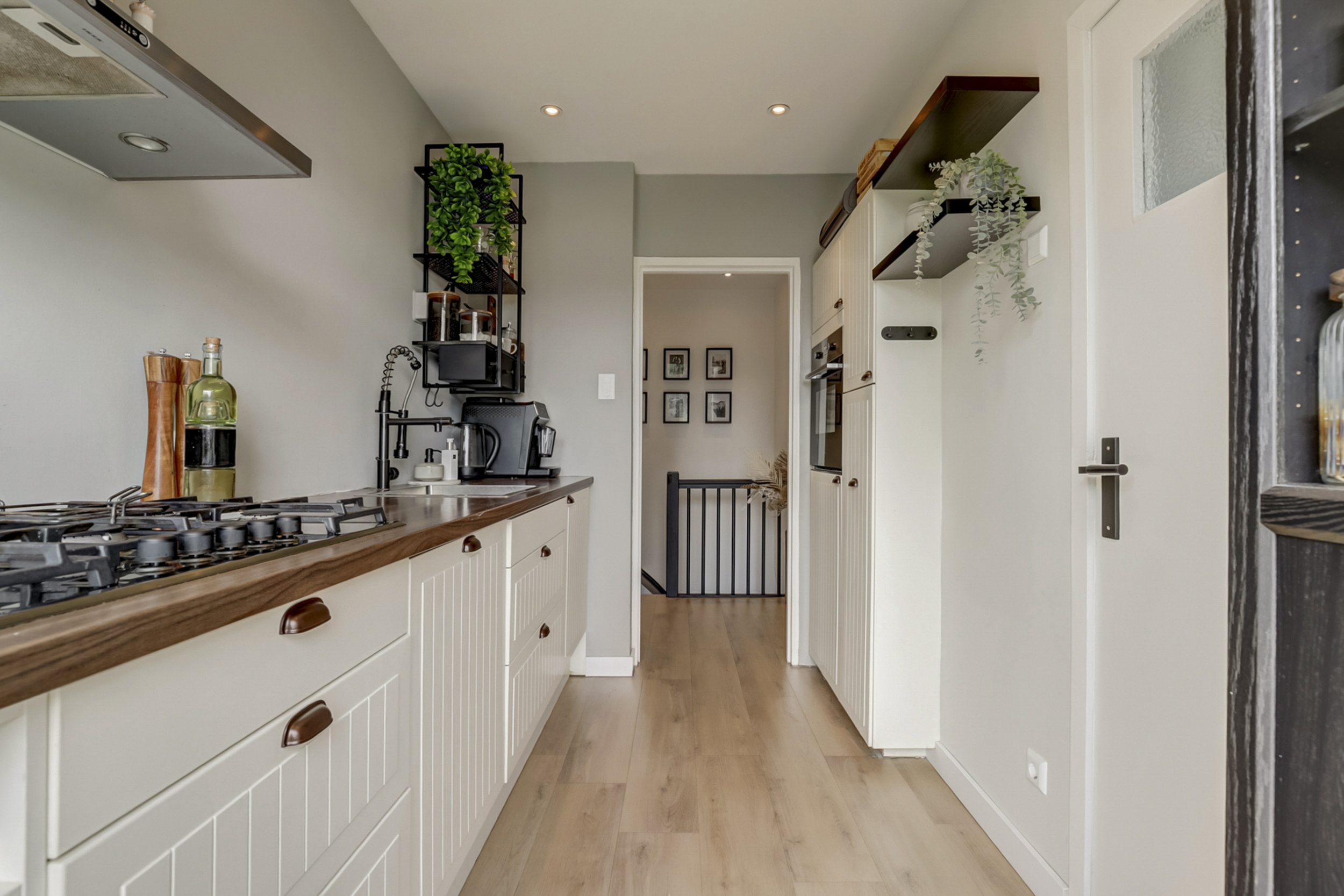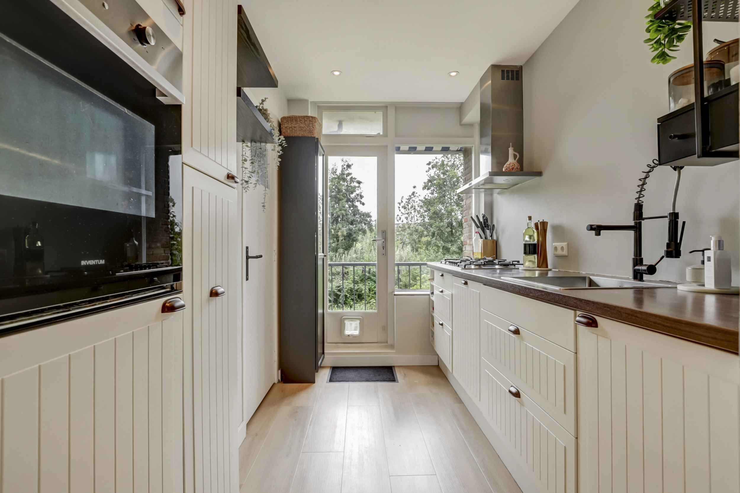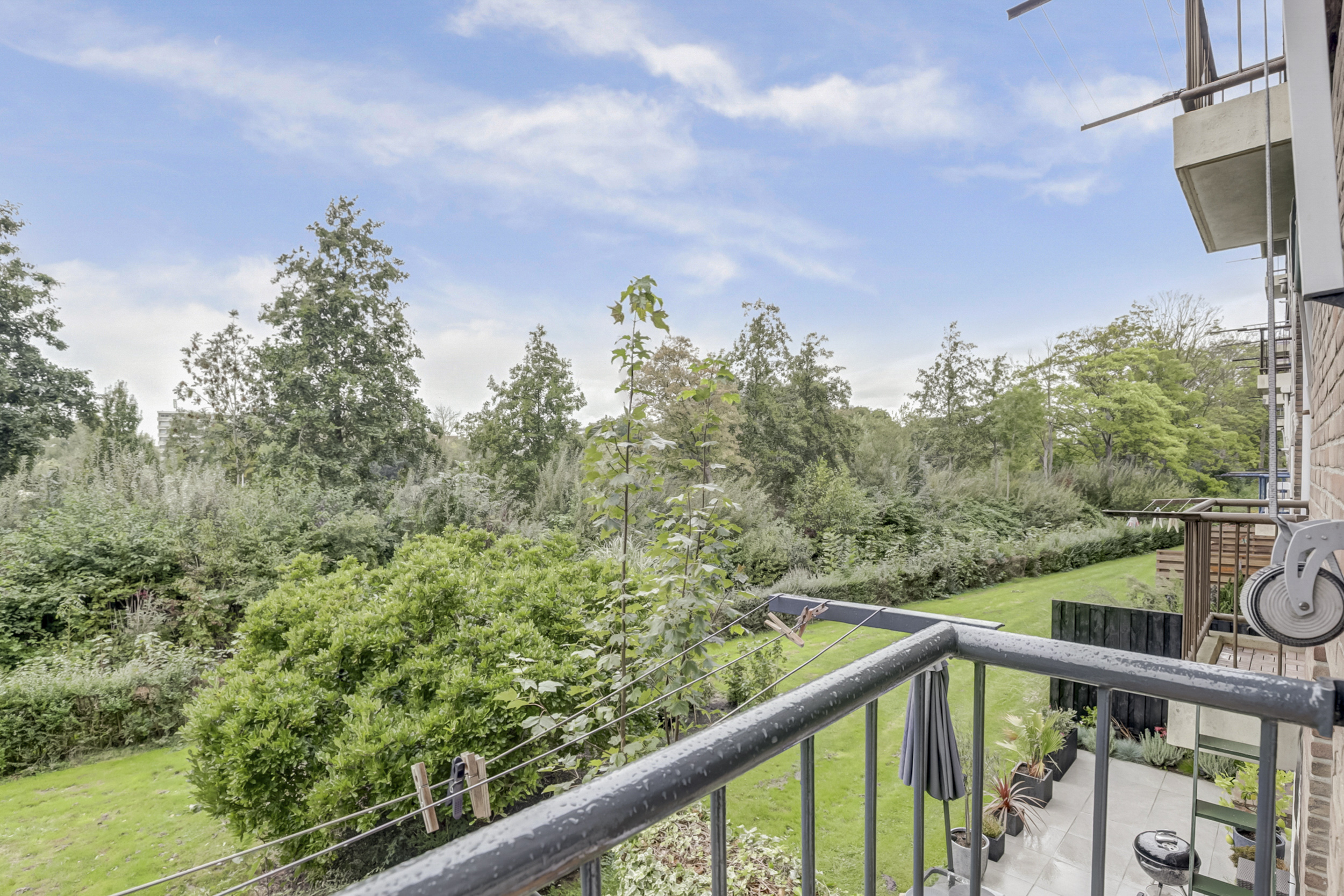 De halfopen keuken is een echte eyecatcher: strak afgewerkt met houten accenten en voorzien van moderne inbouwapparatuur, waaronder een oven, gaskookplaat, vaatwasser, koelkast en een stijlvolle kraan. Vanuit de keuken stapt u zo het balkon op, waar u kunt genieten van het groene uitzicht.
