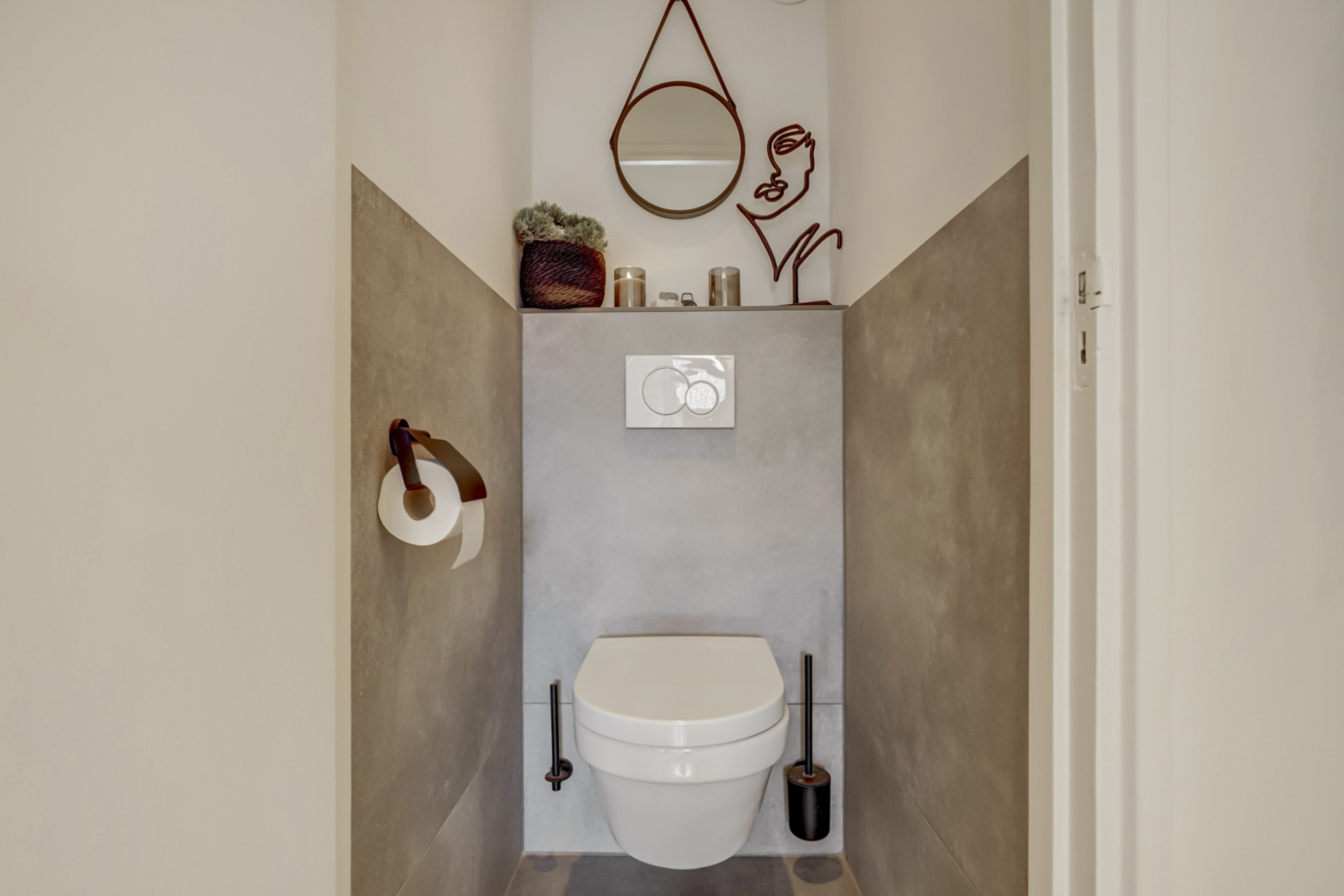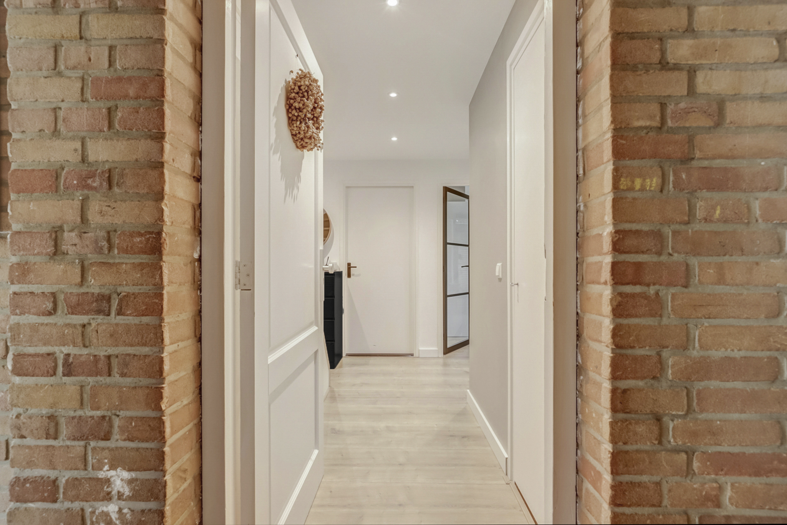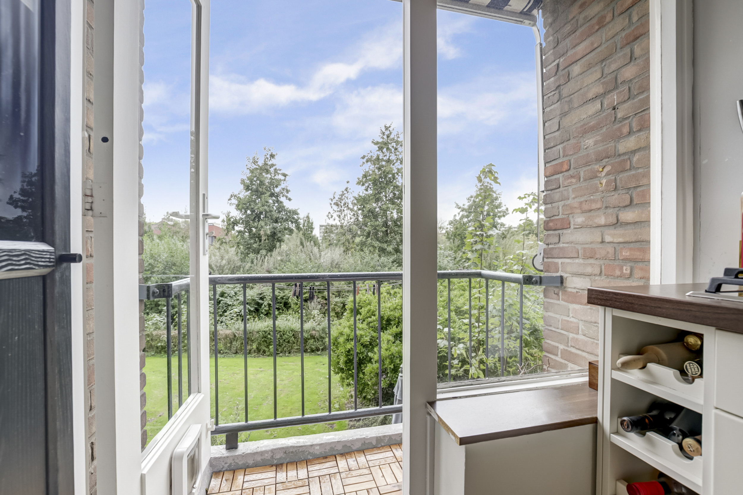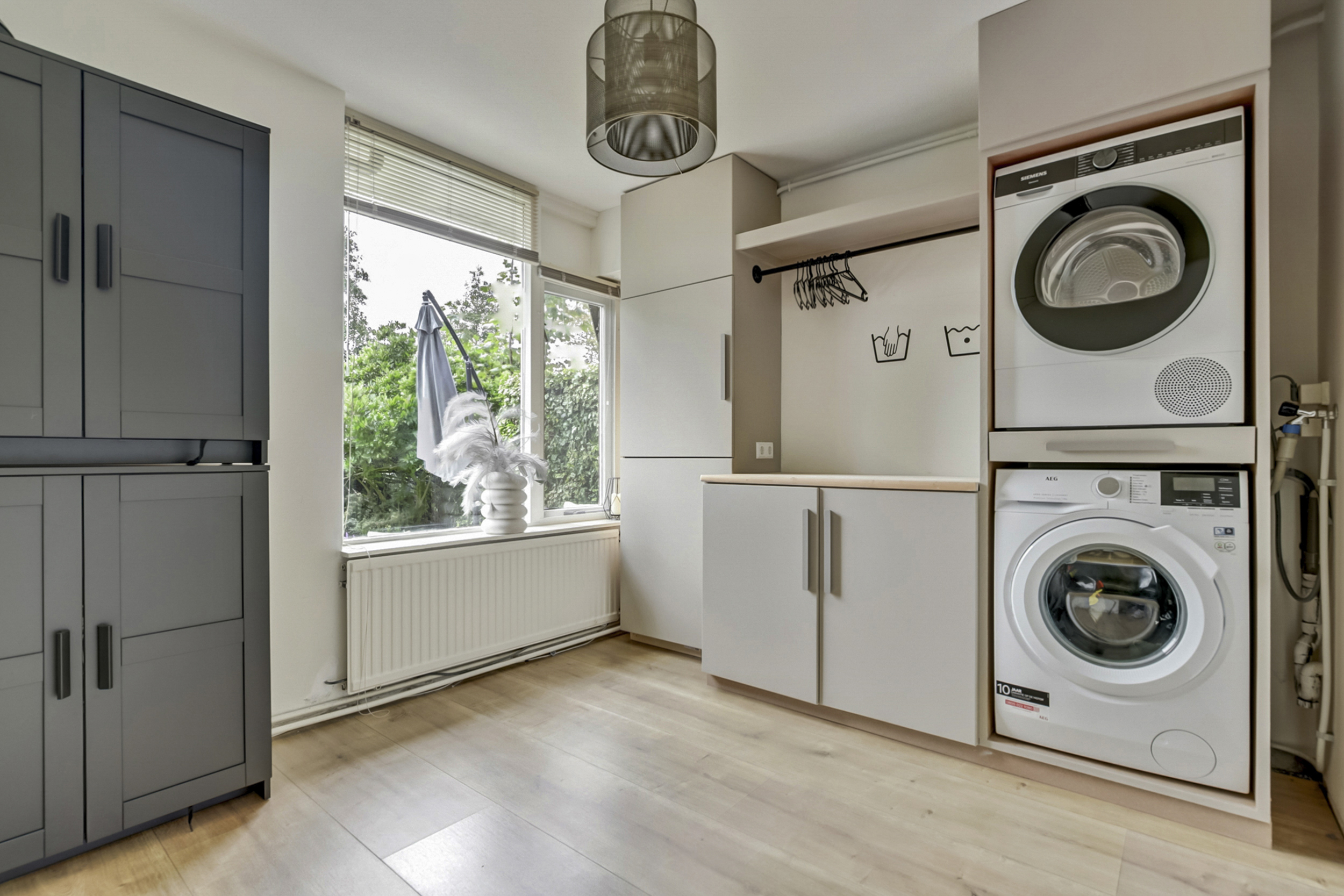 De halfopen keuken is een echte eyecatcher: strak afgewerkt met houten accenten en voorzien van moderne inbouwapparatuur, waaronder een oven, gaskookplaat, vaatwasser, koelkast en een stijlvolle kraan. Vanuit de keuken stapt u zo het balkon op, waar u kunt genieten van het groene uitzicht.