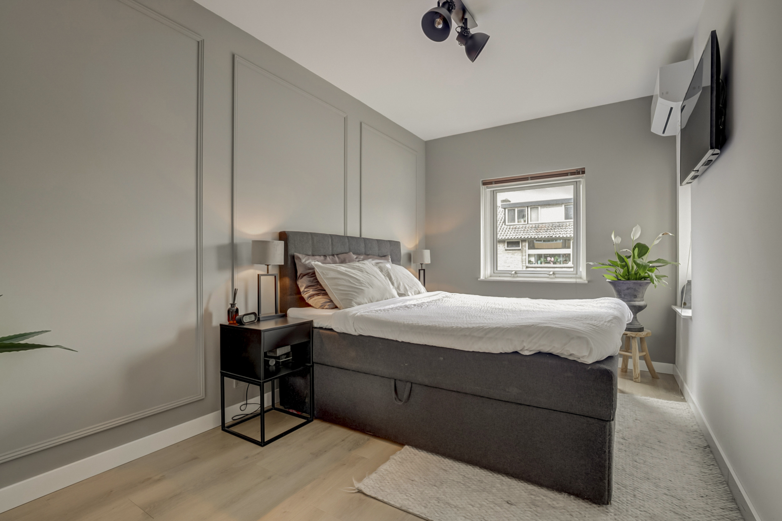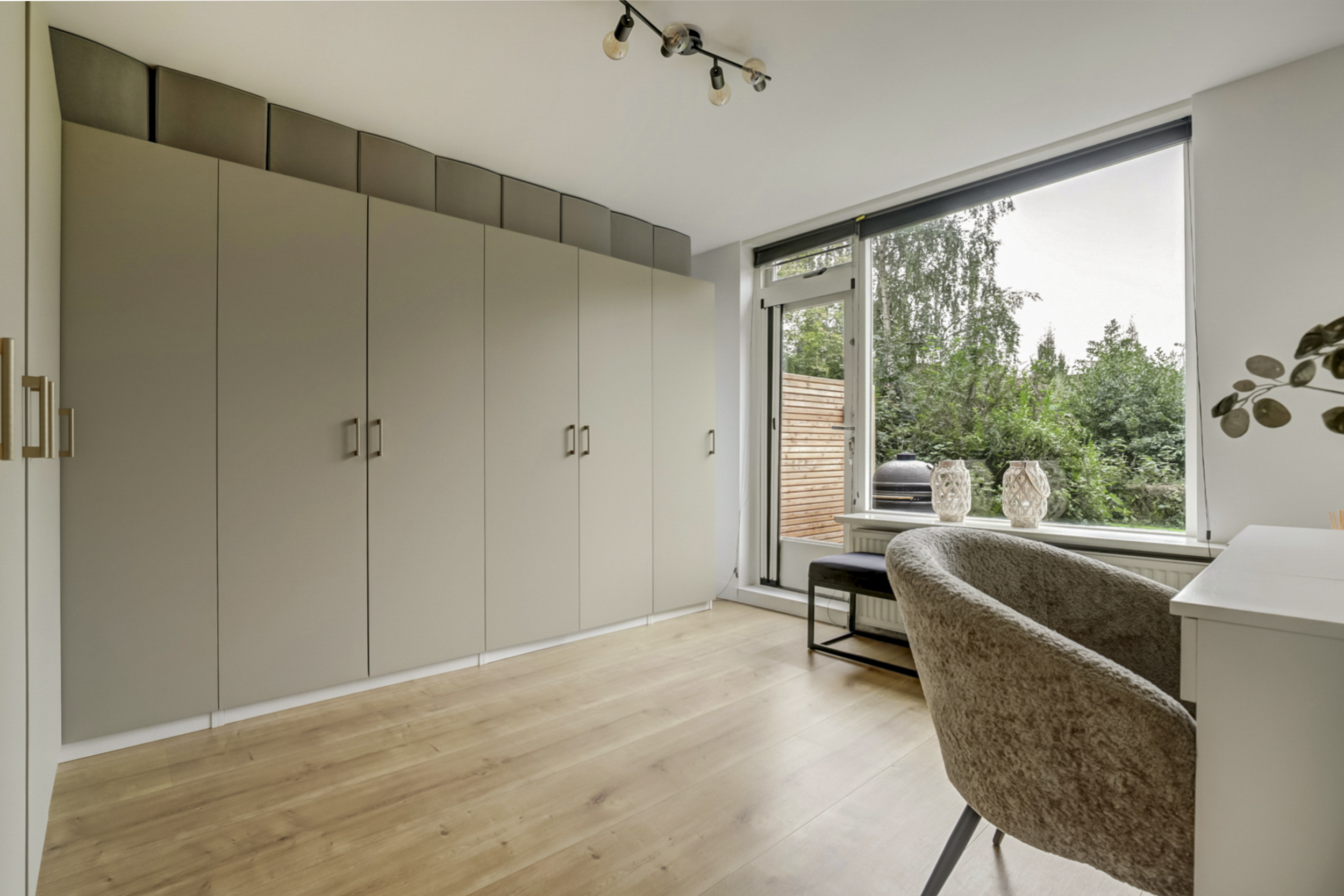Via de eigen entree bereikt u de hal met trapopgang en meerdere vaste kasten. Hier bevinden zich twee goed bemeten slaapkamers, ideaal als logeer-, werk- of hobbykamer. Slaapkamer aan de achterzijde heeft toegang tot de fraai aangelegde tuin. Daarnaast vindt u op deze verdieping een praktische berging en de aansluitingen voor wasmachine en droger. De grote ramen zorgen voor veel daglicht en een prettige verbinding met de tuin.