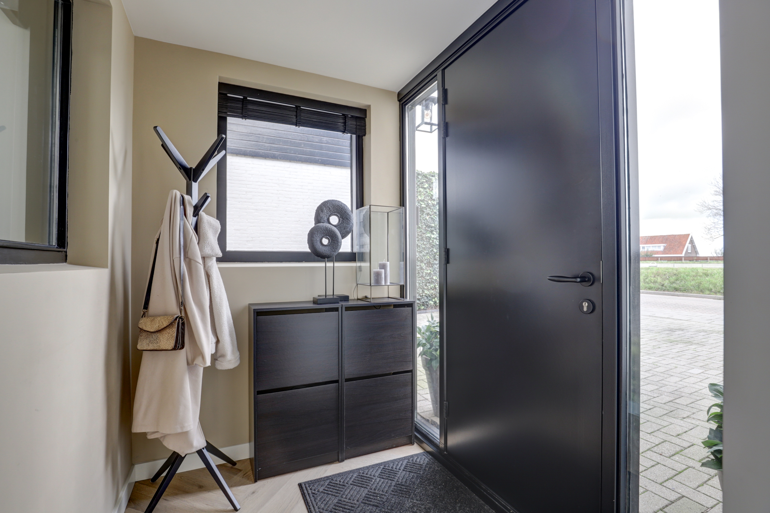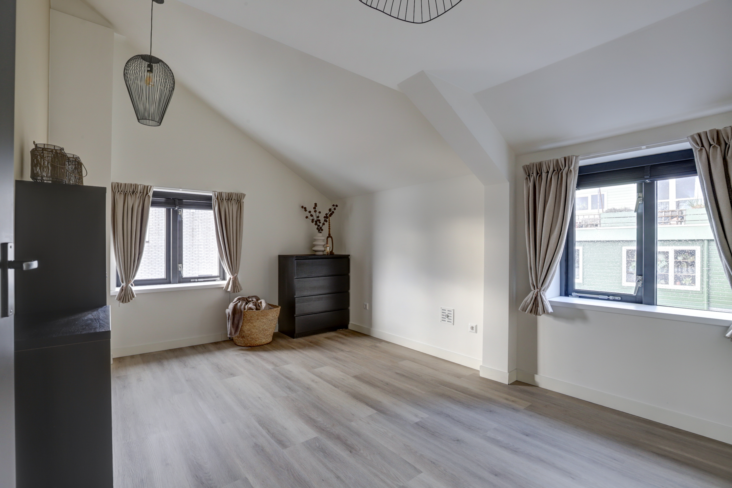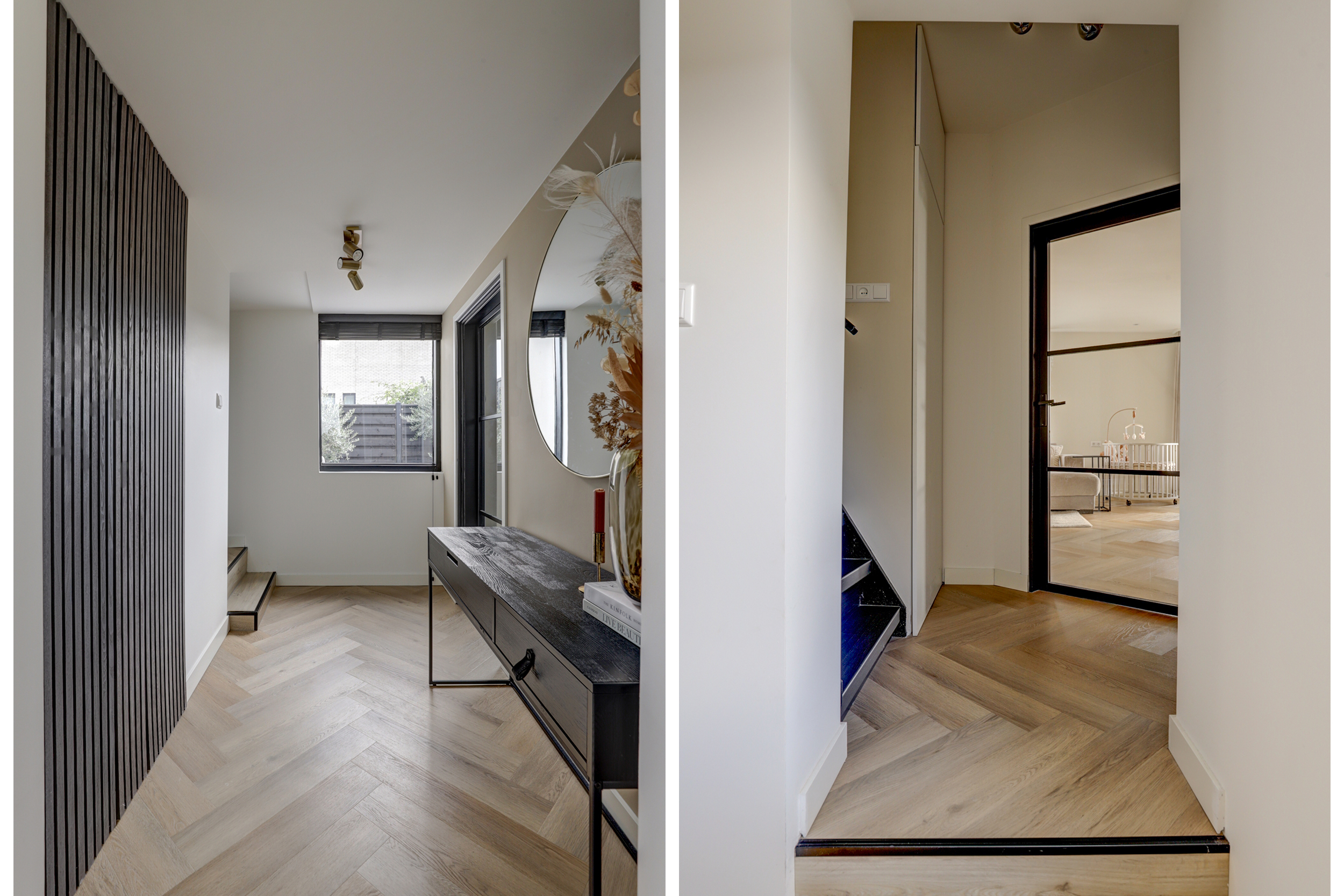 U betreedt de woning via een entree met zwarte voordeur. In de hal bevinden zich de trapopgang, garderobe en het moderne toilet. Vanuit hier loopt u door naar de royale woonkamer aan de voorzijde. De grote raampartijen aan drie zijden zorgen voor een overvloed aan daglicht en bieden een fraai uitzicht over de Zuidkade. De lichte wanden, het subtiele spotverlichtingsplan en de visgraat pvc-vloer in naturel eiken tint creëren een warme en elegante sfeer. De woonkamer biedt voldoende ruimte voor een royale zithoek en een aparte lees- of speelhoek.